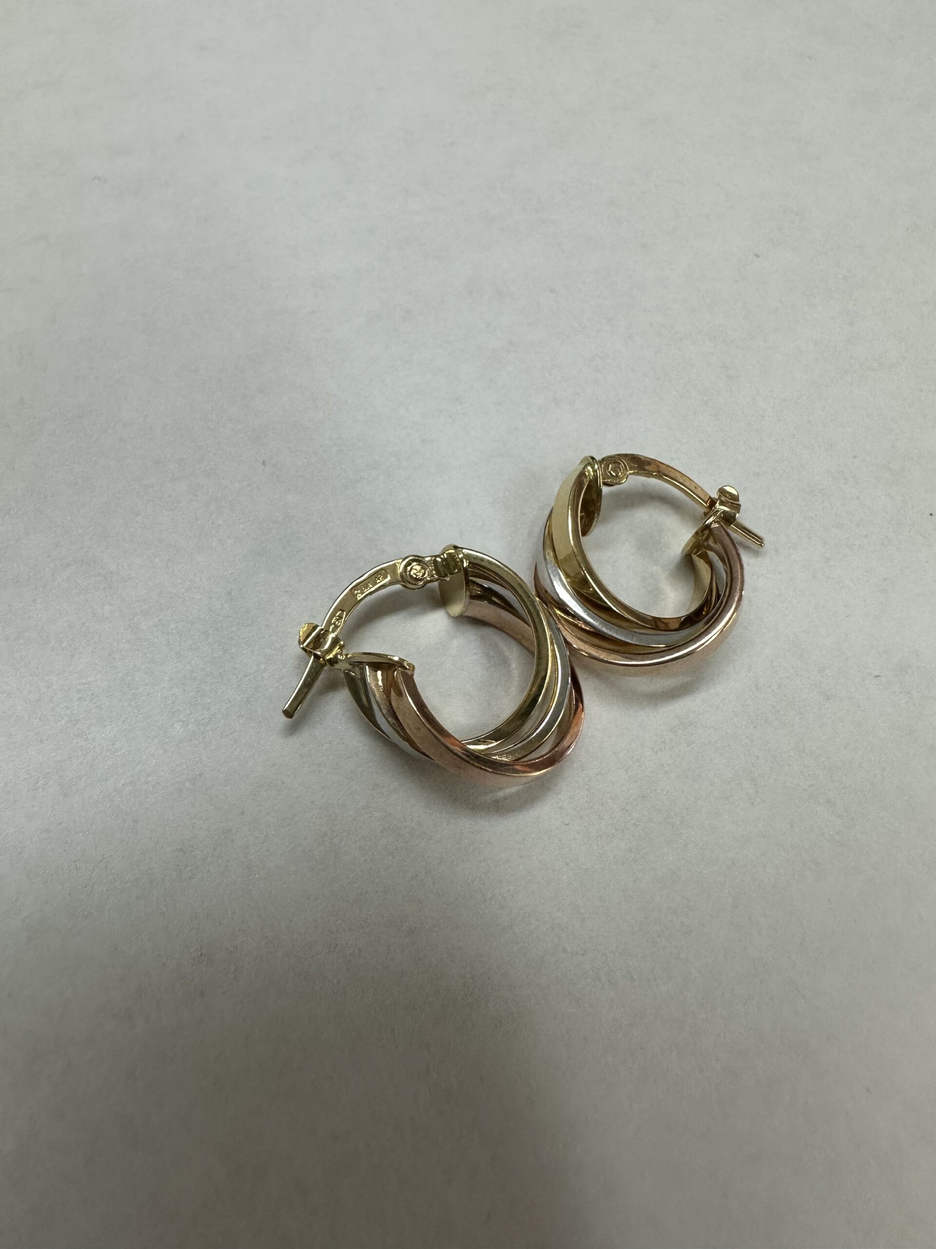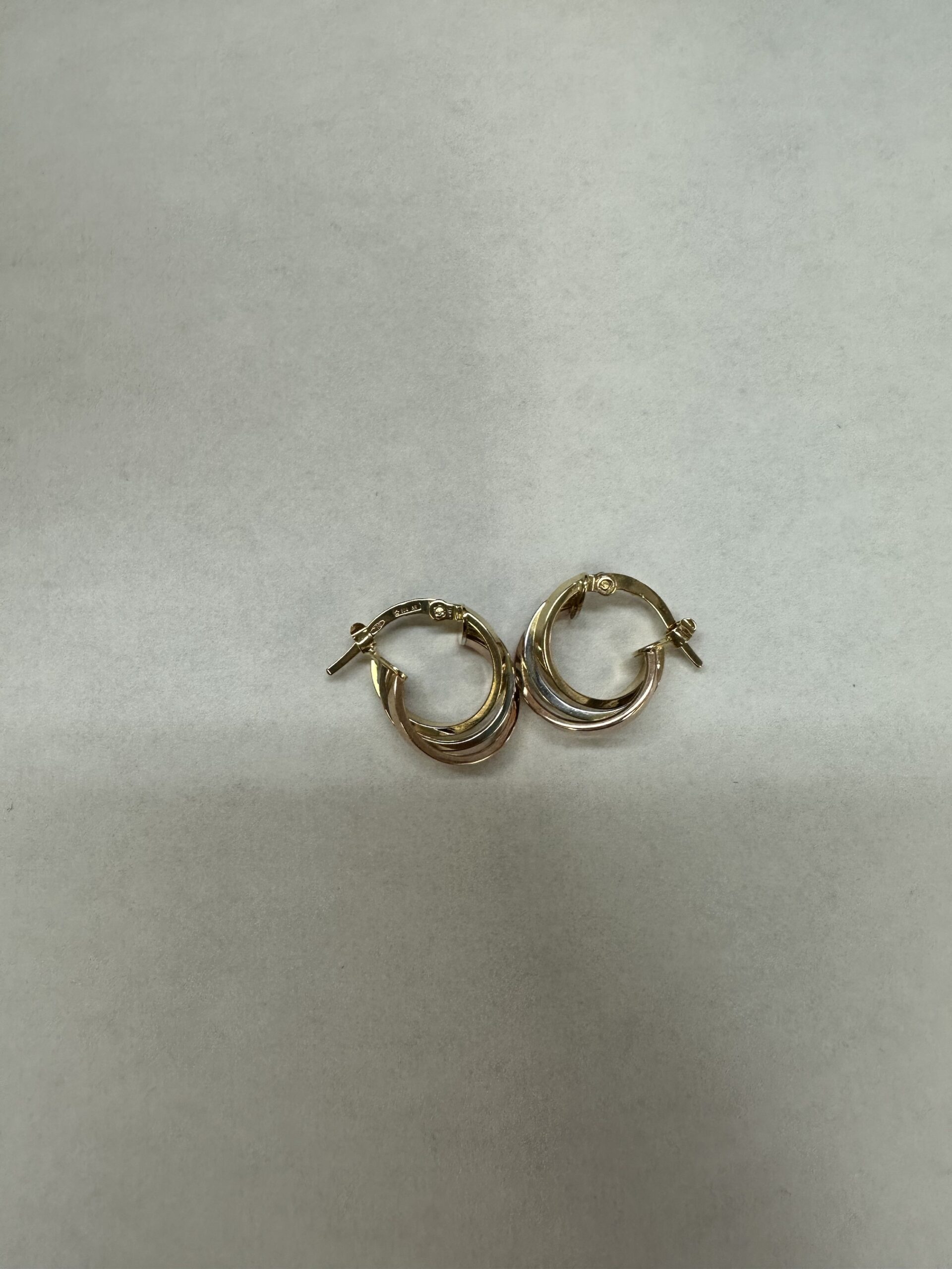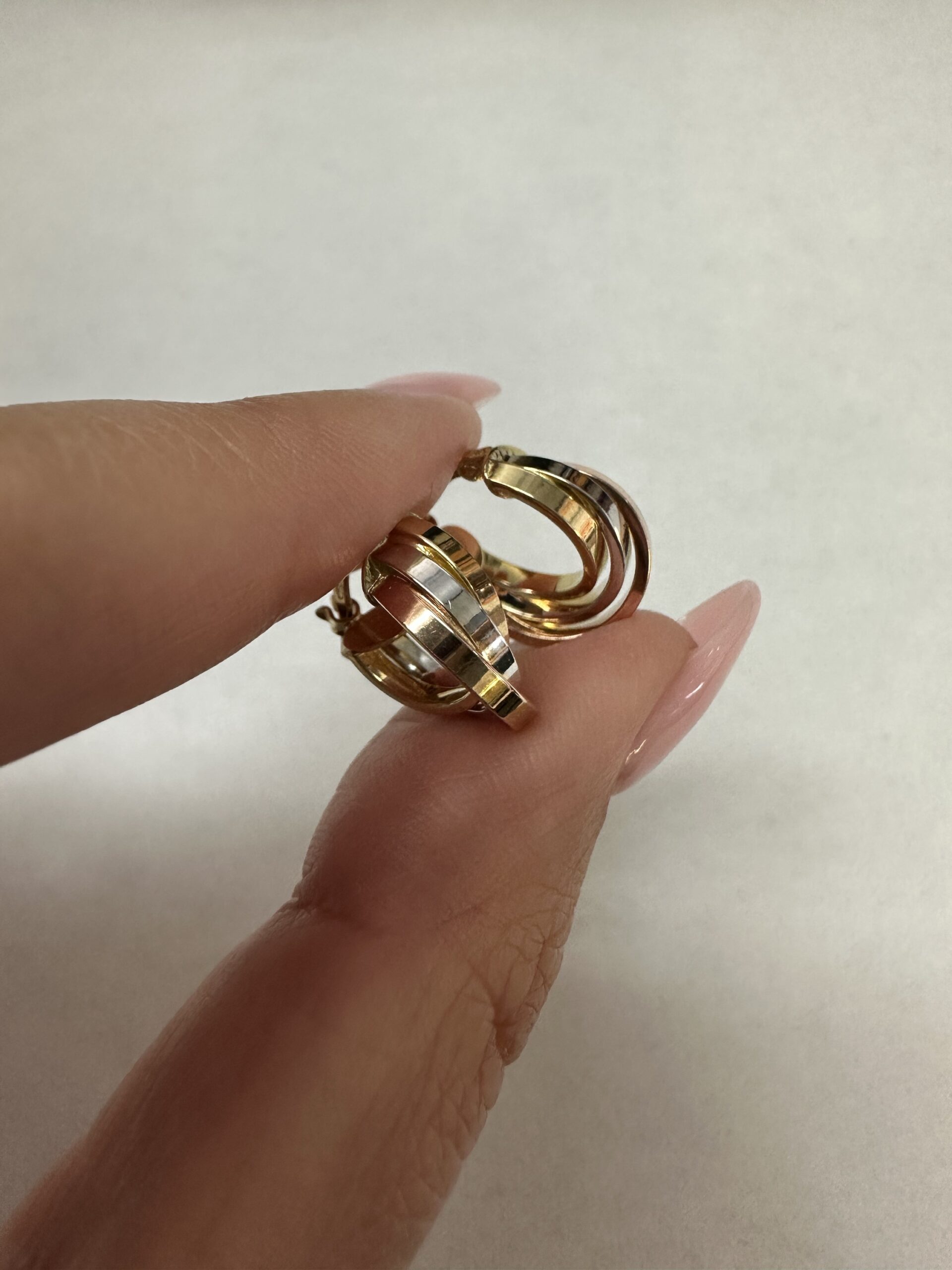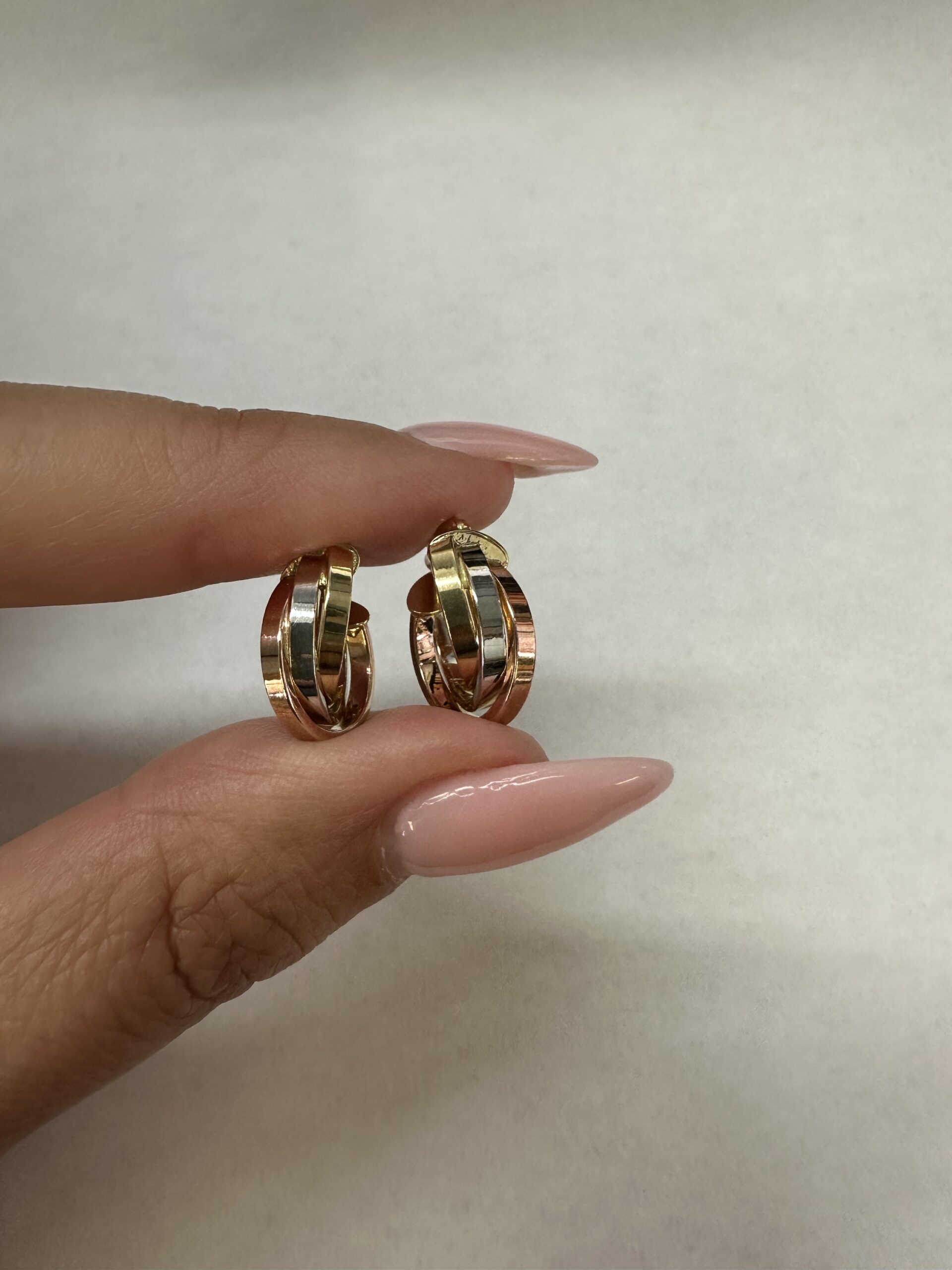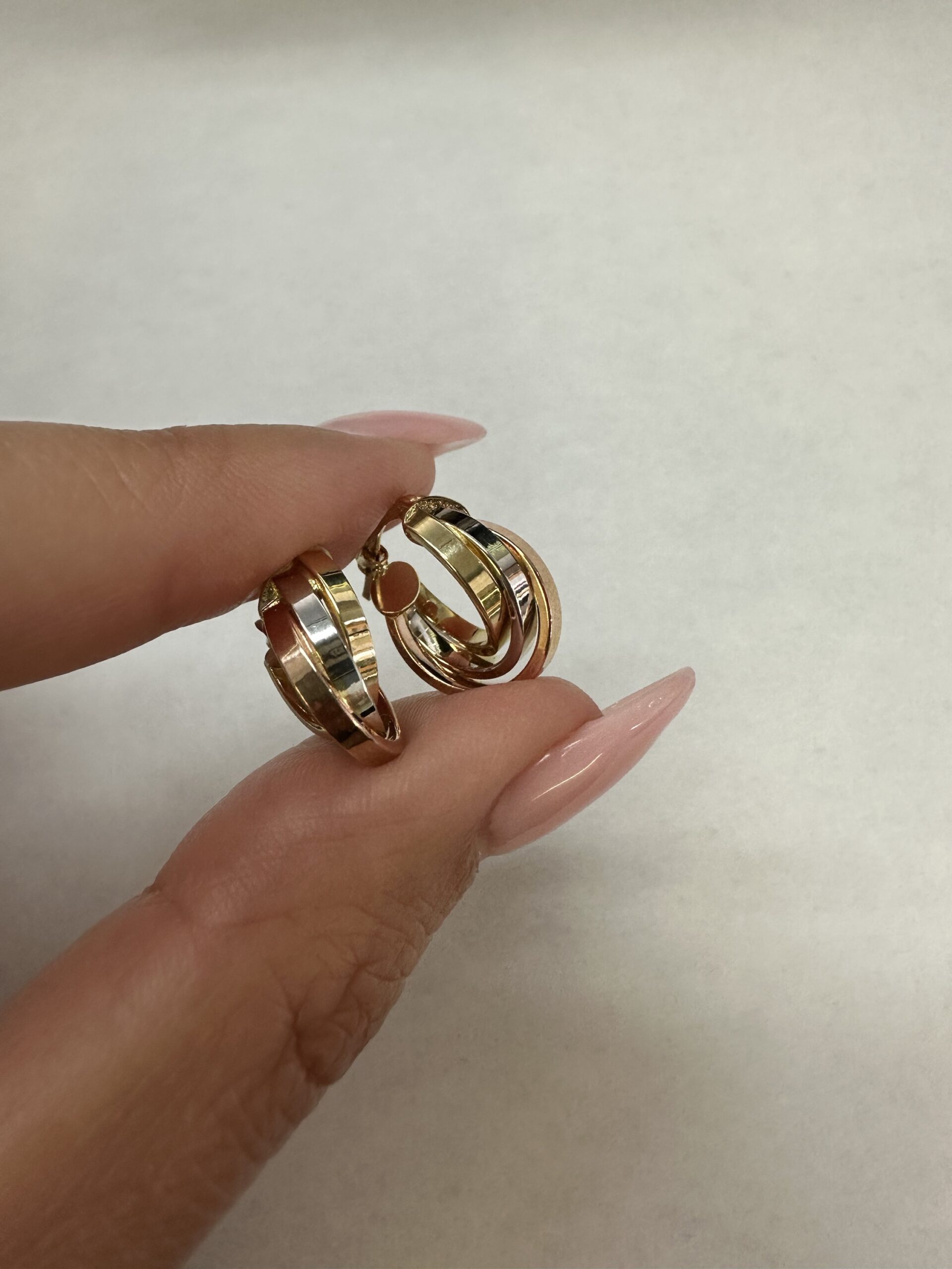 One-of-a-kind 18k tri-color gold small hoop earrings directly imported from Italy. These earrings measure 6 x 12.5 mm in size, and they have an entire weight of 2.31 grams.