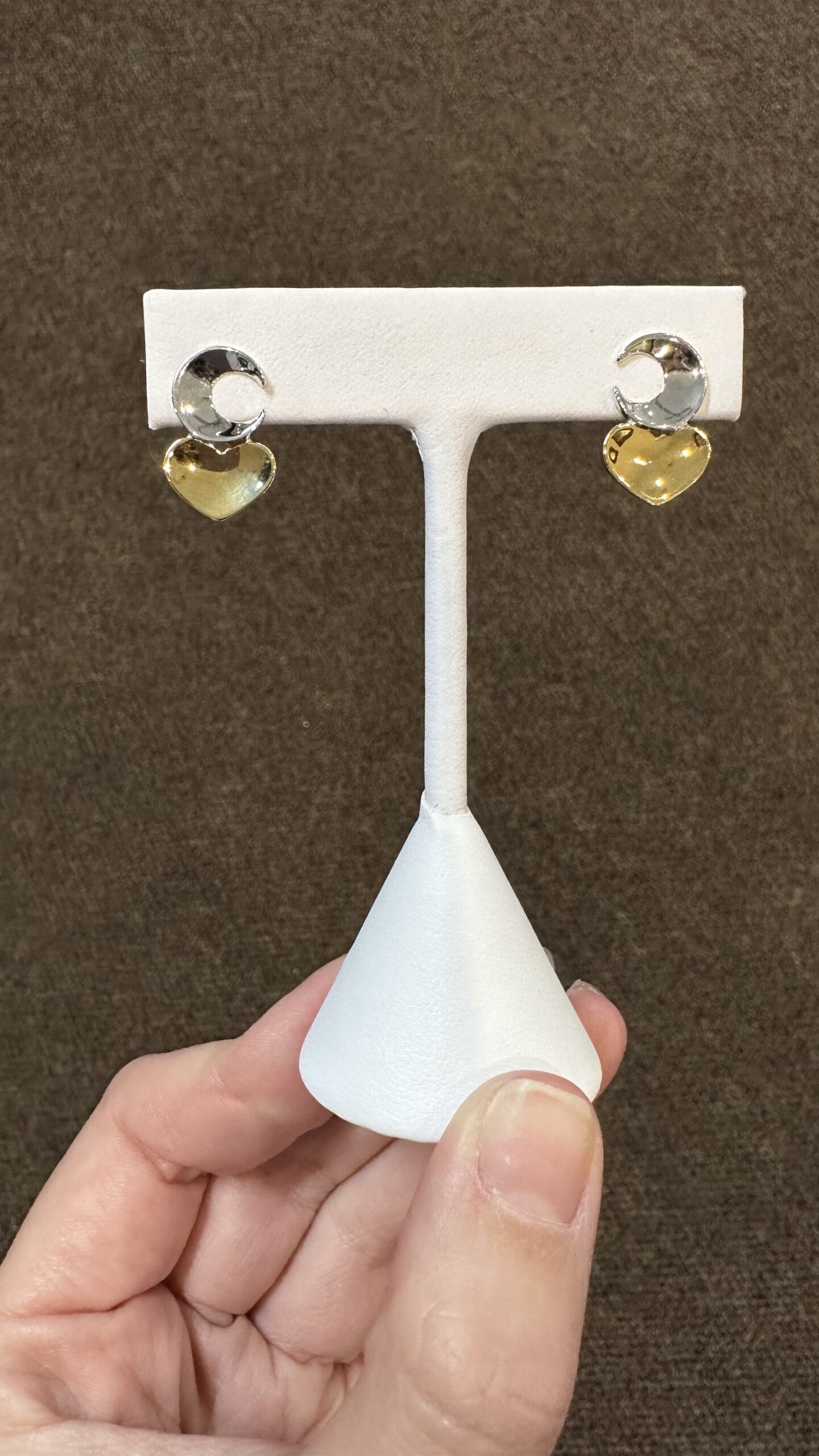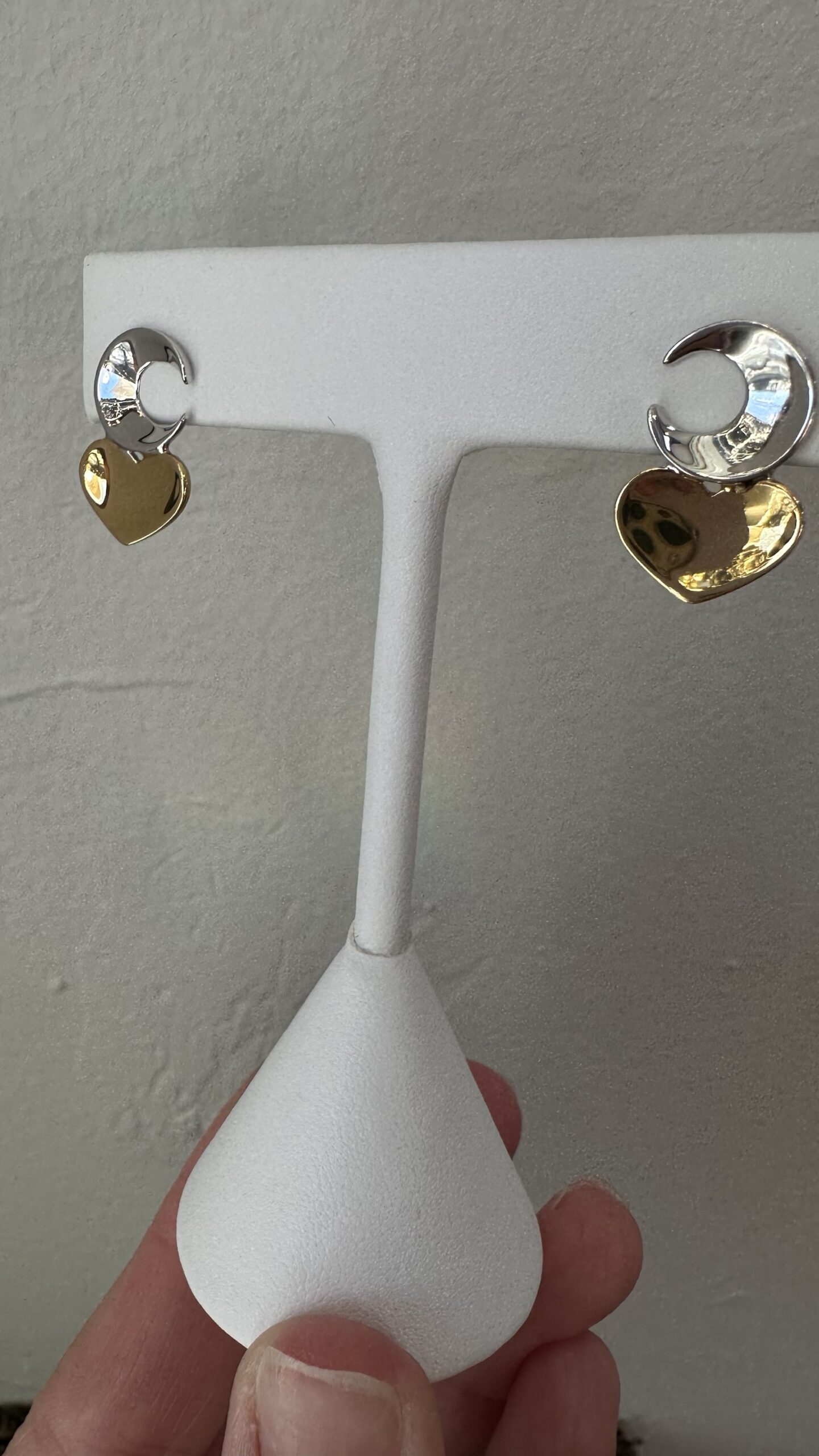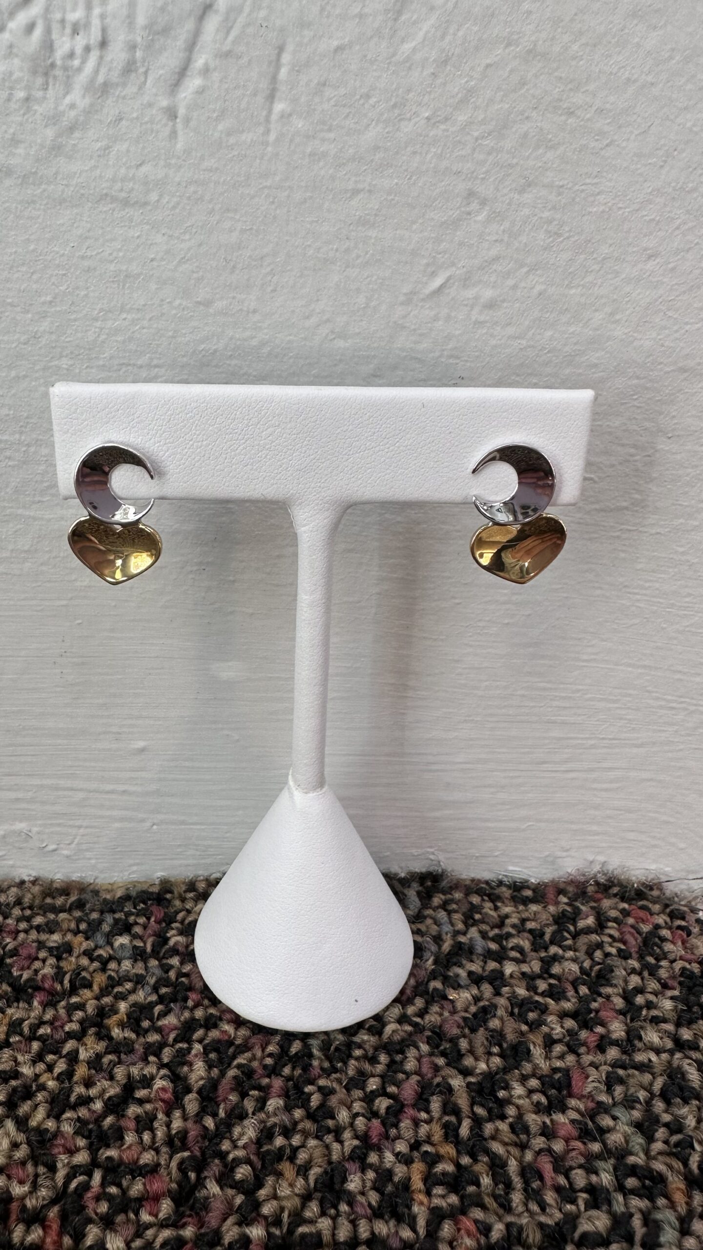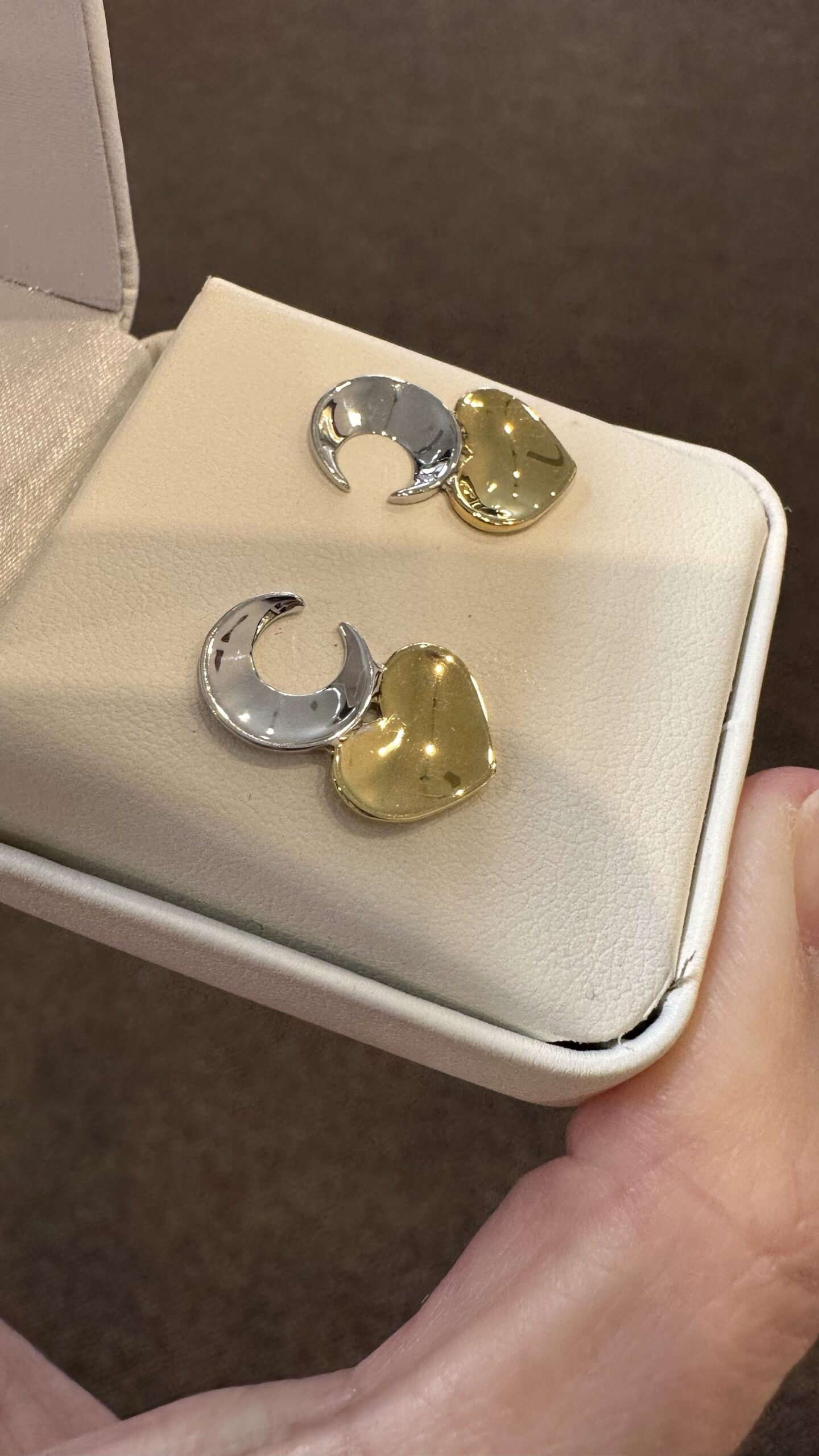One-of-a-kind 18k white & 18k yellow gold crescent moon & heart stud earrings directly imported from Italy, 18.5 x 12 mm, 4.3 grams.