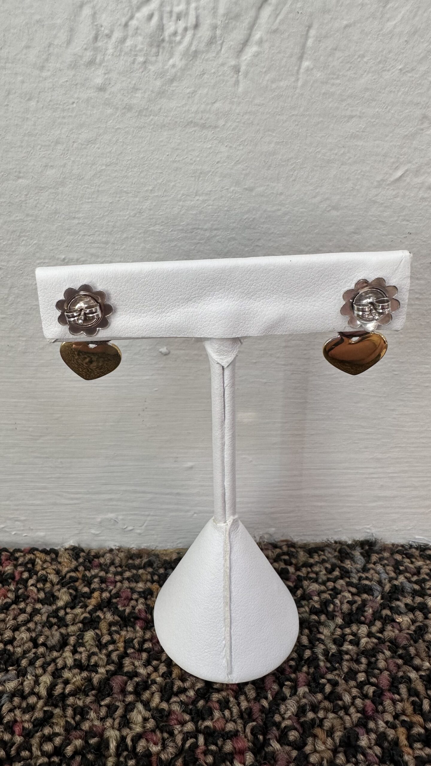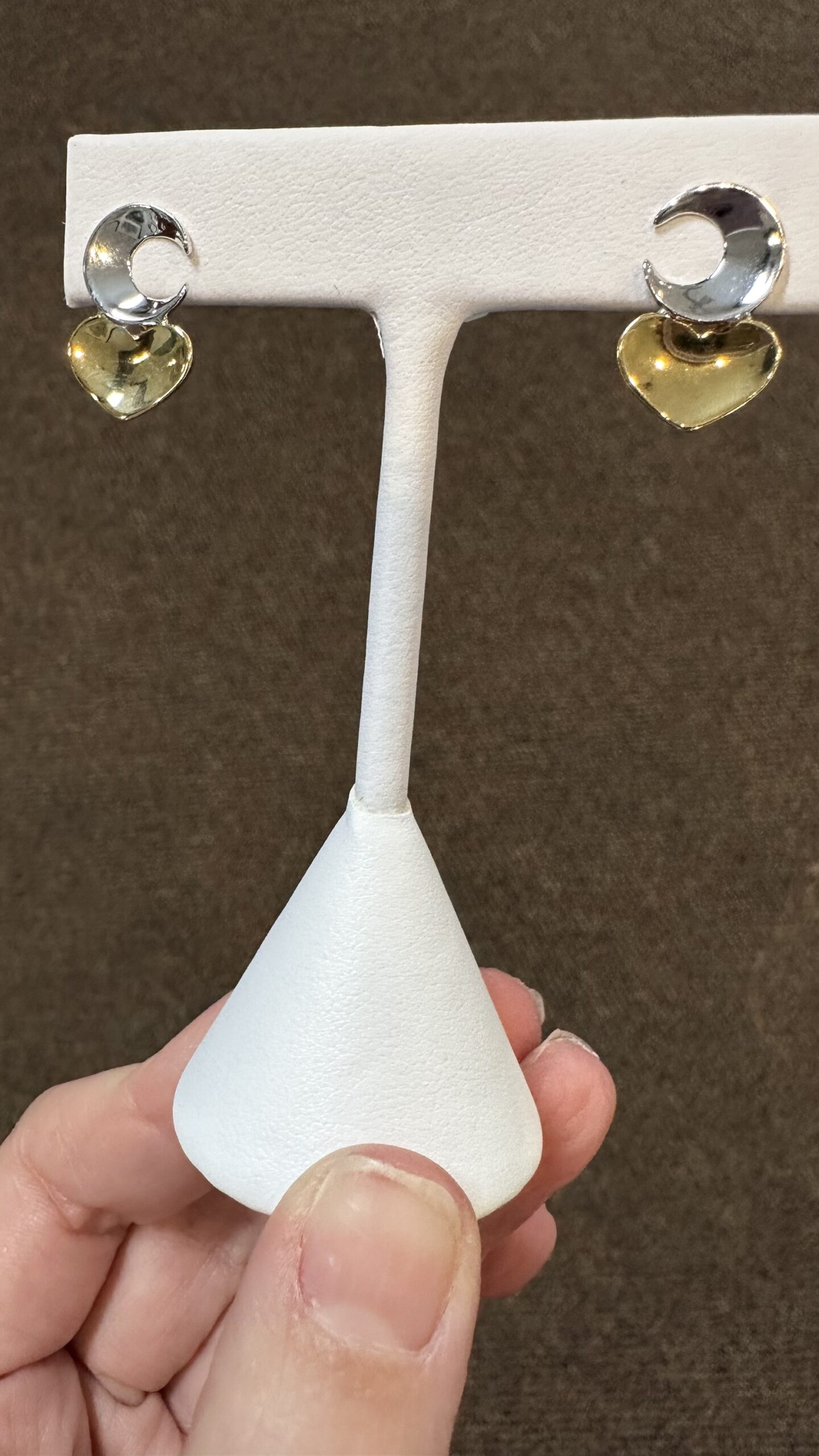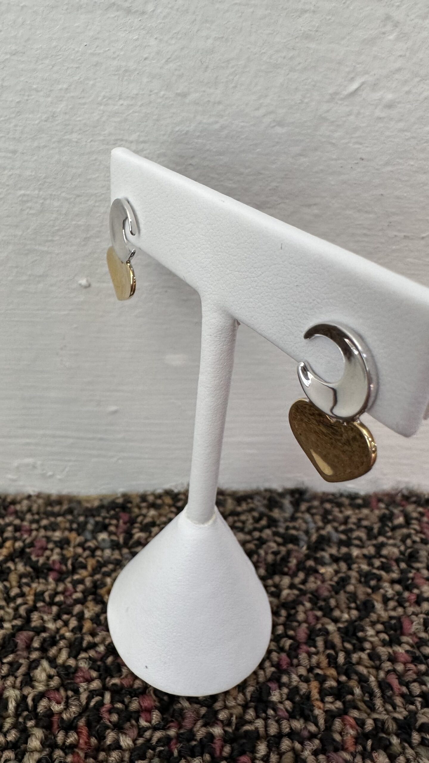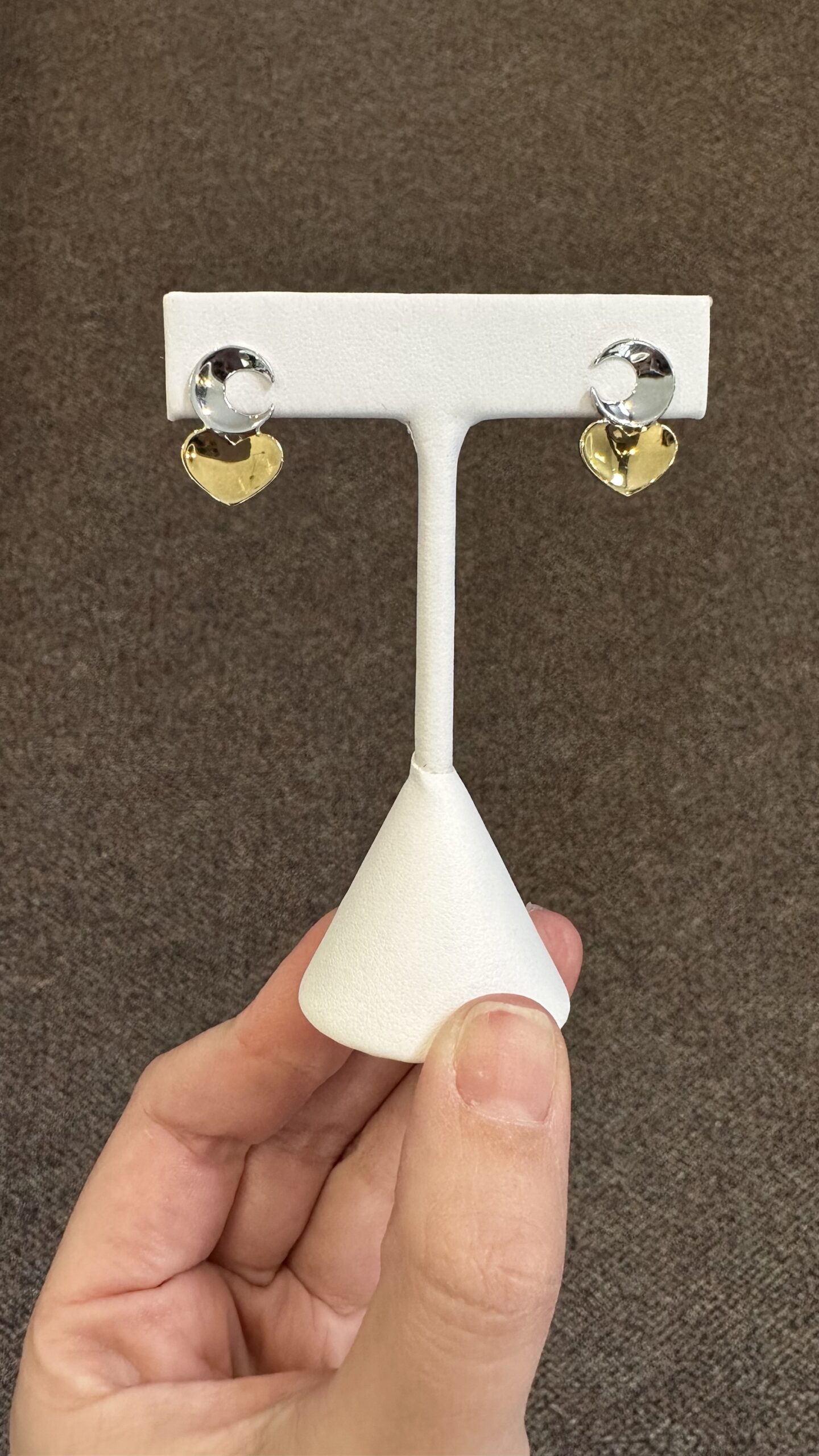 One-of-a-kind 18k white & 18k yellow gold crescent moon & heart stud earrings directly imported from Italy, 18.5 x 12 mm, 4.3 grams.