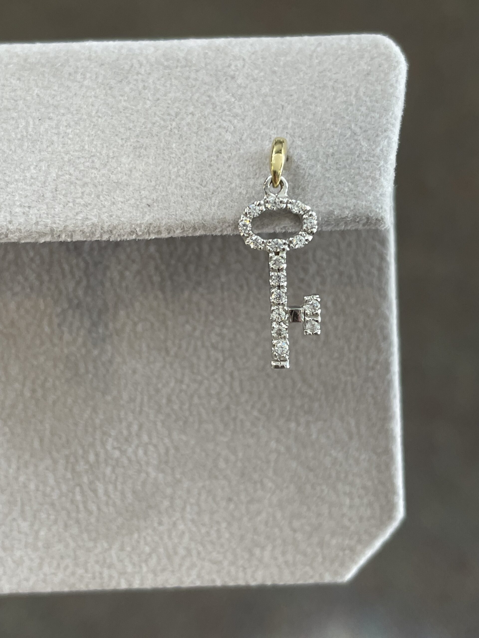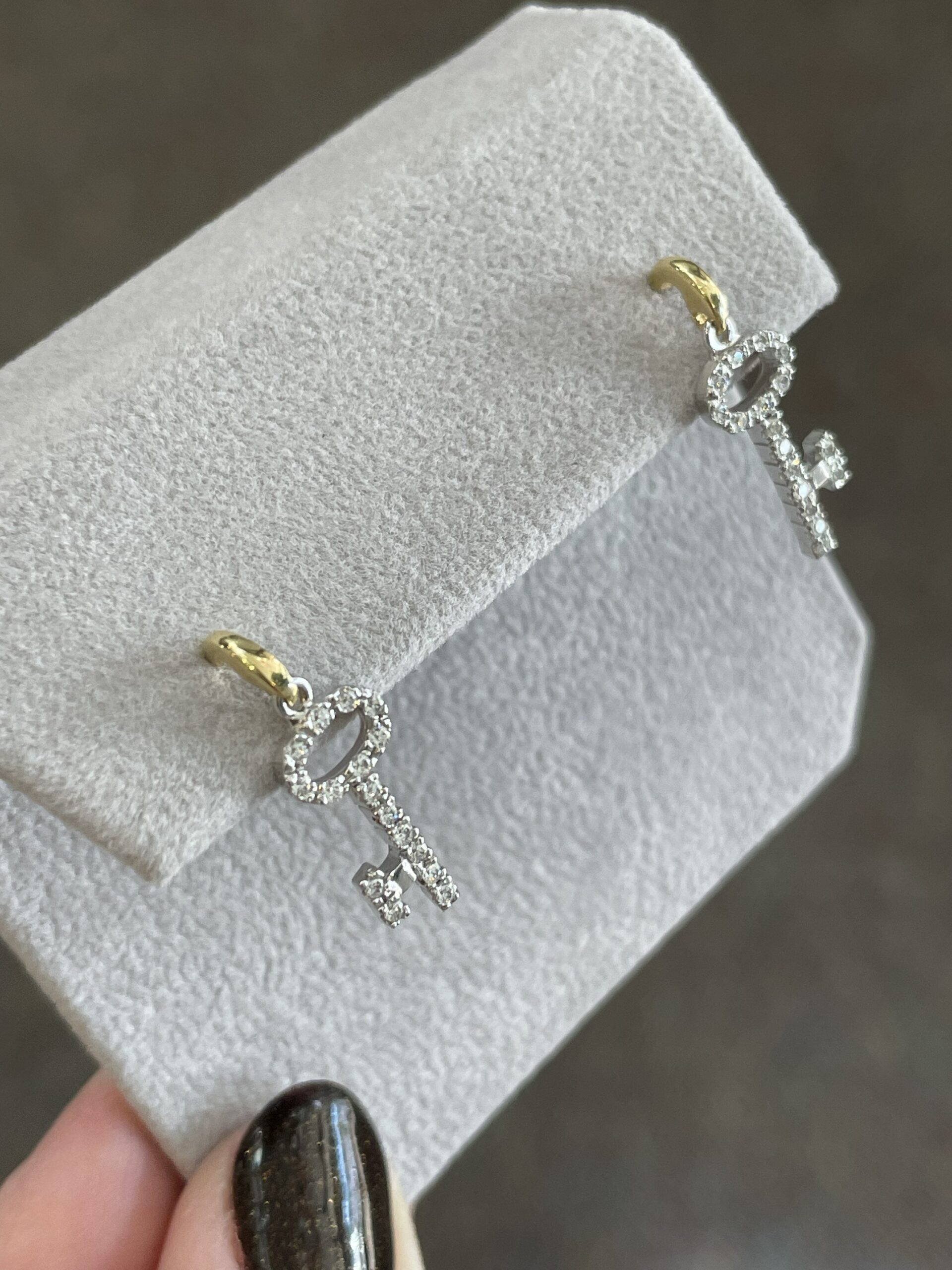 18k yellow & 18k white gold CZ skeleton key dangle stud earrings directly imported from Italy. These earrings have an entire weight of 2.4 grams.