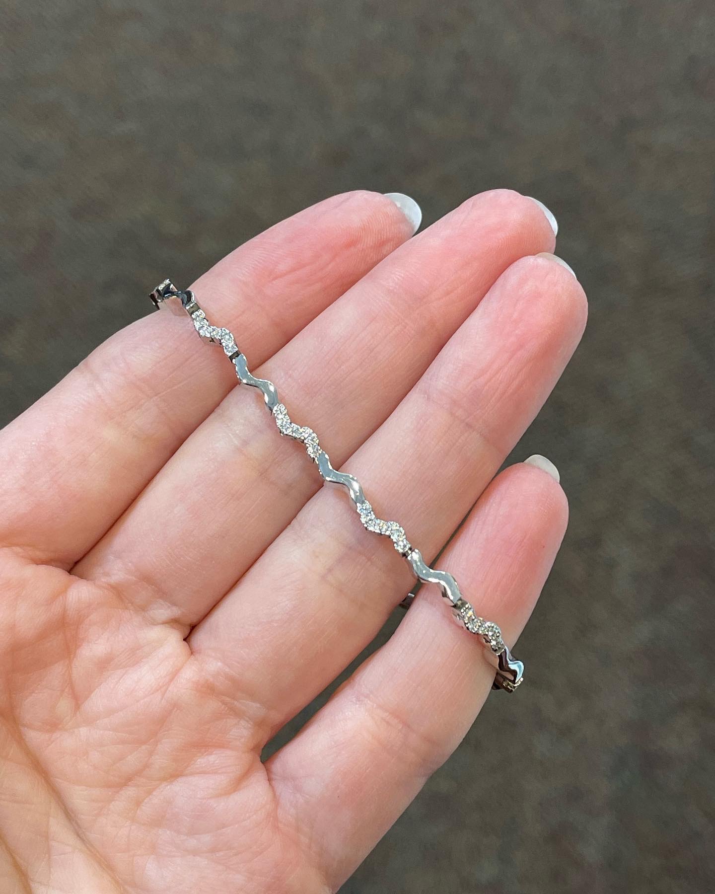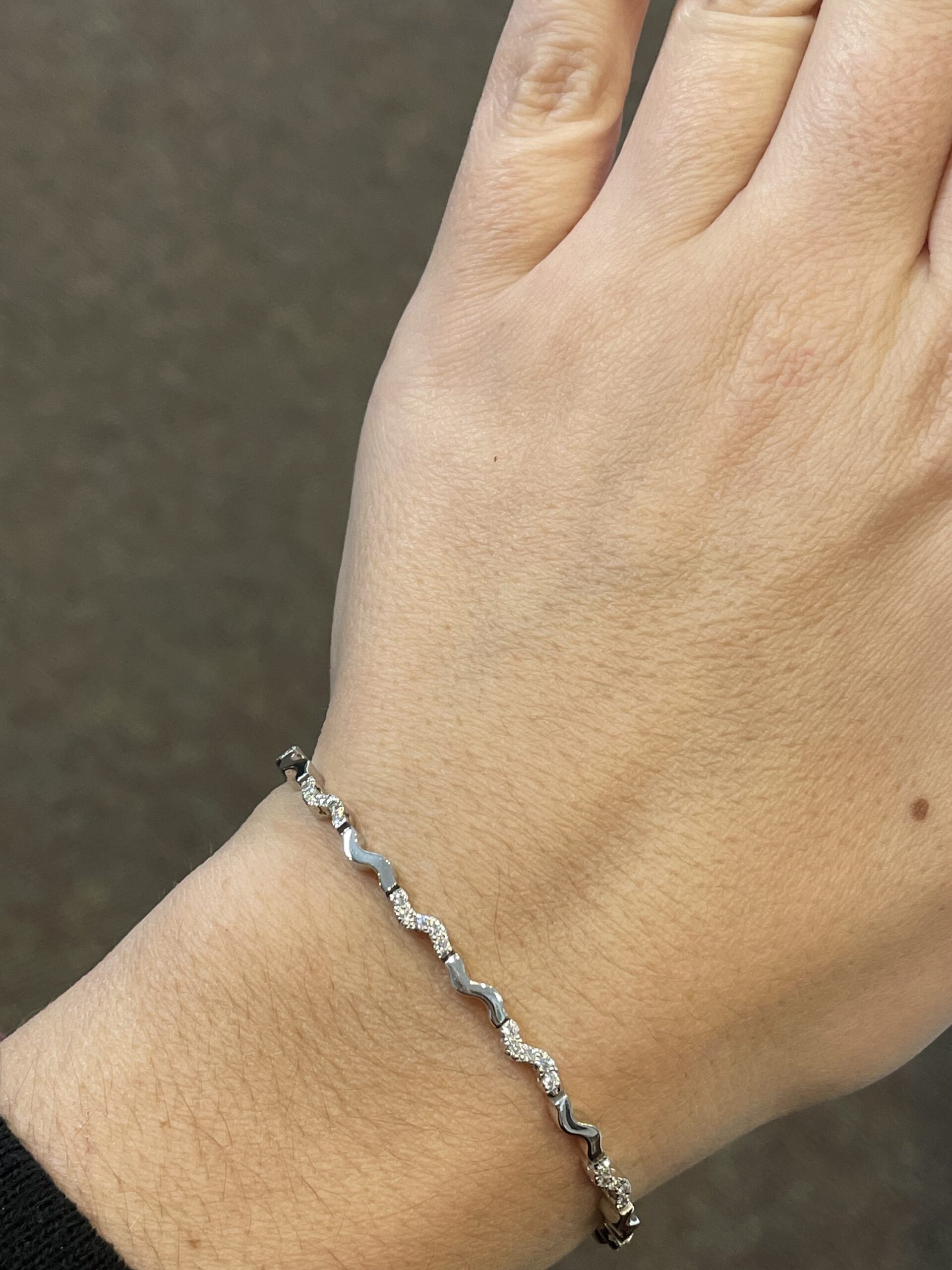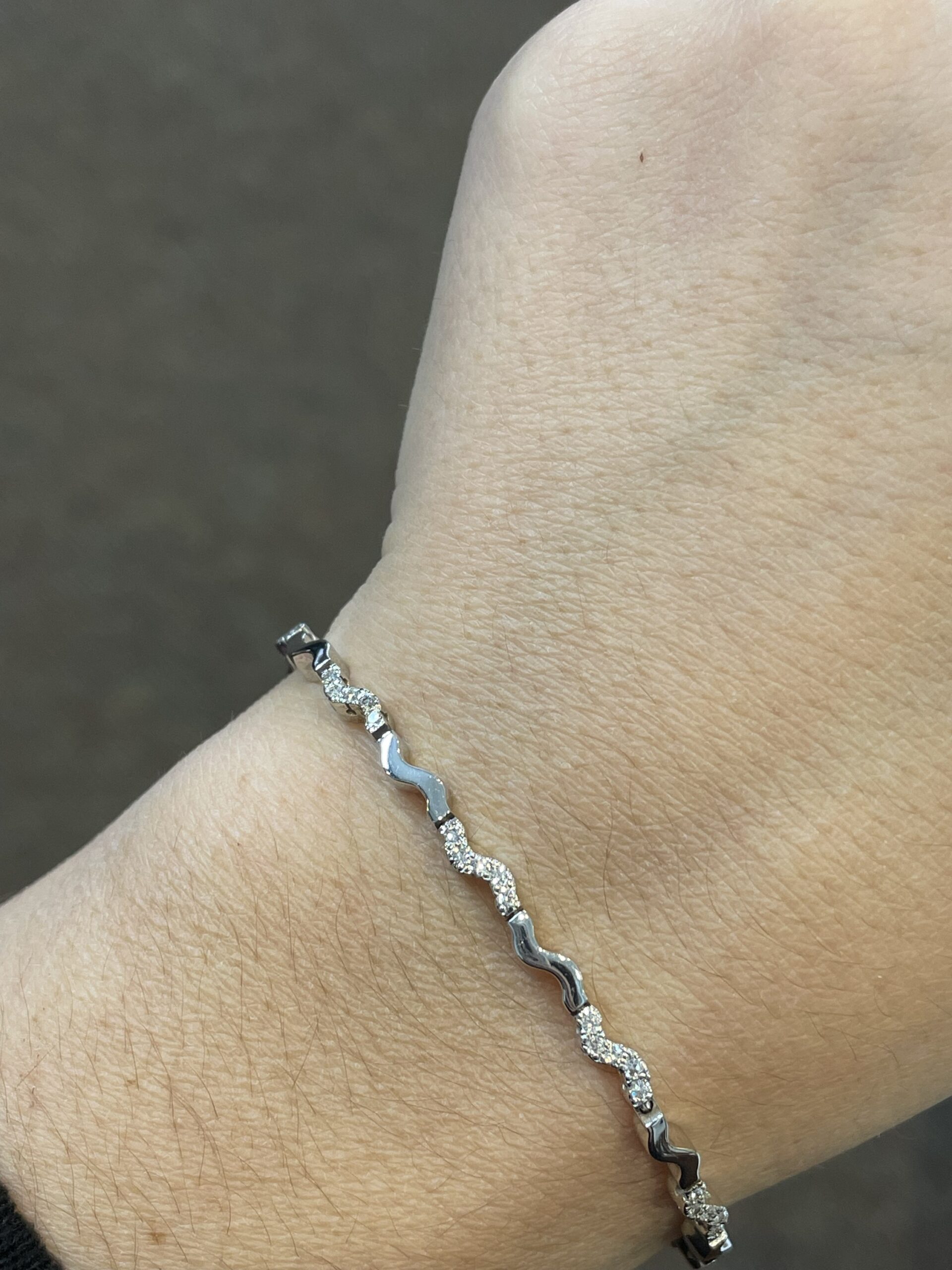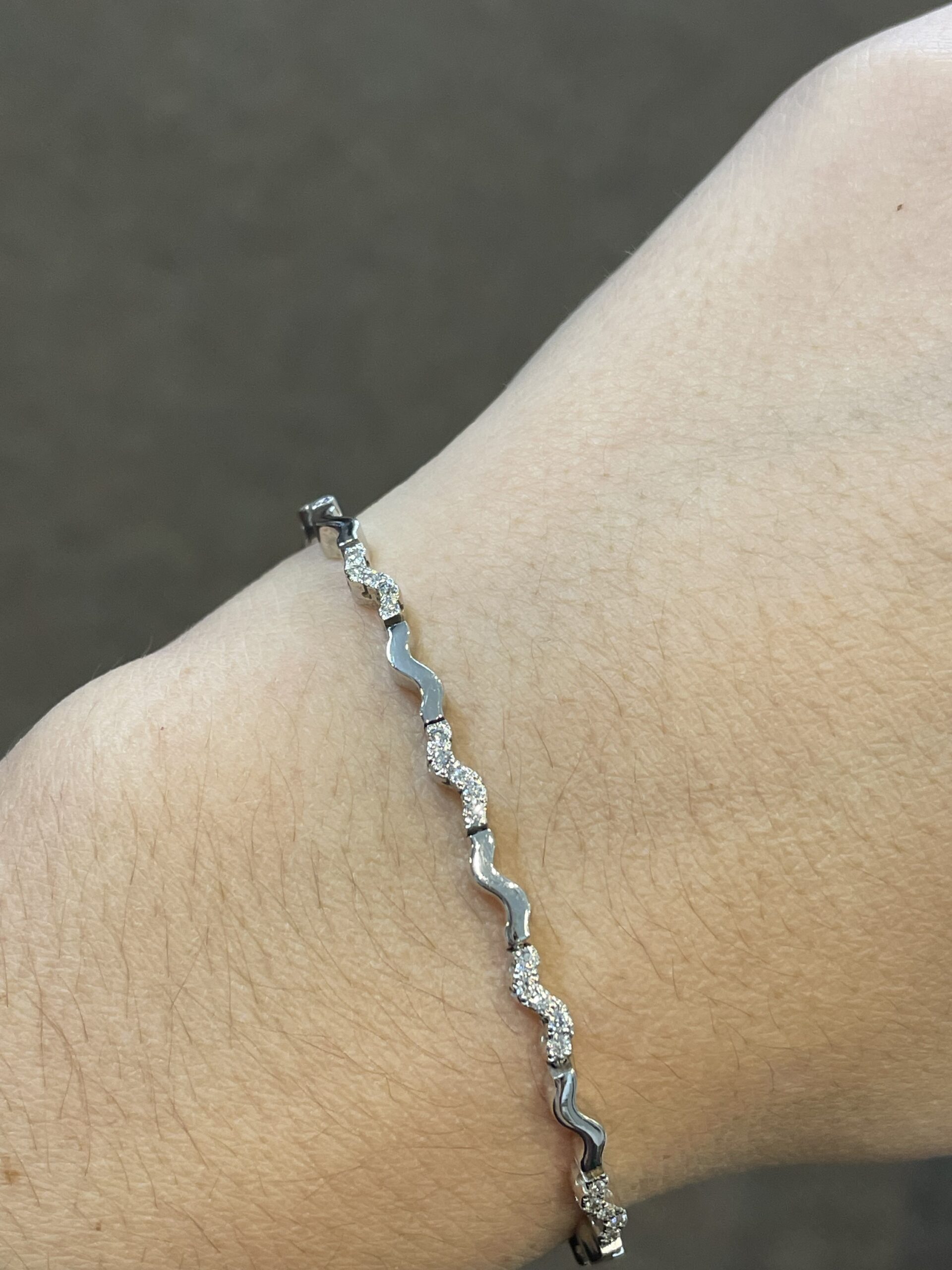 One-of-a-kind 18k white gold genuine 1/2 Cttw Round Brilliant Cut diamond wavy link bracelet from Italy. These diamonds average G-H in color and VS in clarity. This bracelet measures 6 1/2” in length, 2 mm in width, and it has an entire weight of 12 grams.