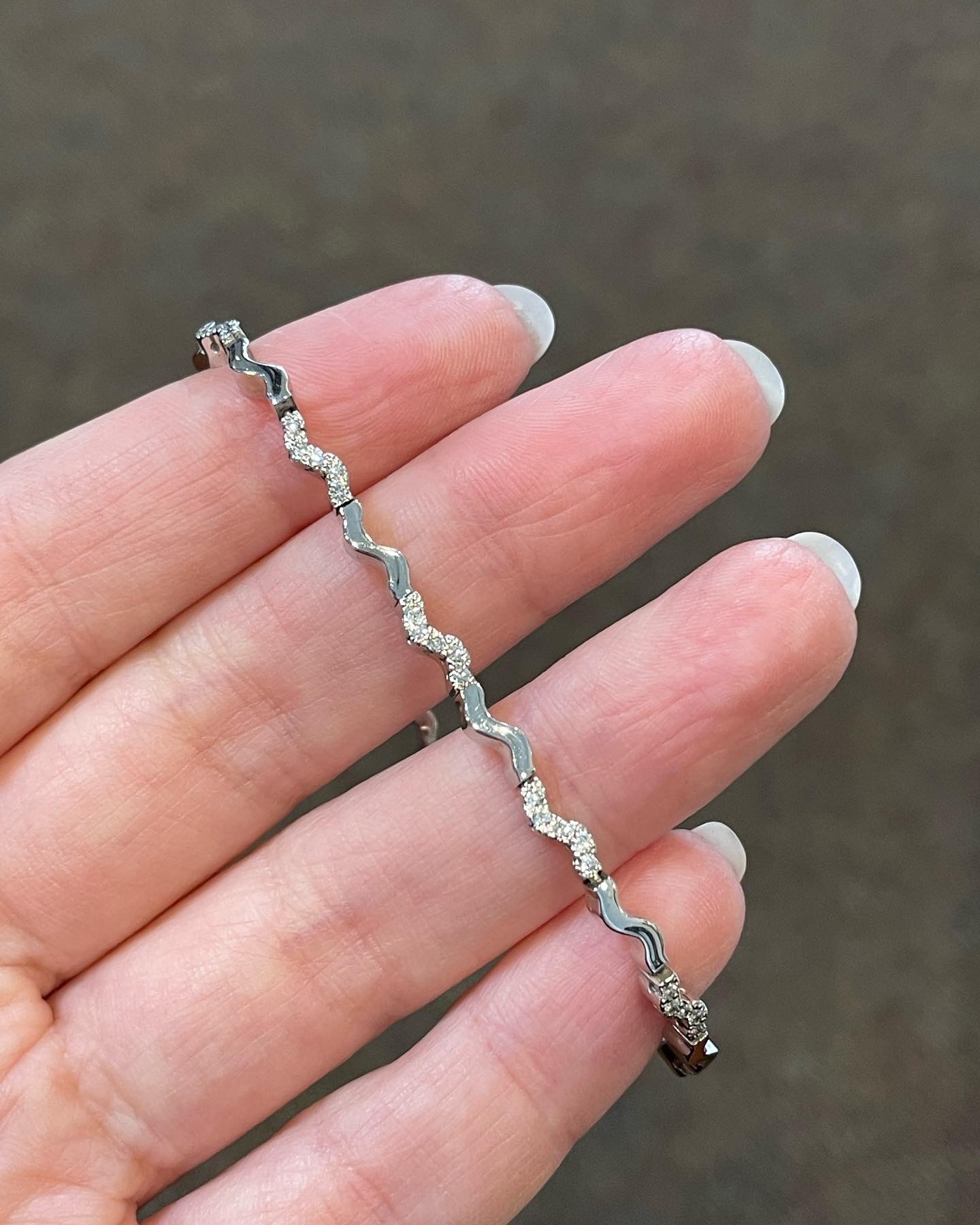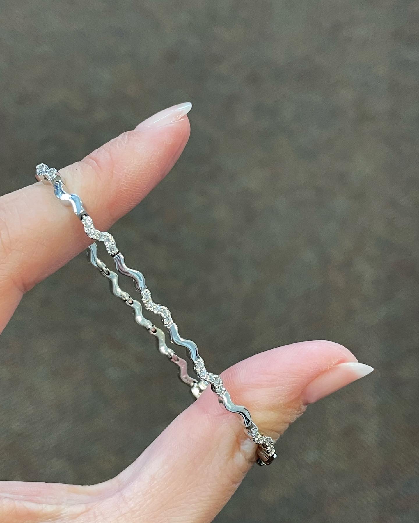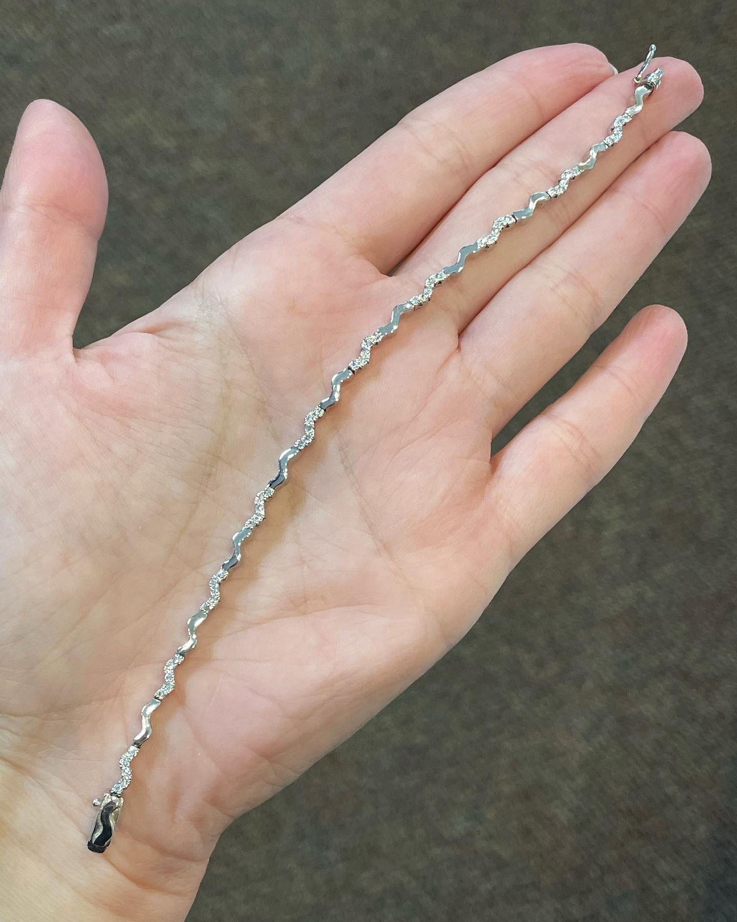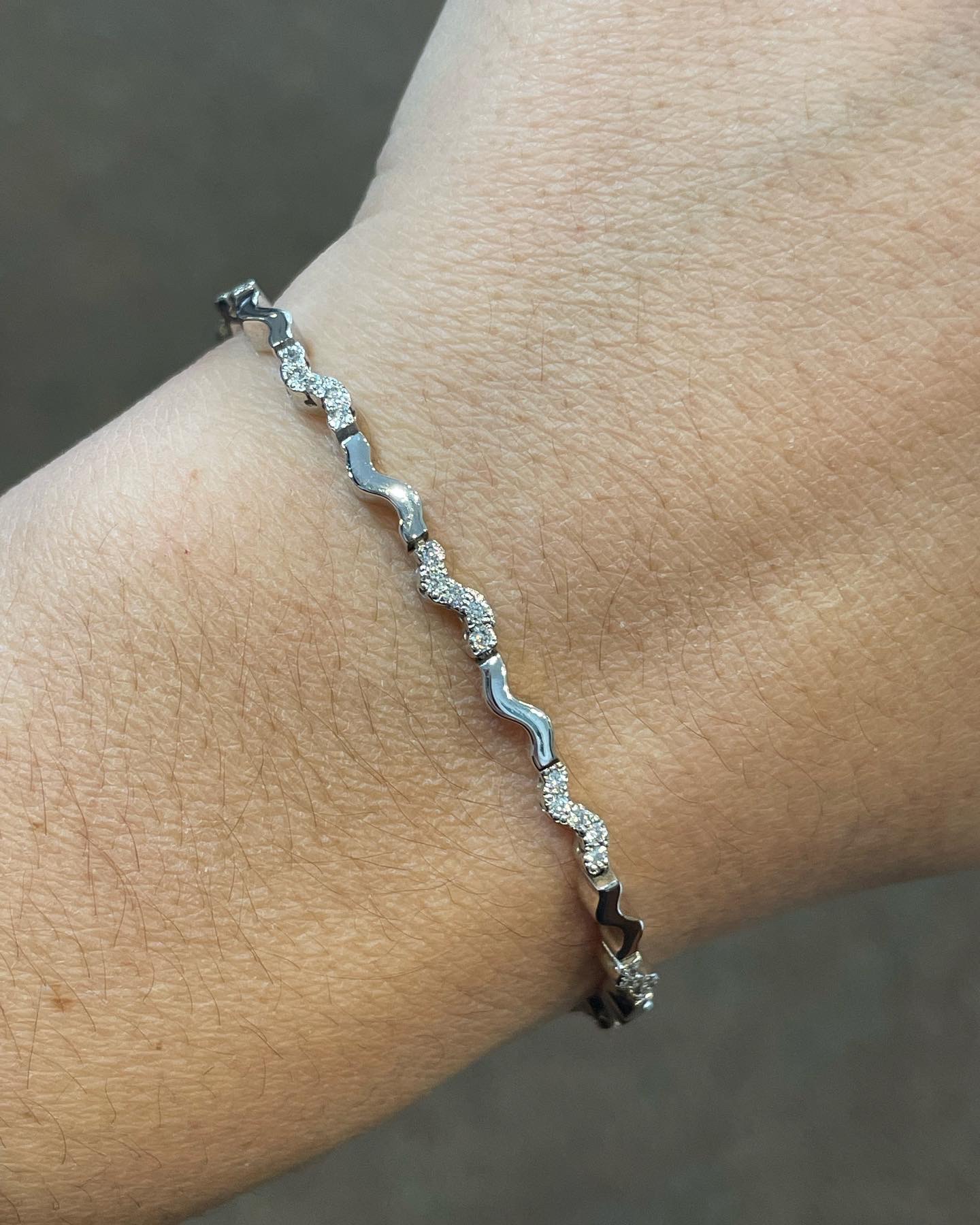 One-of-a-kind 18k white gold genuine 1/2 Cttw Round Brilliant Cut diamond wavy link bracelet from Italy. These diamonds average G-H in color and VS in clarity. This bracelet measures 6 1/2” in length, 2 mm in width, and it has an entire weight of 12 grams.