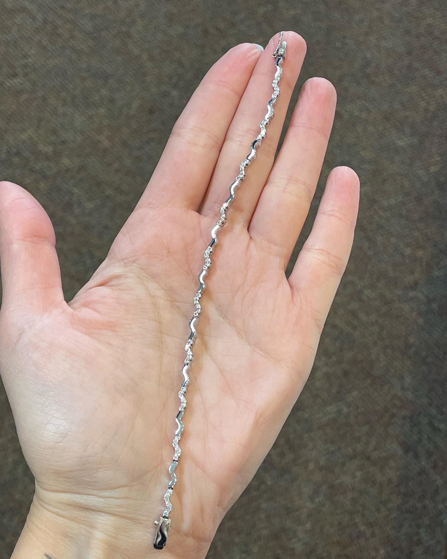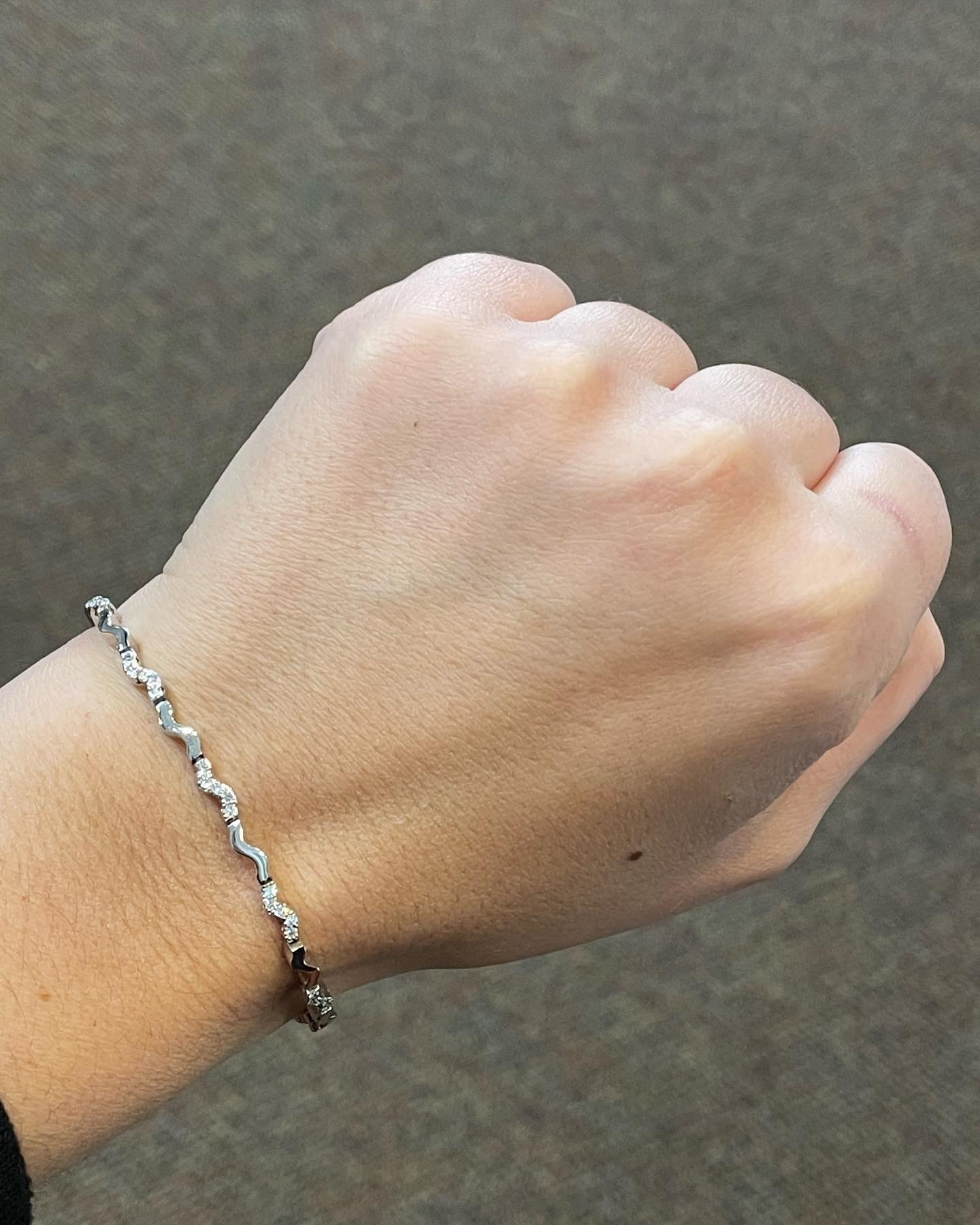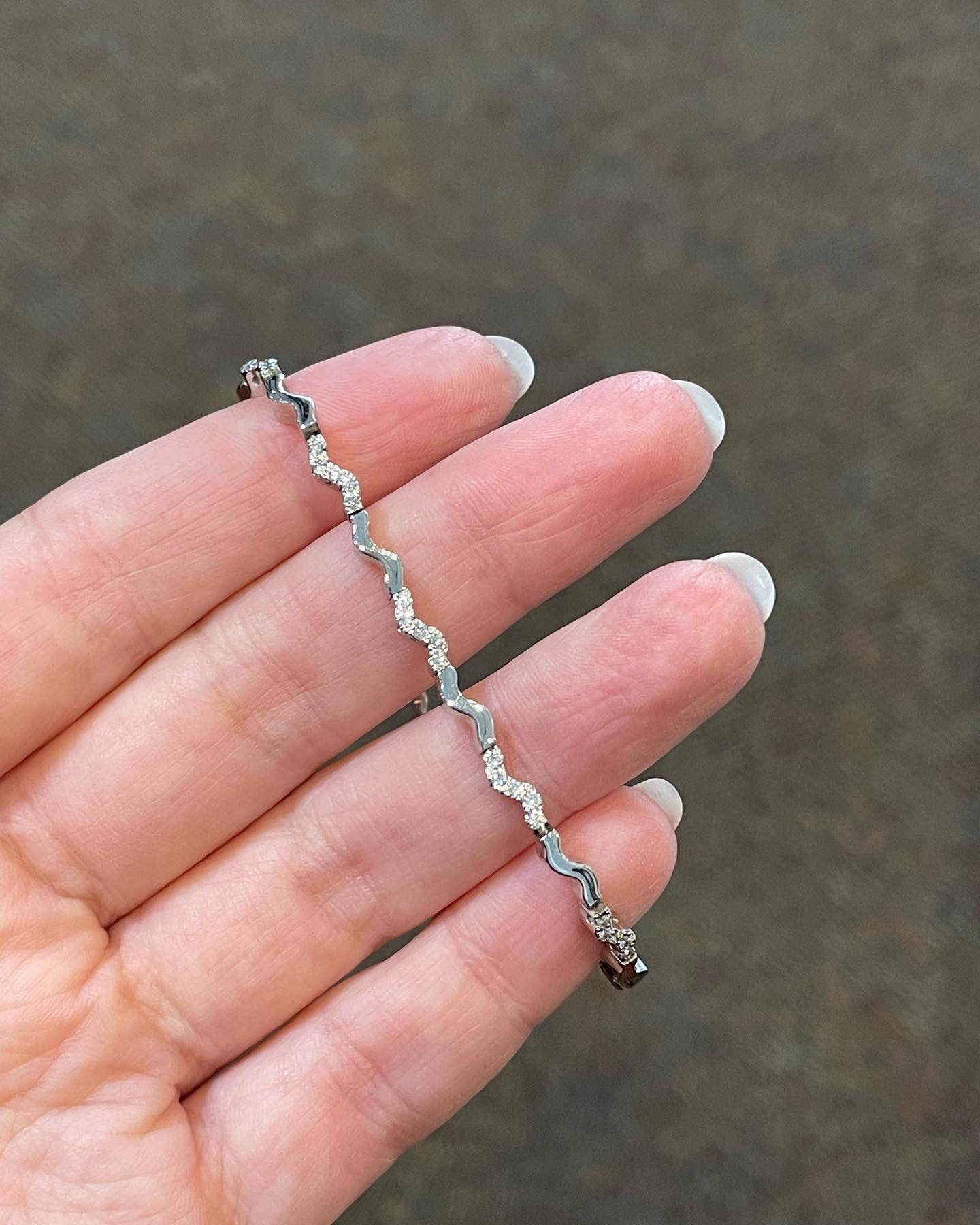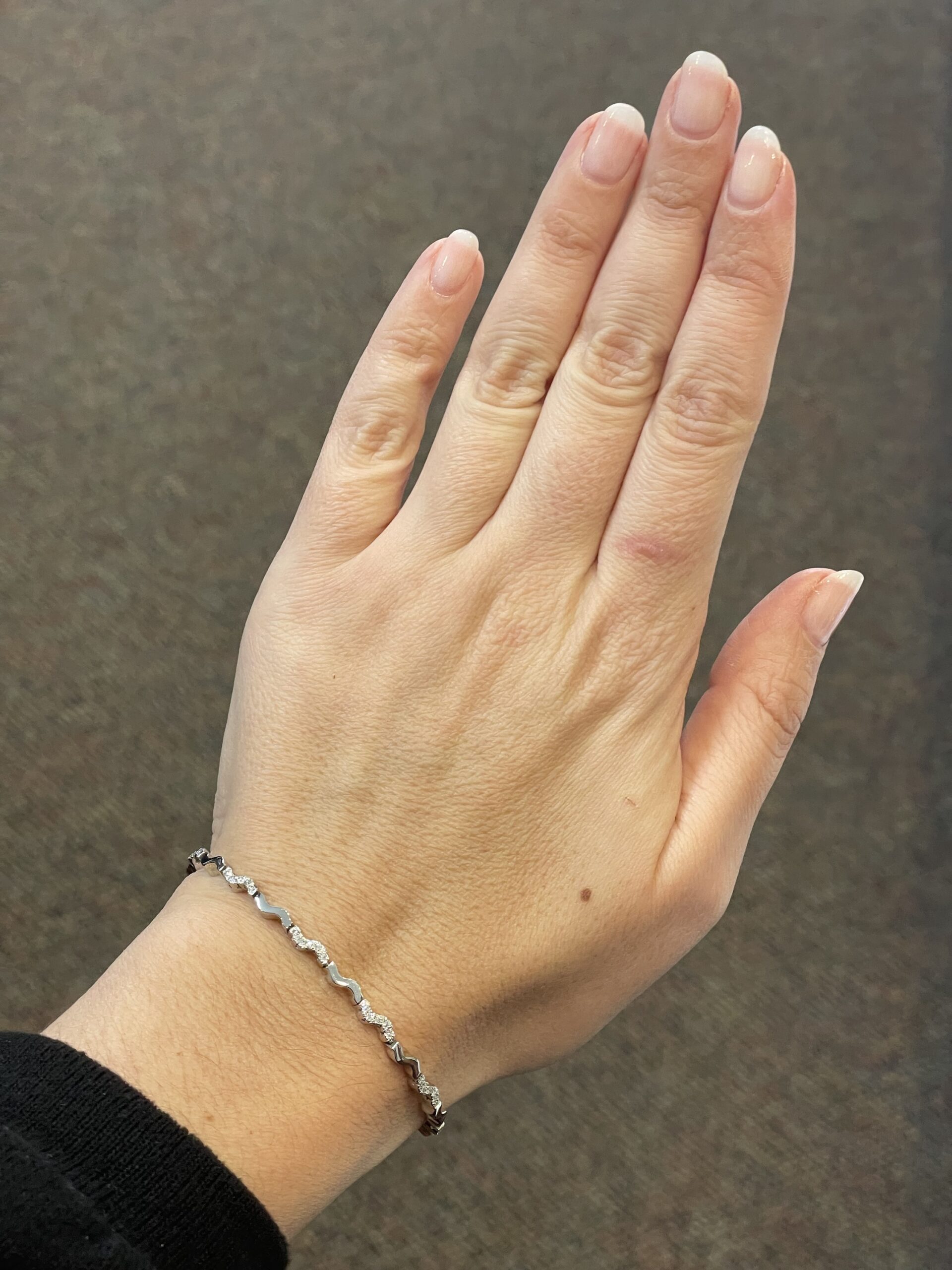 One-of-a-kind 18k white gold genuine 1/2 Cttw Round Brilliant Cut diamond wavy link bracelet from Italy. These diamonds average G-H in color and VS in clarity. This bracelet measures 6 1/2” in length, 2 mm in width, and it has an entire weight of 12 grams.