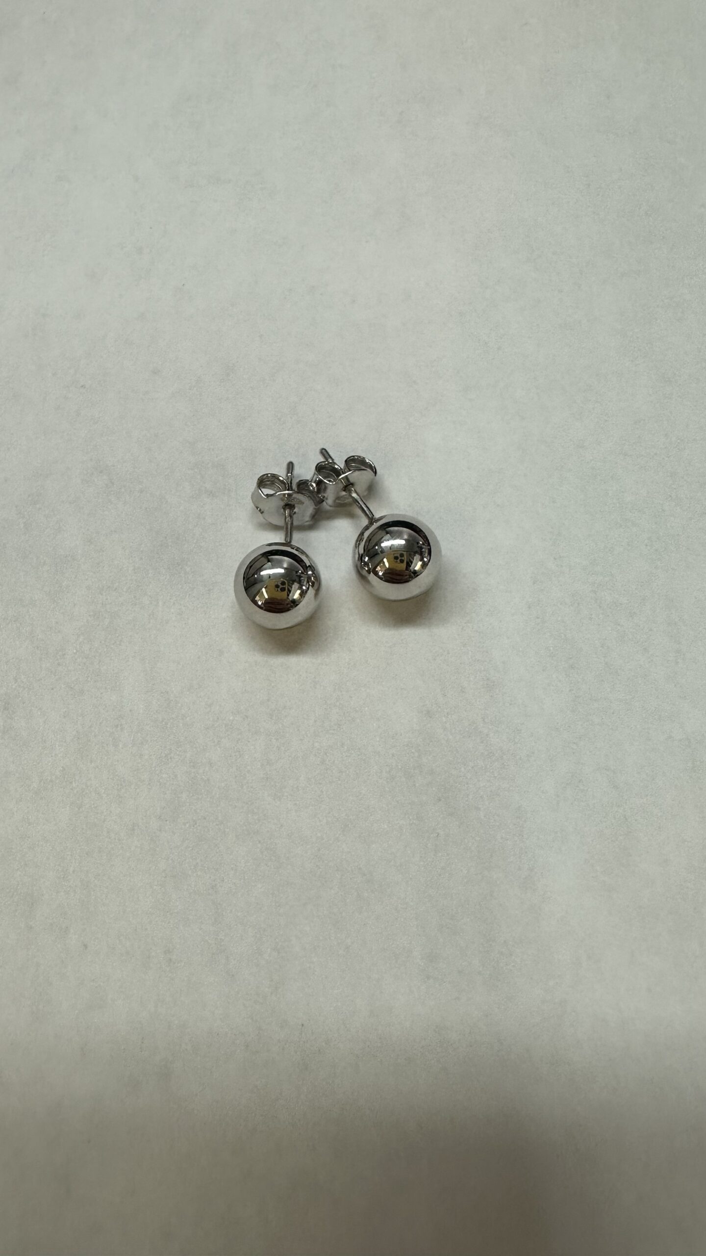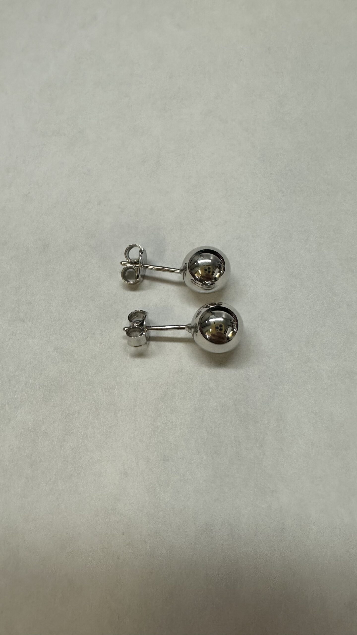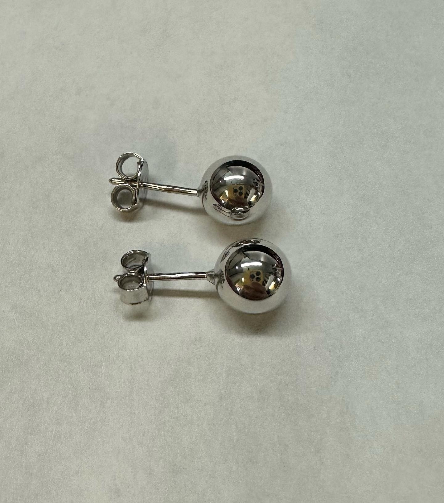 One pair available! 18k white gold 7.5 mm polished ball stud earrings imported from Italy, 2.25 grams.