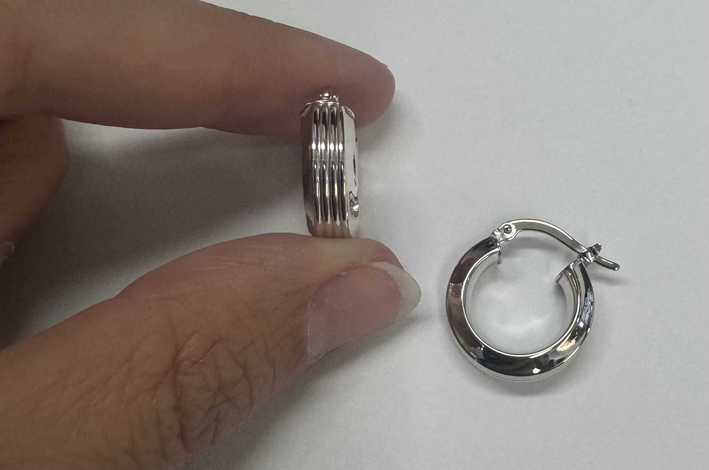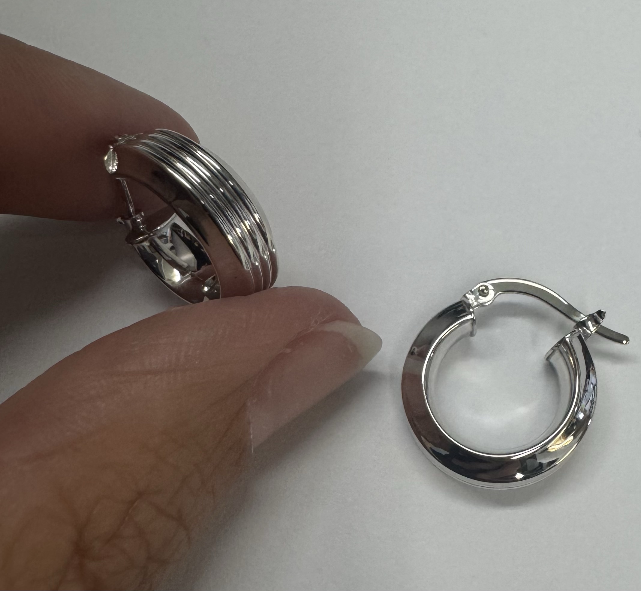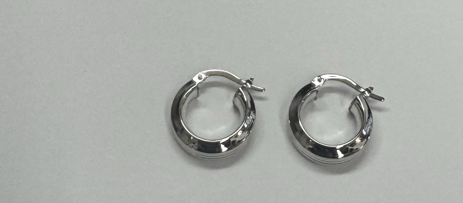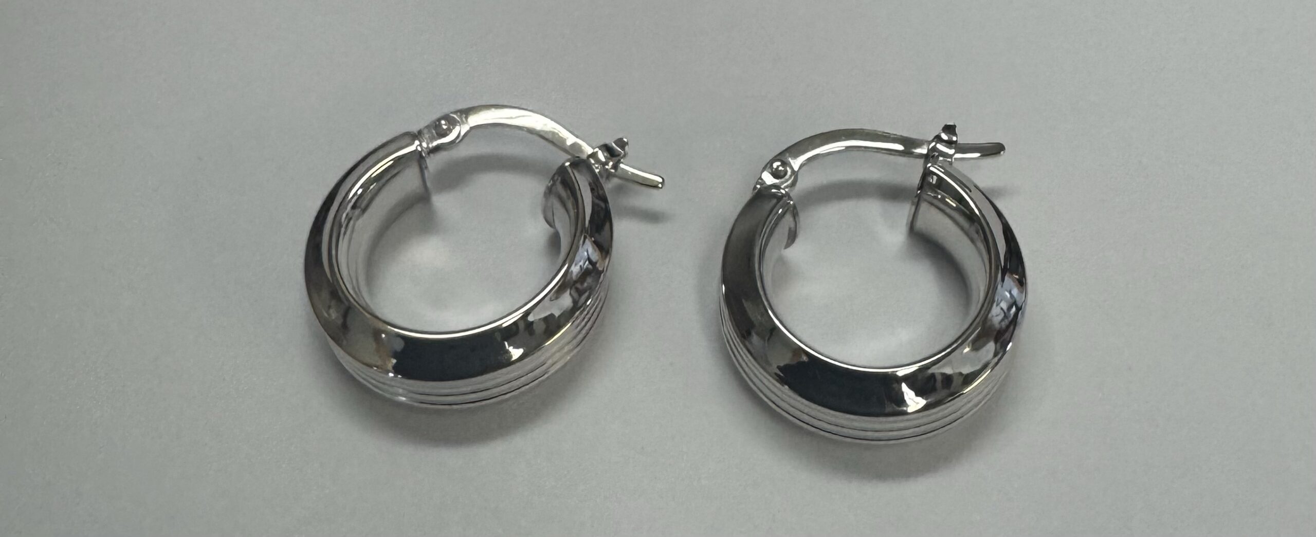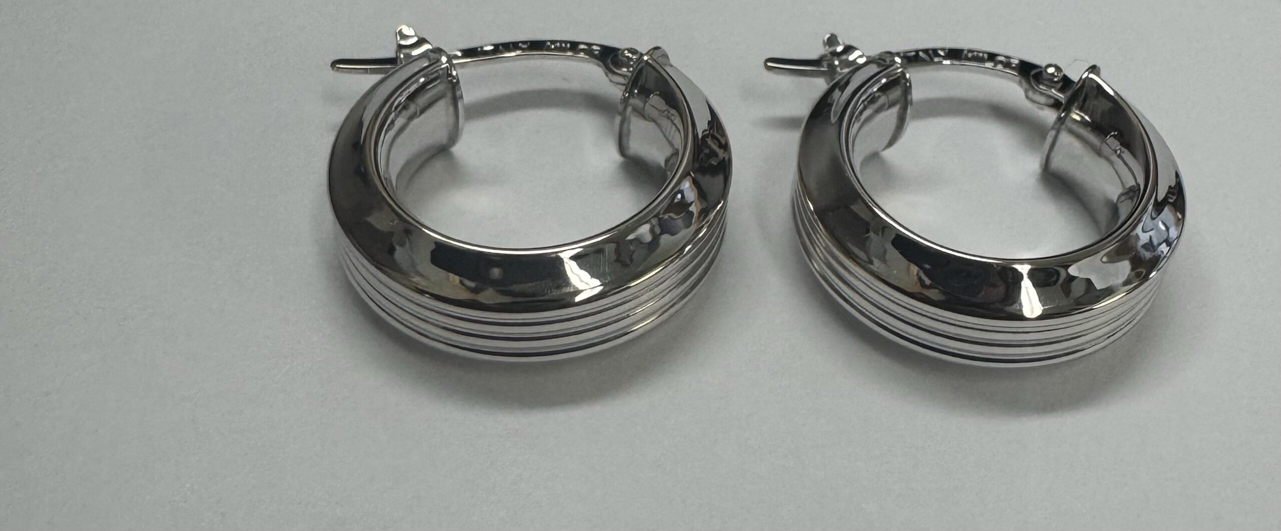 18k white gold chunky hoop earrings with details. These hoops measure 16.79 x 5.91 mm in size, and they have an entire weight of 2.3 grams.