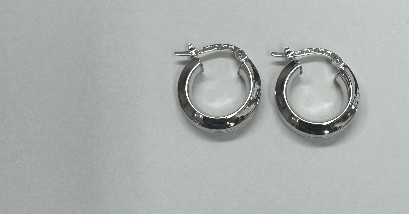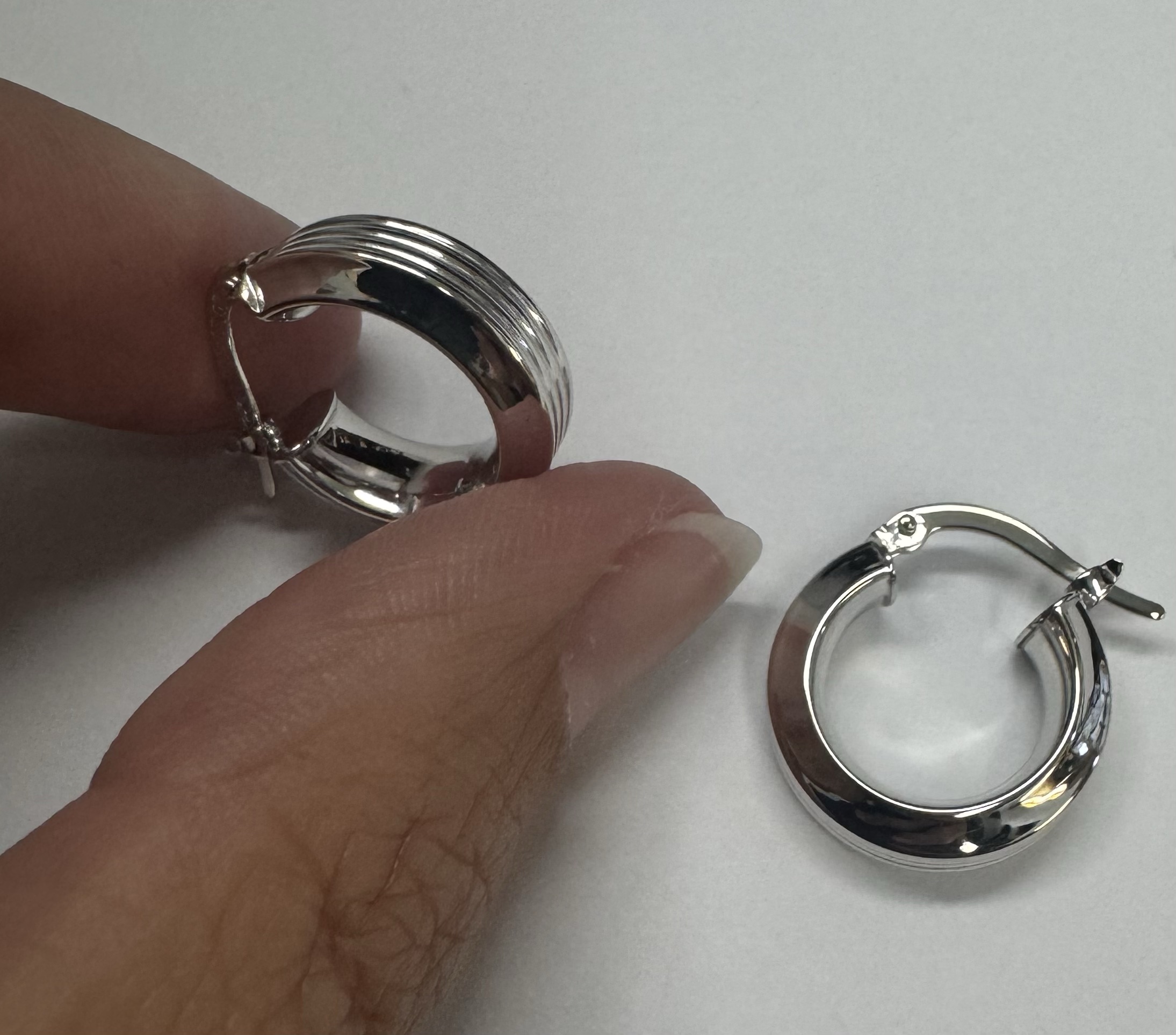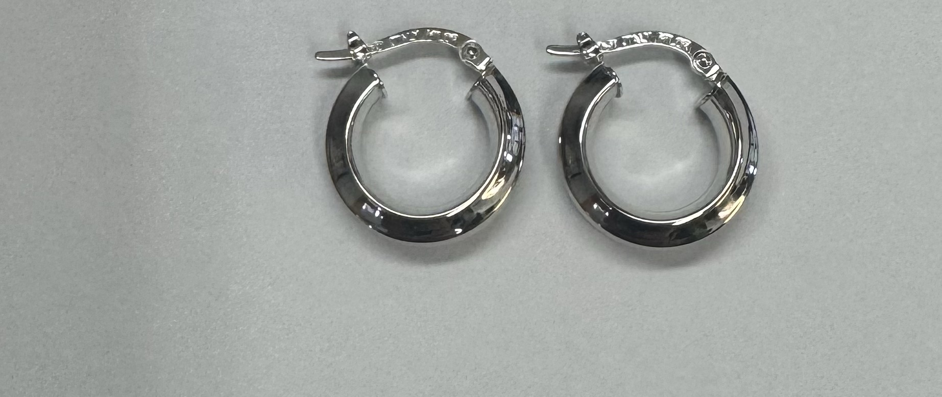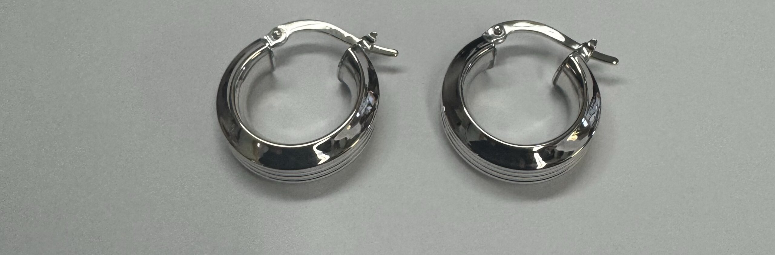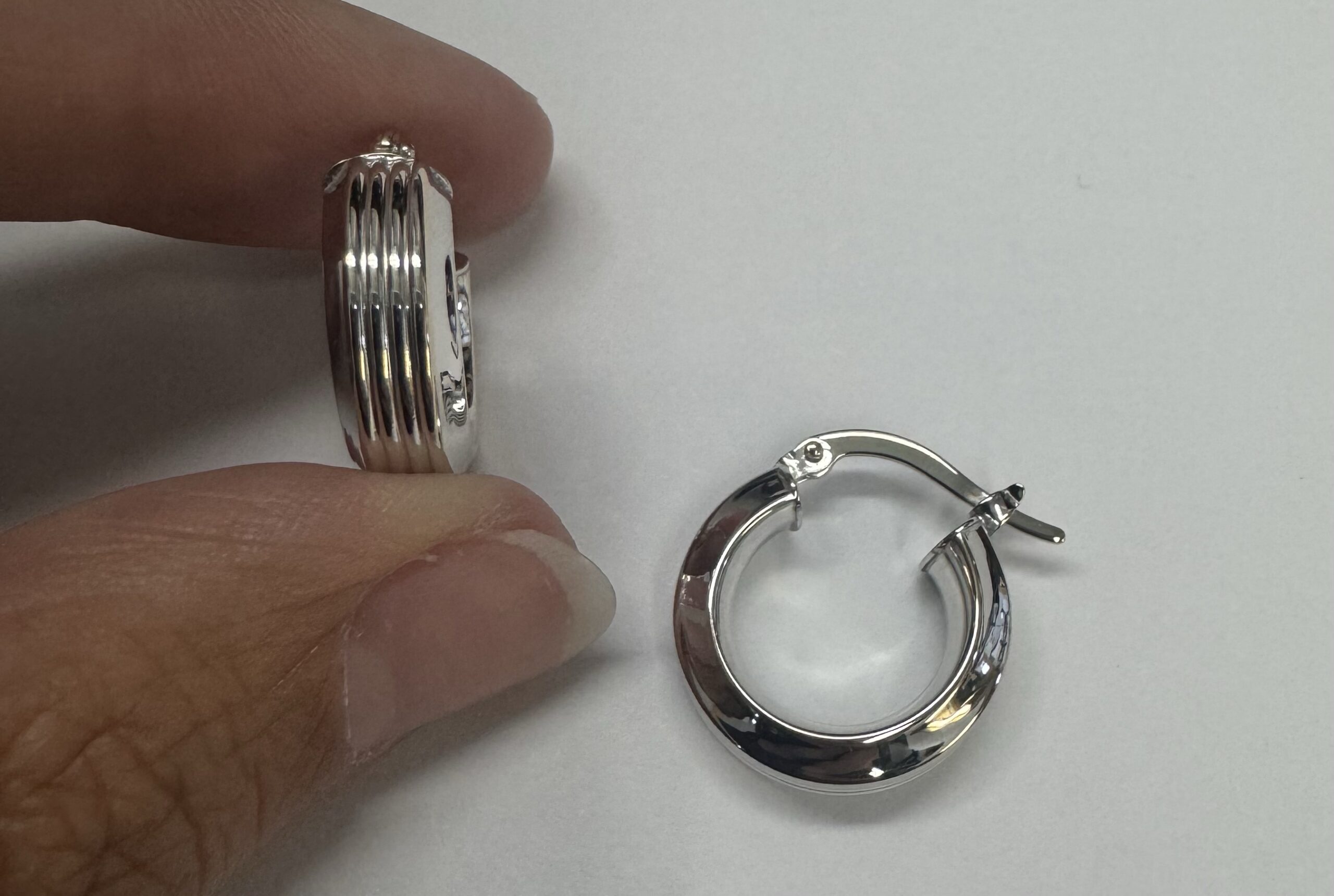 18k white gold chunky hoop earrings with details. These hoops measure 16.79 x 5.91 mm in size, and they have an entire weight of 2.3 grams.