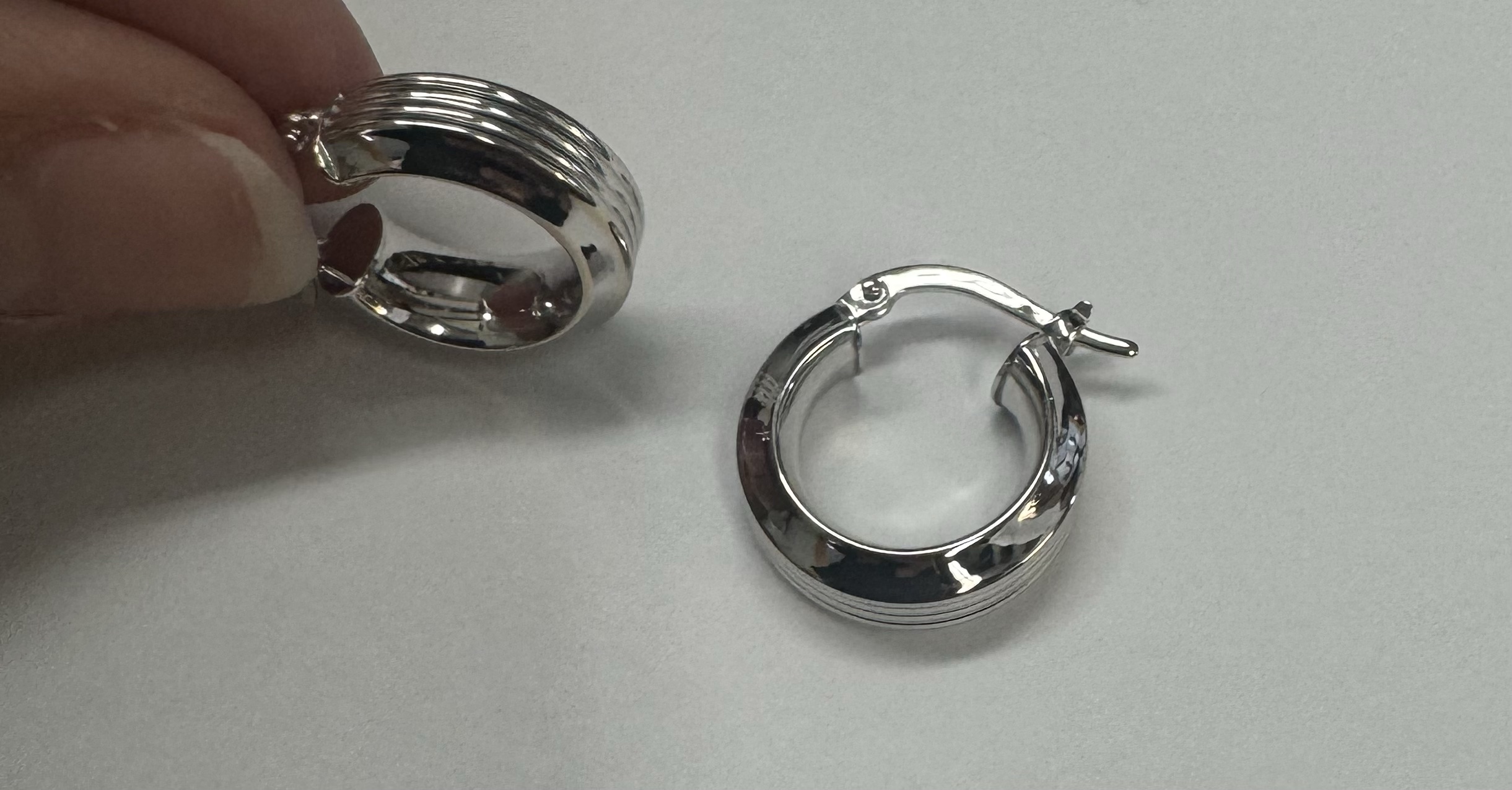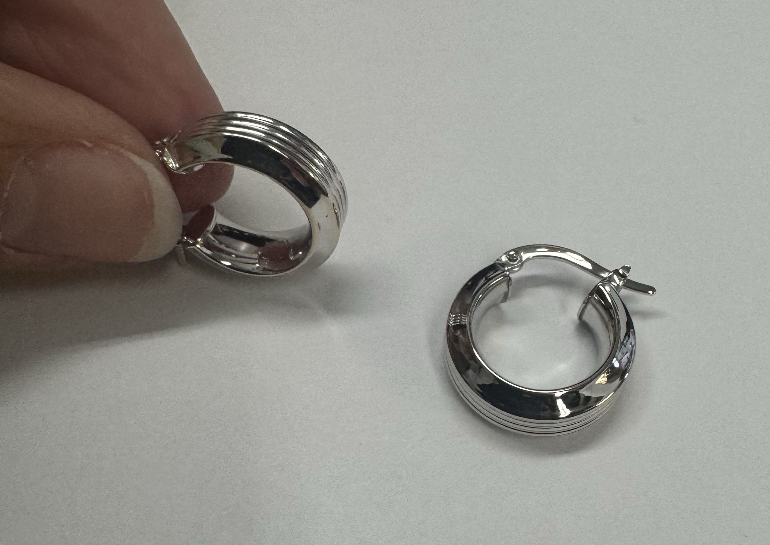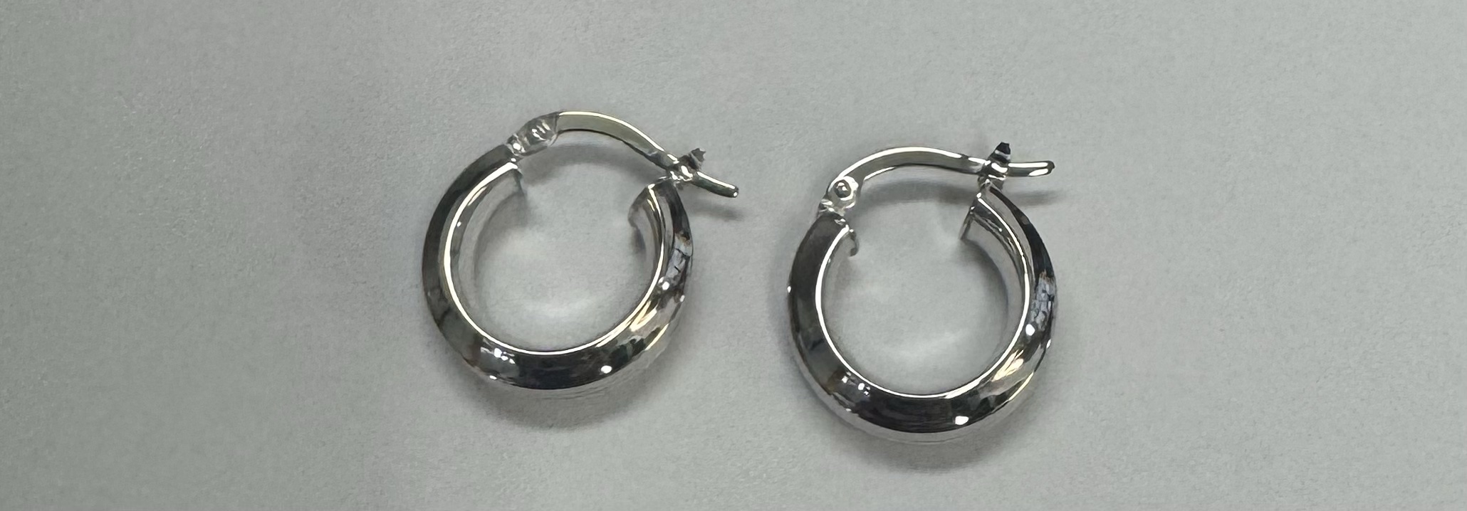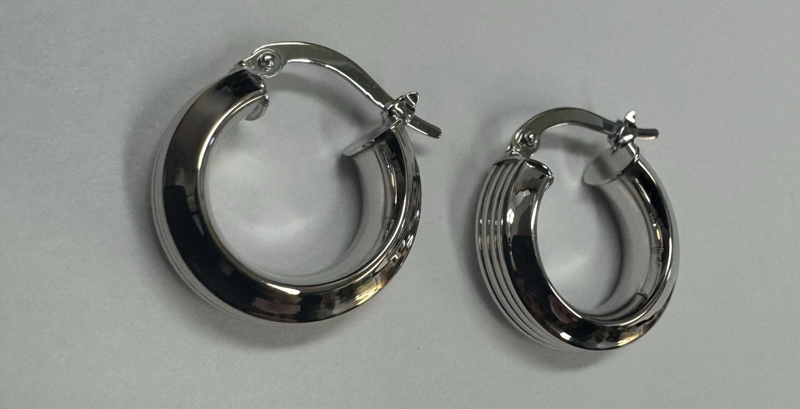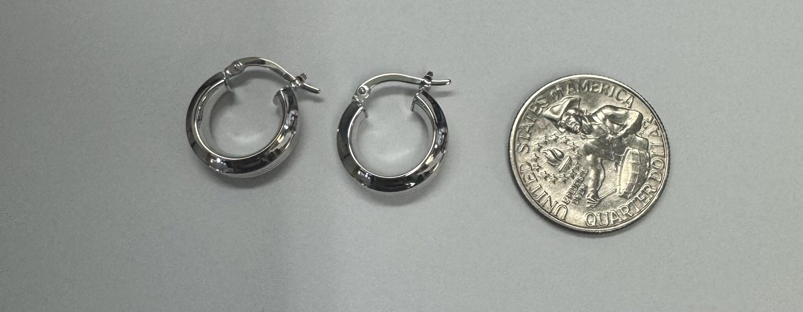 18k white gold chunky hoop earrings with details. These hoops measure 16.79 x 5.91 mm in size, and they have an entire weight of 2.3 grams.