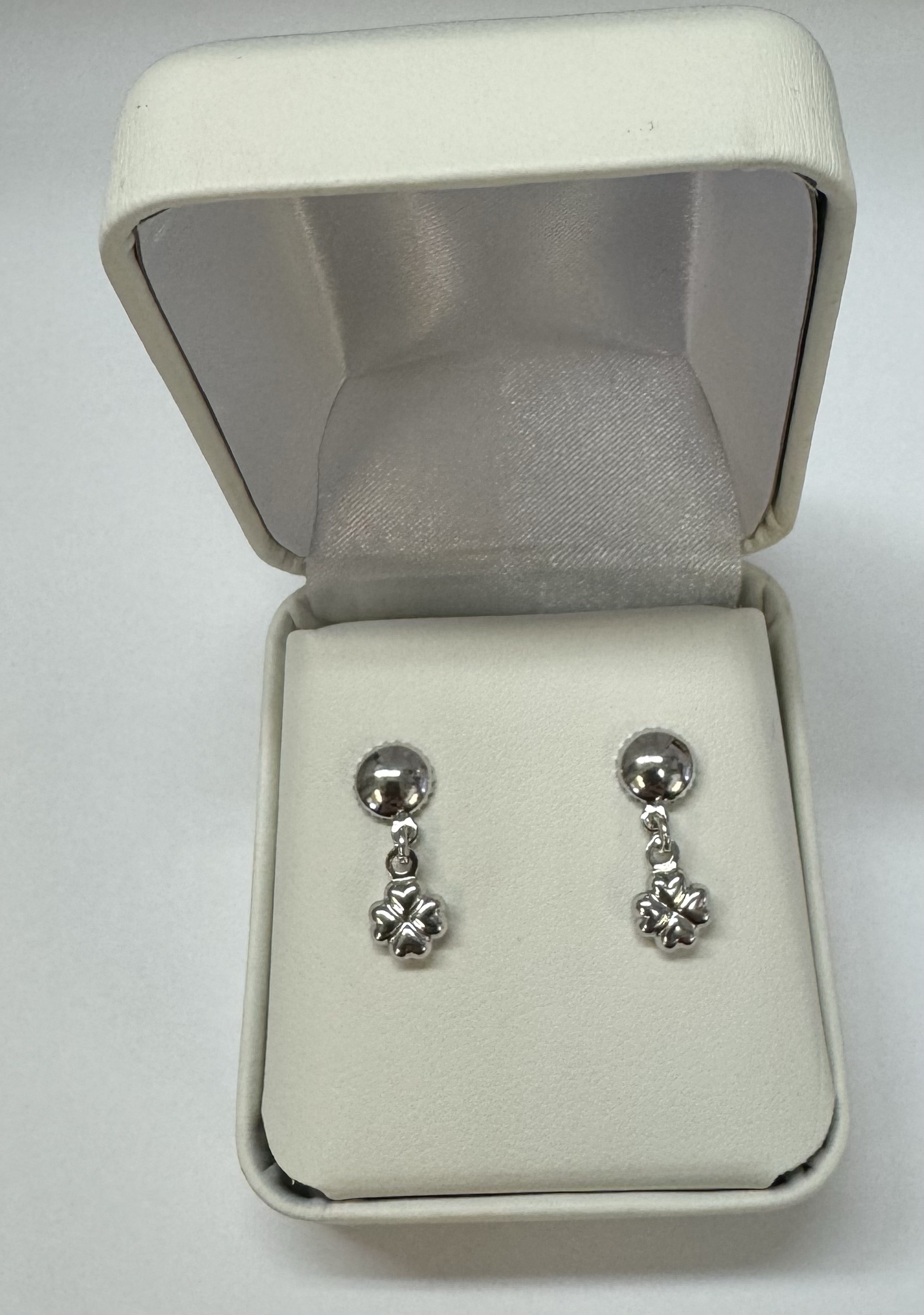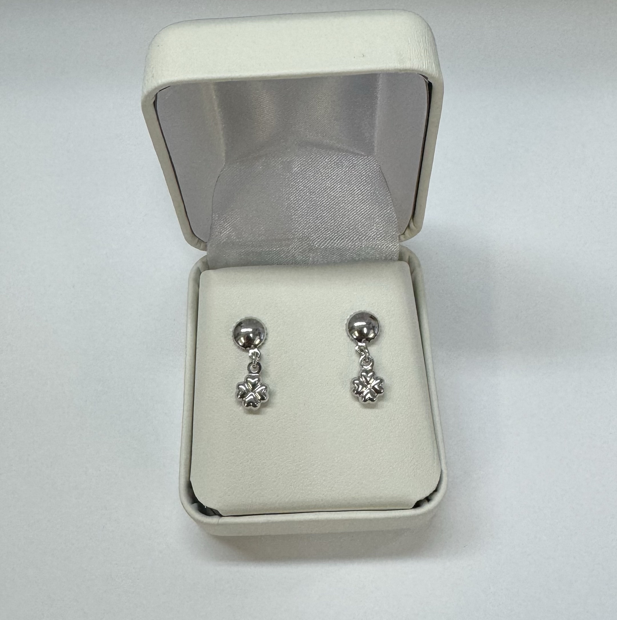 One-of-a-kind 18k white gold Clover style dangle stud earrings directly imported from Italy. These earrings have an entire weight of 1.9 grams.