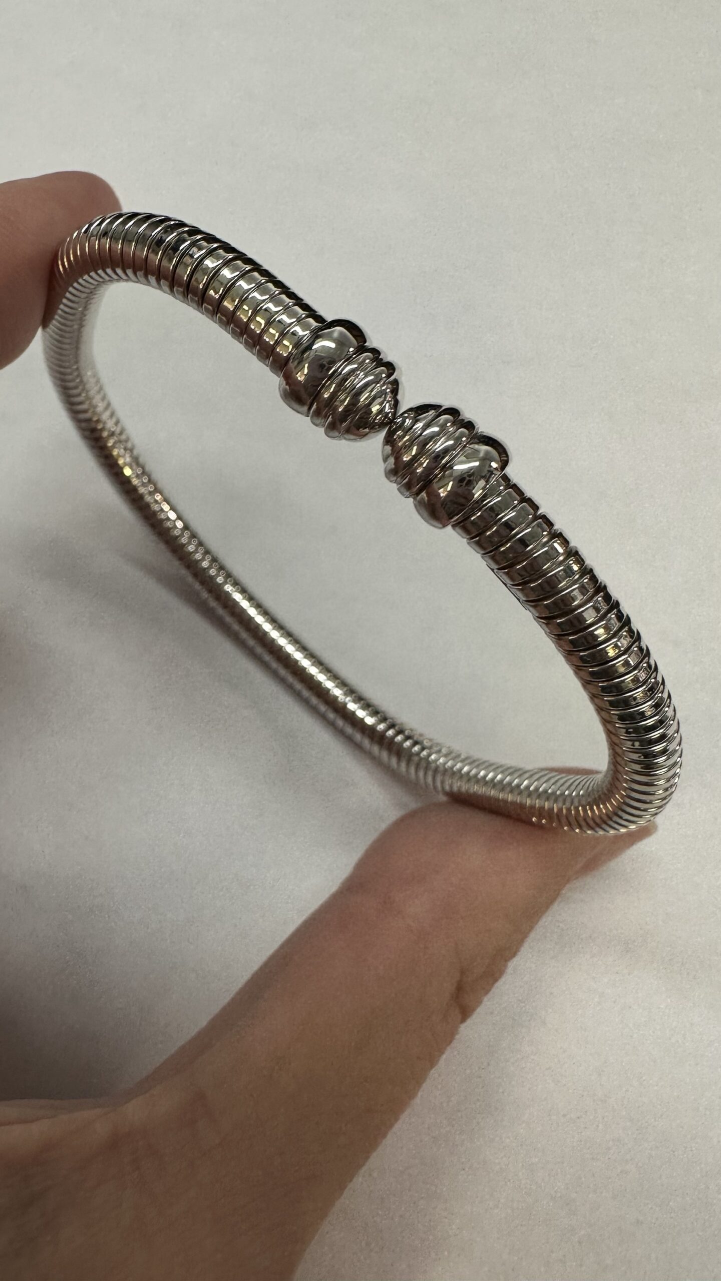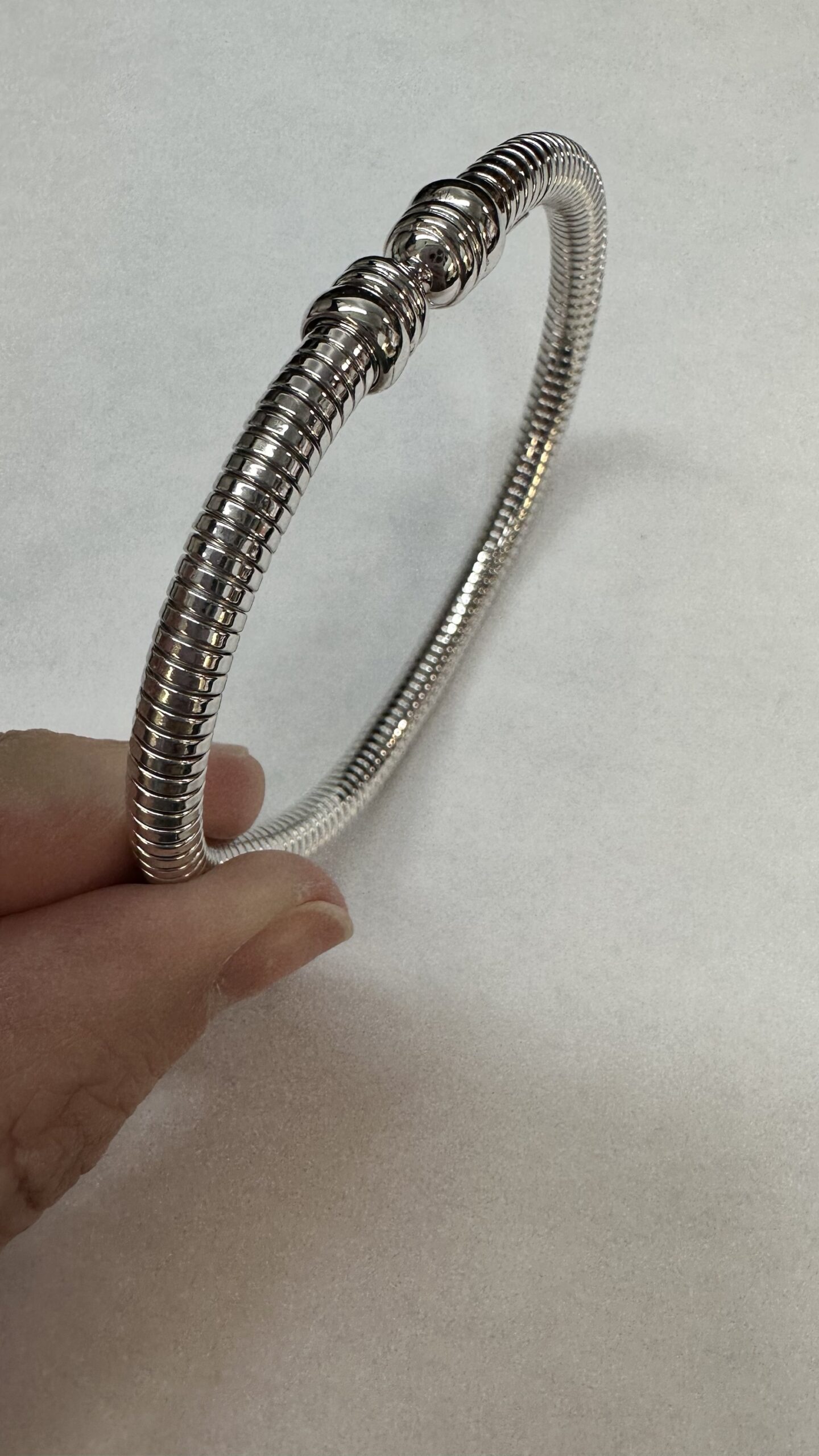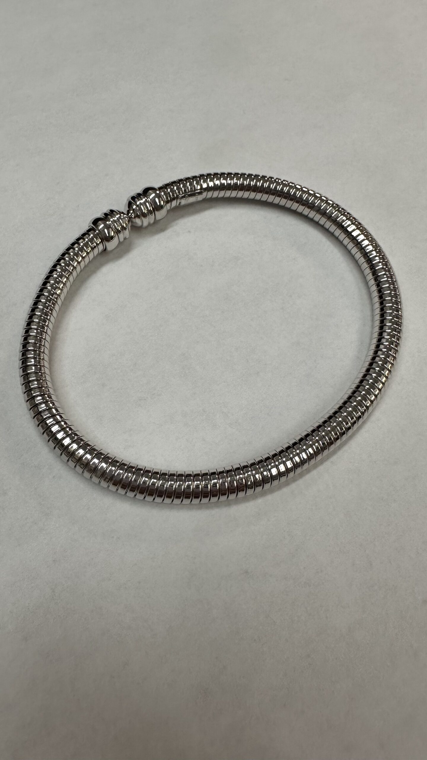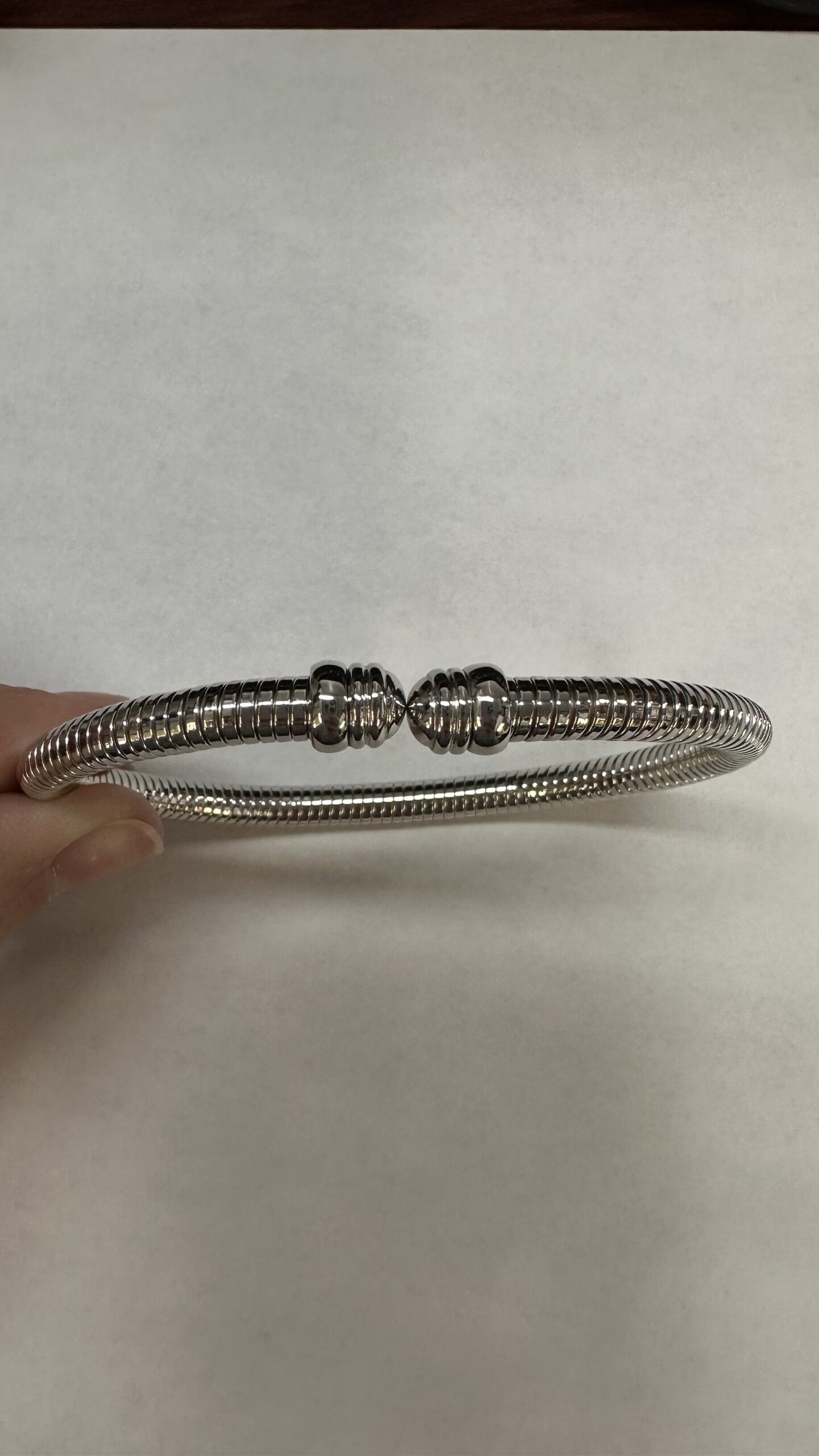 Also available in 18k white gold! One-of-a-kind 18k white gold flexible coil cuff style bracelet directly imported from Italy, 5 mm, 8” when measured all of the way around the outside, 18.16 grams.