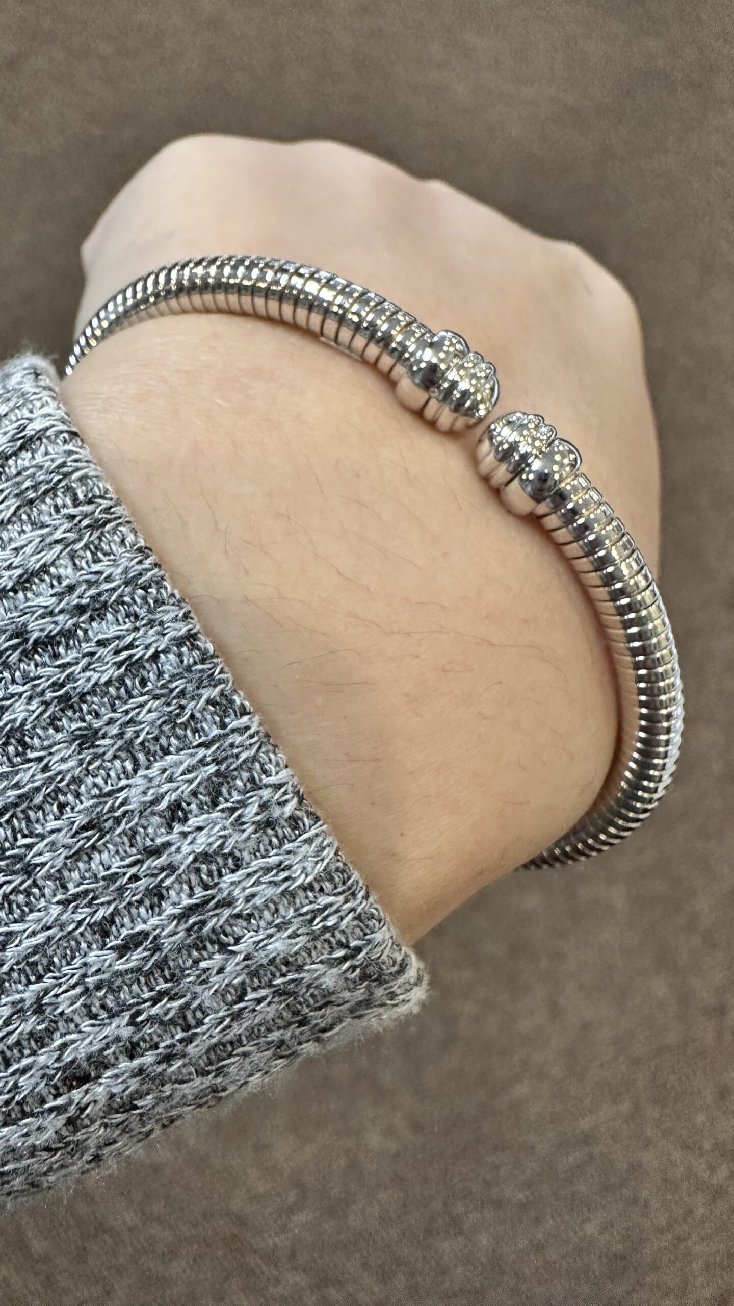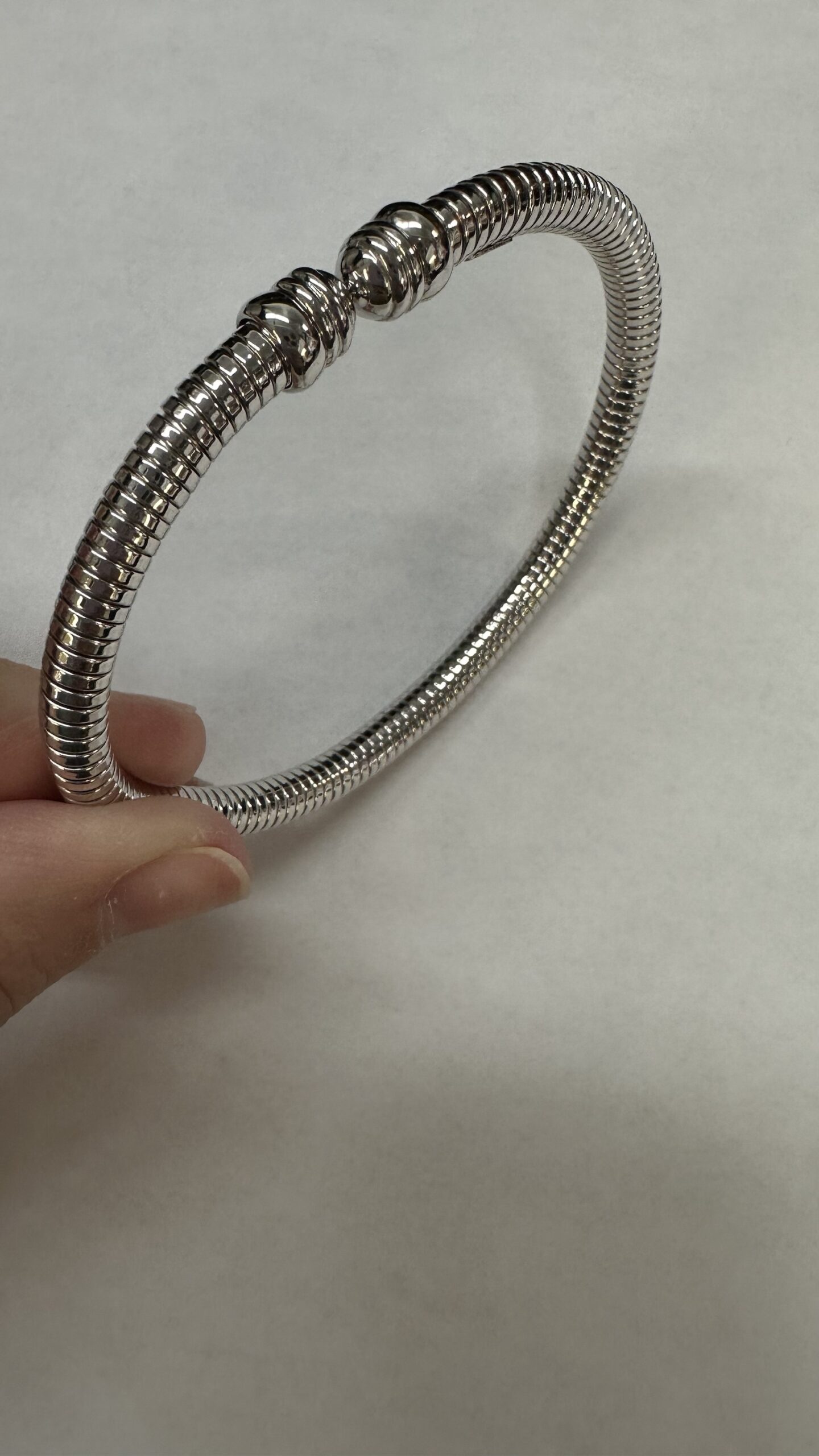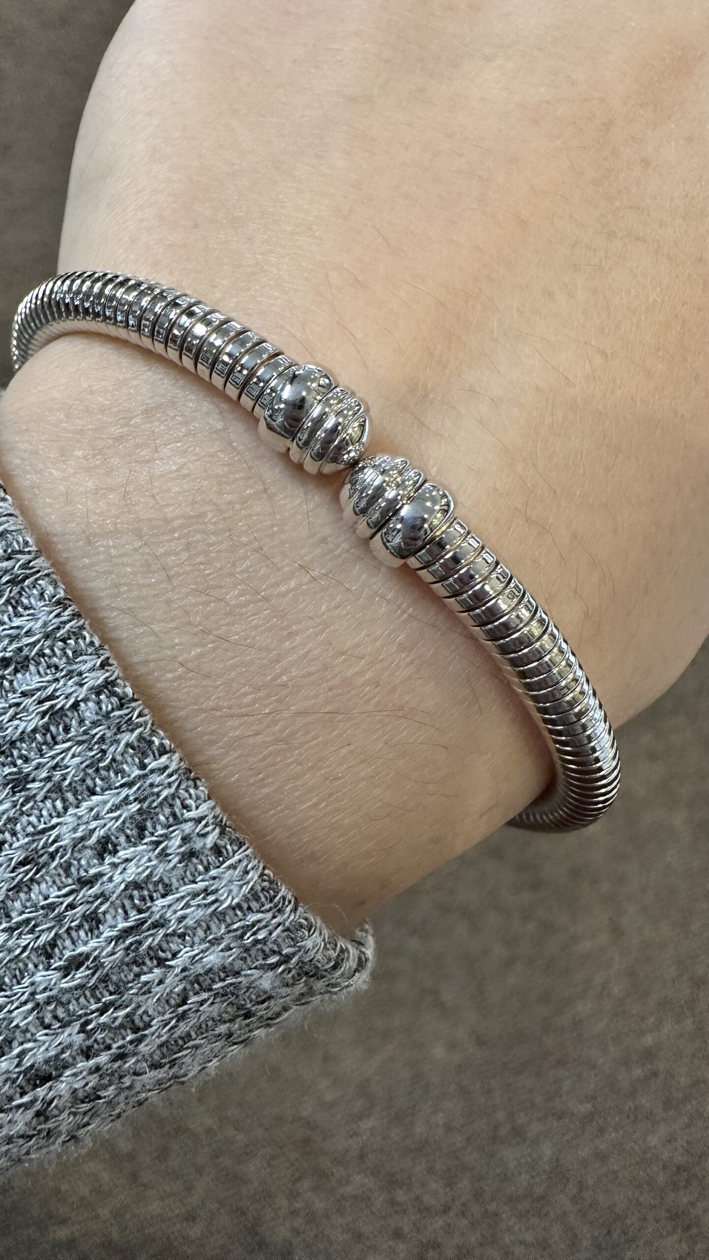 Also available in 18k white gold! One-of-a-kind 18k white gold flexible coil cuff style bracelet directly imported from Italy, 5 mm, 8” when measured all of the way around the outside, 18.16 grams.