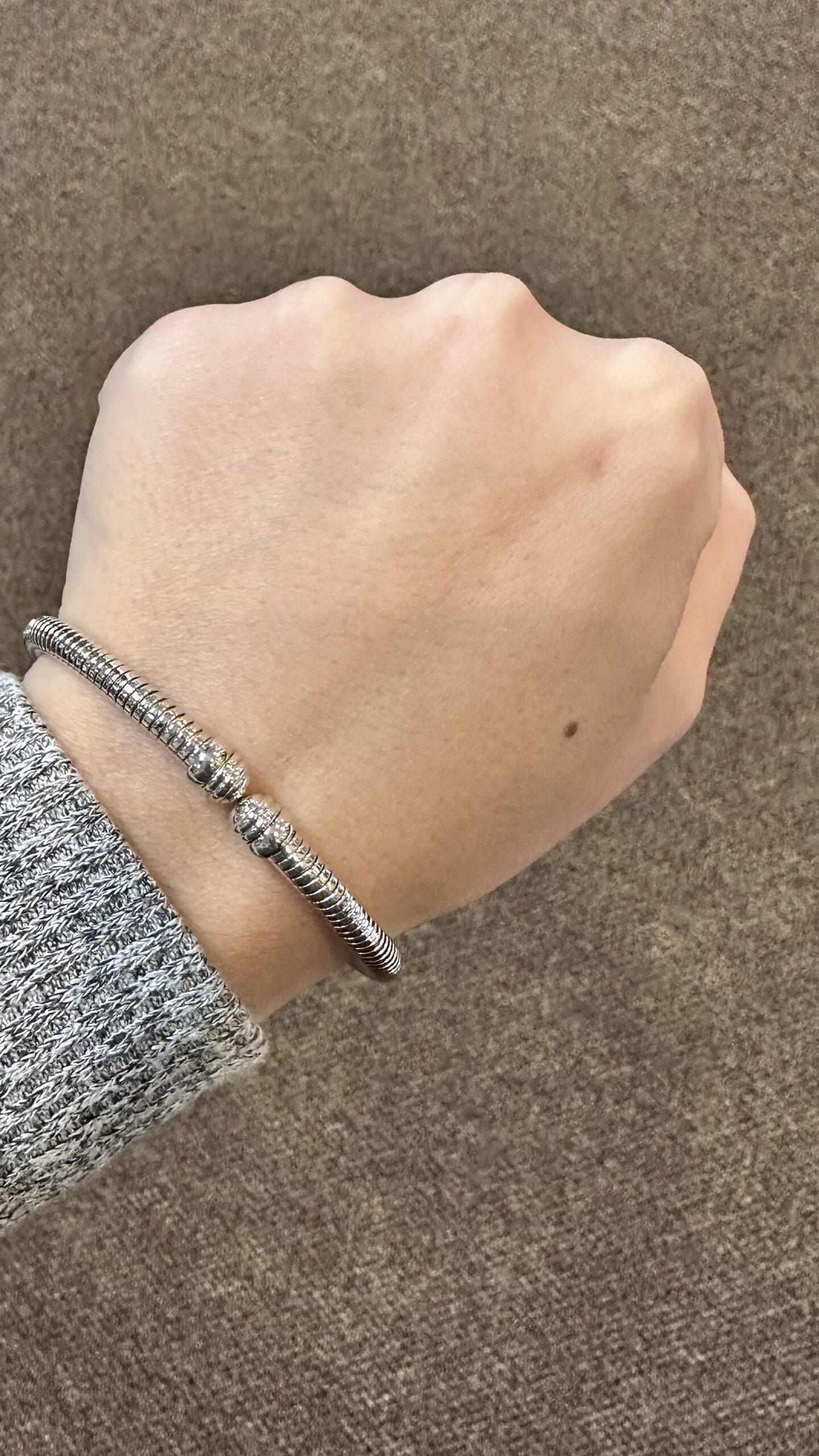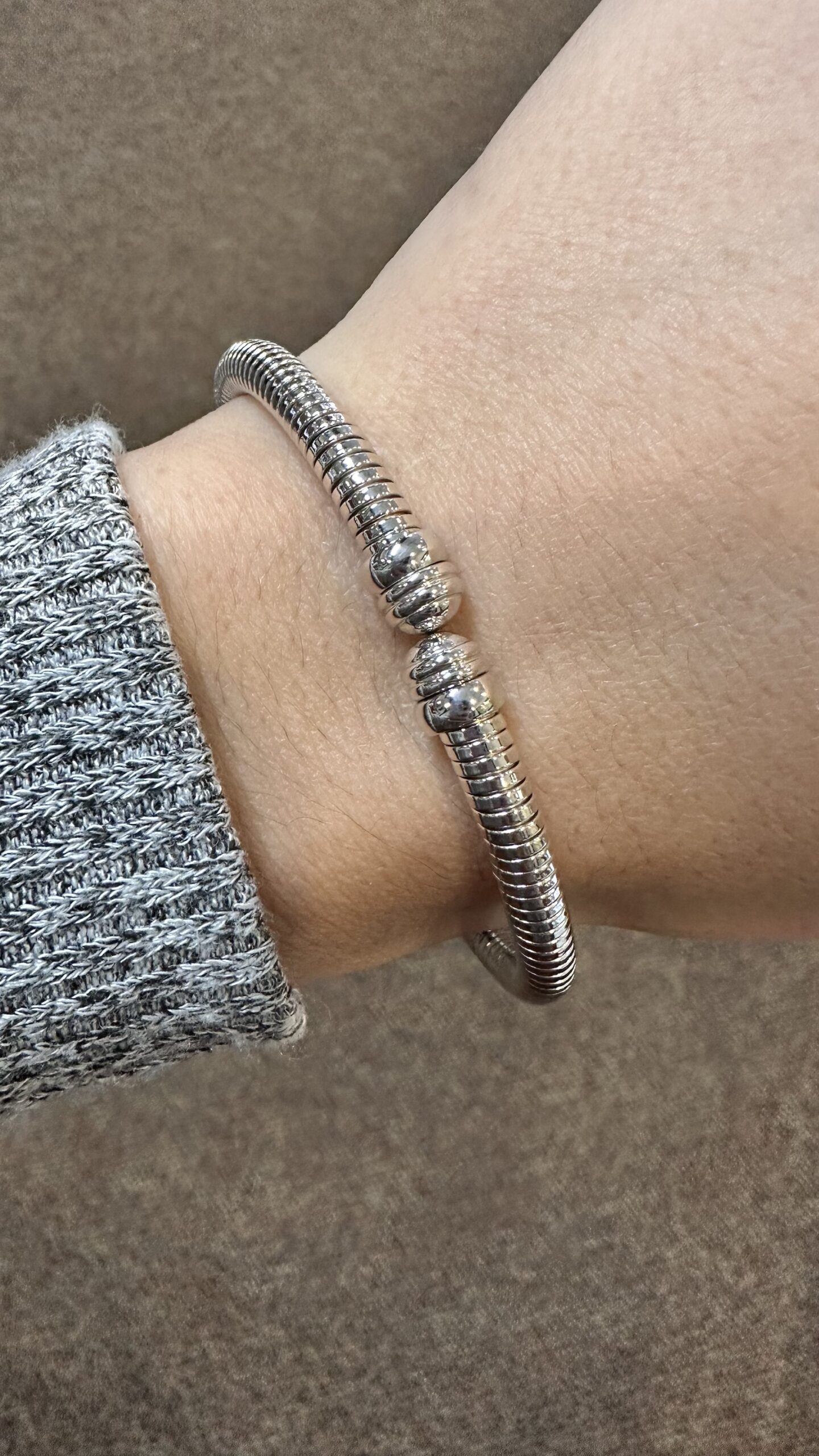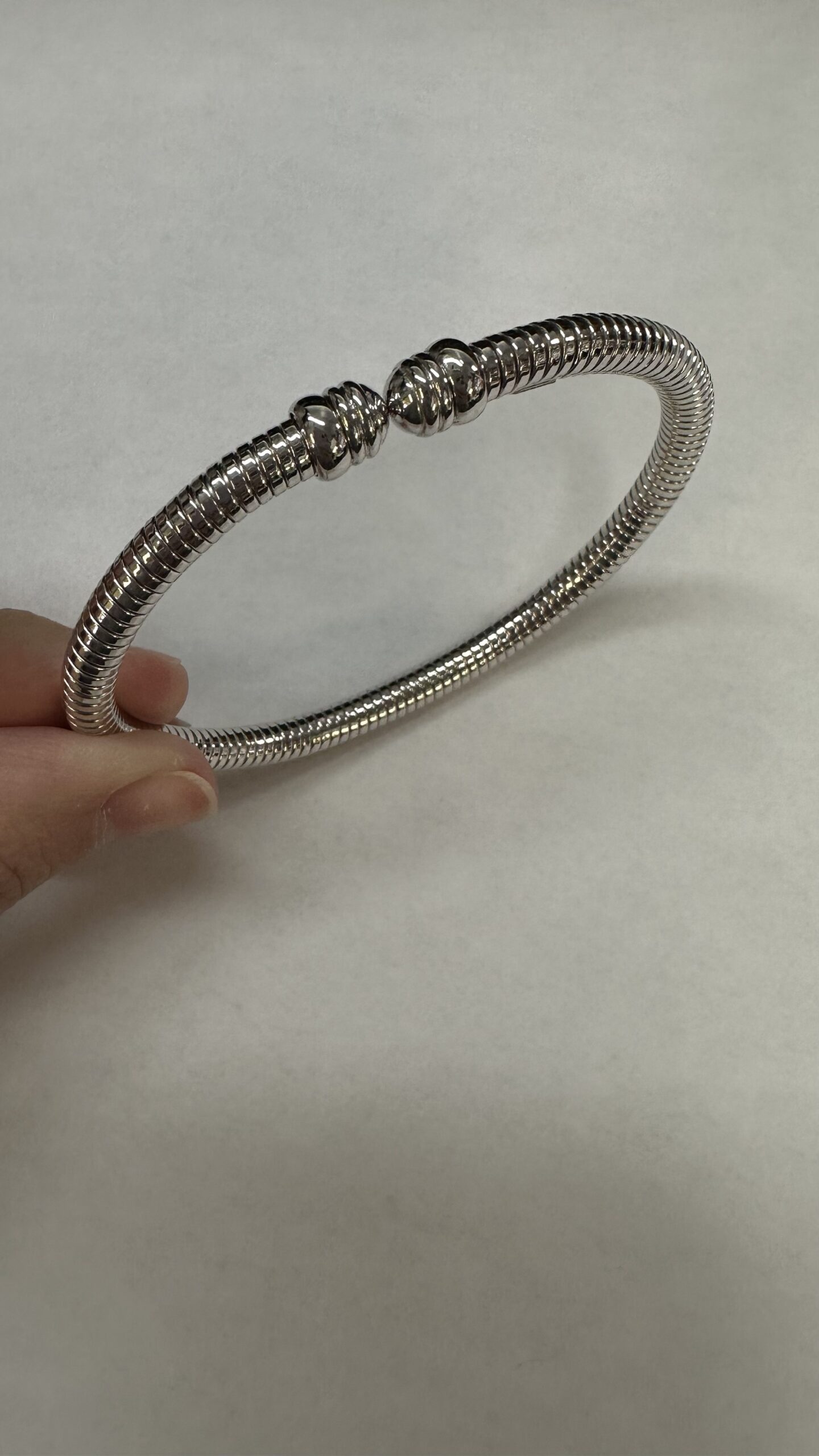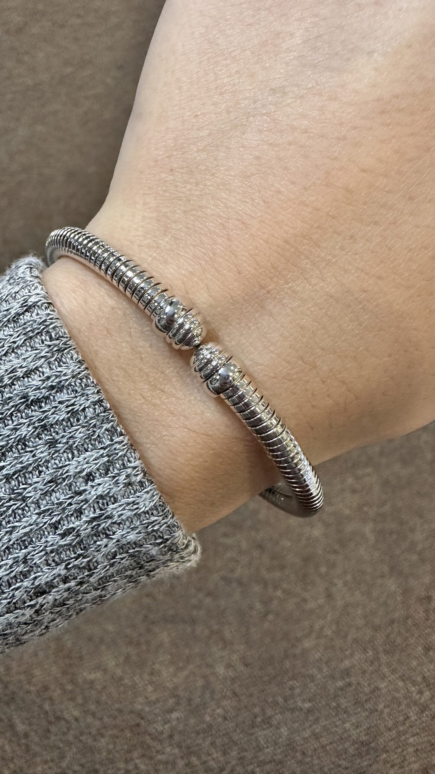 Also available in 18k white gold! One-of-a-kind 18k white gold flexible coil cuff style bracelet directly imported from Italy, 5 mm, 8” when measured all of the way around the outside, 18.16 grams.