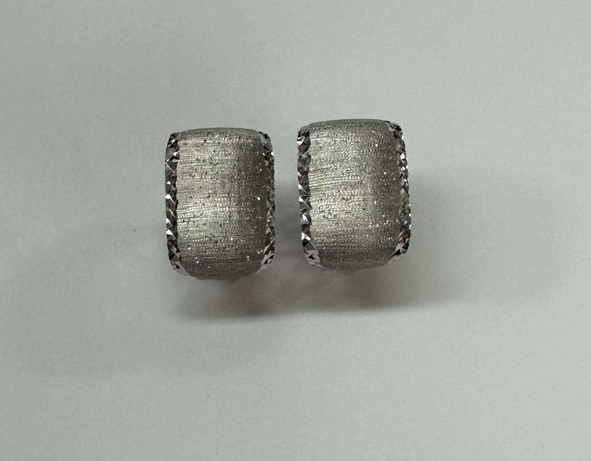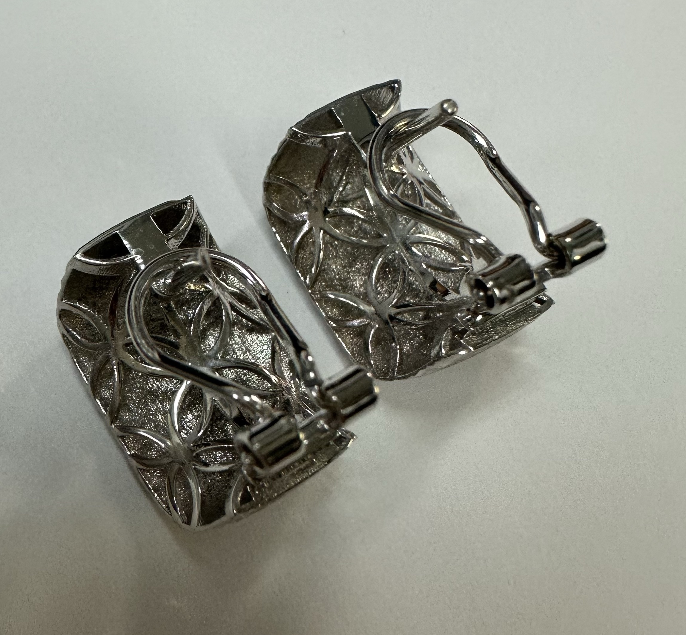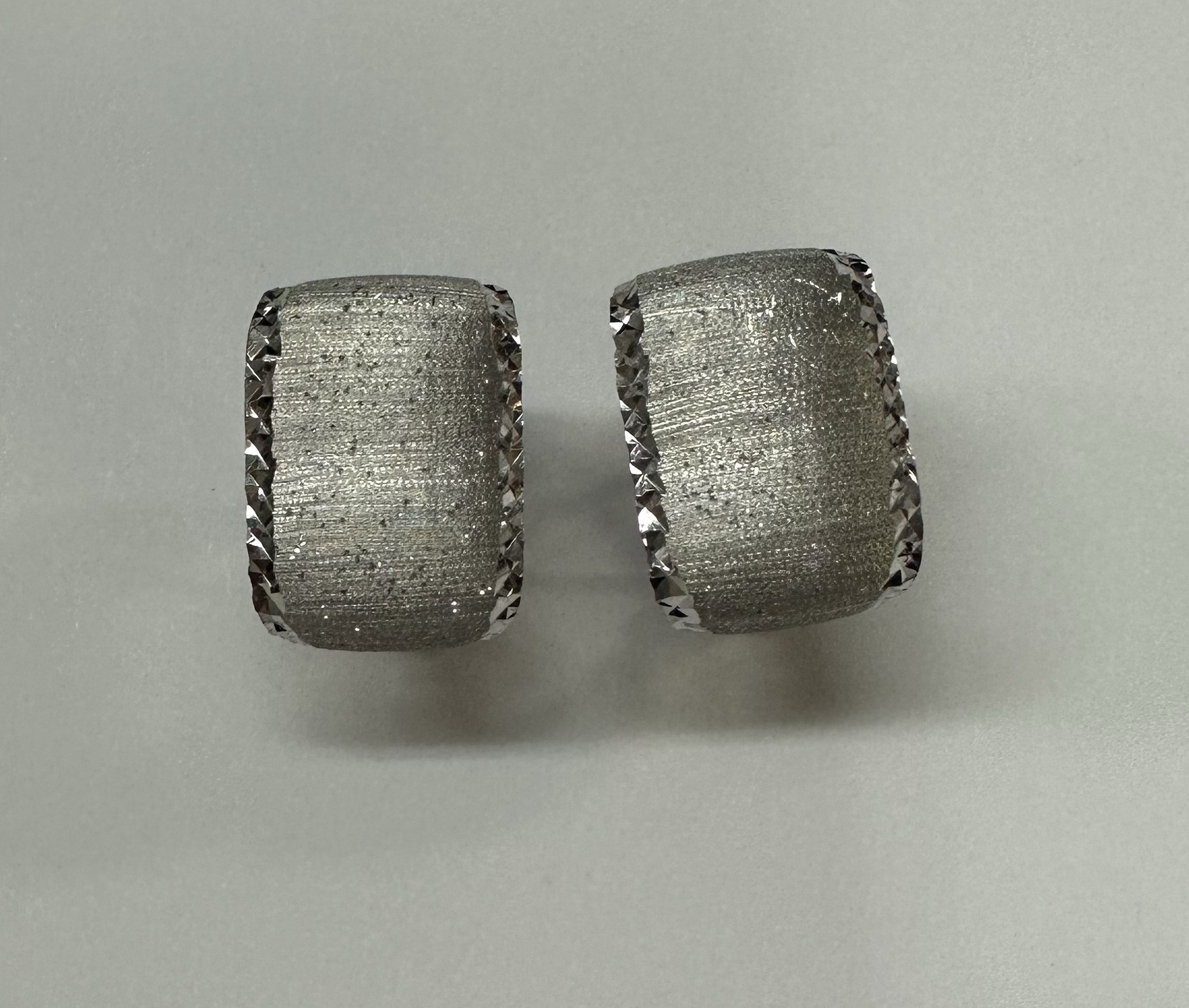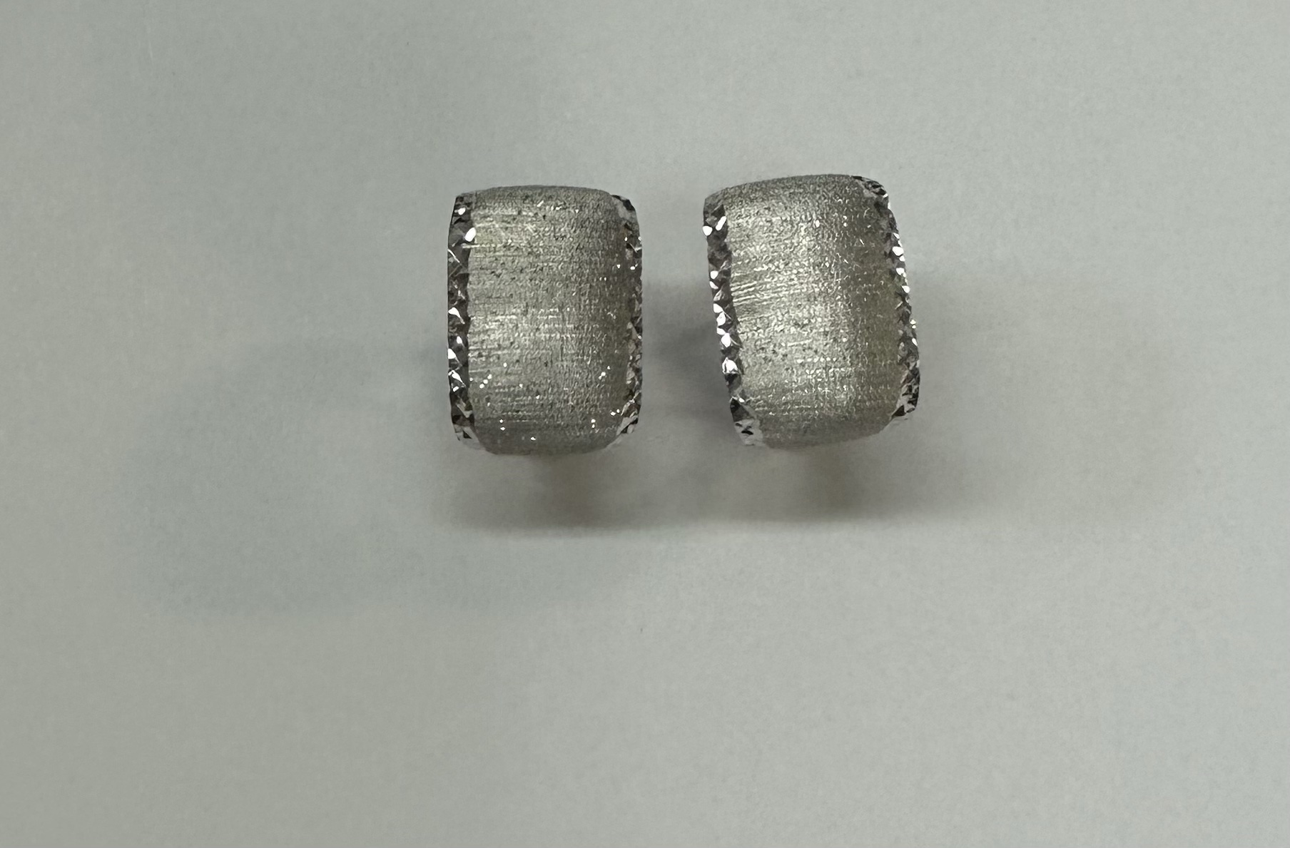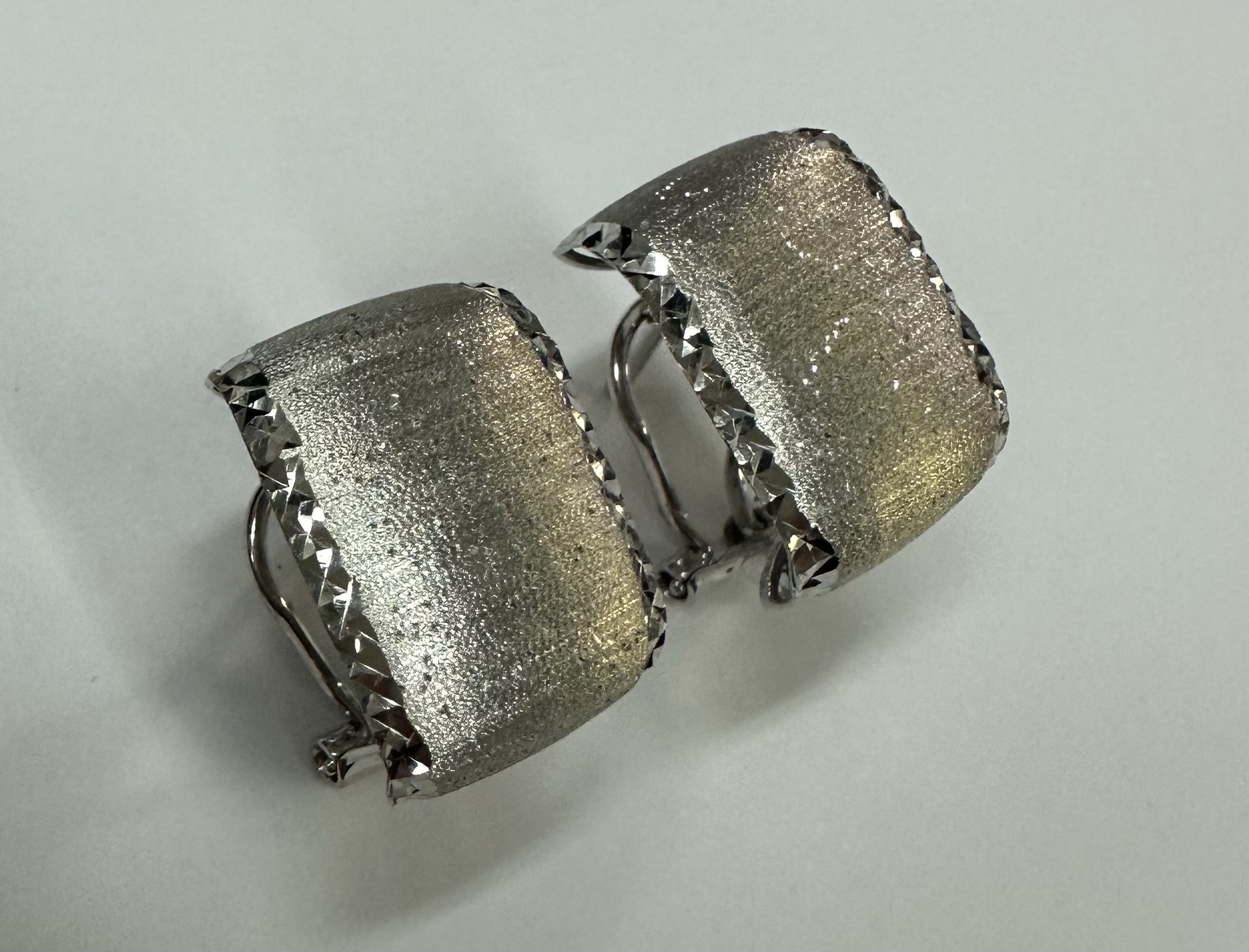 One-of-a-kind 18k white gold hoop style post & clip earrings with diamanté finish and hammered border, directly imported from Italy. These earrings measure 11.5 mm in width and have an entire weight of 6.1 grams.