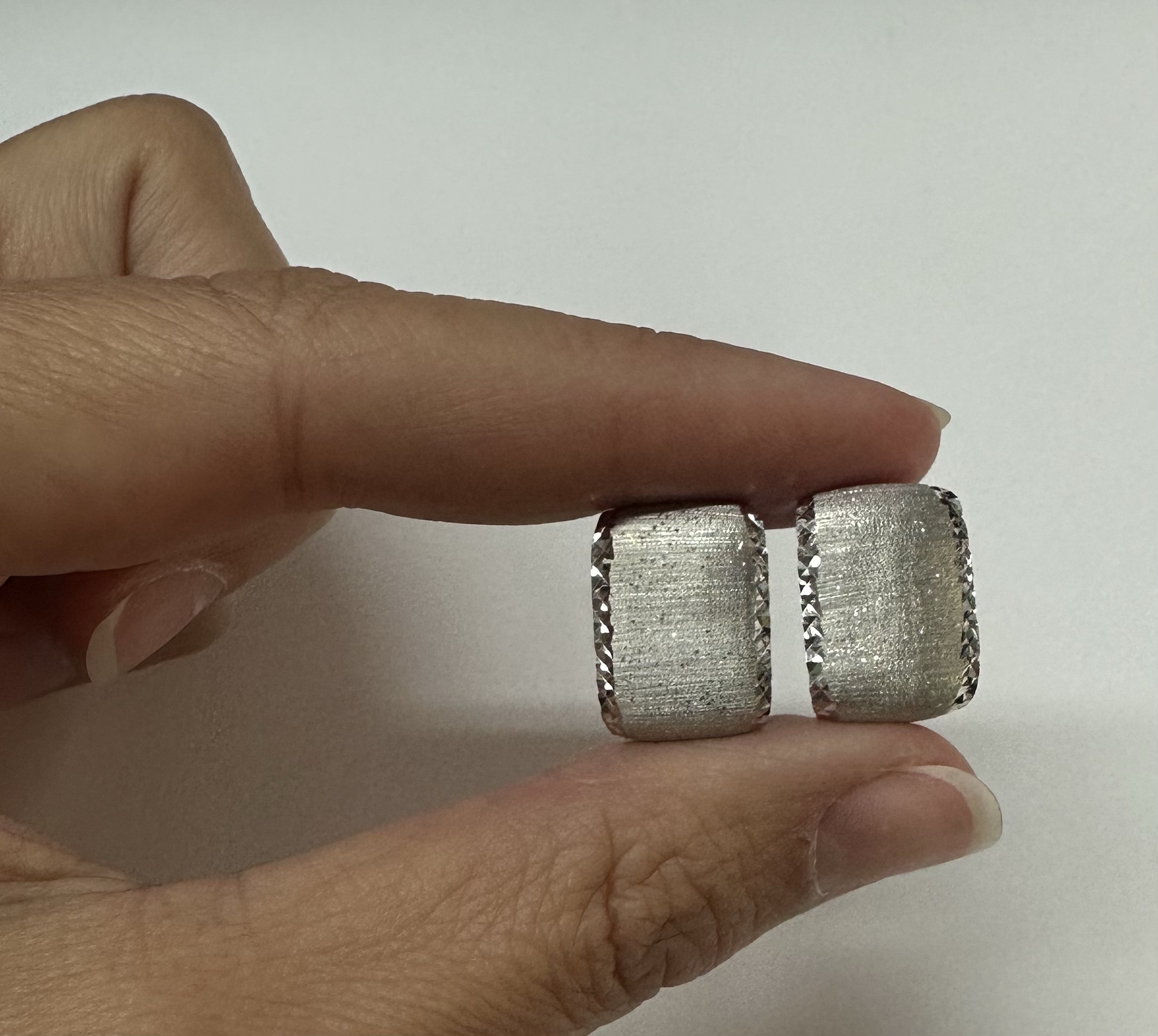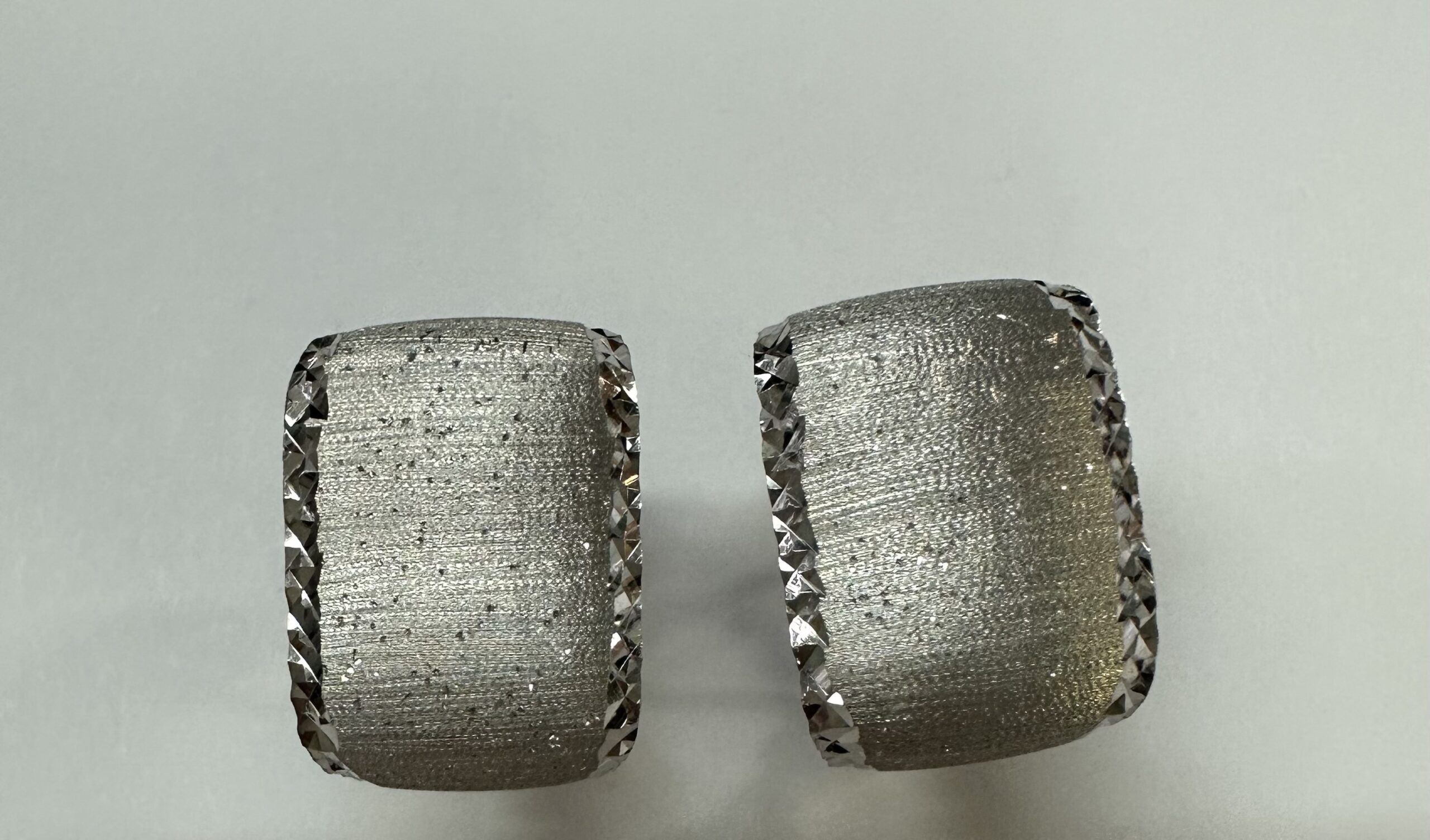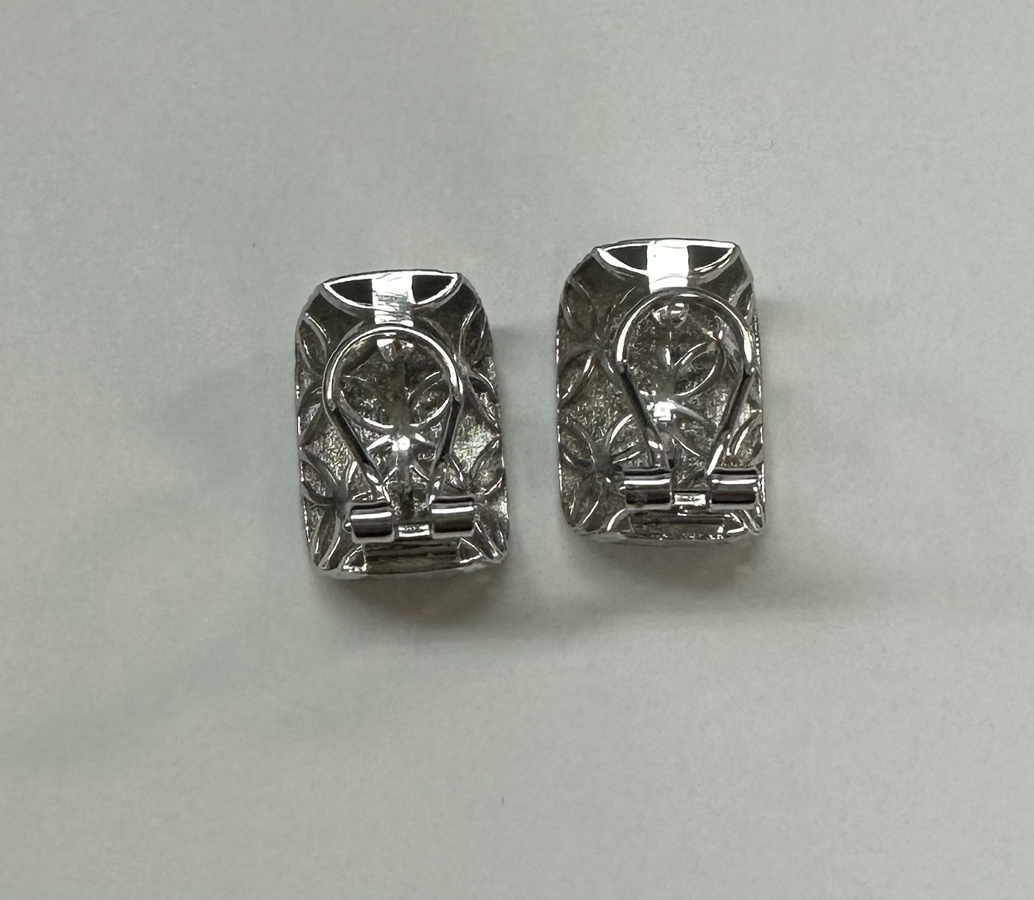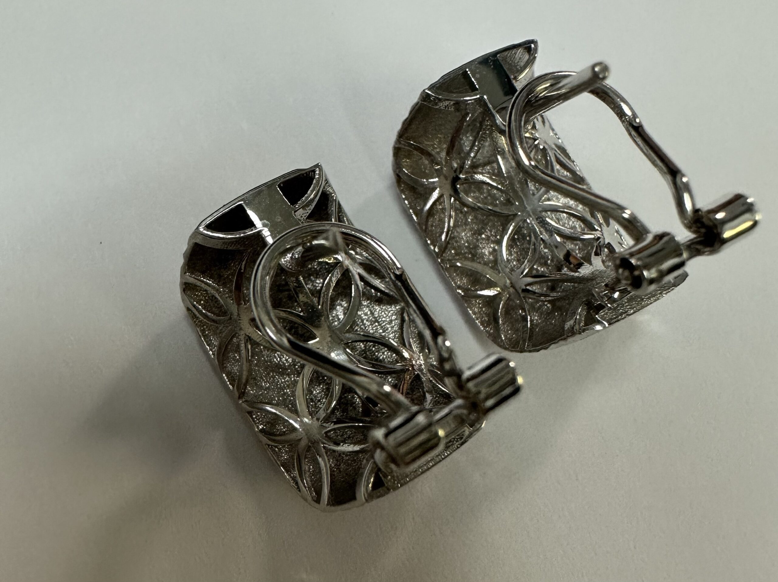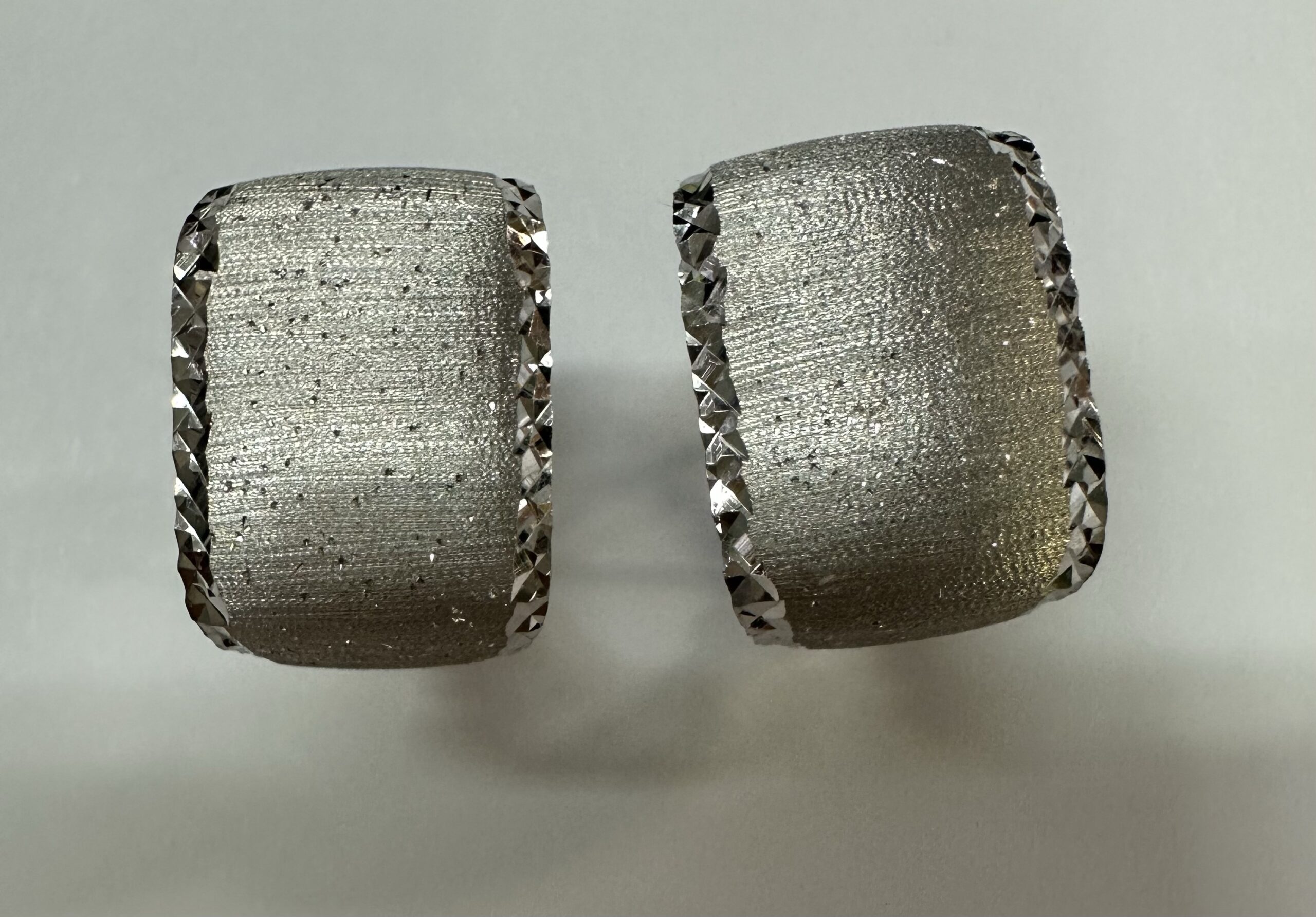 One-of-a-kind 18k white gold hoop style post & clip earrings with diamanté finish and hammered border, directly imported from Italy. These earrings measure 11.5 mm in width and have an entire weight of 6.1 grams.