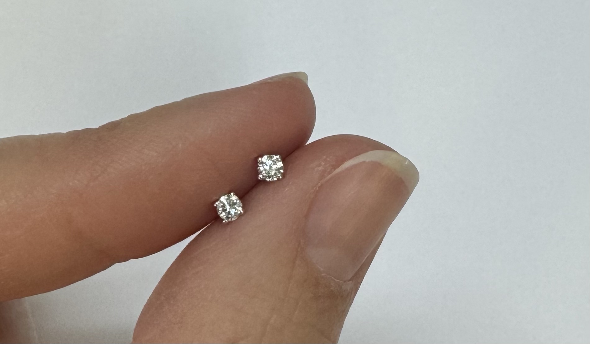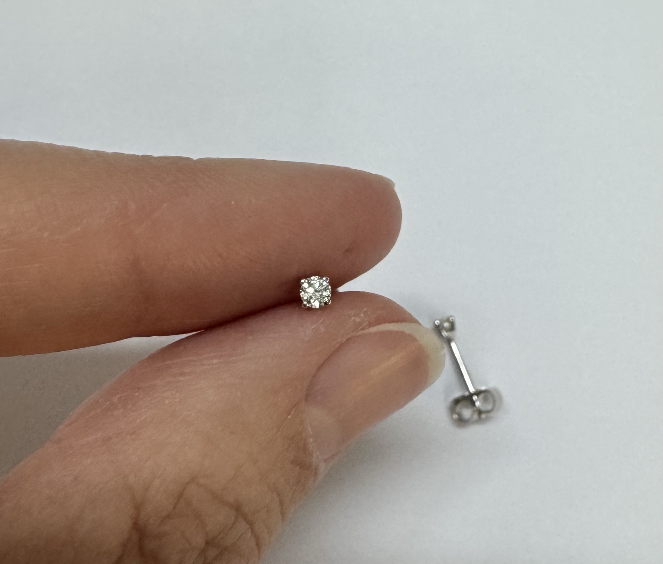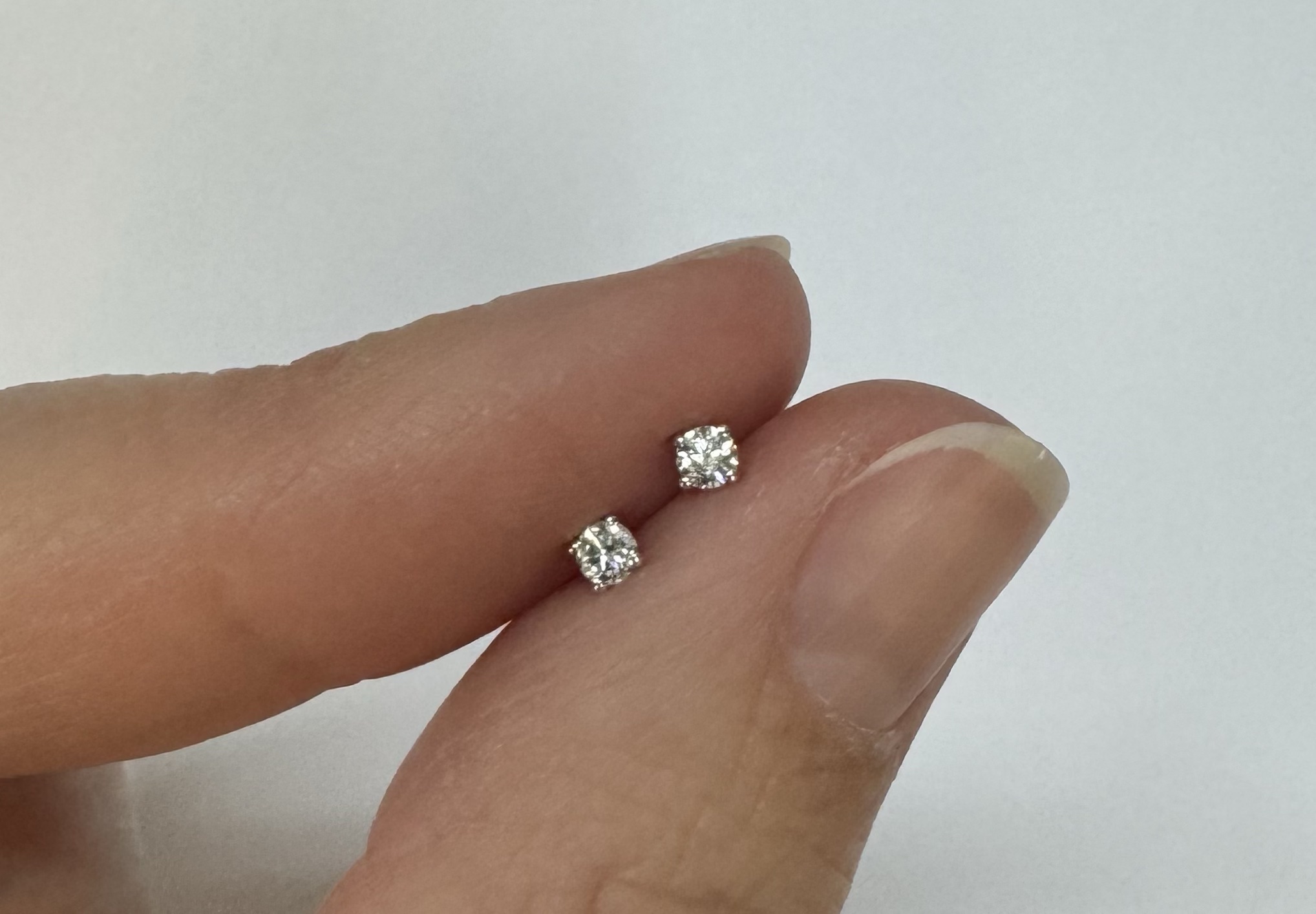 Only one pair left! 18k white gold genuine .11 cttw Round Brilliant Cut diamond 4 prong basket set stud earrings. These diamonds have a color grade of G, and a clarity grade of SI1. These earrings have an entire weight of 0.4 grams.