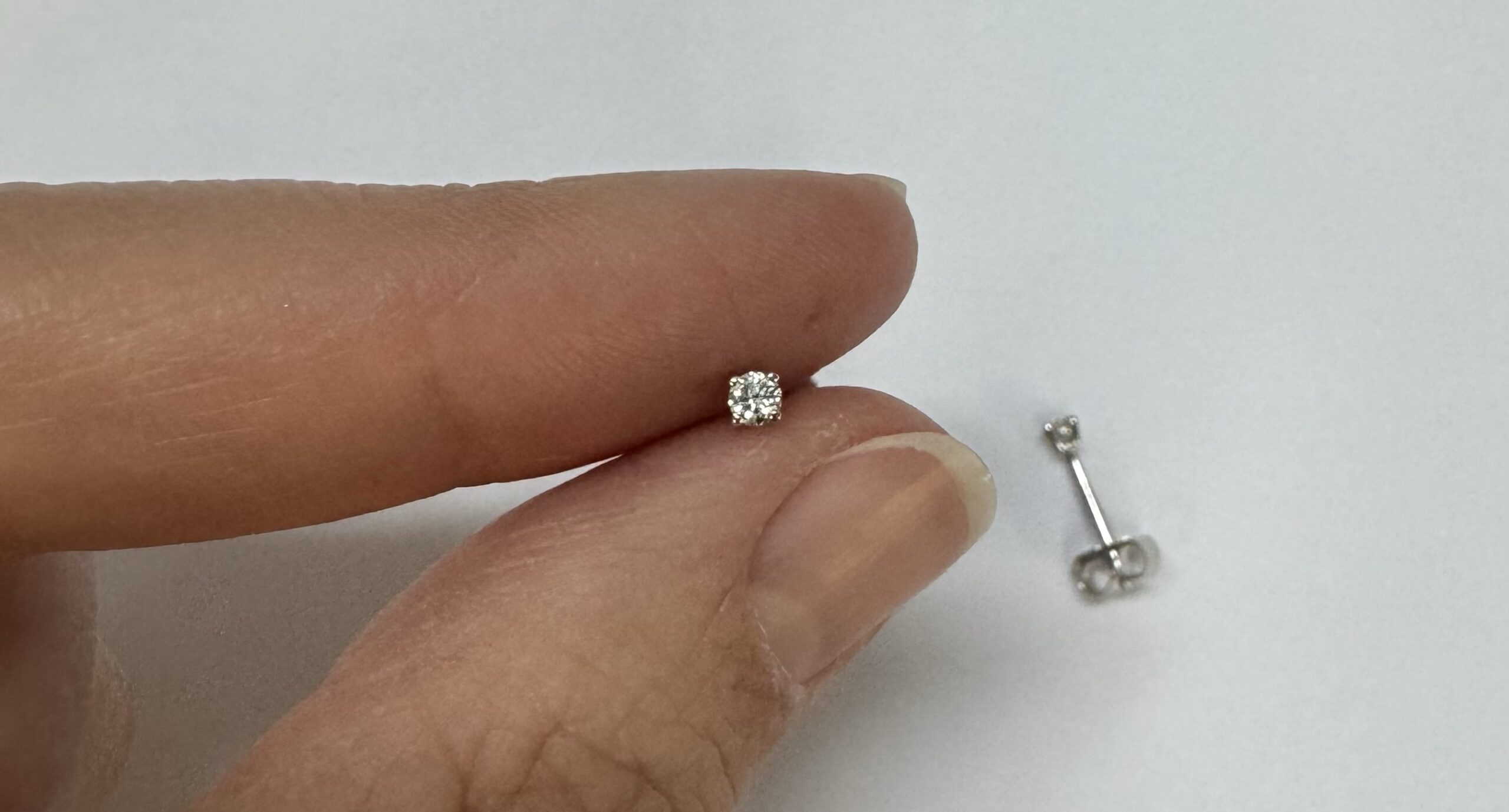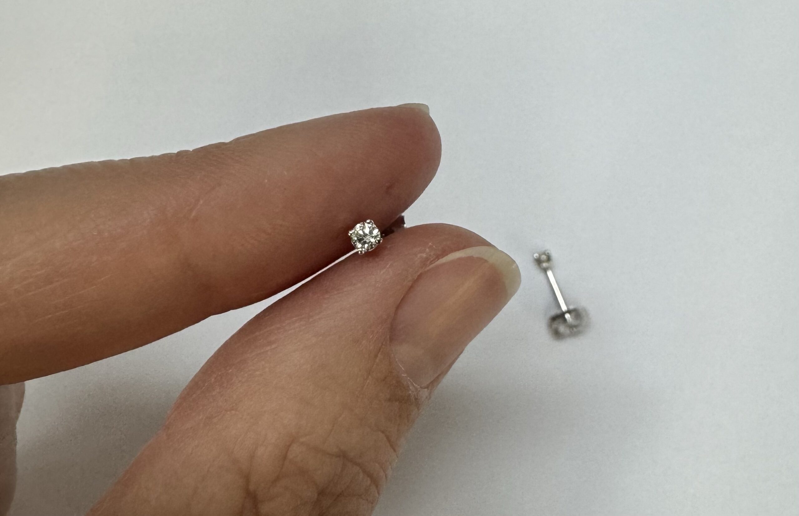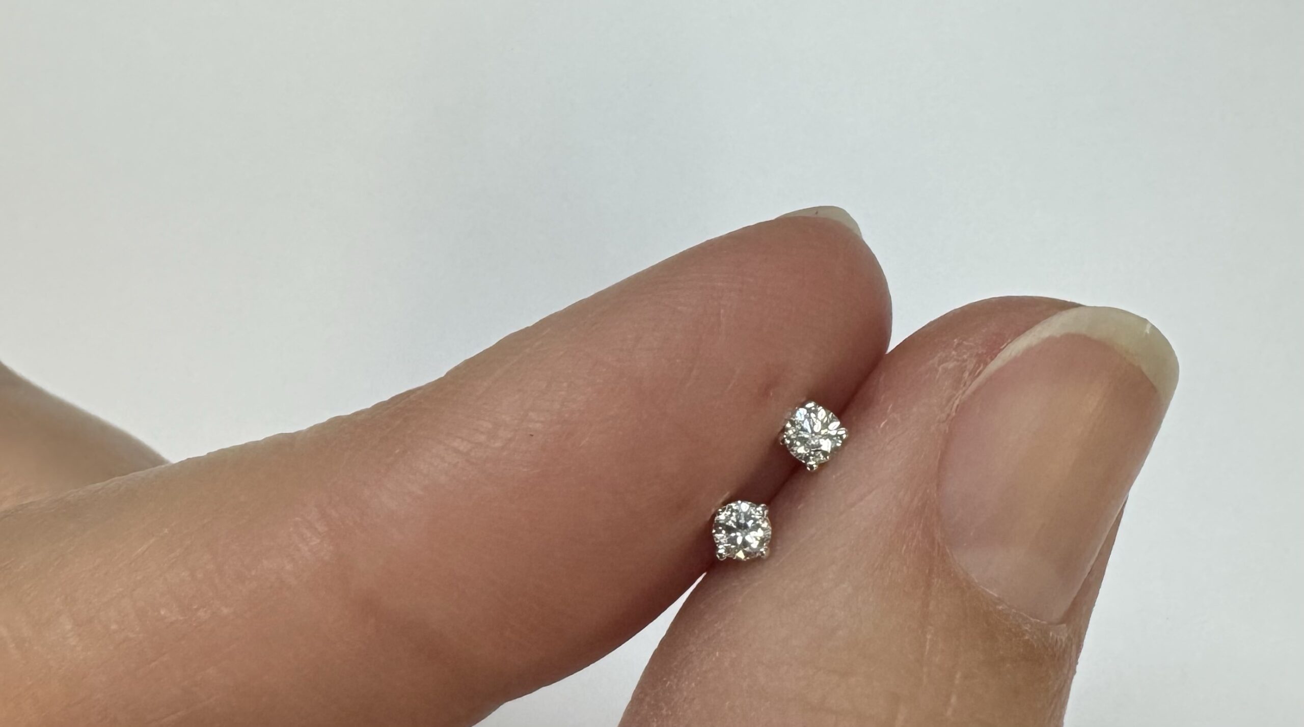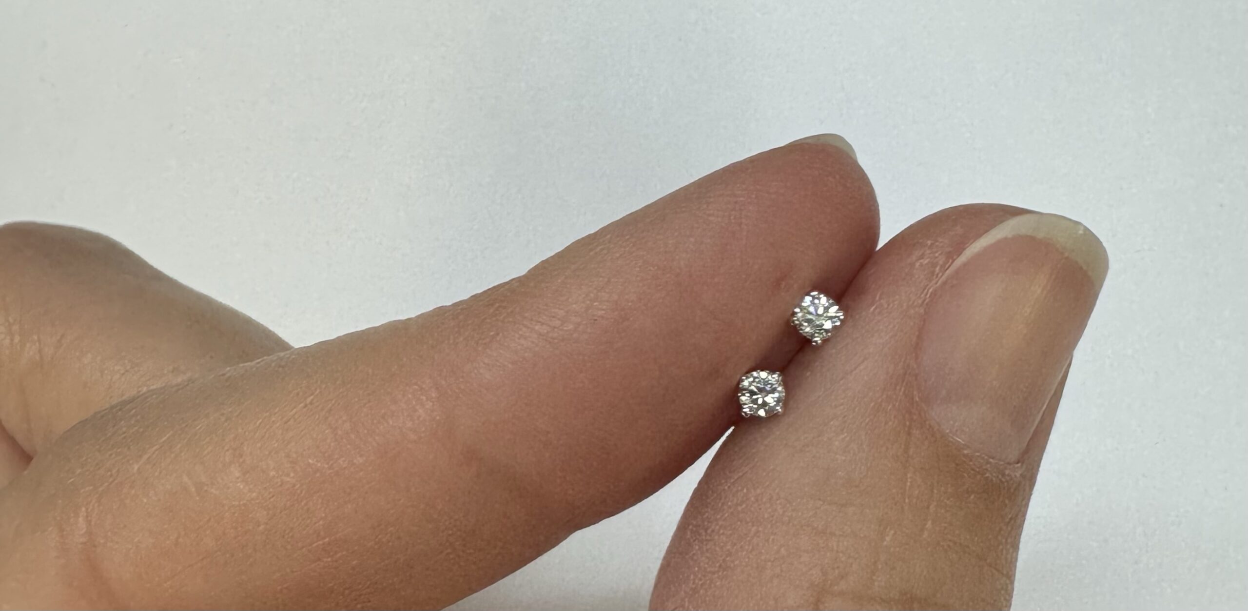 Only one pair left! 18k white gold genuine .11 cttw Round Brilliant Cut diamond 4 prong basket set stud earrings. These diamonds have a color grade of G, and a clarity grade of SI1. These earrings have an entire weight of 0.4 grams.