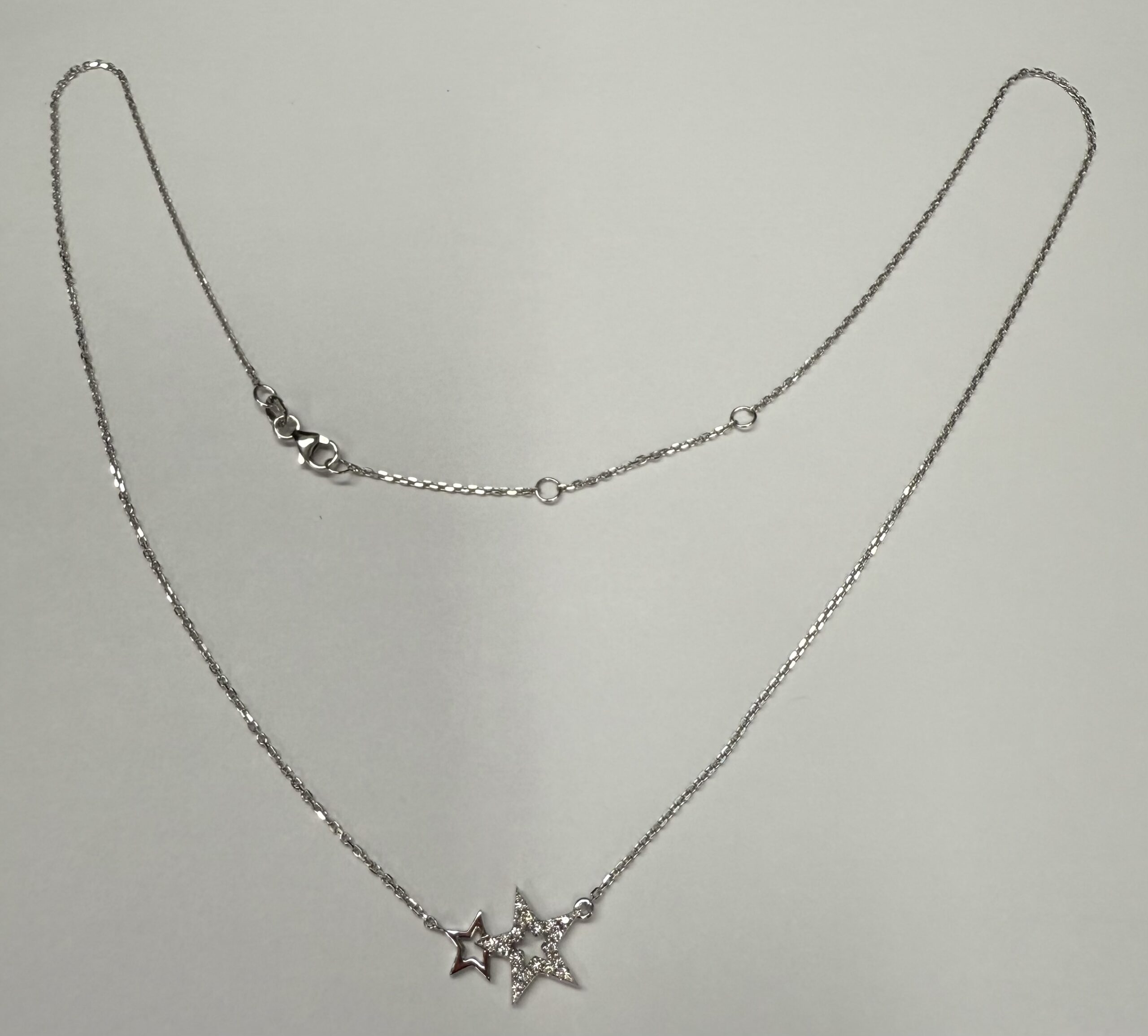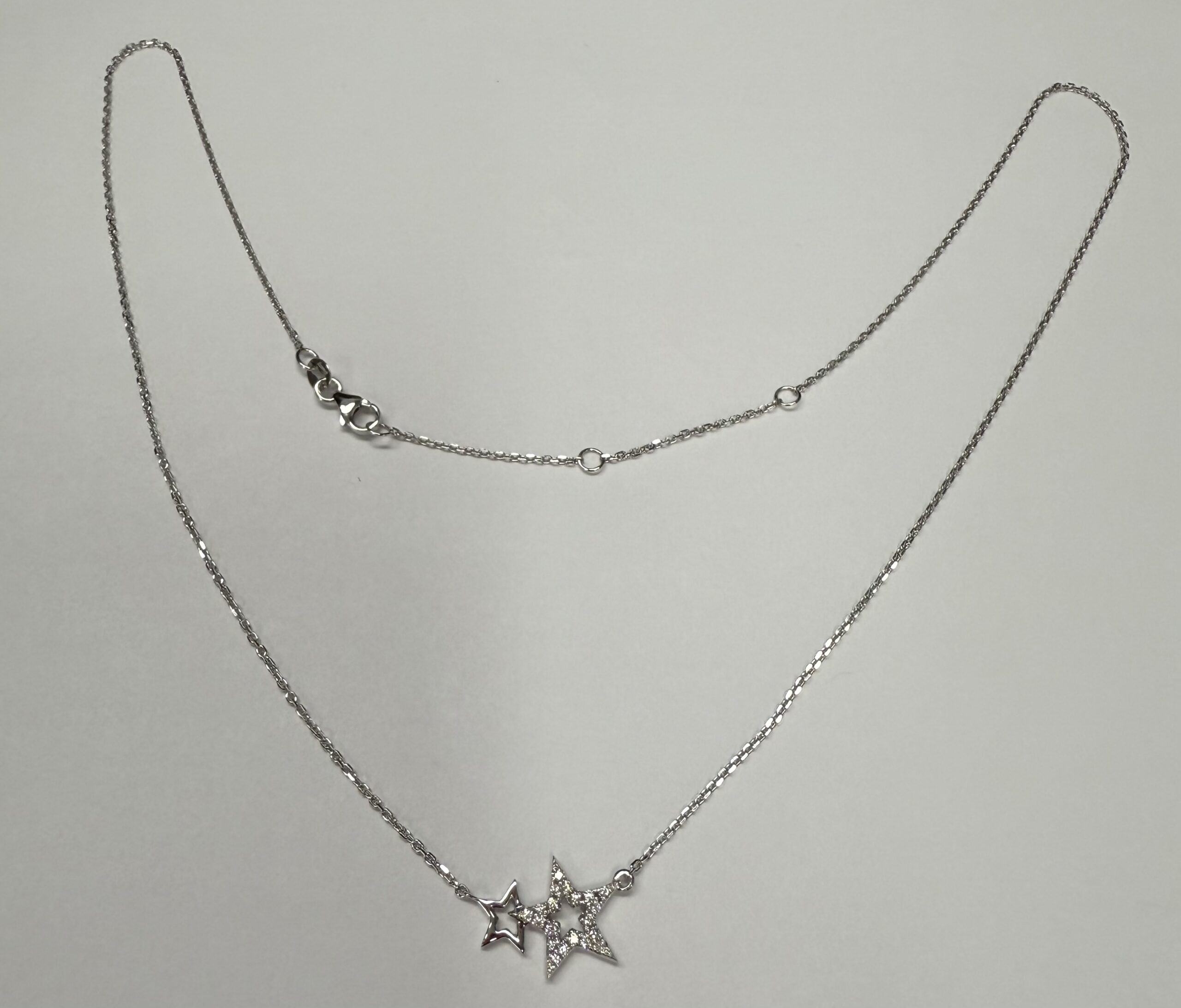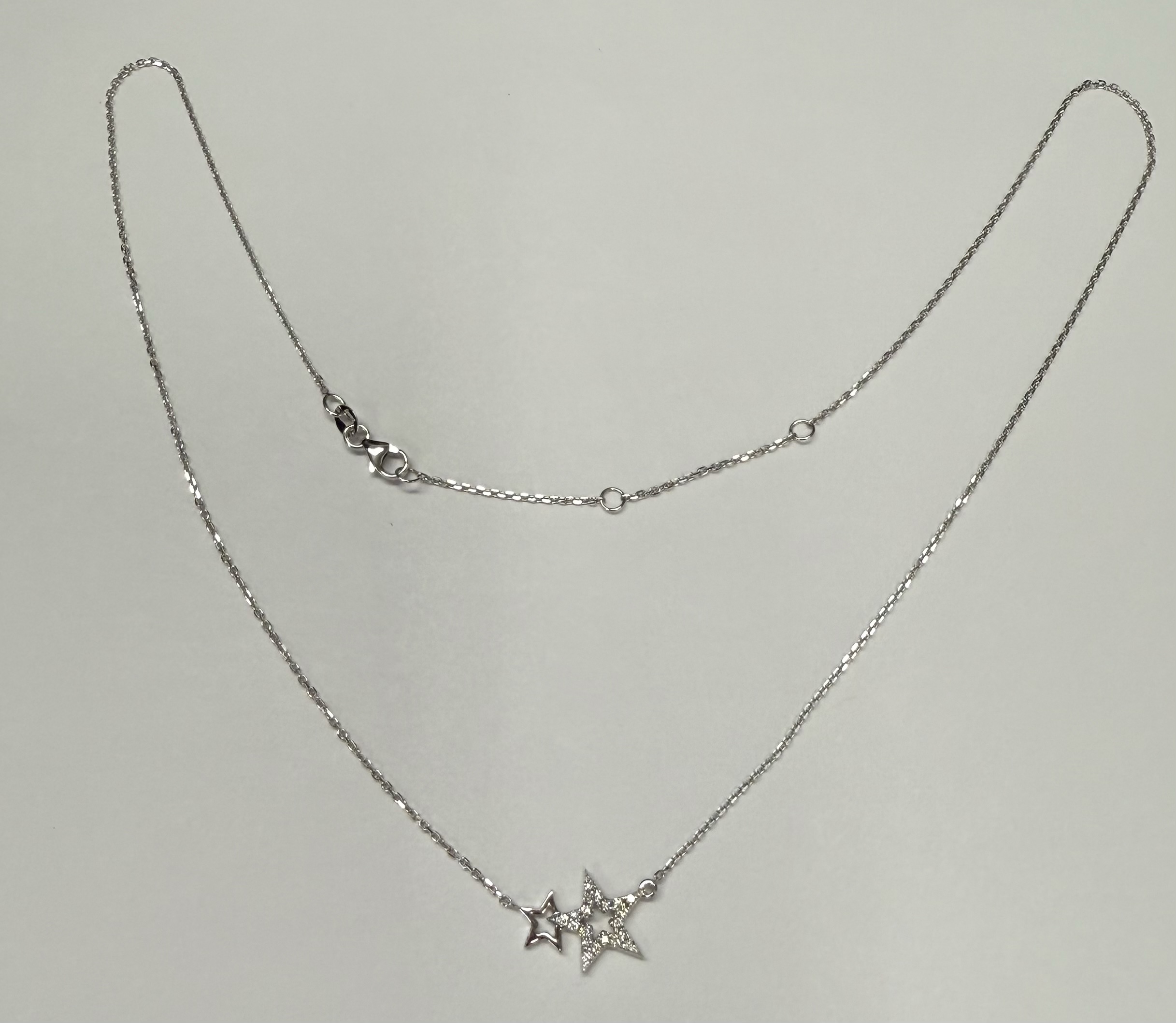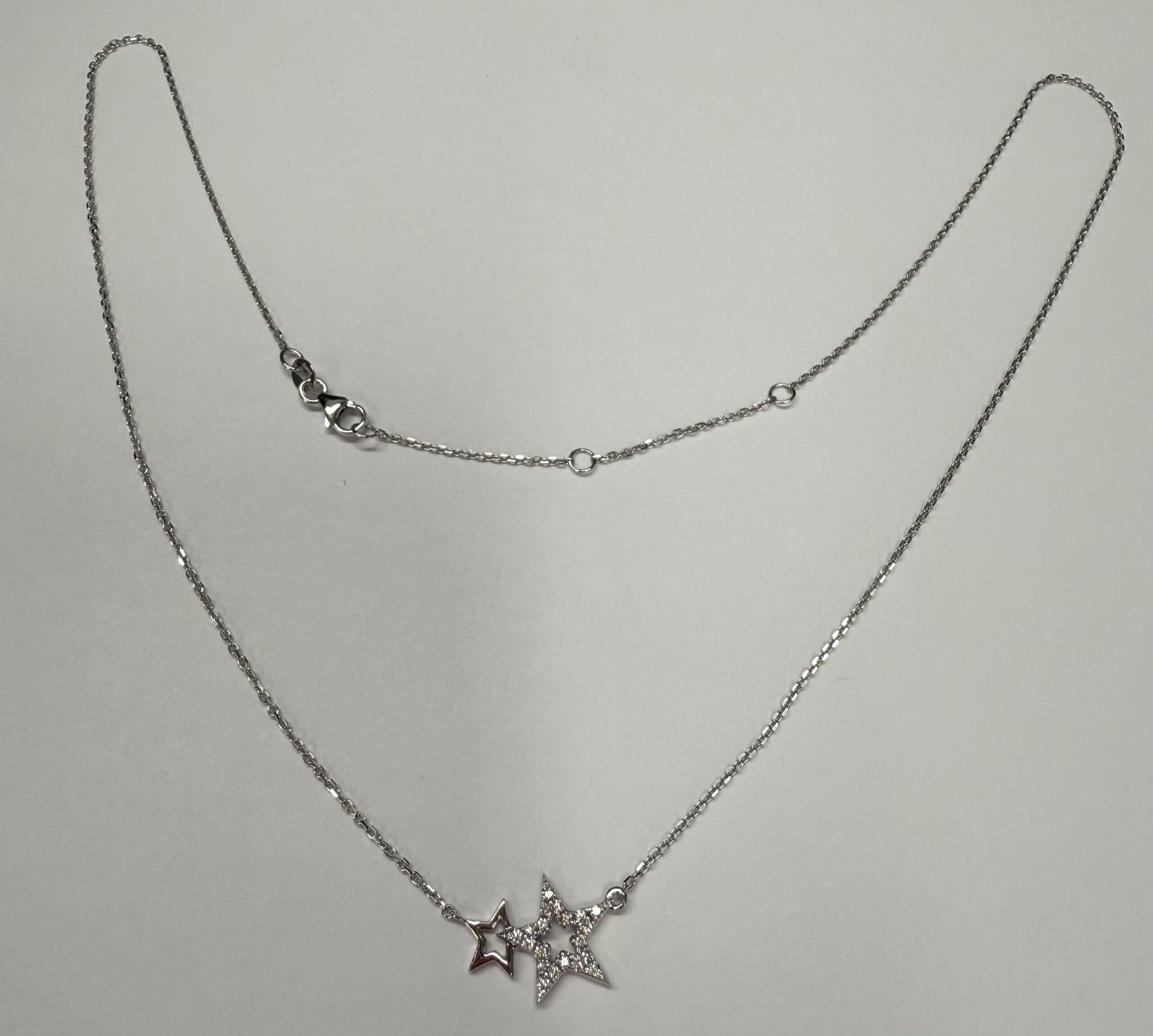 14k white gold genuine .12 cttw (20 stone) Round Brilliant Cut diamond open star pendant, adjustable 16-18″. These diamonds average G-H in color, and SI1 in clarity. This pendant has an entire weight of 2.3 grams.