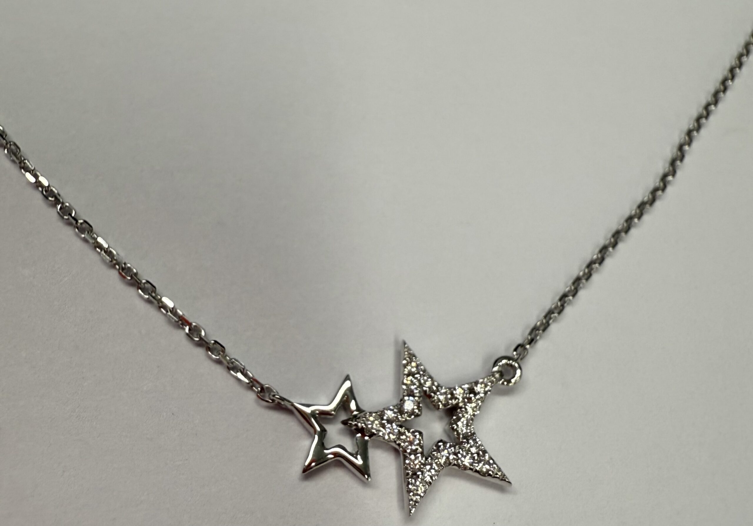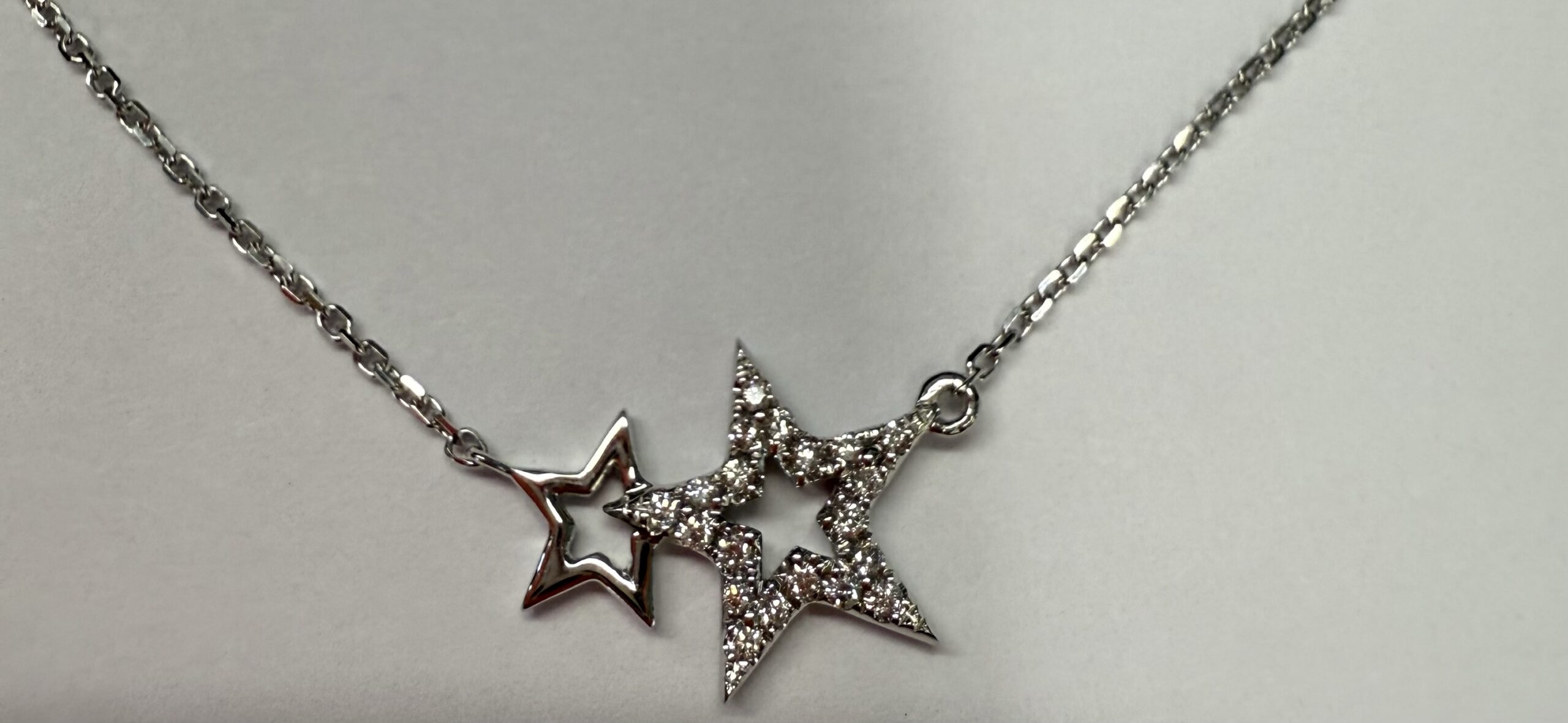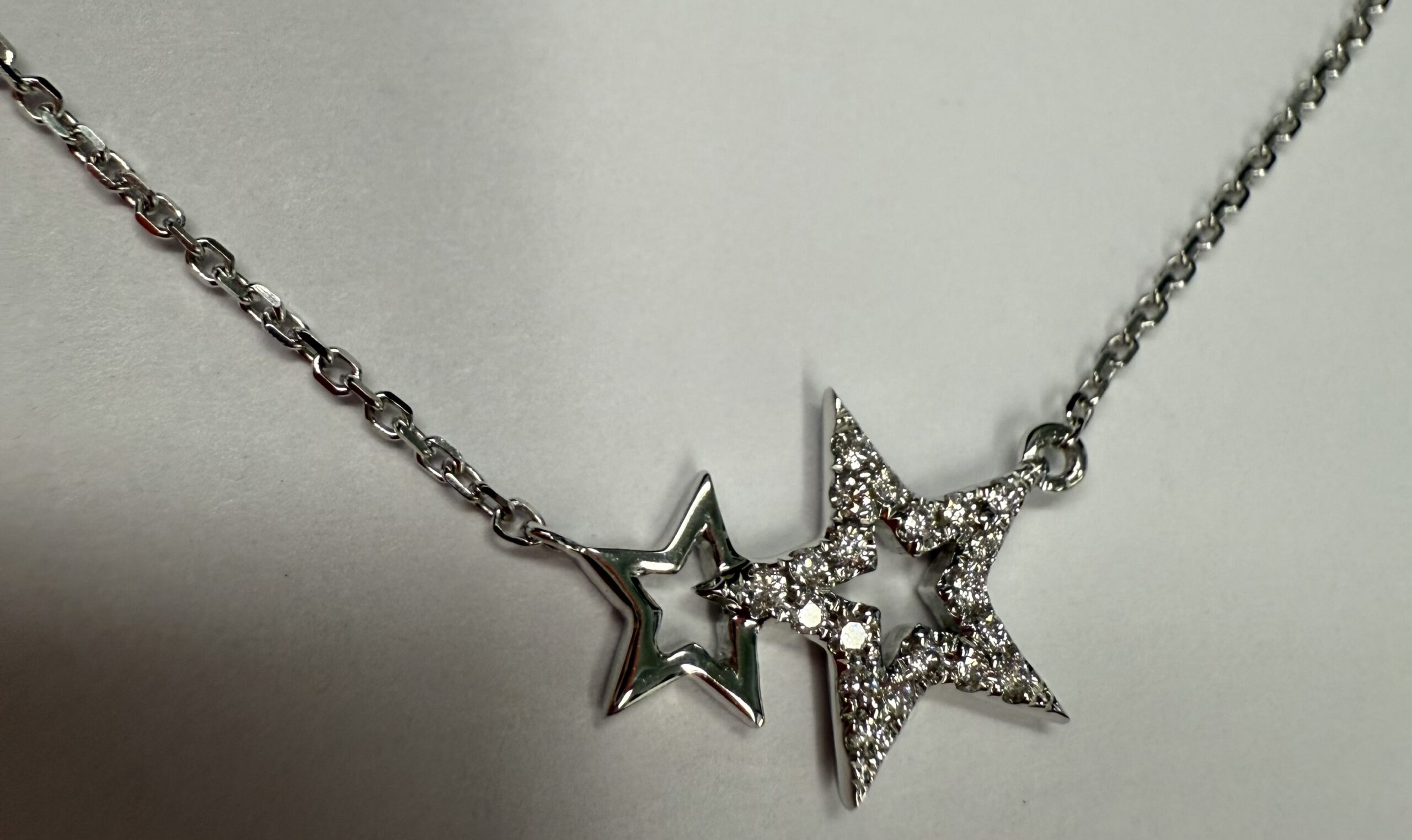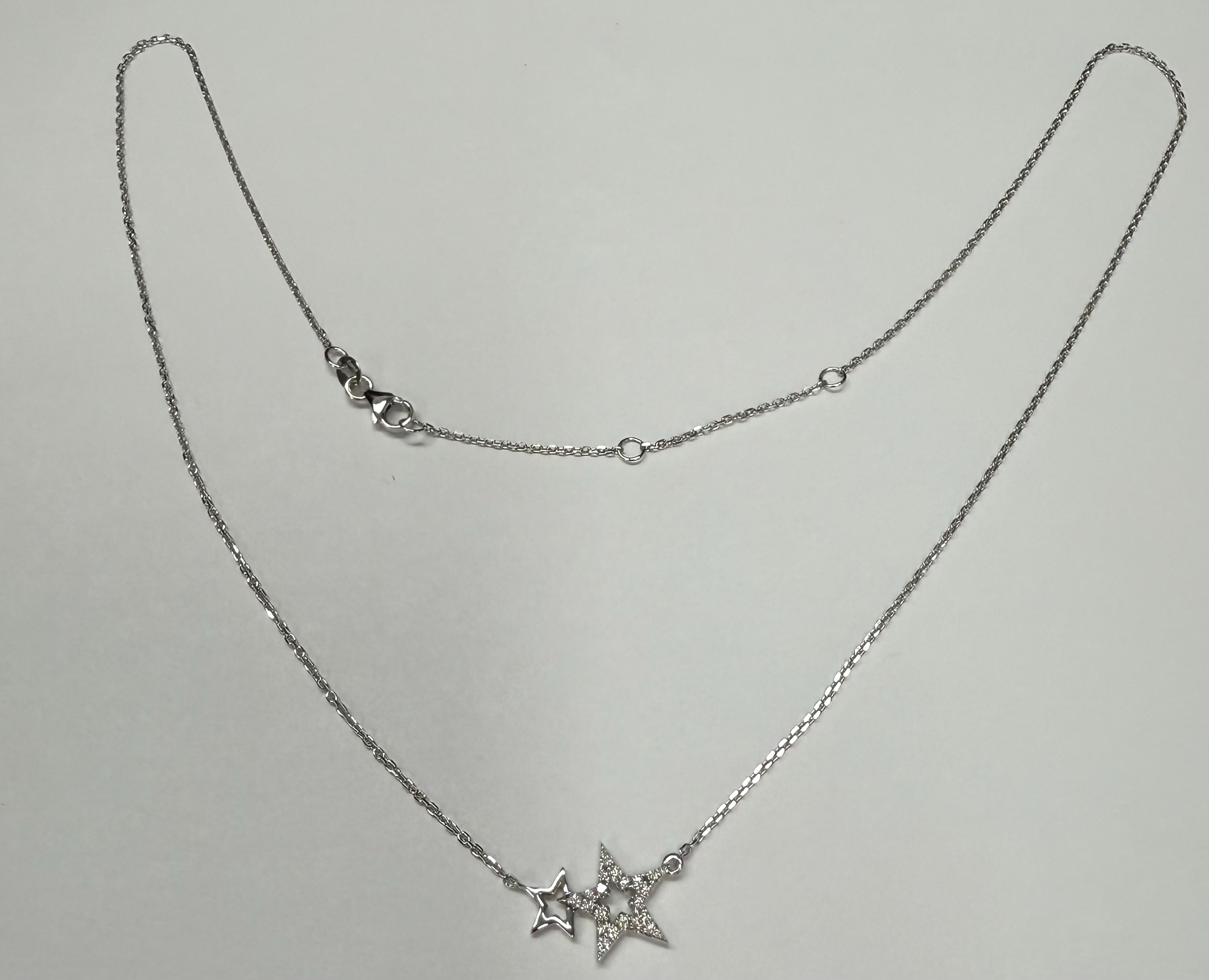 14k white gold genuine .12 cttw (20 stone) Round Brilliant Cut diamond open star pendant, adjustable 16-18″. These diamonds average G-H in color, and SI1 in clarity. This pendant has an entire weight of 2.3 grams.