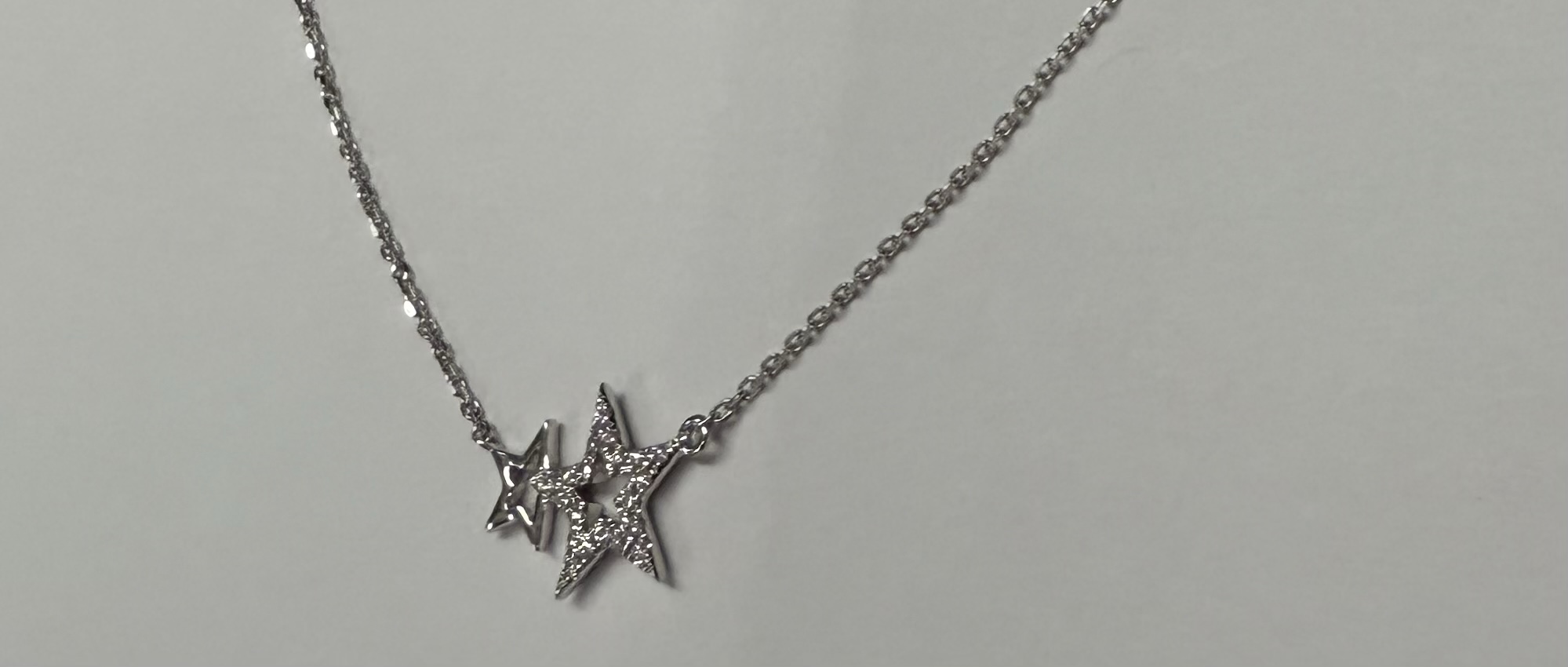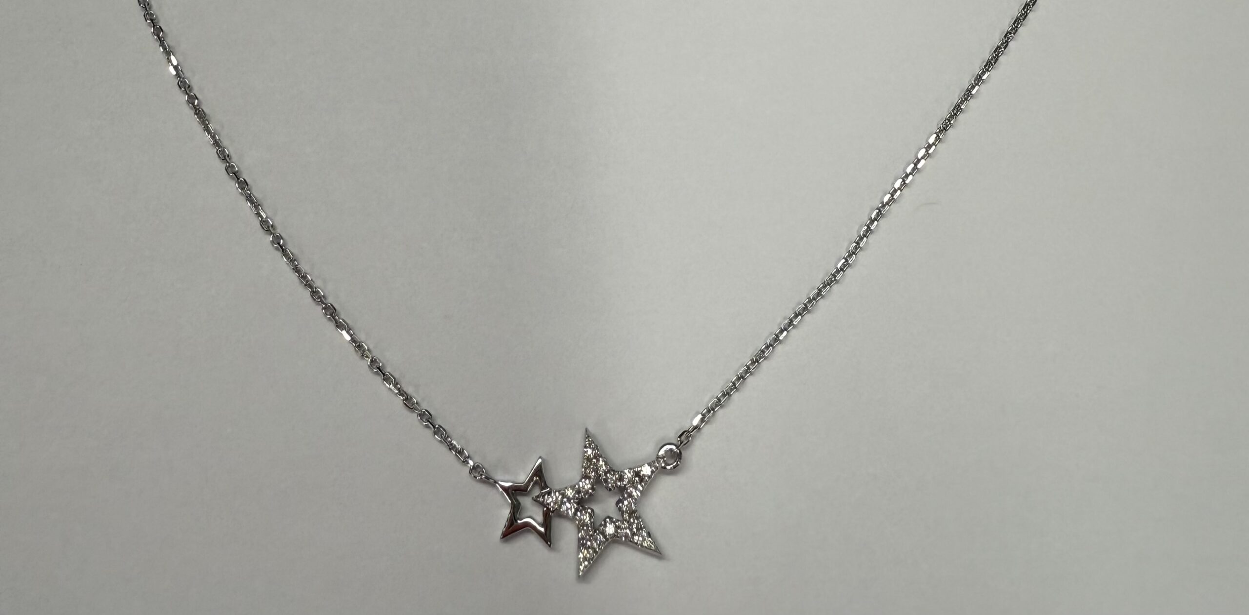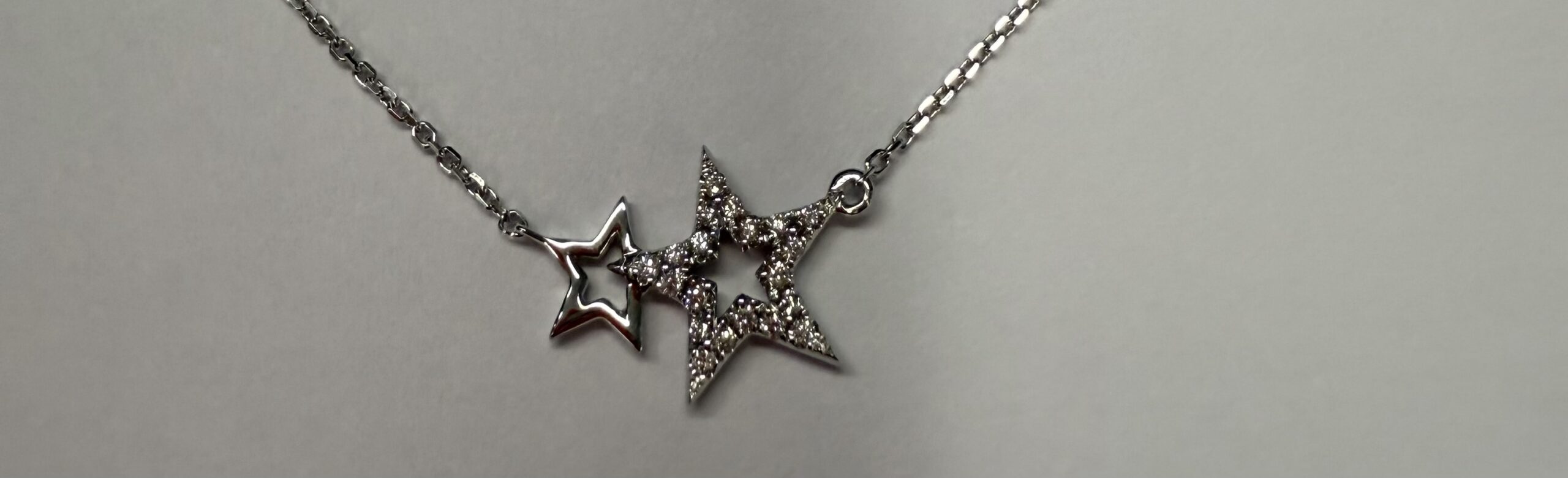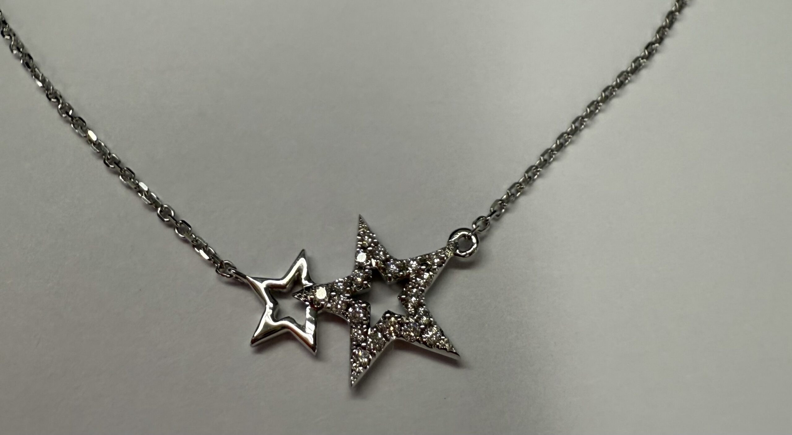 14k white gold genuine .12 cttw (20 stone) Round Brilliant Cut diamond open star pendant, adjustable 16-18″. These diamonds average G-H in color, and SI1 in clarity. This pendant has an entire weight of 2.3 grams.