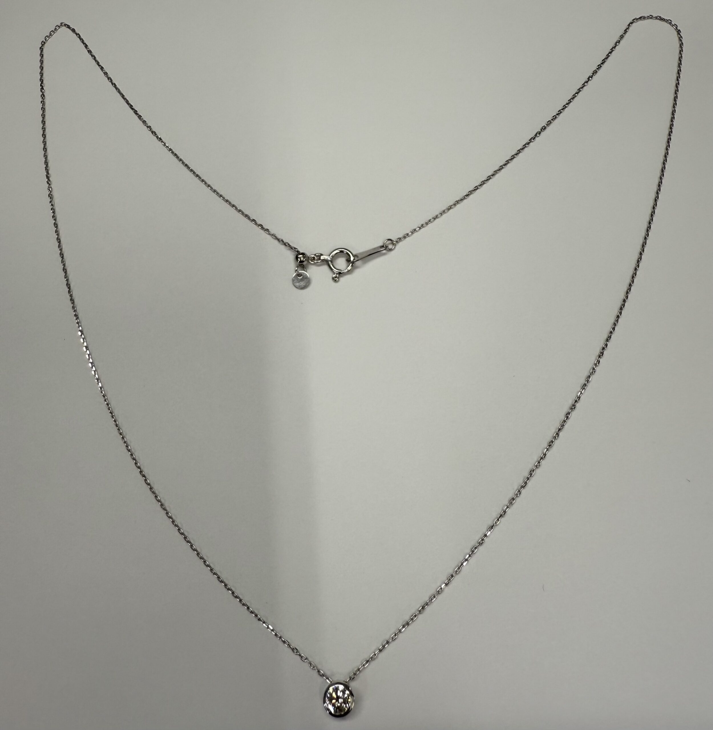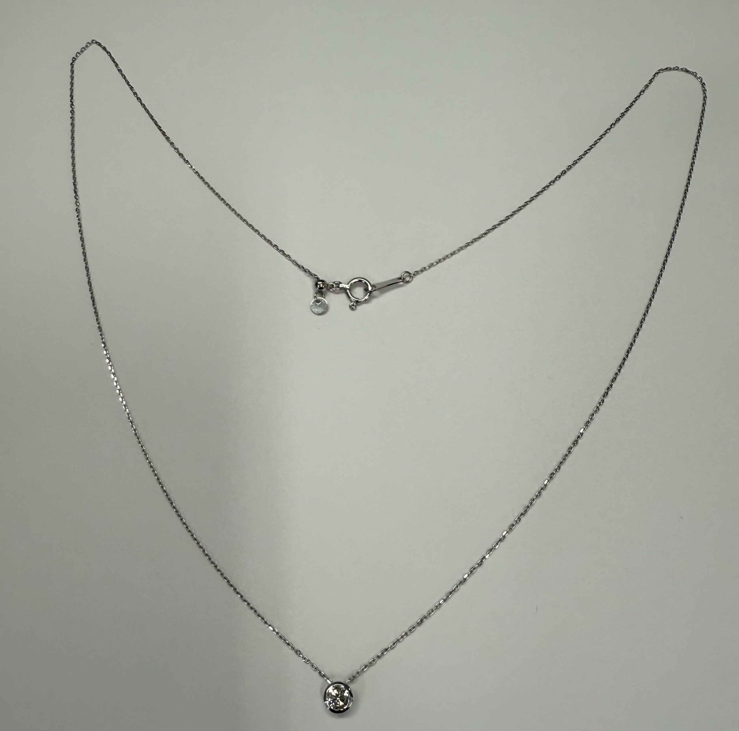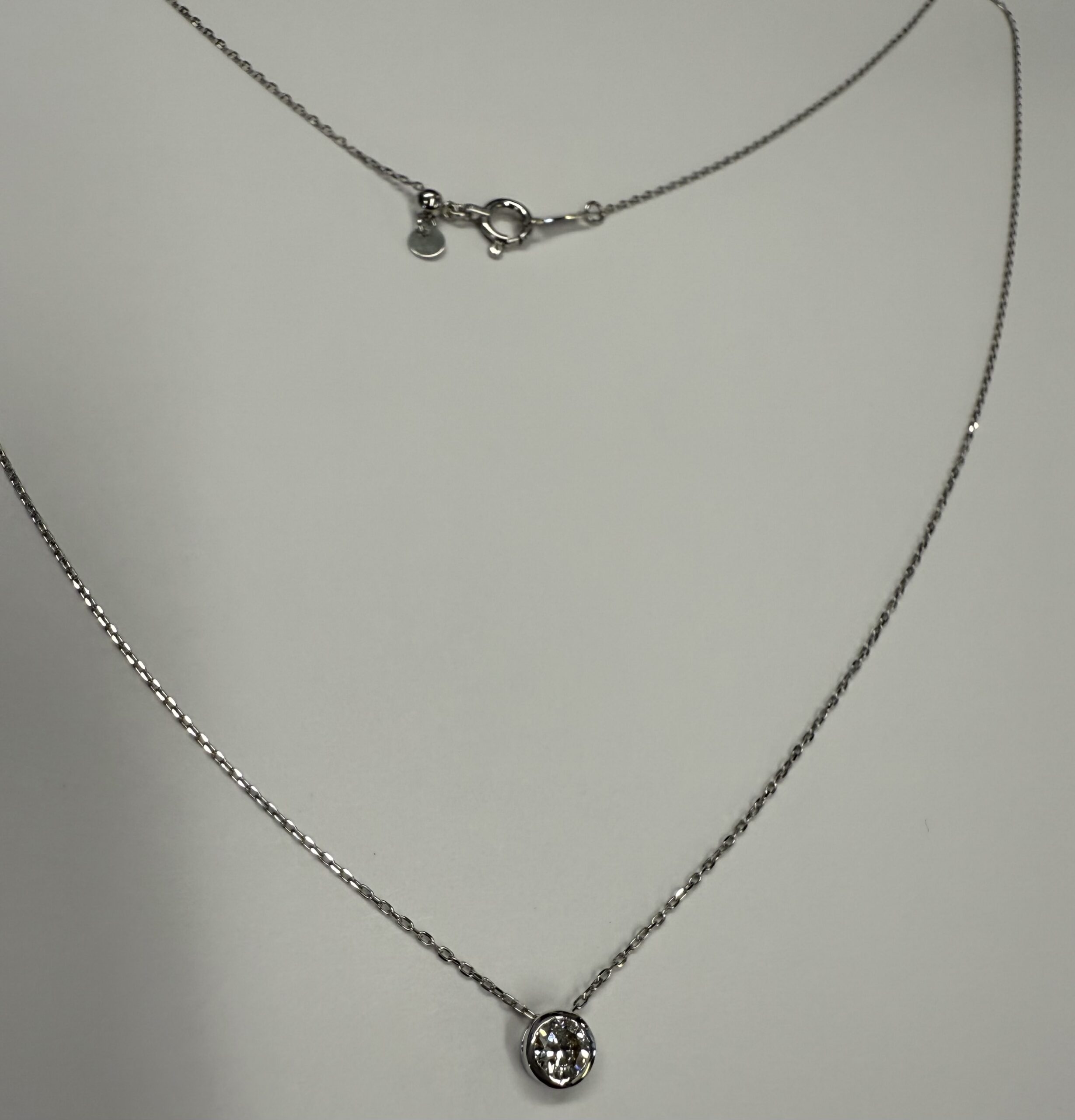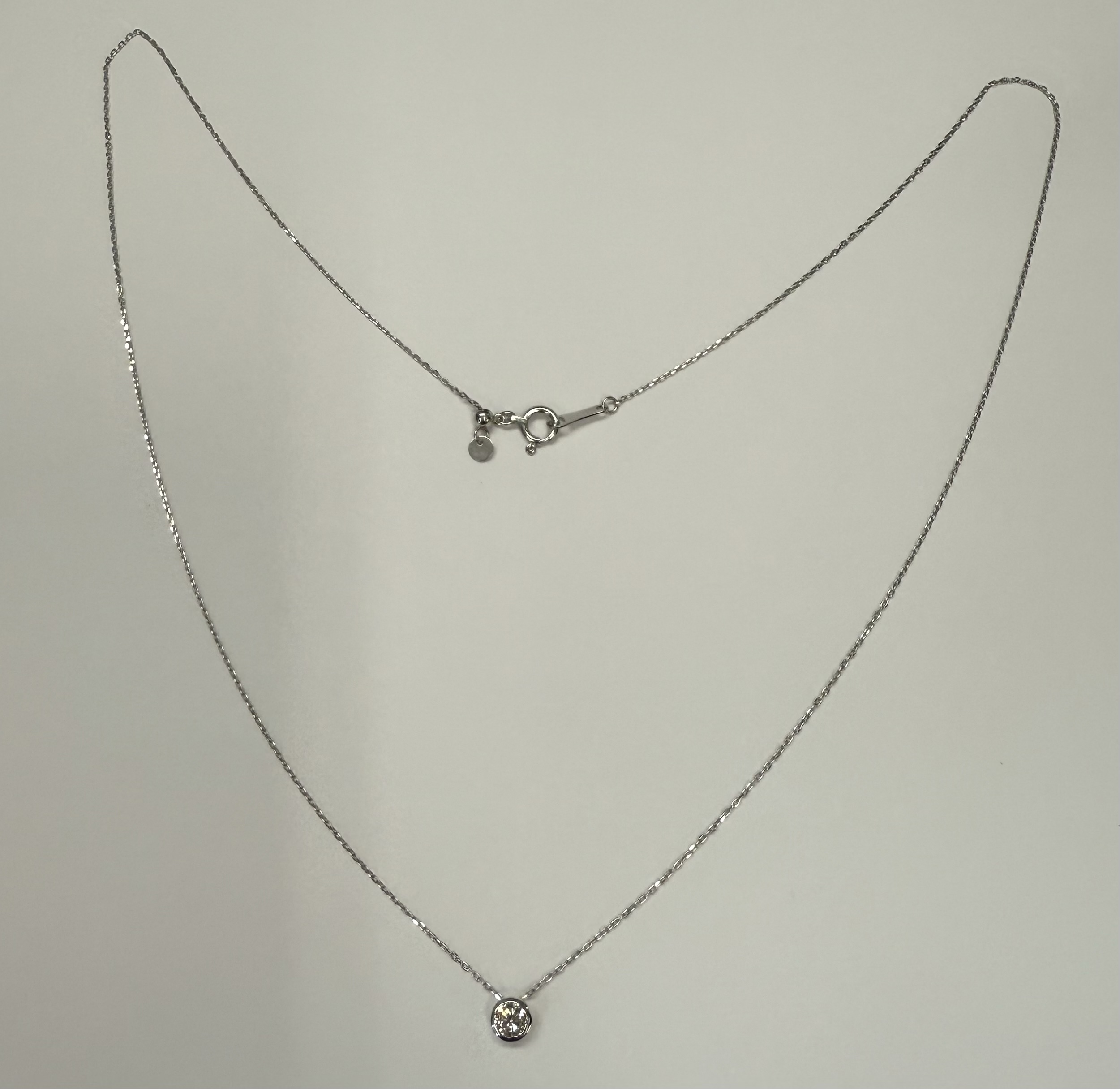 18k white gold genuine .19 cttw Round Brilliant Cut diamond bezel slide pendant. This diamond has a color grade of G, and a clarity grade of SI1. This pendant is adjustable up to 17 3/4″. This necklace has an entire weight of 1.2 grams.