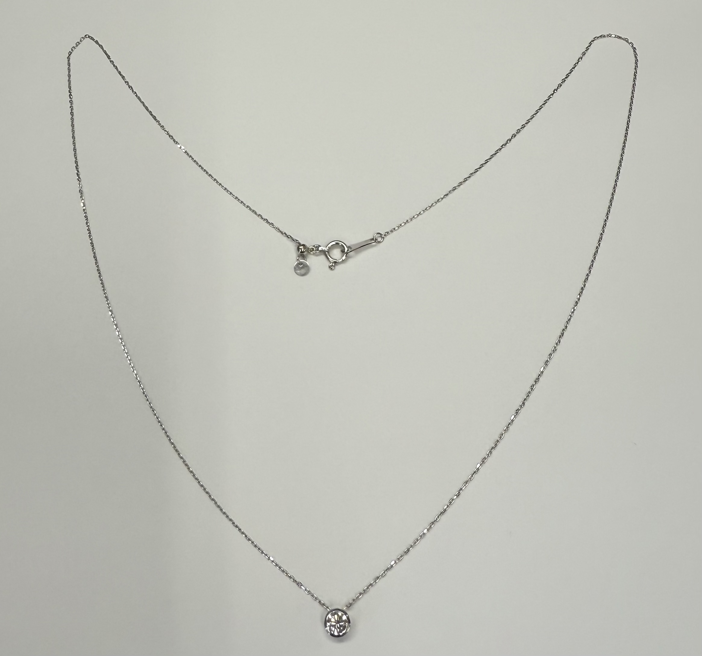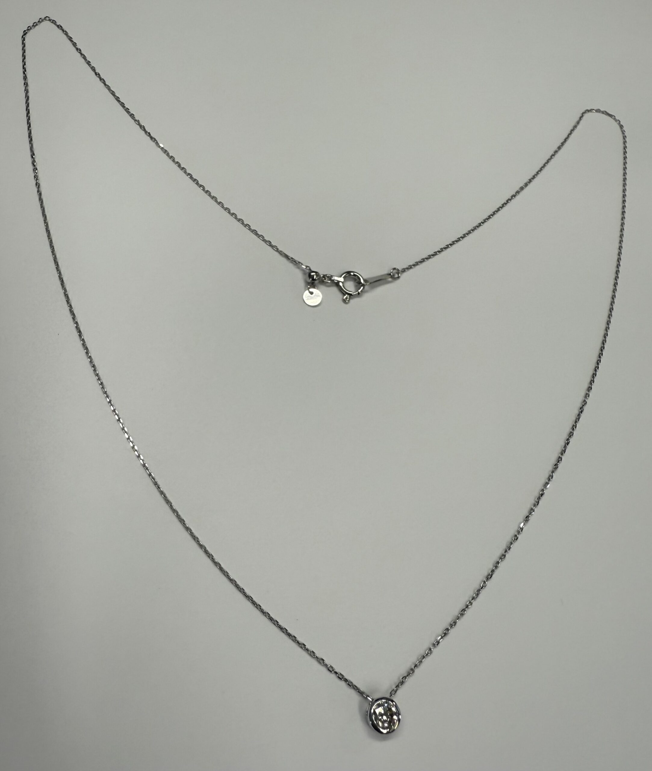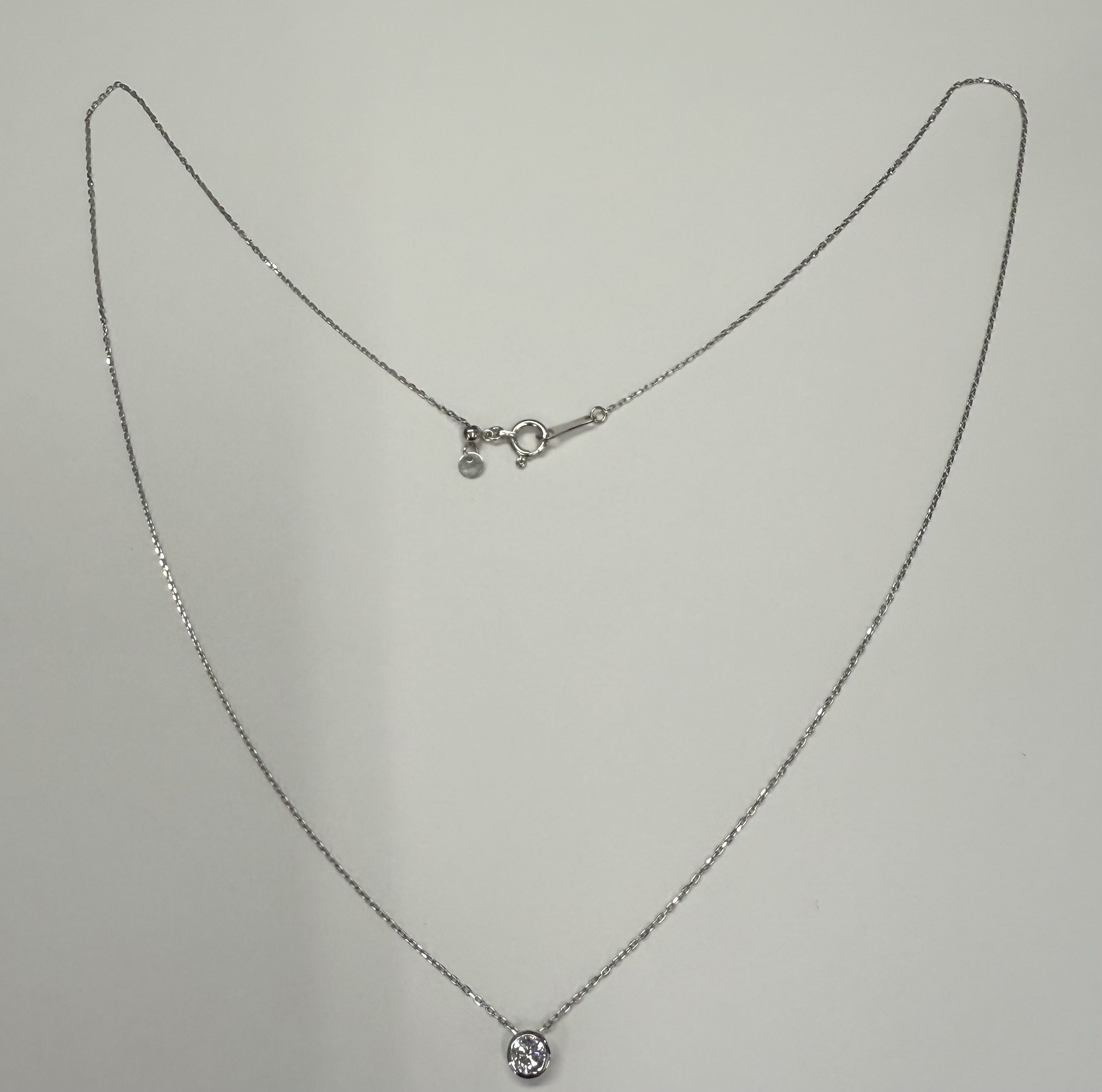 18k white gold genuine .19 cttw Round Brilliant Cut diamond bezel slide pendant. This diamond has a color grade of G, and a clarity grade of SI1. This pendant is adjustable up to 17 3/4″. This necklace has an entire weight of 1.2 grams.