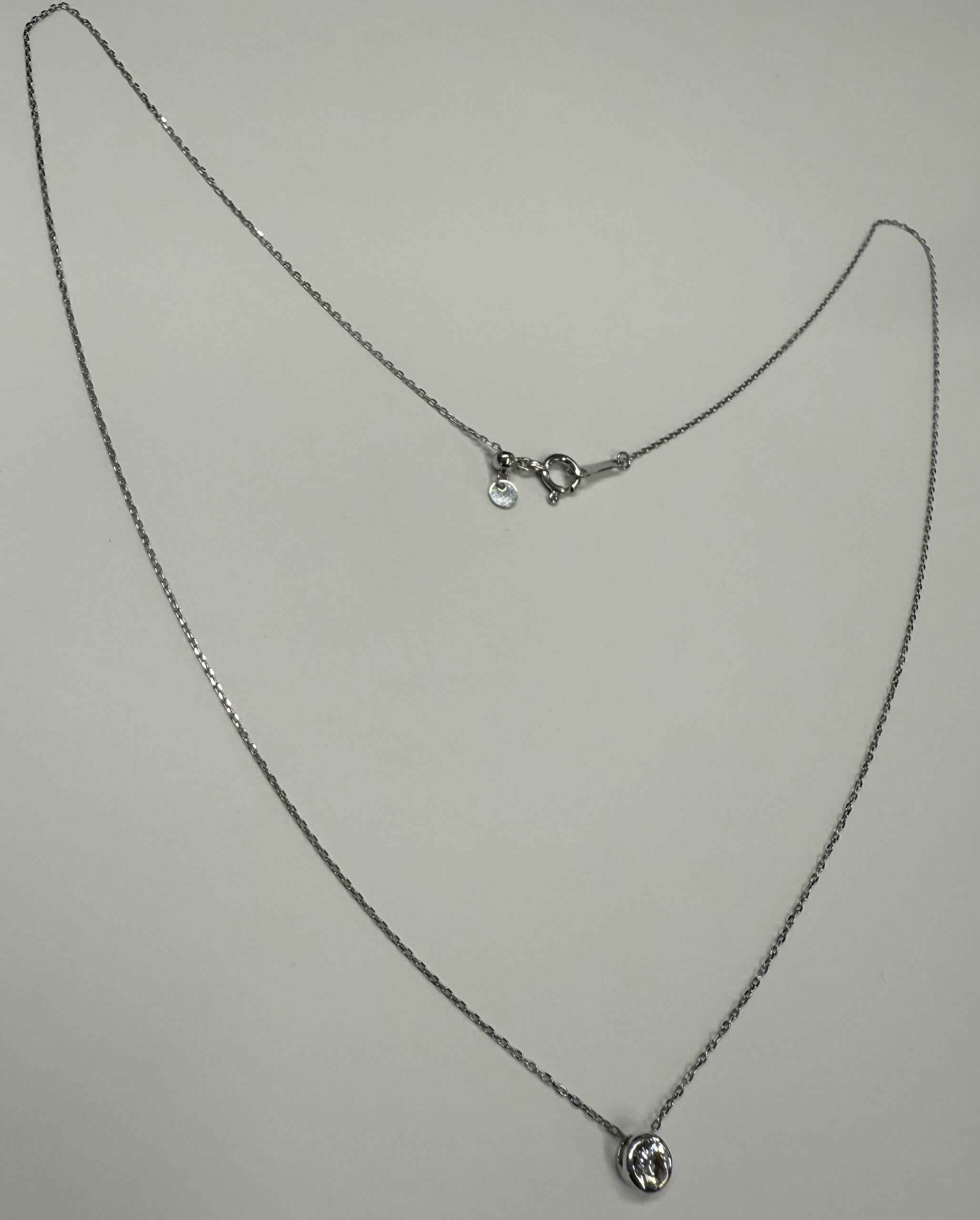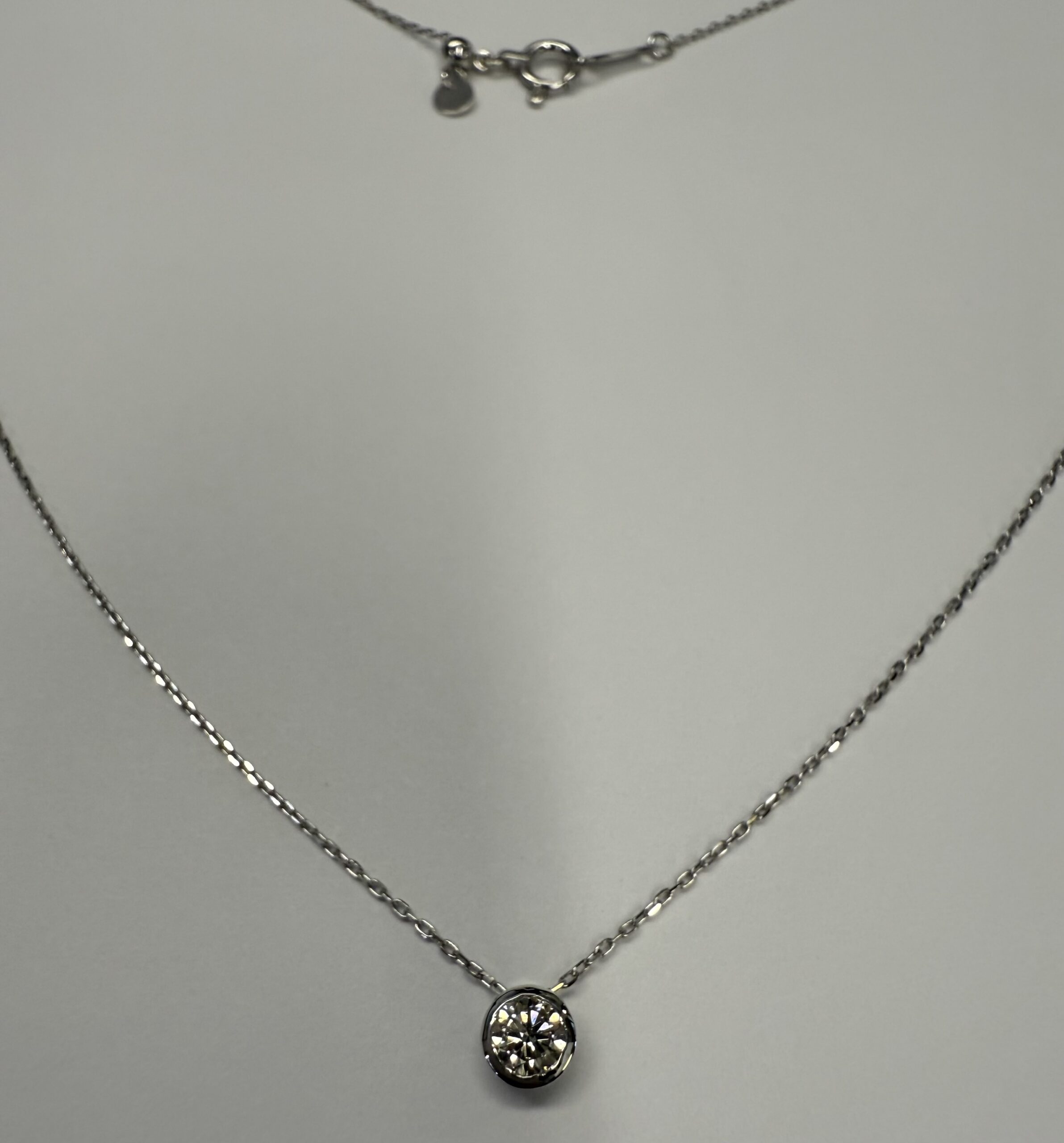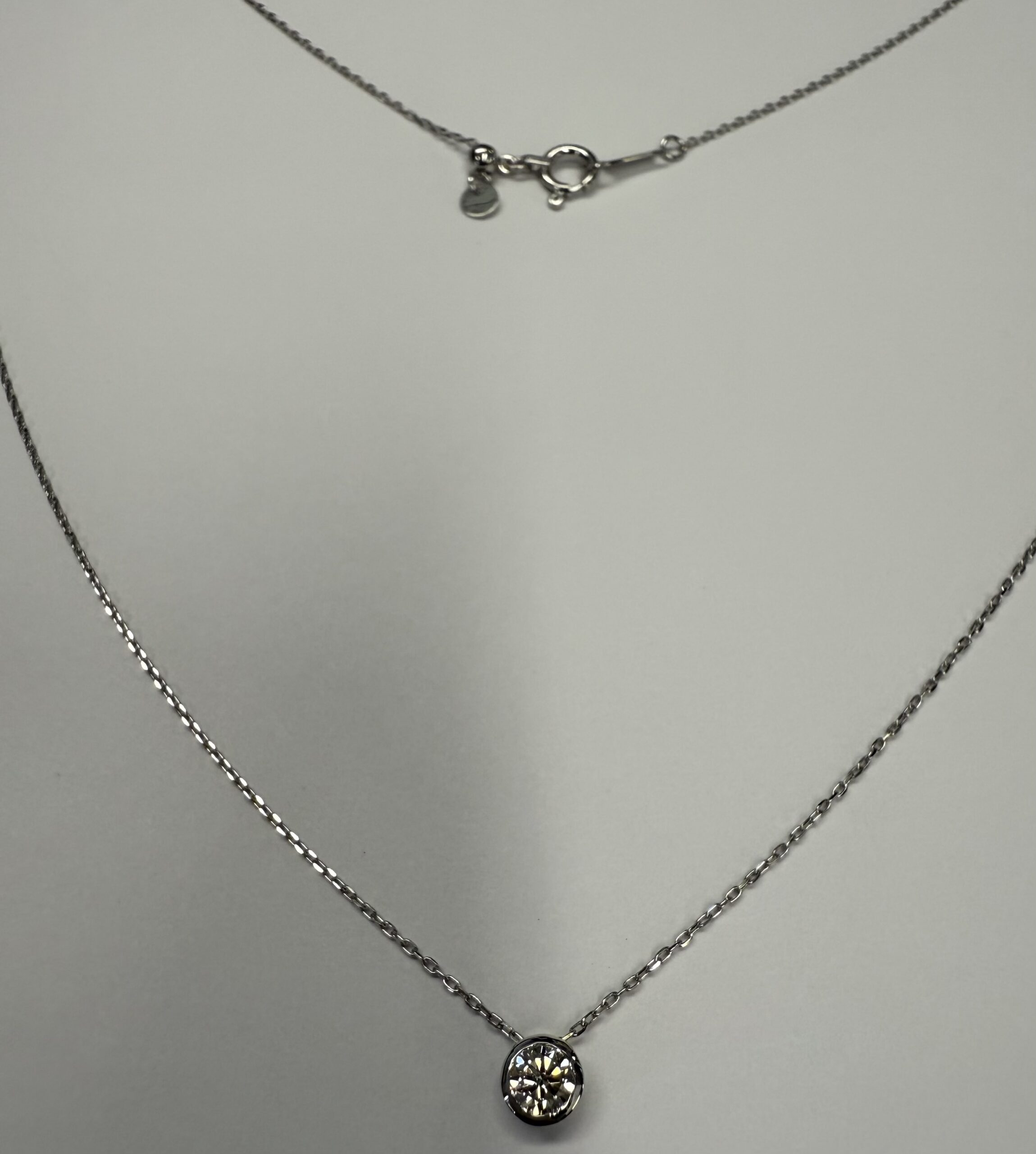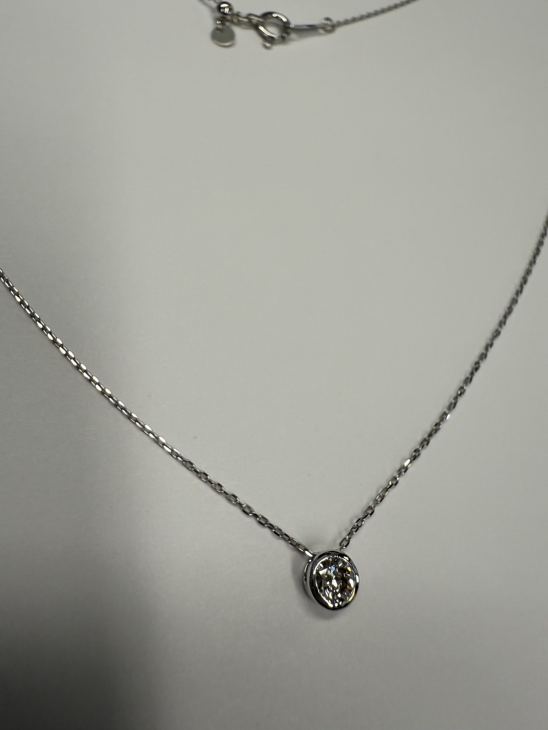 18k white gold genuine .19 cttw Round Brilliant Cut diamond bezel slide pendant. This diamond has a color grade of G, and a clarity grade of SI1. This pendant is adjustable up to 17 3/4″. This necklace has an entire weight of 1.2 grams.