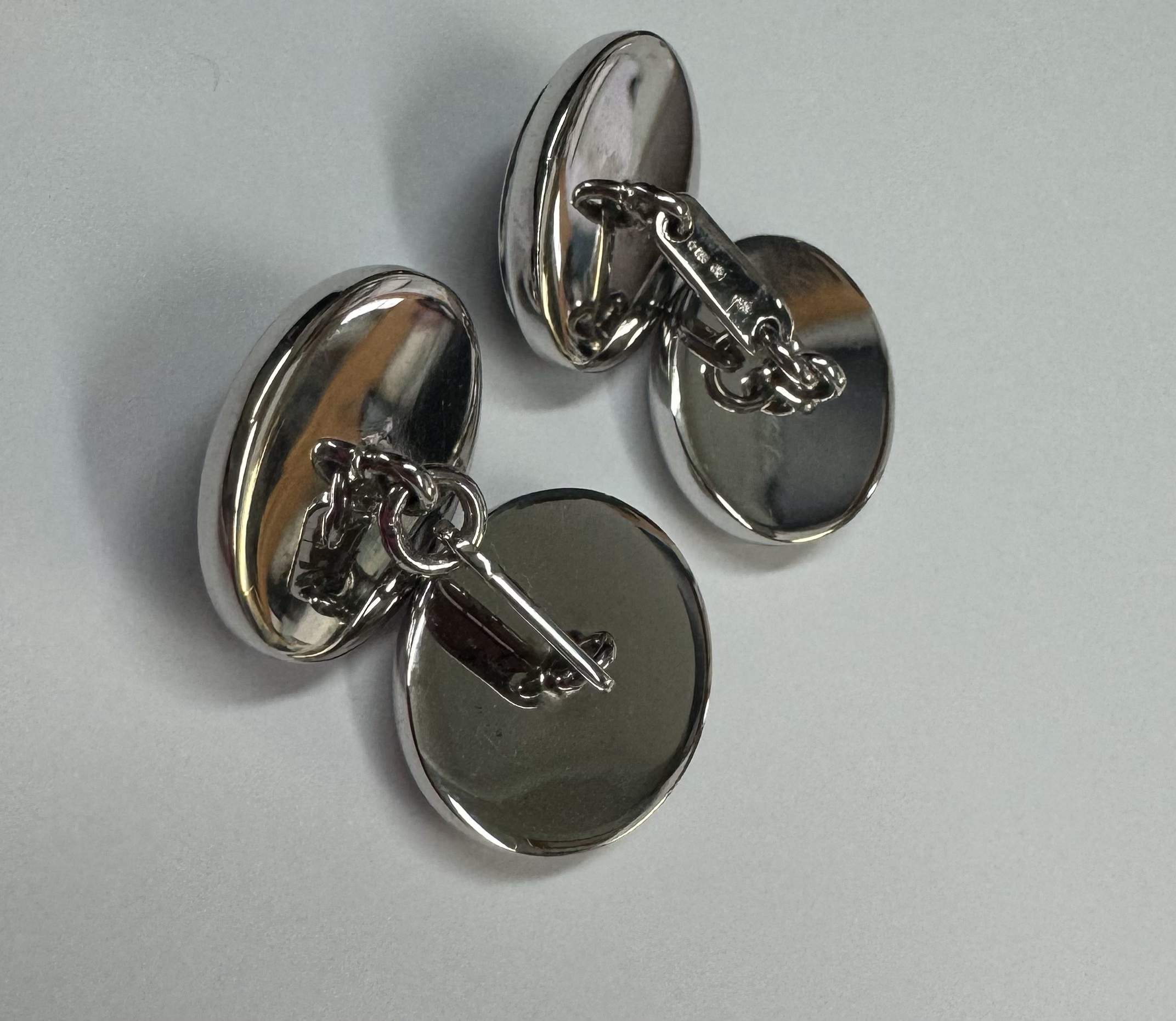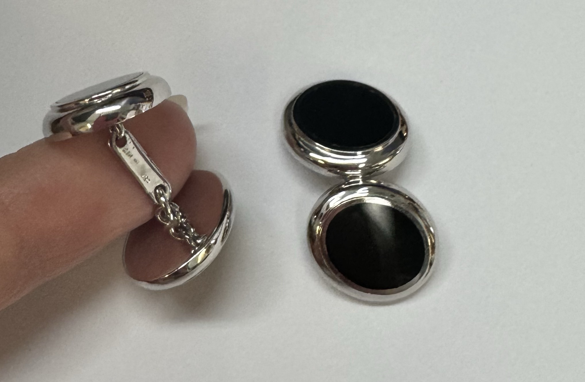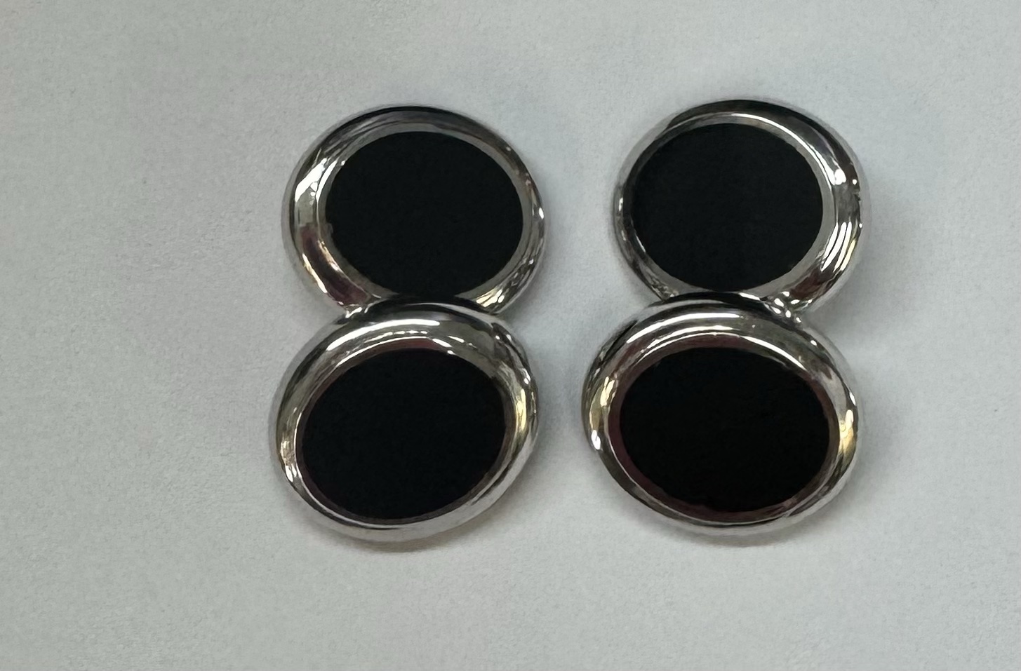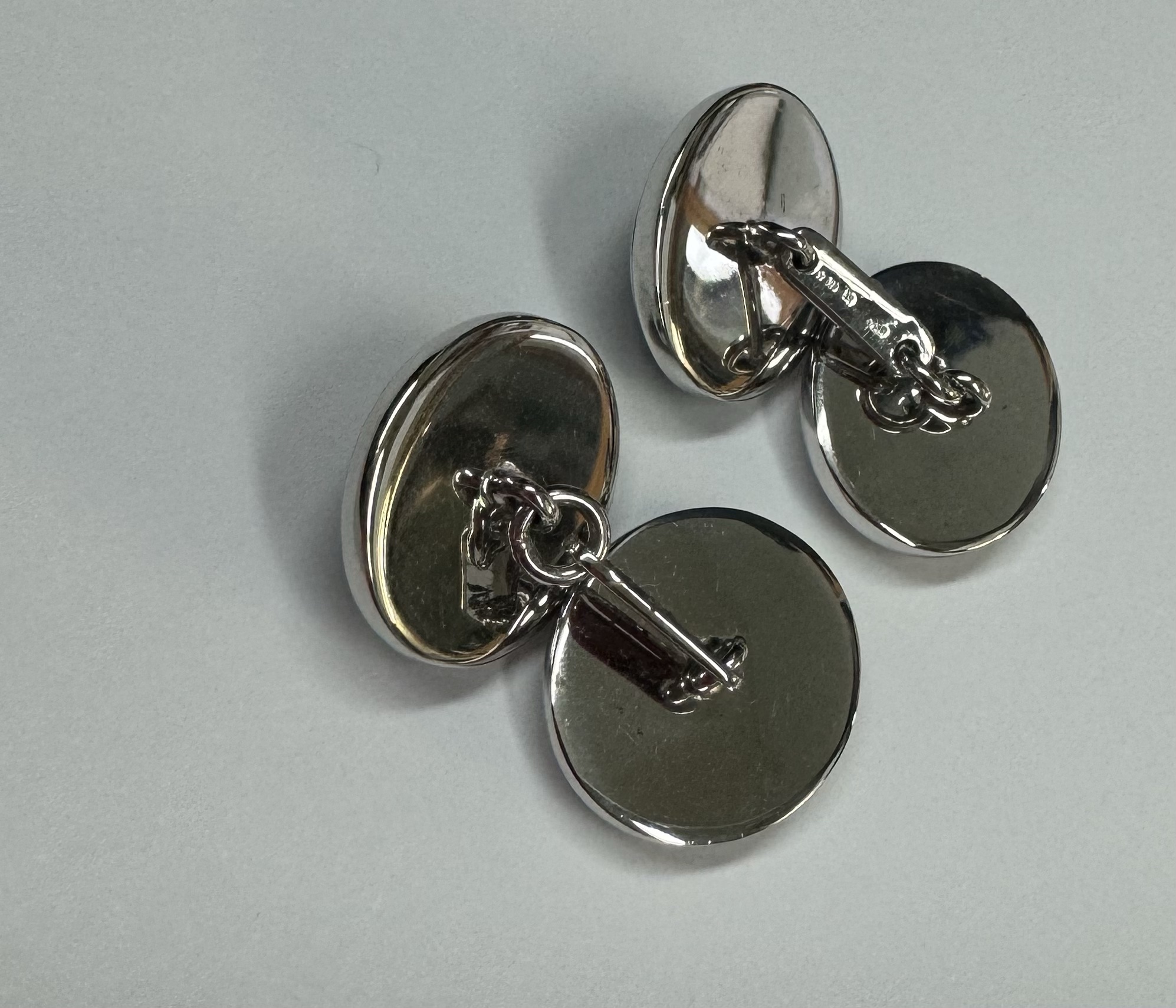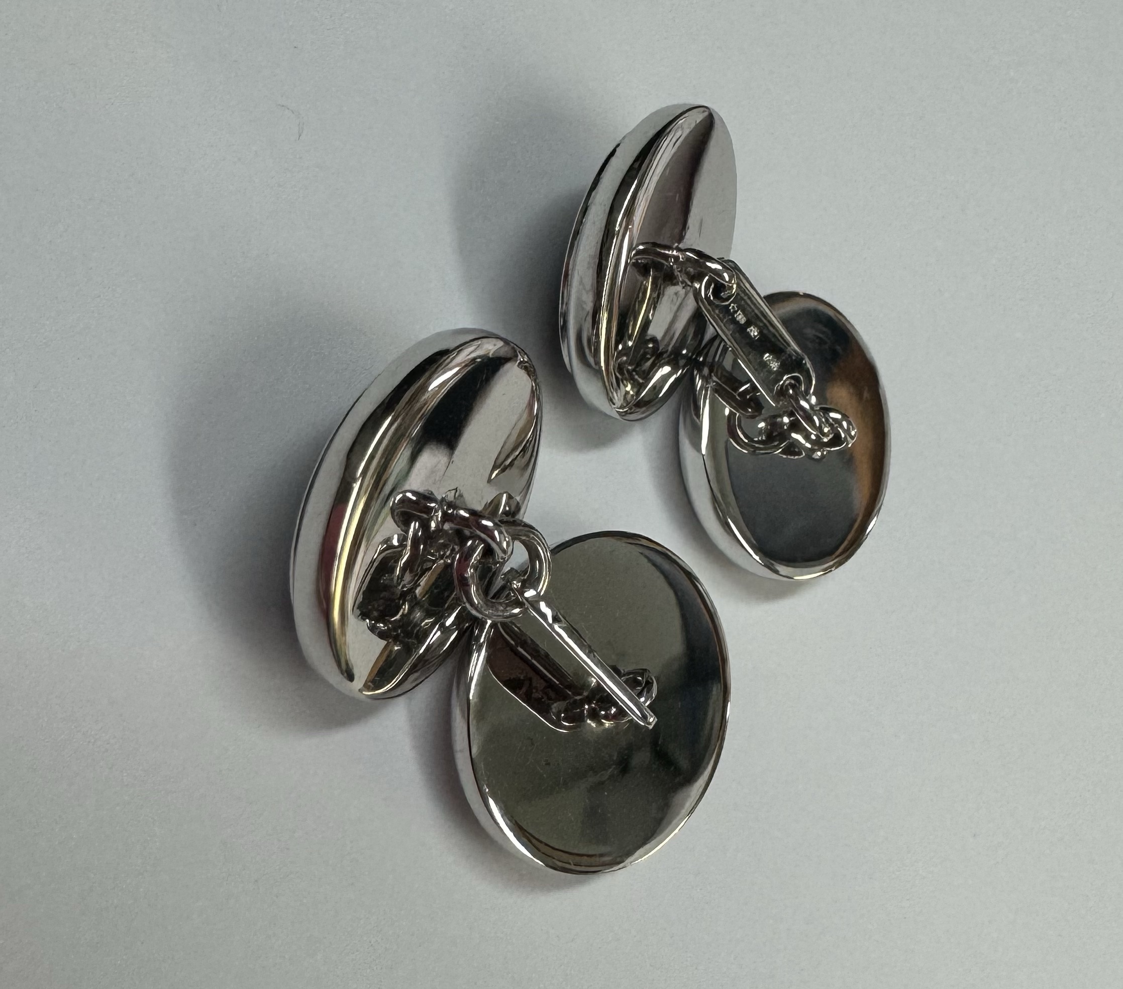 One-of-a-kind 18k white gold oval shaped cufflinks with genuine Onyx inlay, directly imported from Italy. These cufflinks measure approximately 16.6 mm in size, and they have an entire weight of 12.99 grams. Now 50% off!