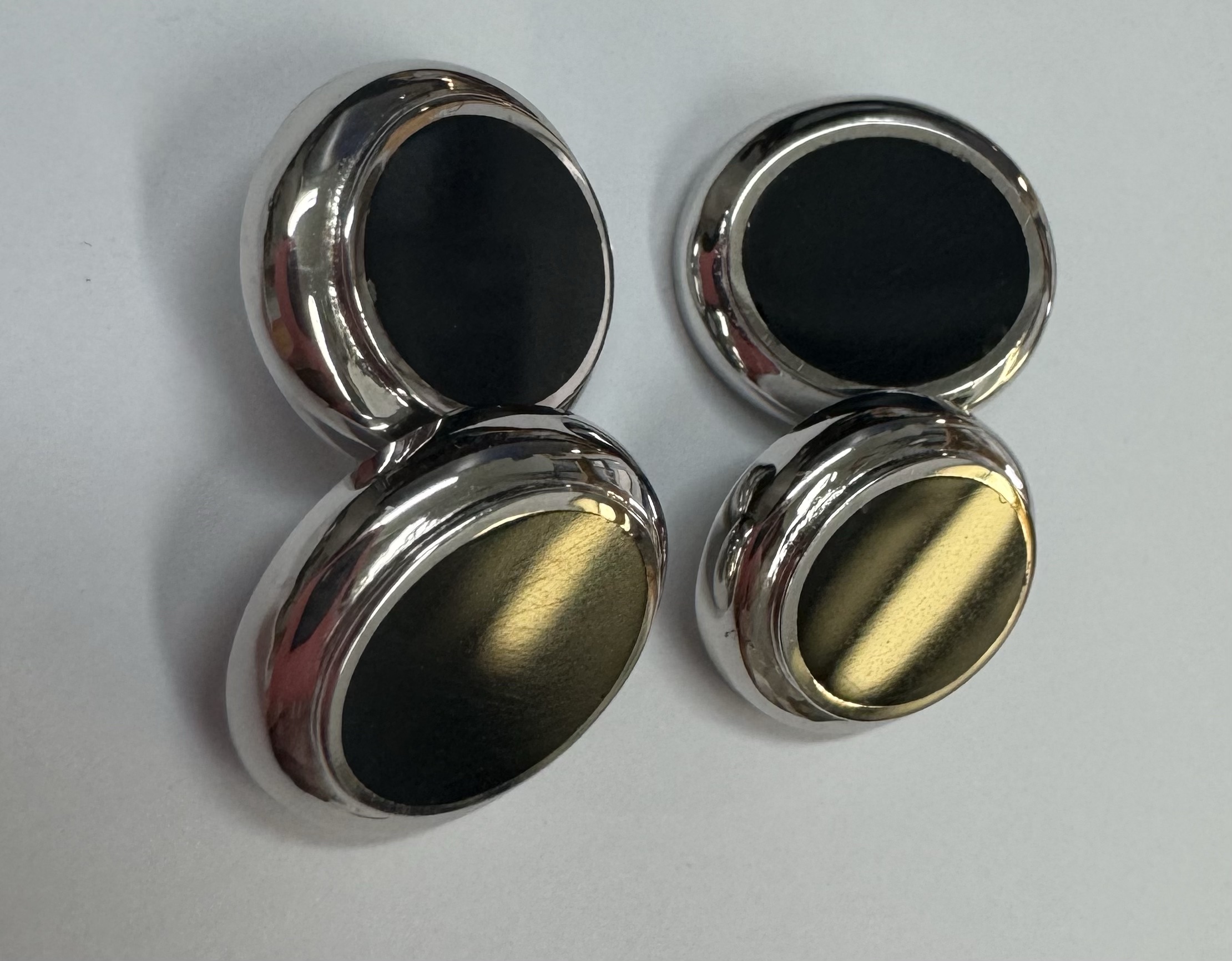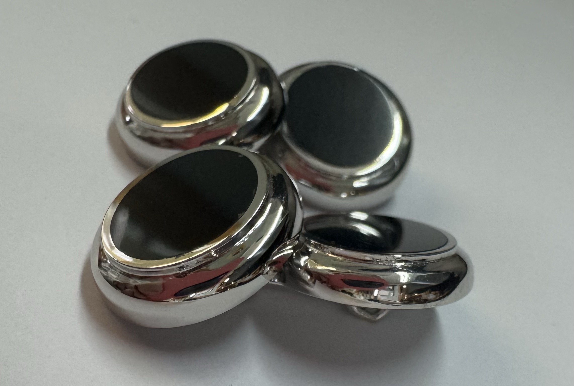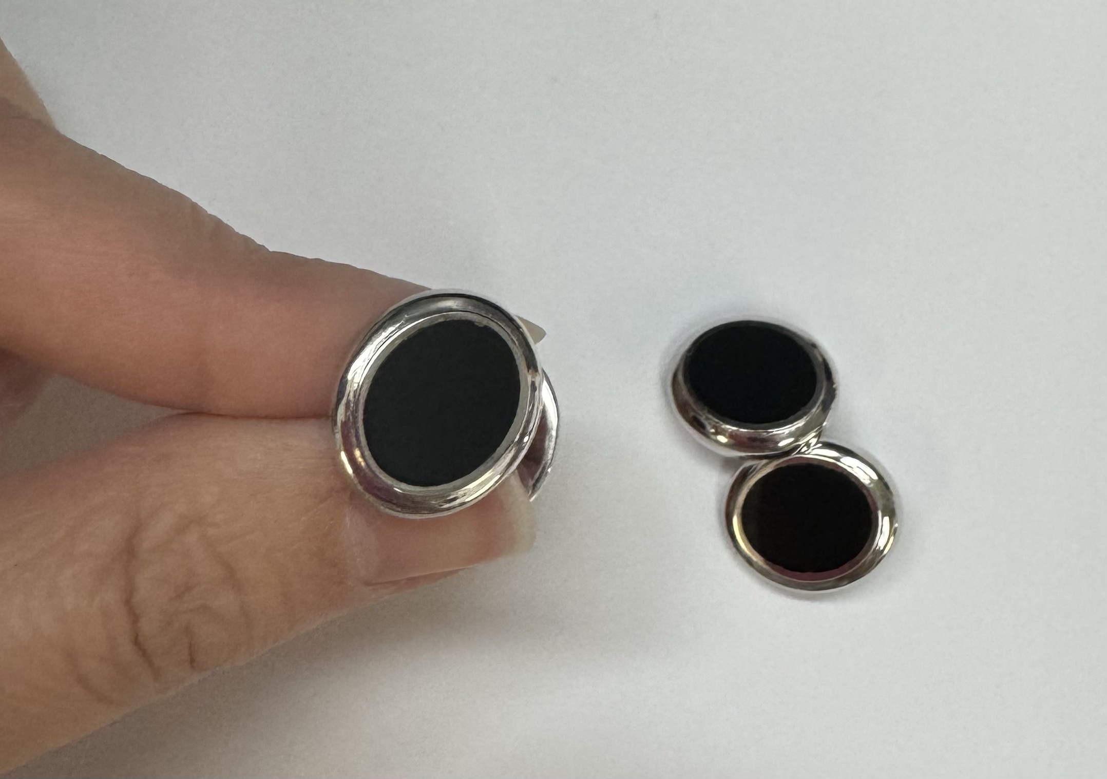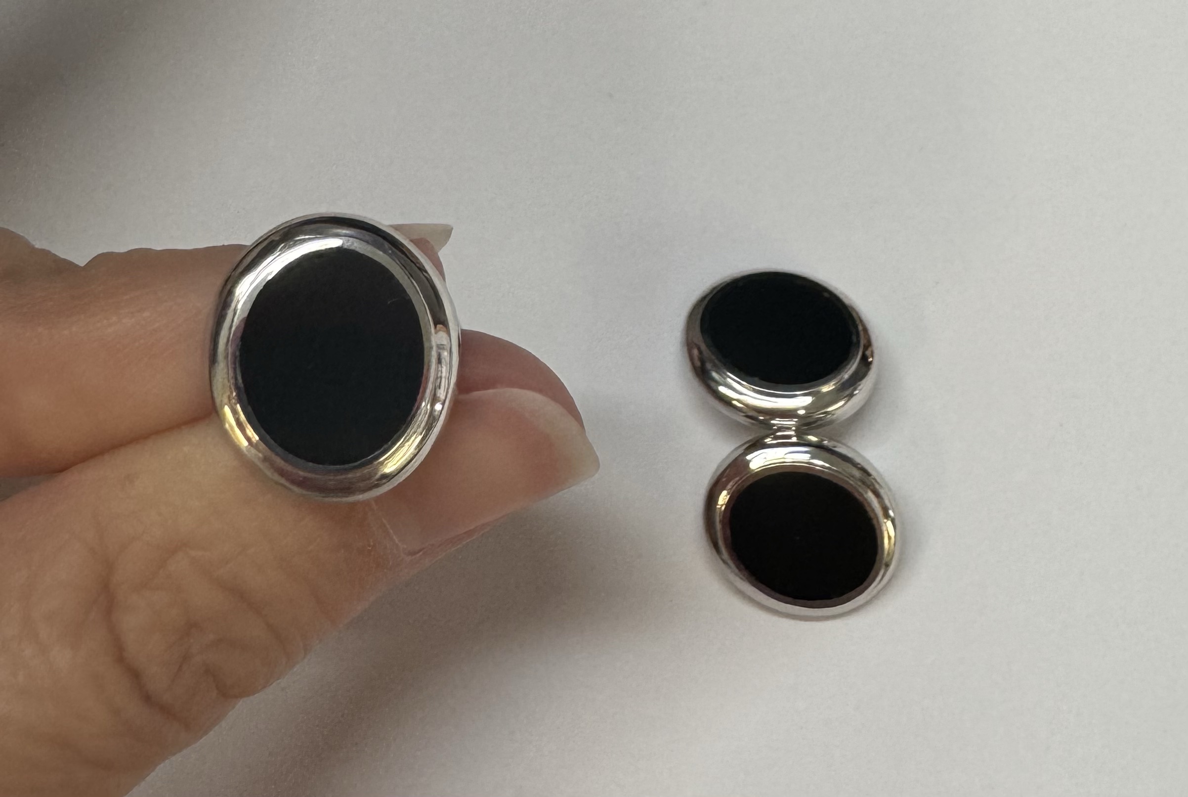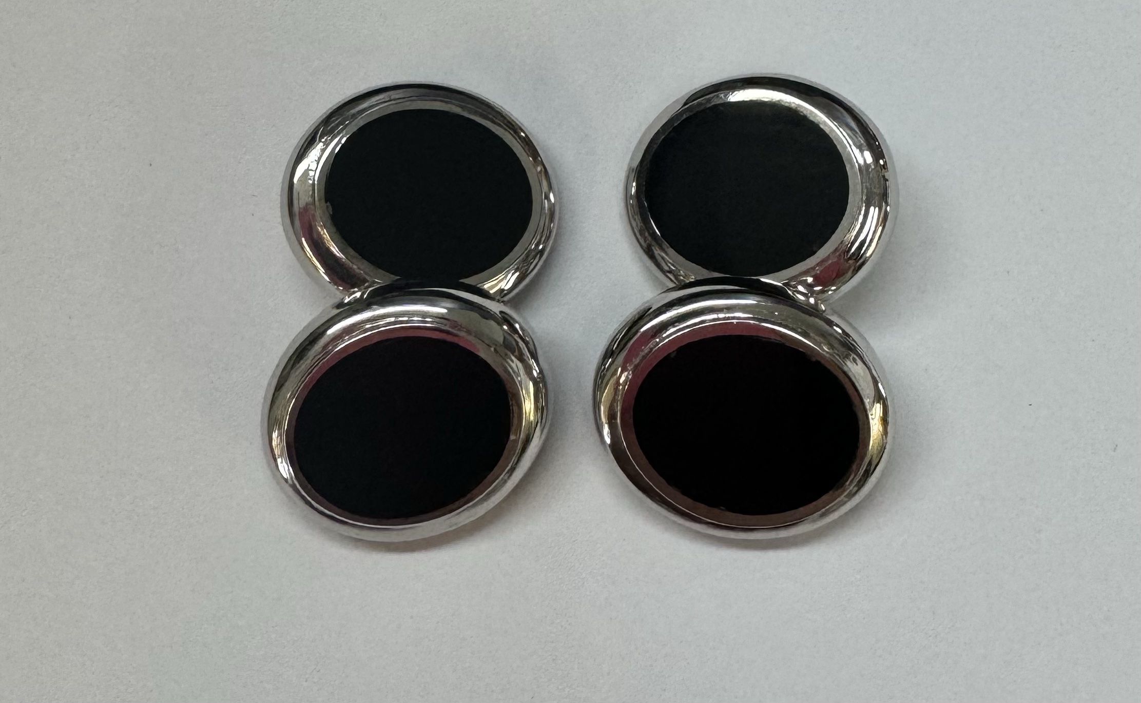 One-of-a-kind 18k white gold oval shaped cufflinks with genuine Onyx inlay, directly imported from Italy. These cufflinks measure approximately 16.6 mm in size, and they have an entire weight of 12.99 grams. Now 50% off!