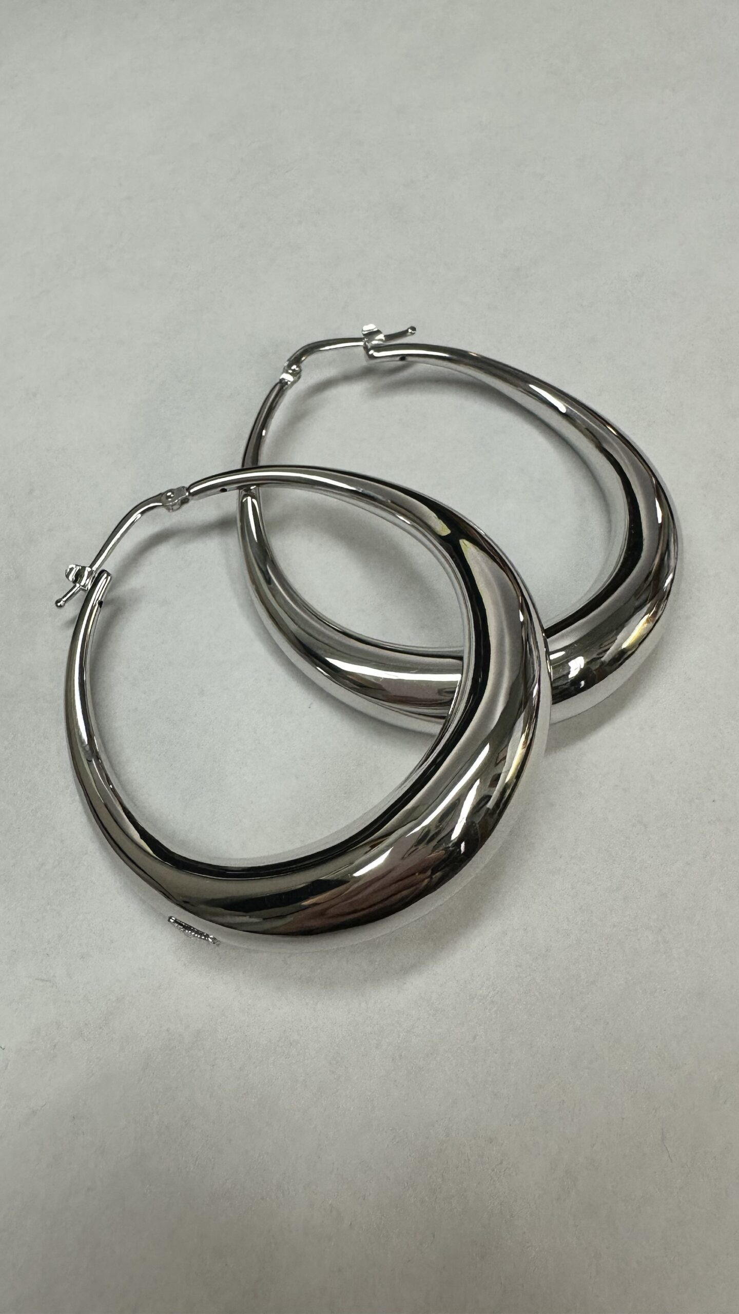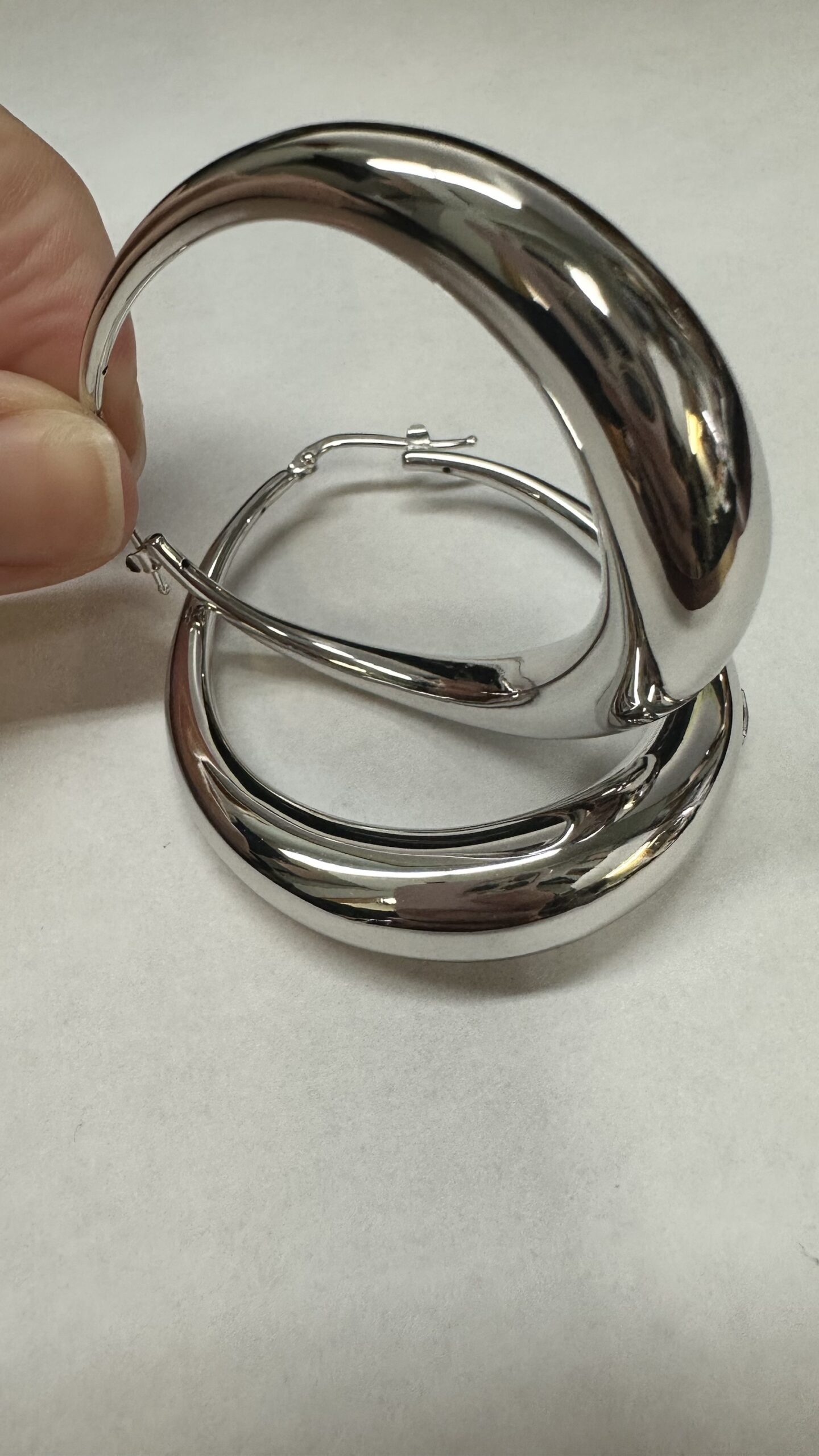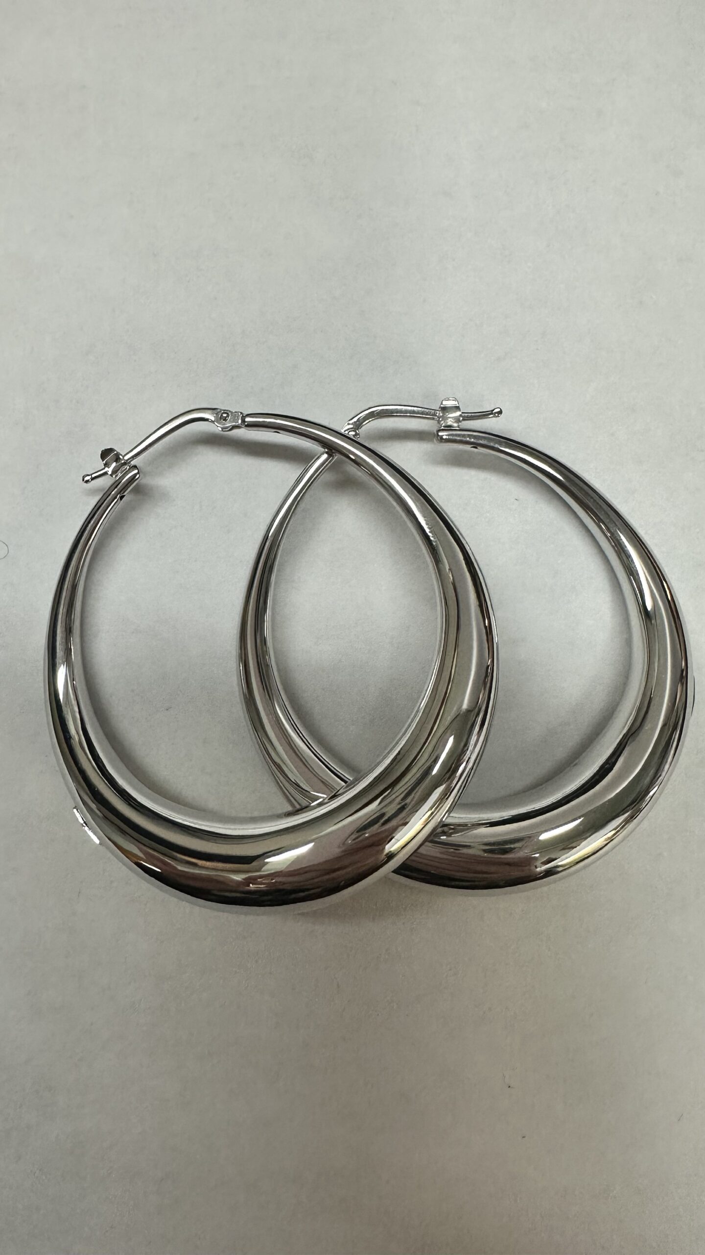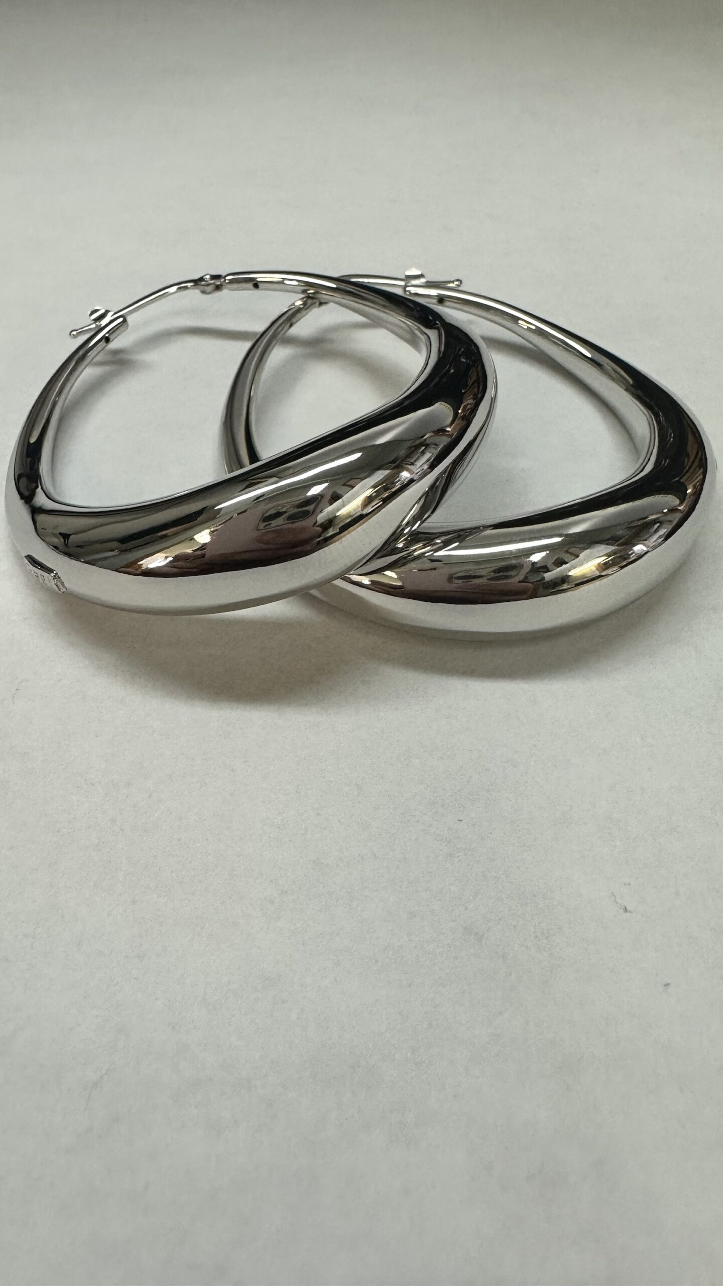 18k white gold one-of-a-kind large off-round tubular style puffy hoop earrings. These earrings measure approximately 10 x 46 mm in size, and they have an entire weight of 11.44 grams.