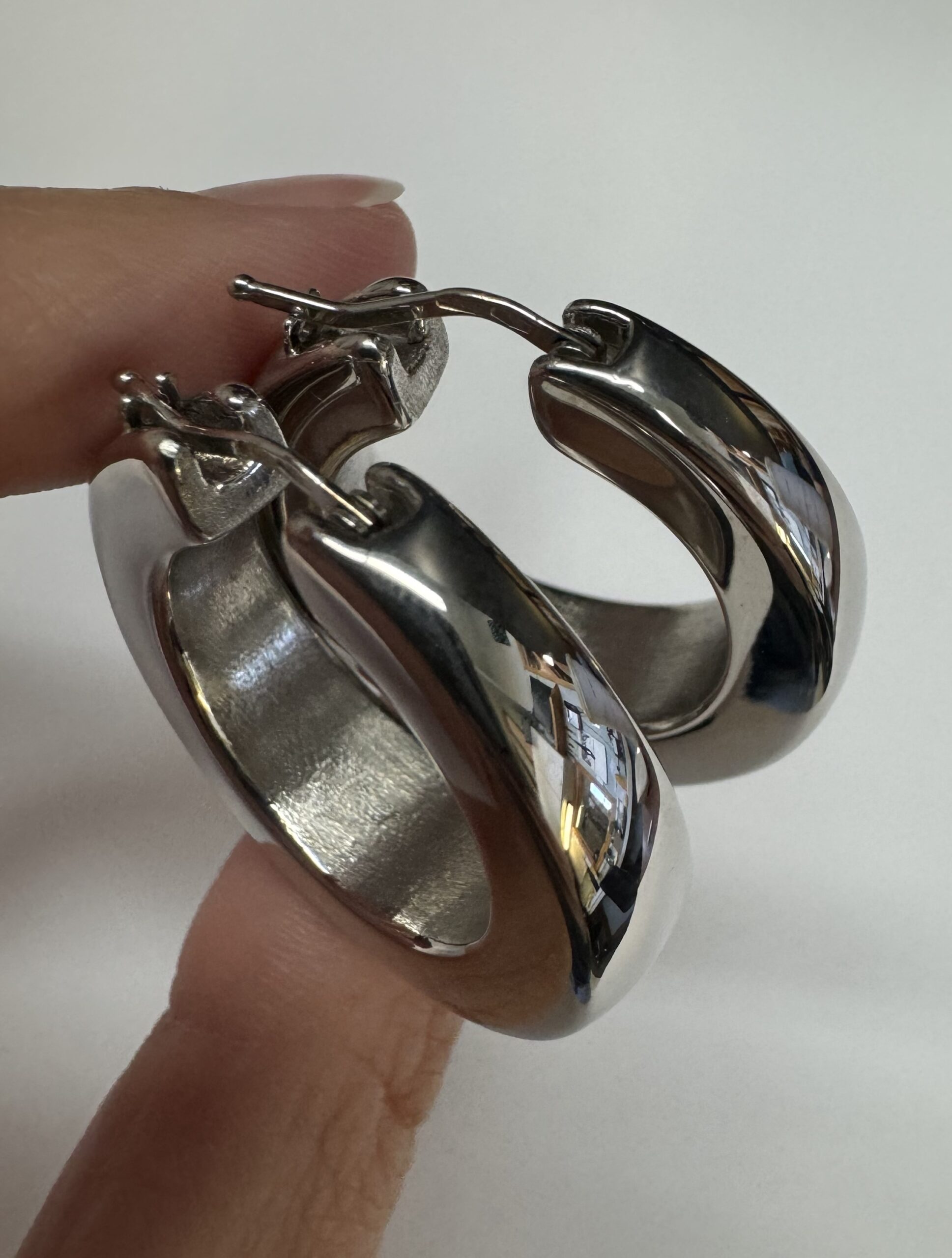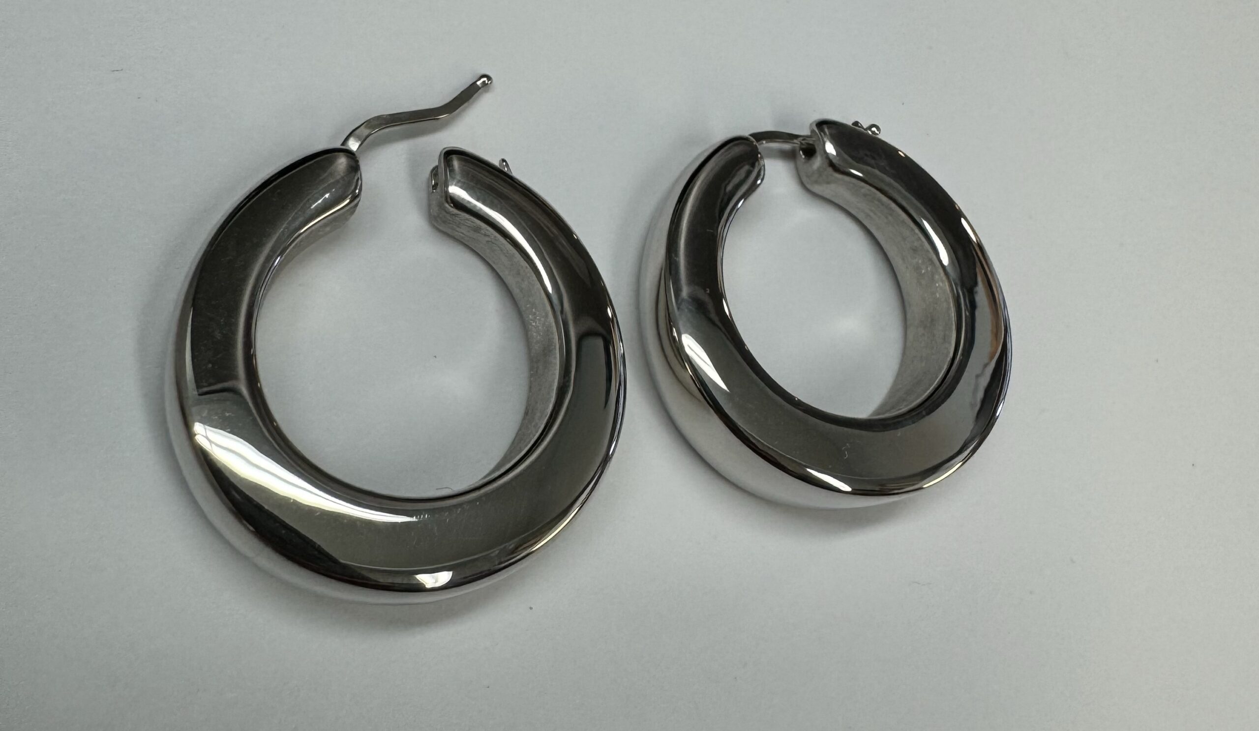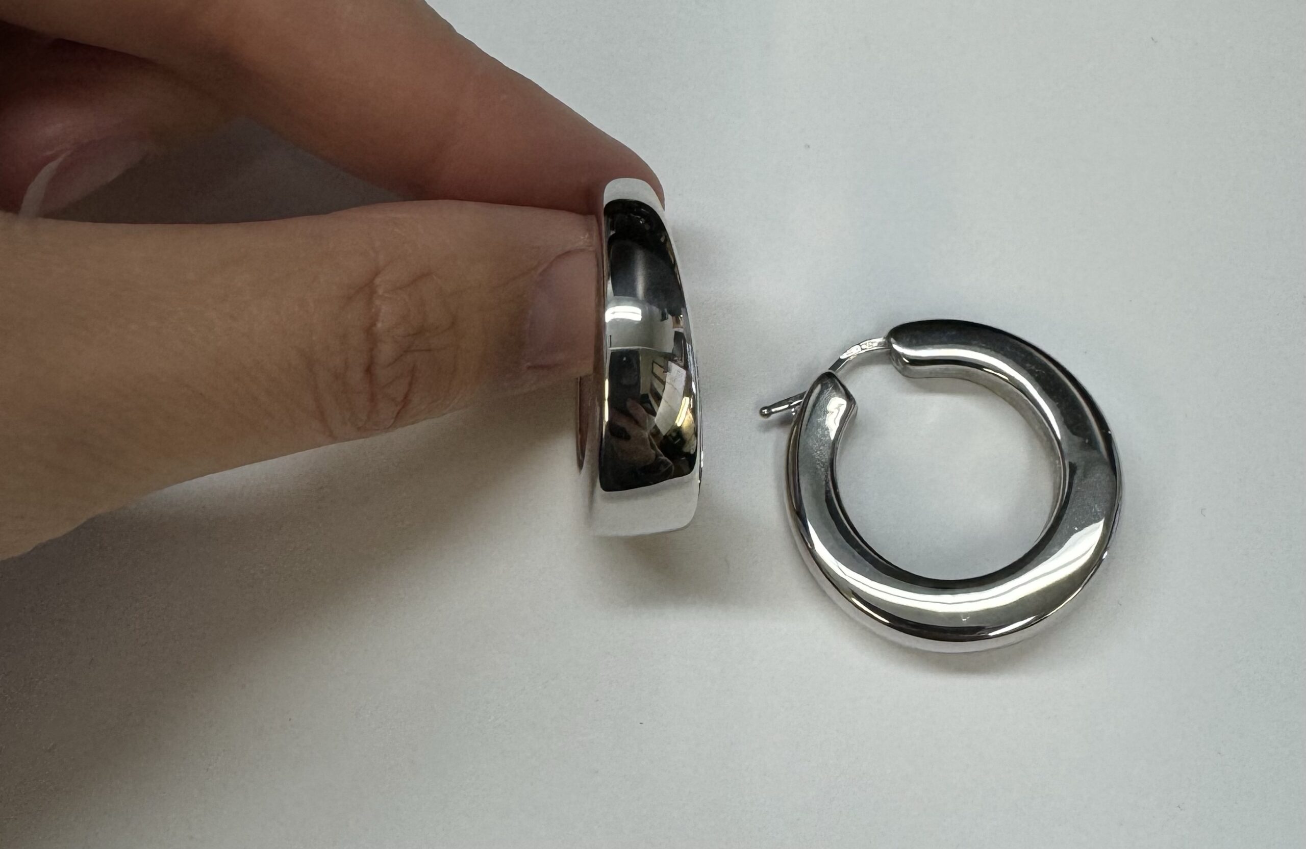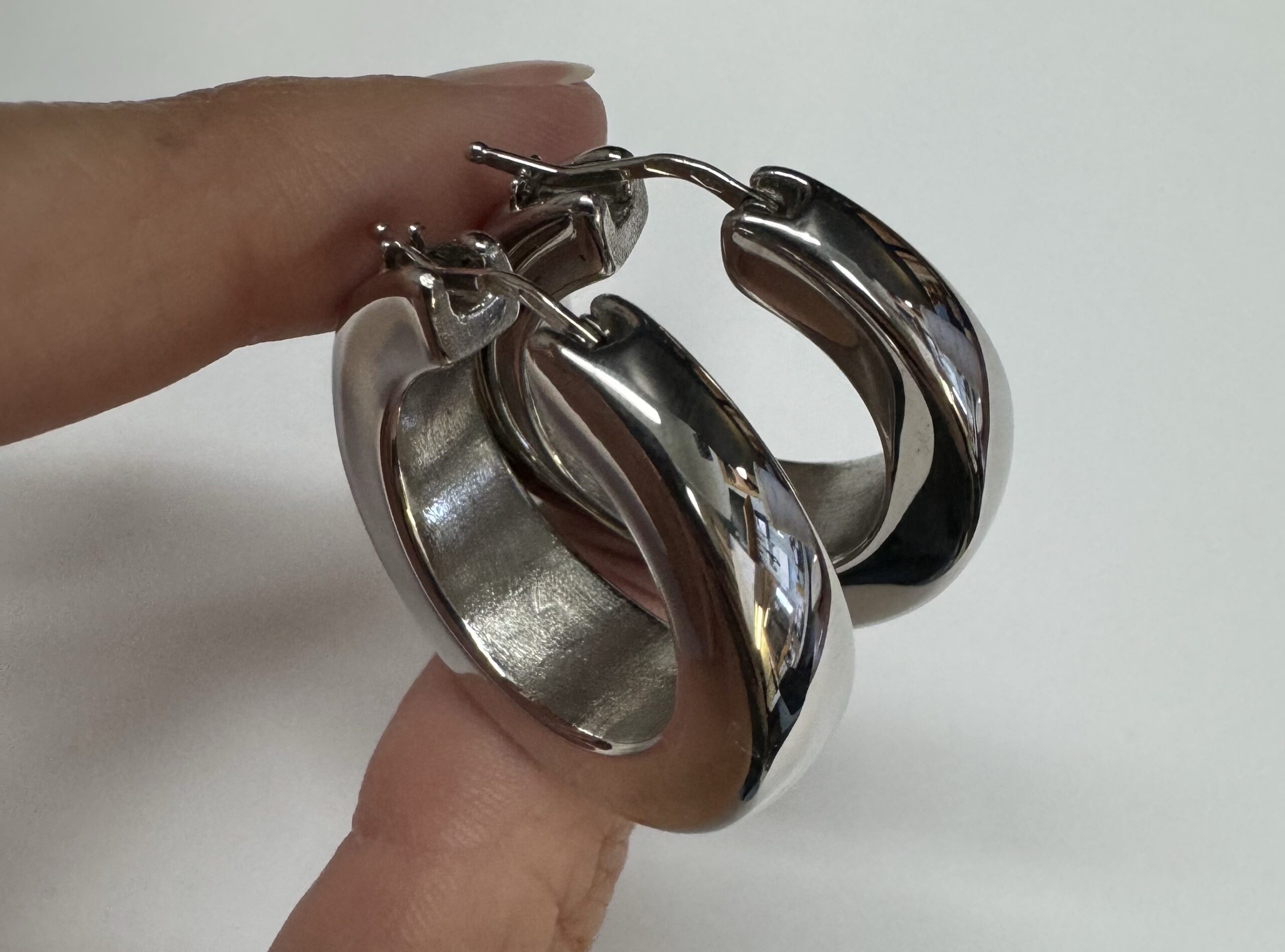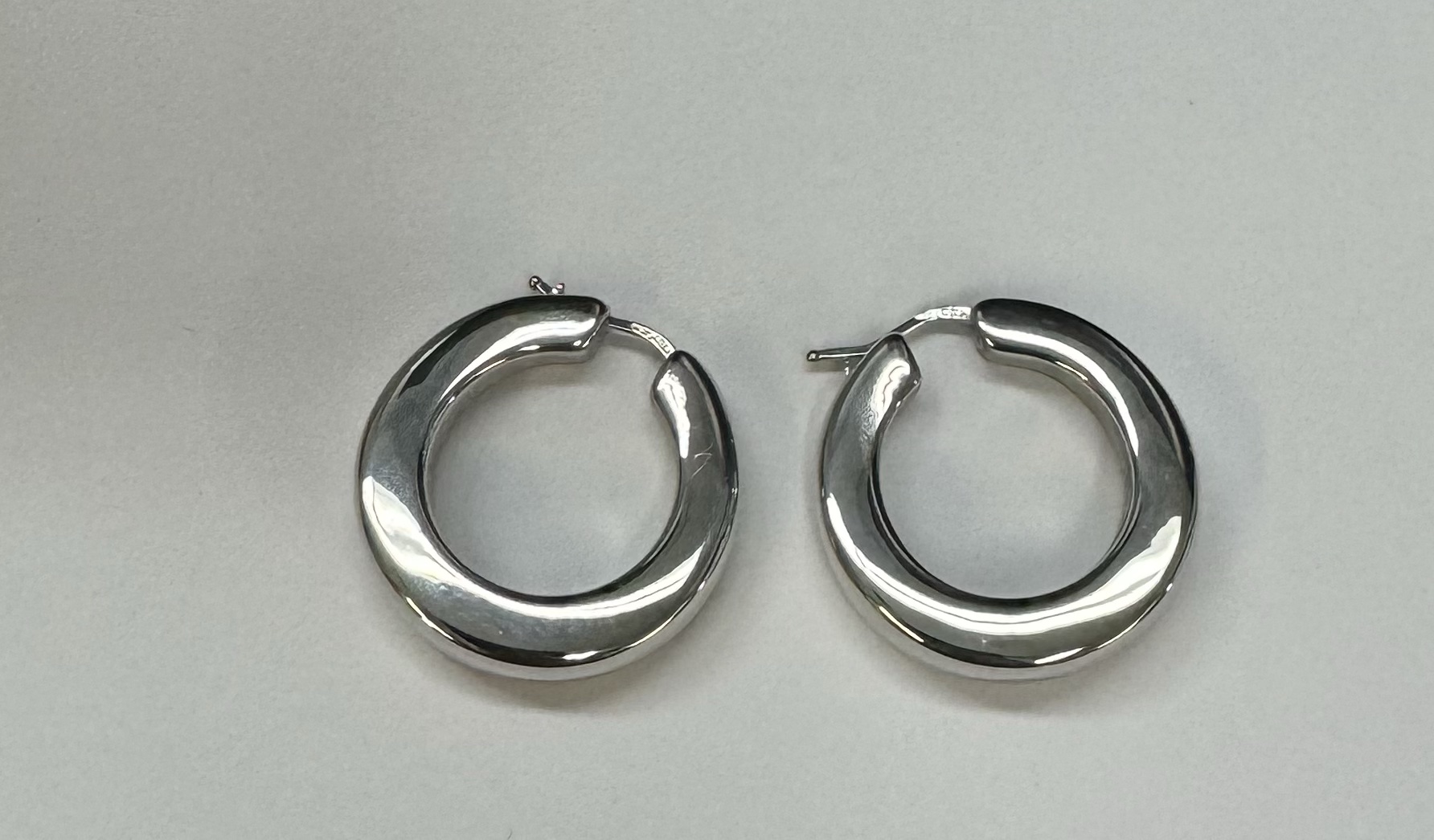 One-of-a-kind 18k white gold round hoop earrings with click, directly imported from Italy. These earrings measure approximately 30 x 9 mm in sized and they have an entire weight of 9.1 grams.