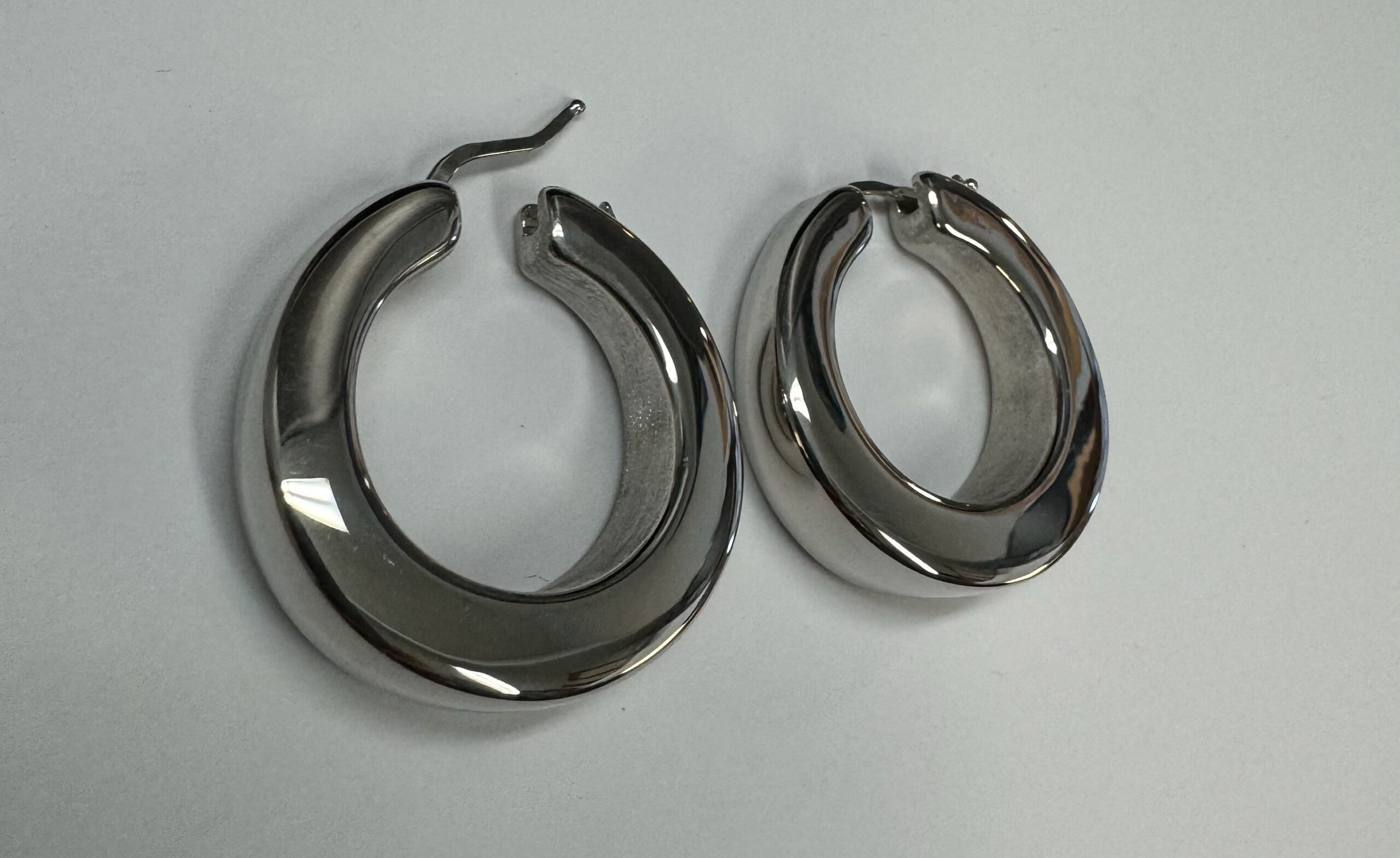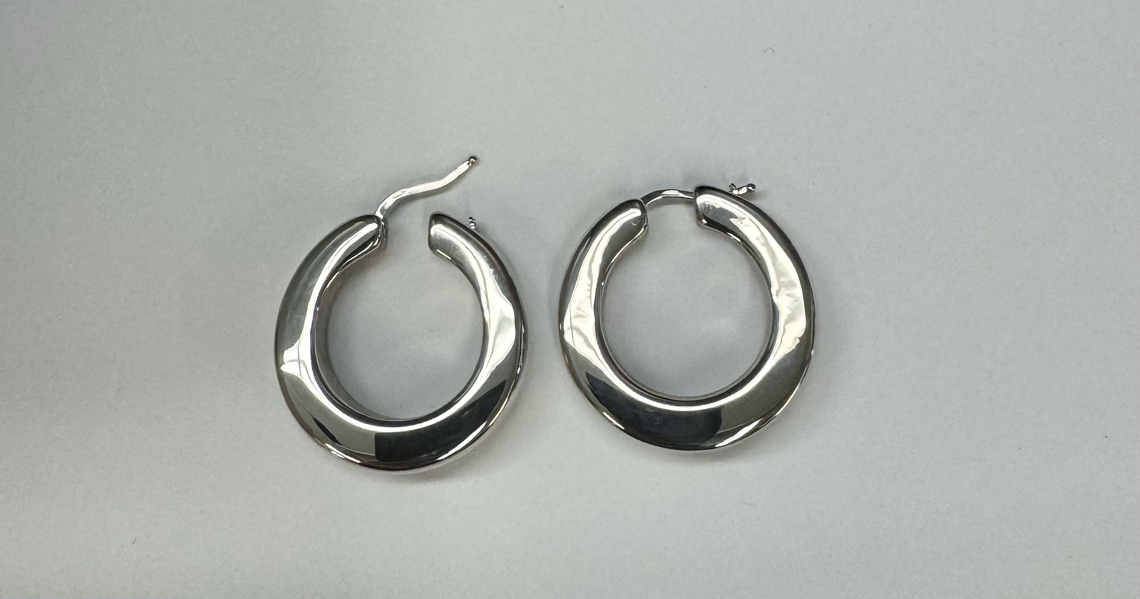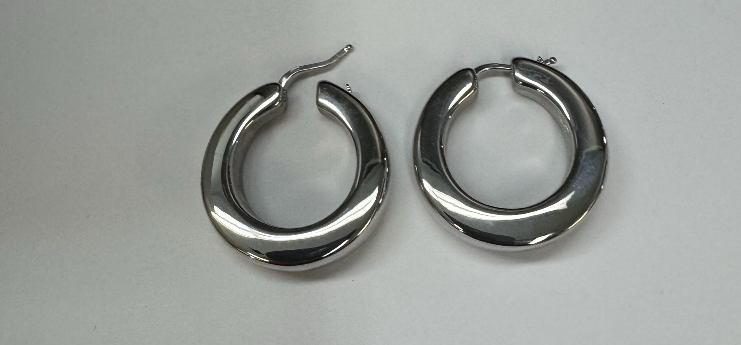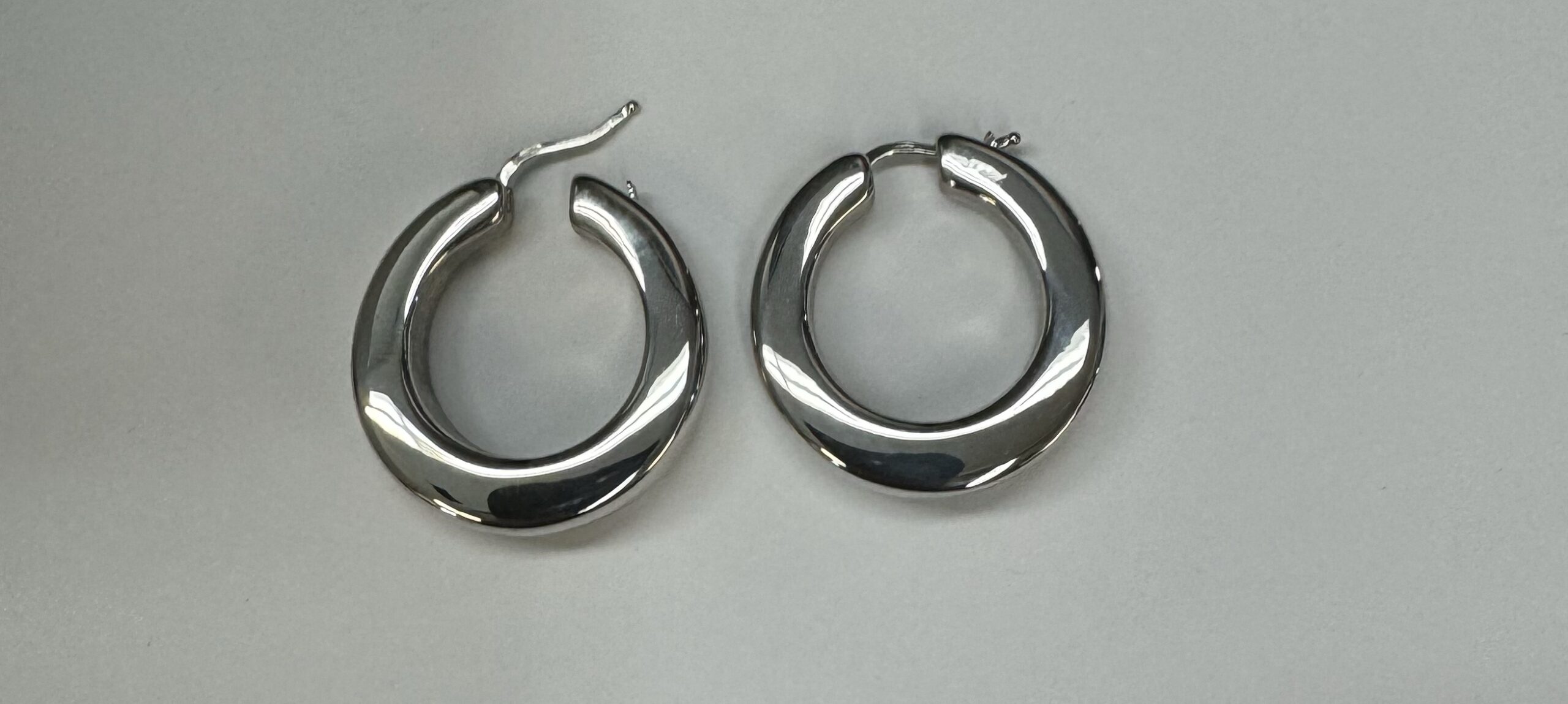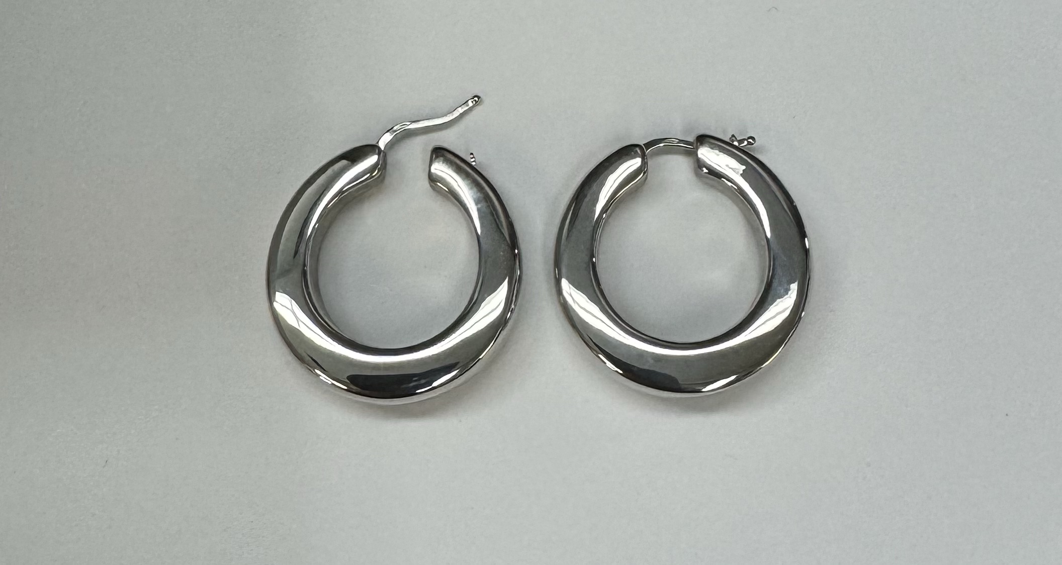 One-of-a-kind 18k white gold round hoop earrings with click, directly imported from Italy. These earrings measure approximately 30 x 9 mm in sized and they have an entire weight of 9.1 grams.