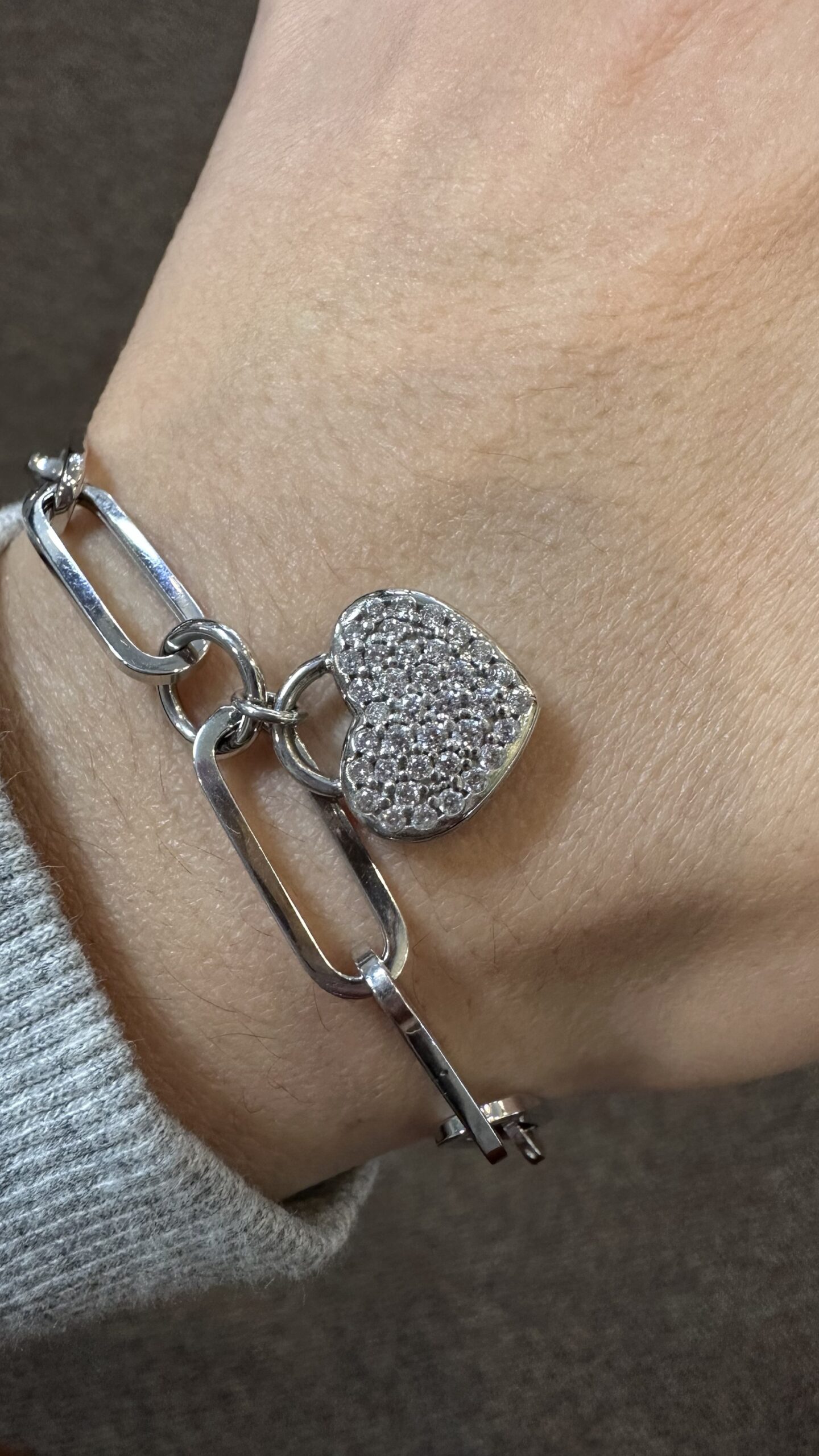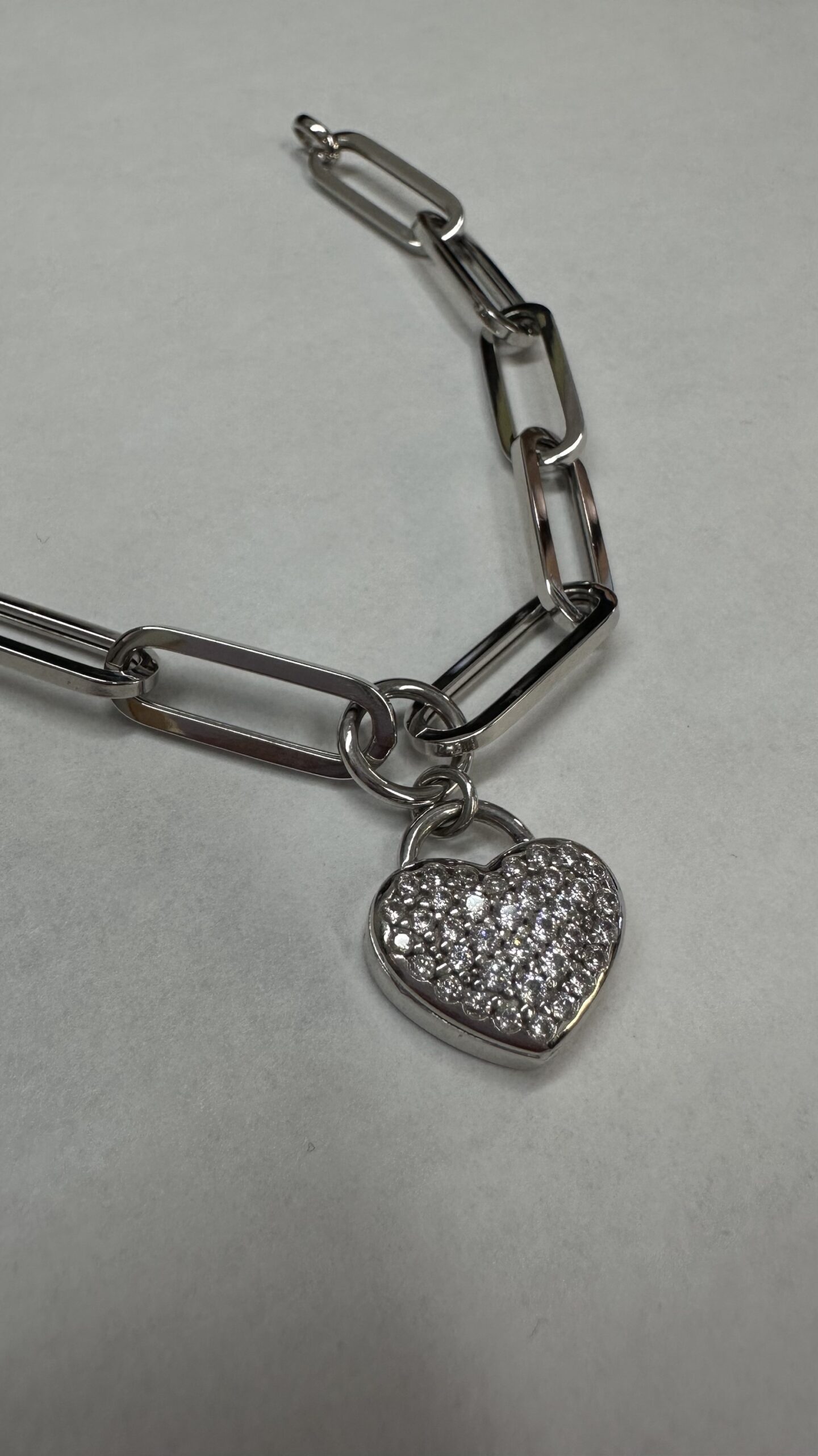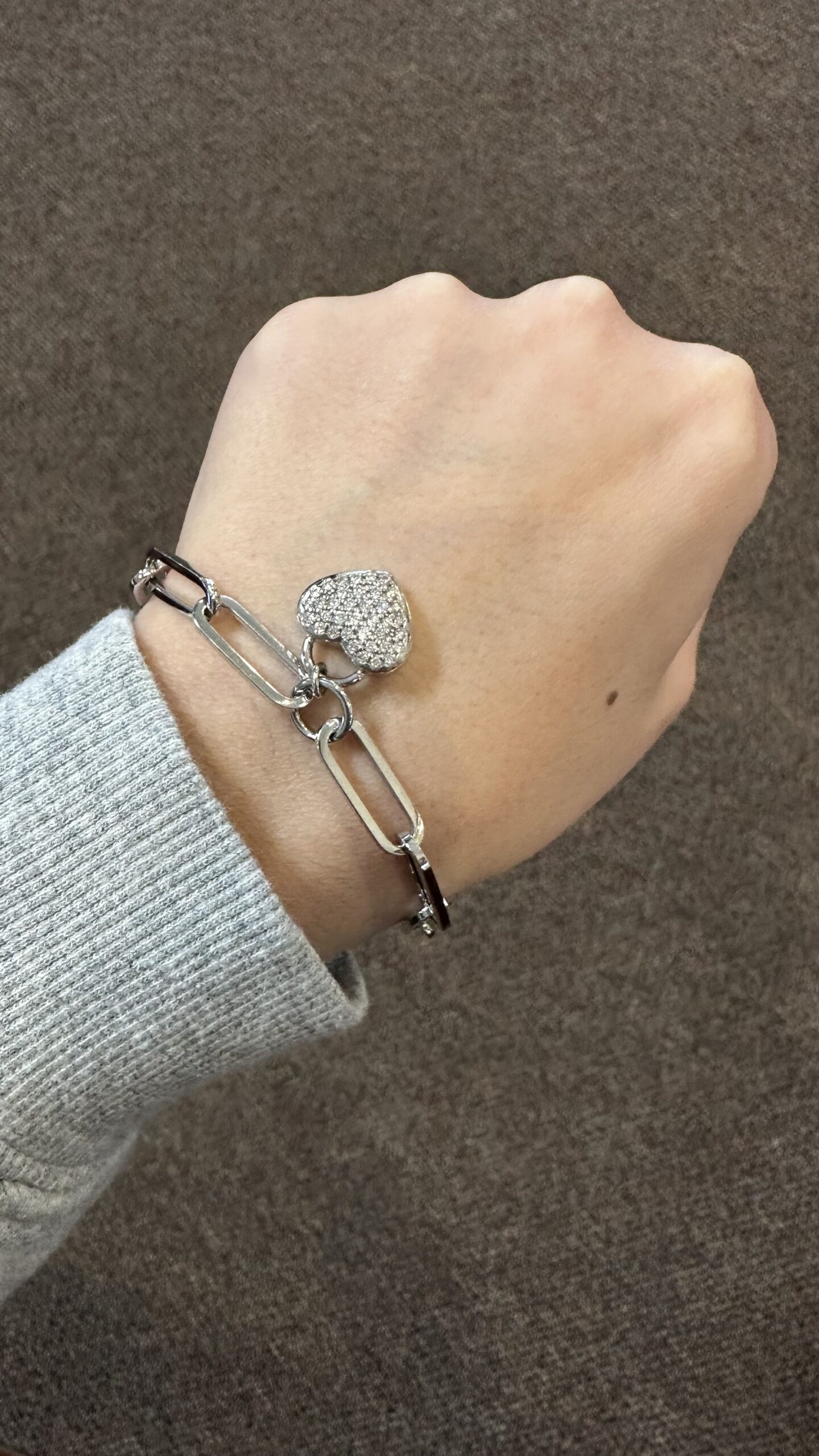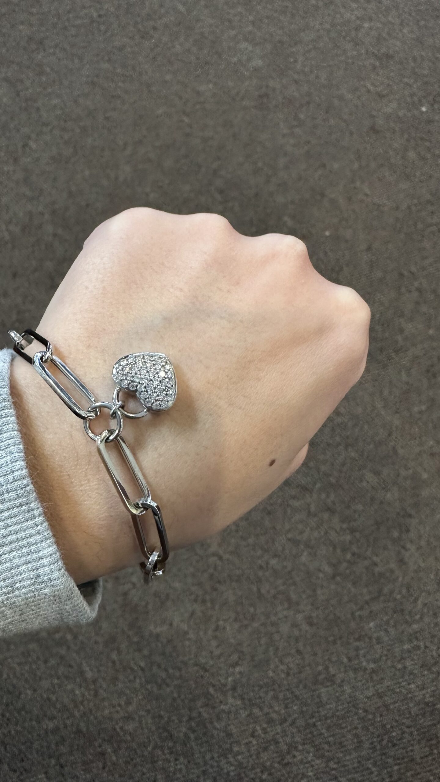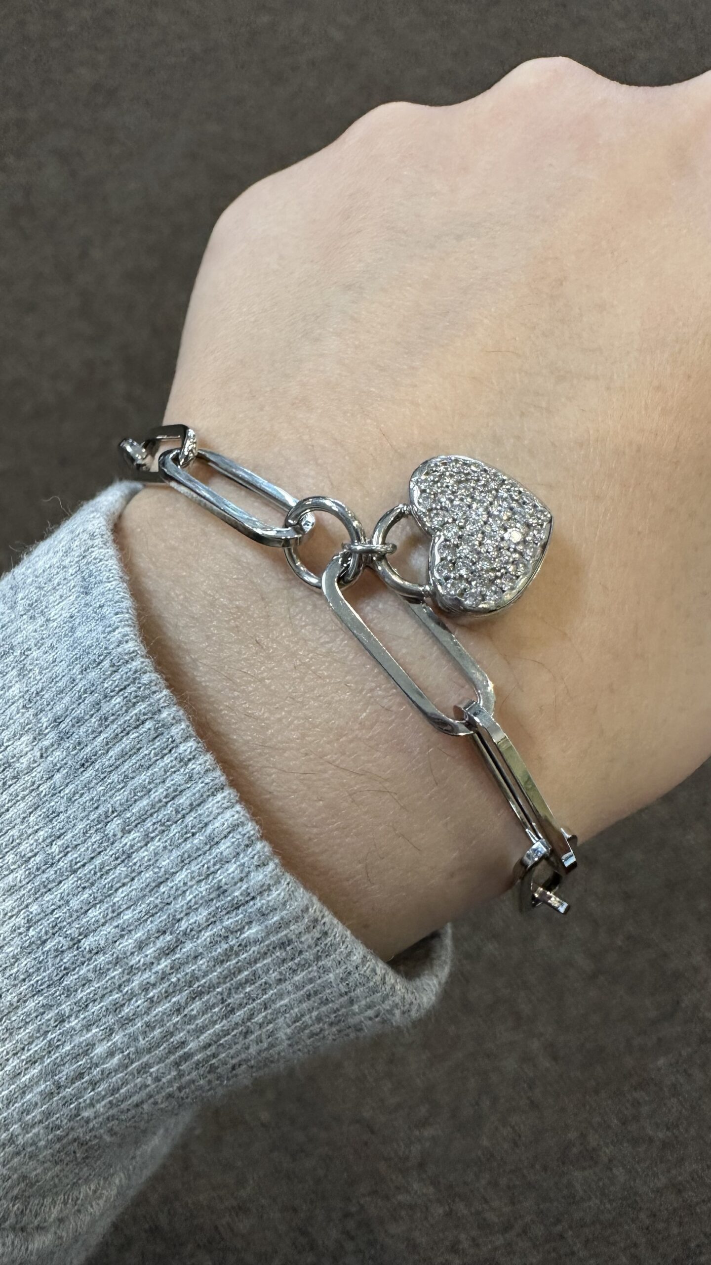 One-of-a-kind 18k white gold open oval link Paperclip style bracelet with CZ encrusted heart dangle, directly imported from Italy, 7 3/4”, 10.65 grams.