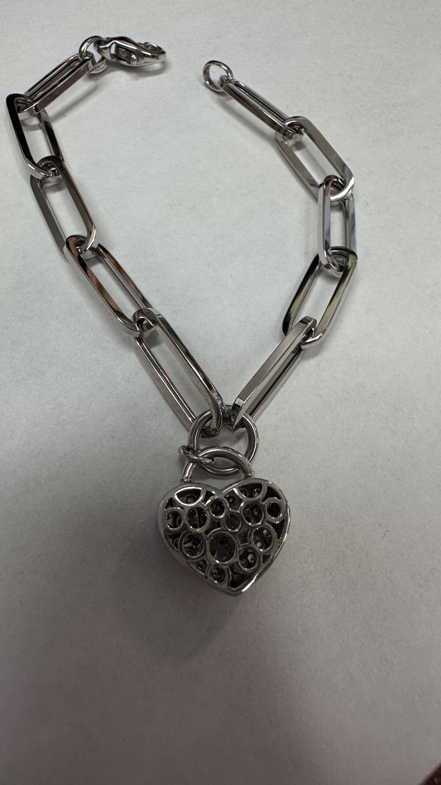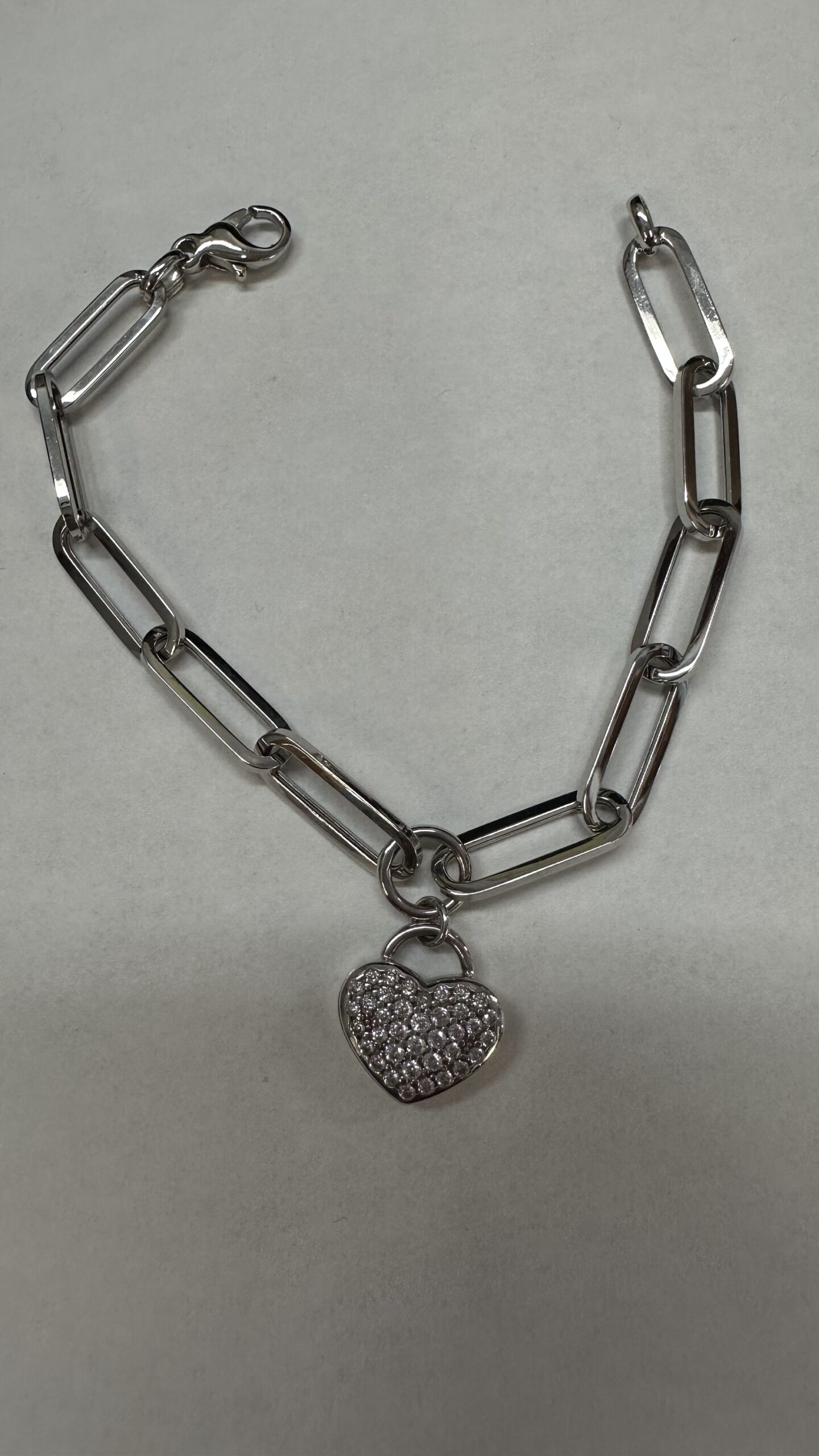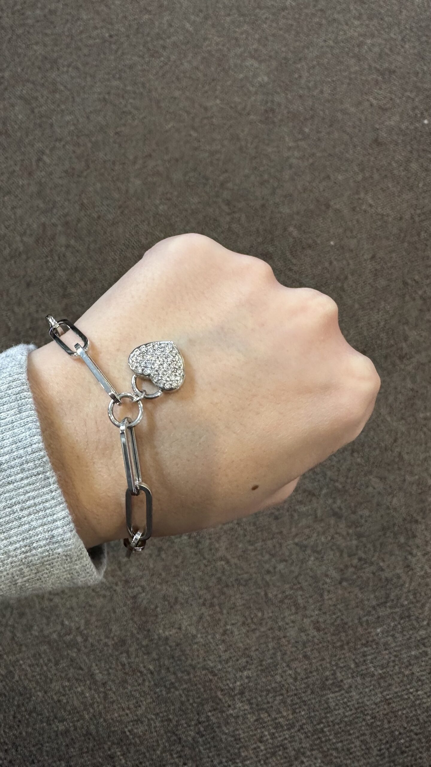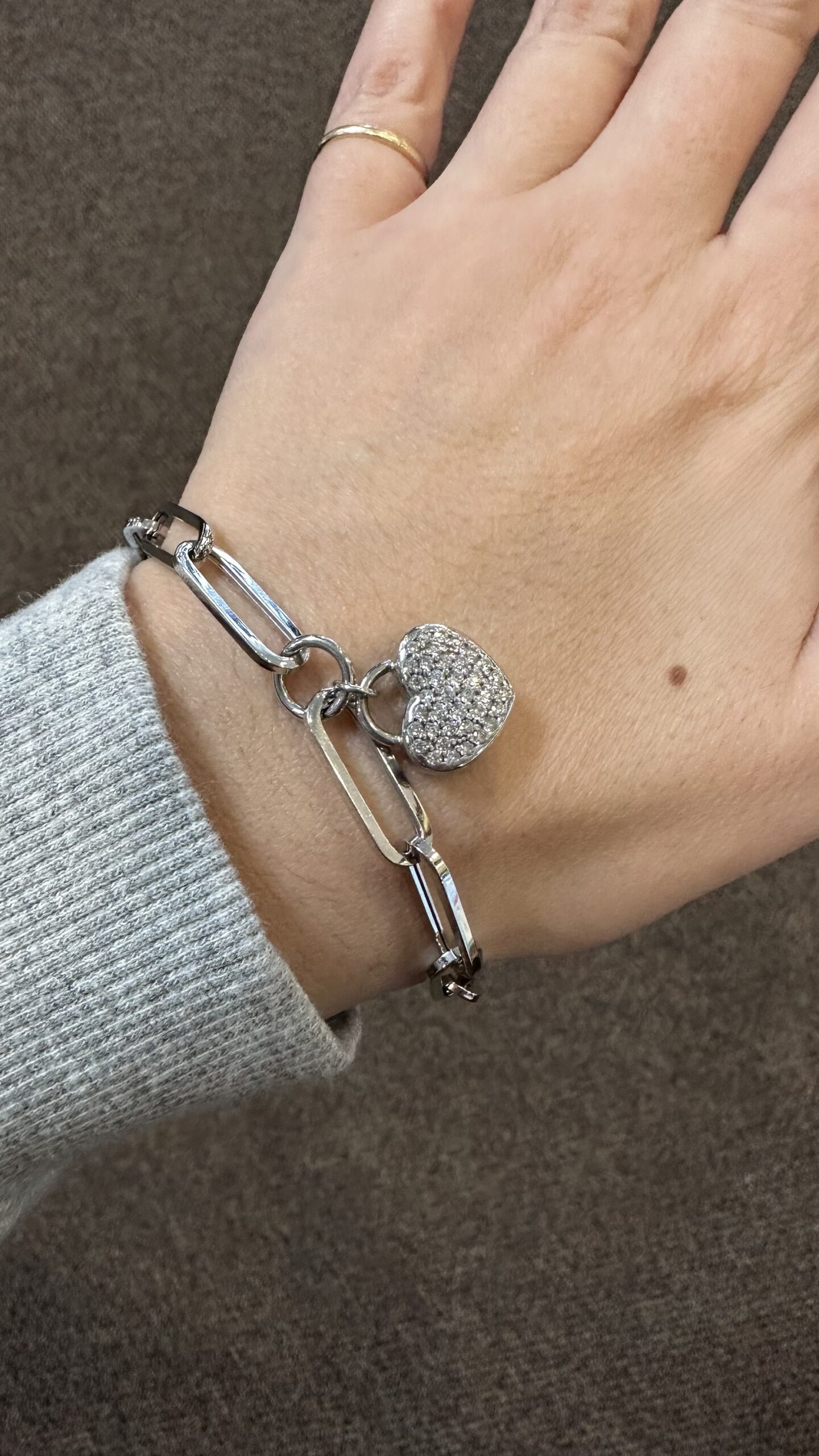One-of-a-kind 18k white gold open oval link Paperclip style bracelet with CZ encrusted heart dangle, directly imported from Italy, 7 3/4”, 10.65 grams.