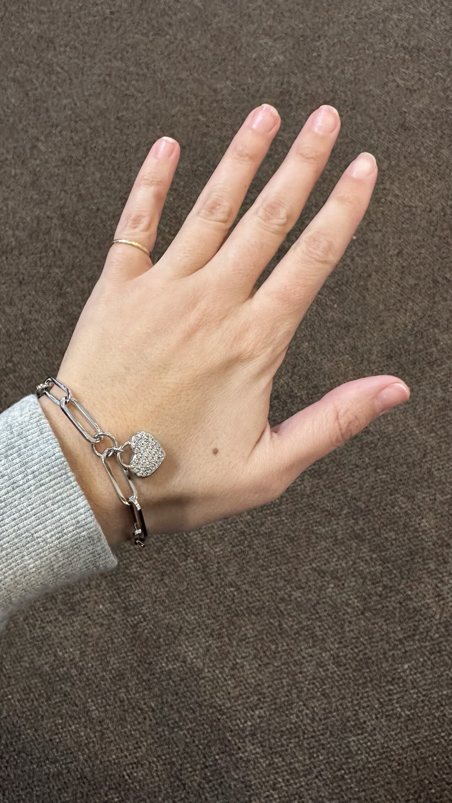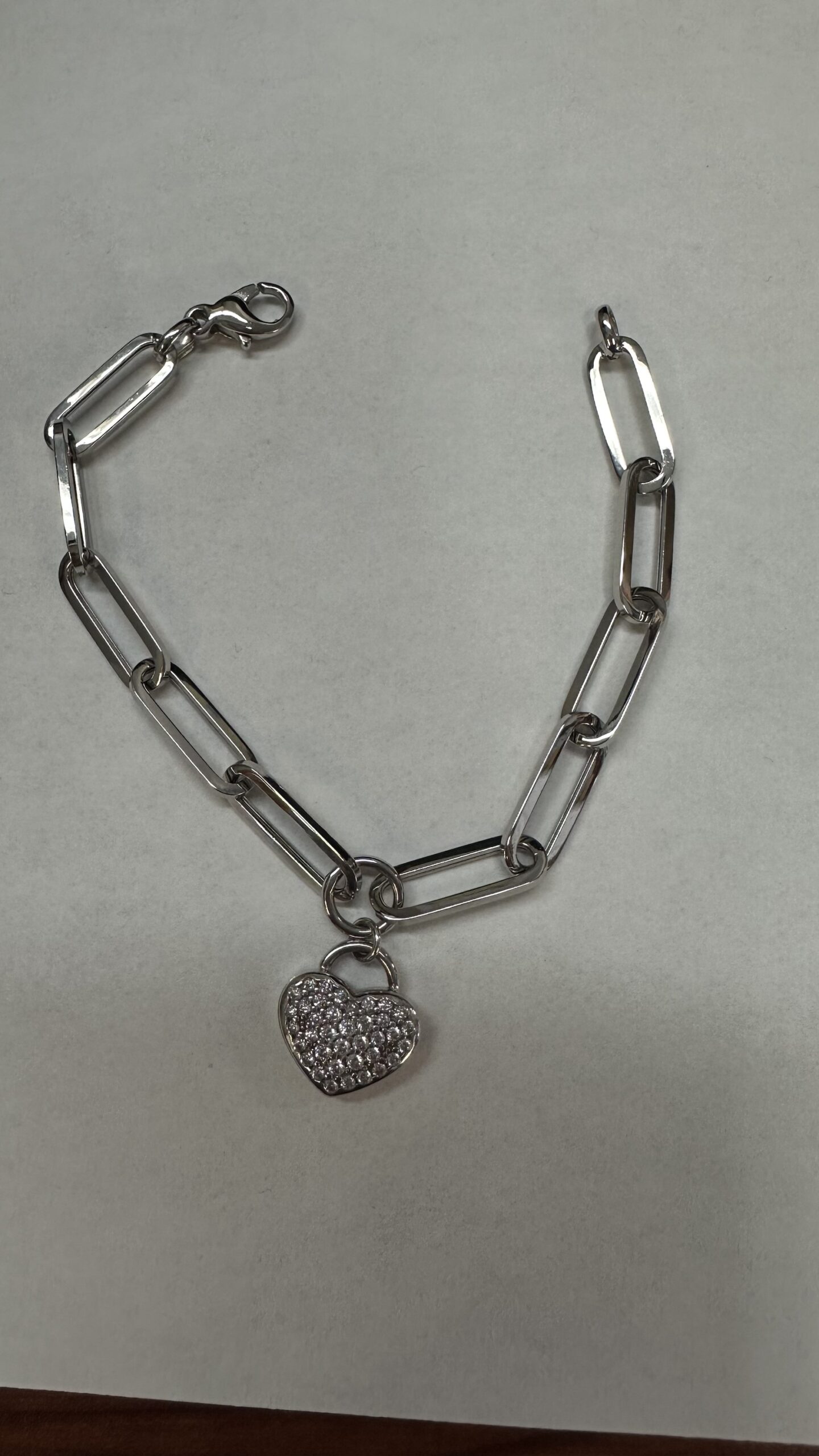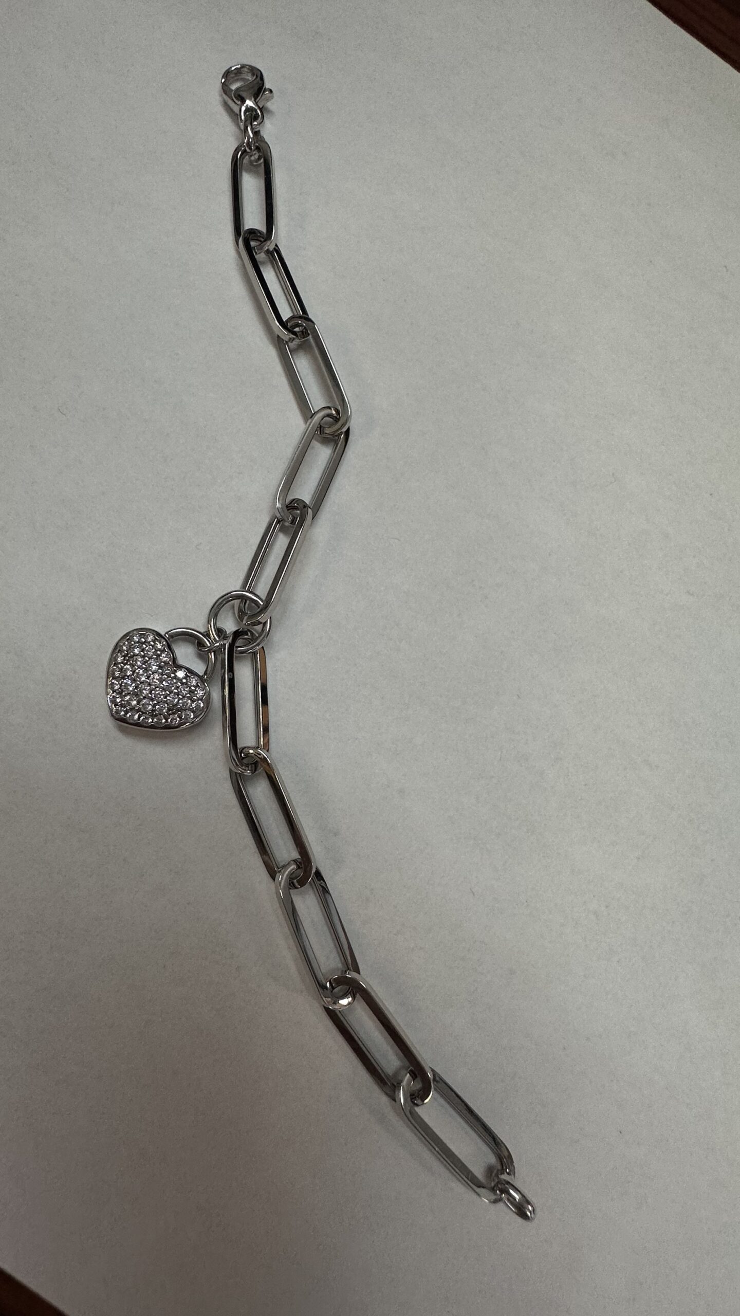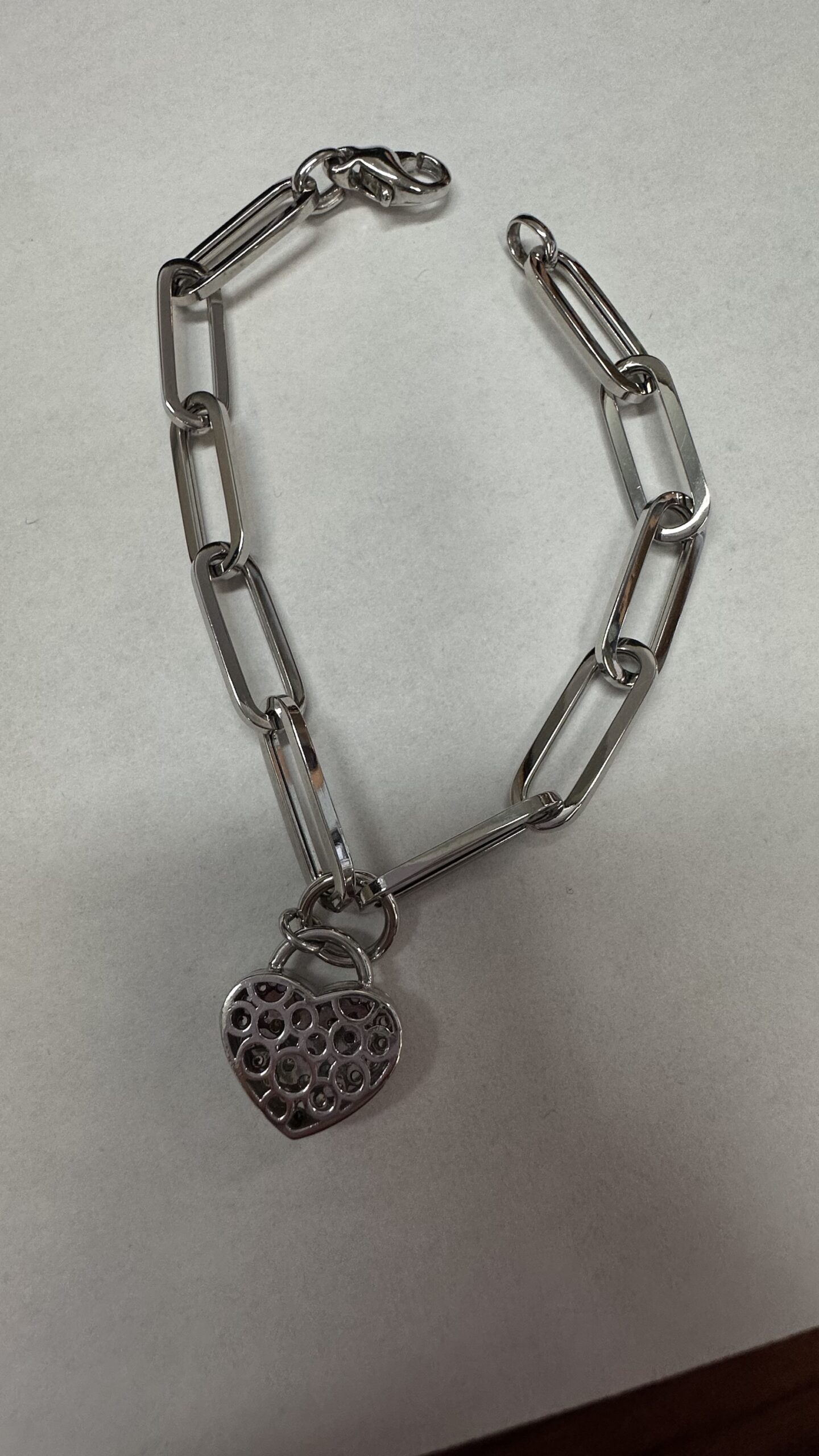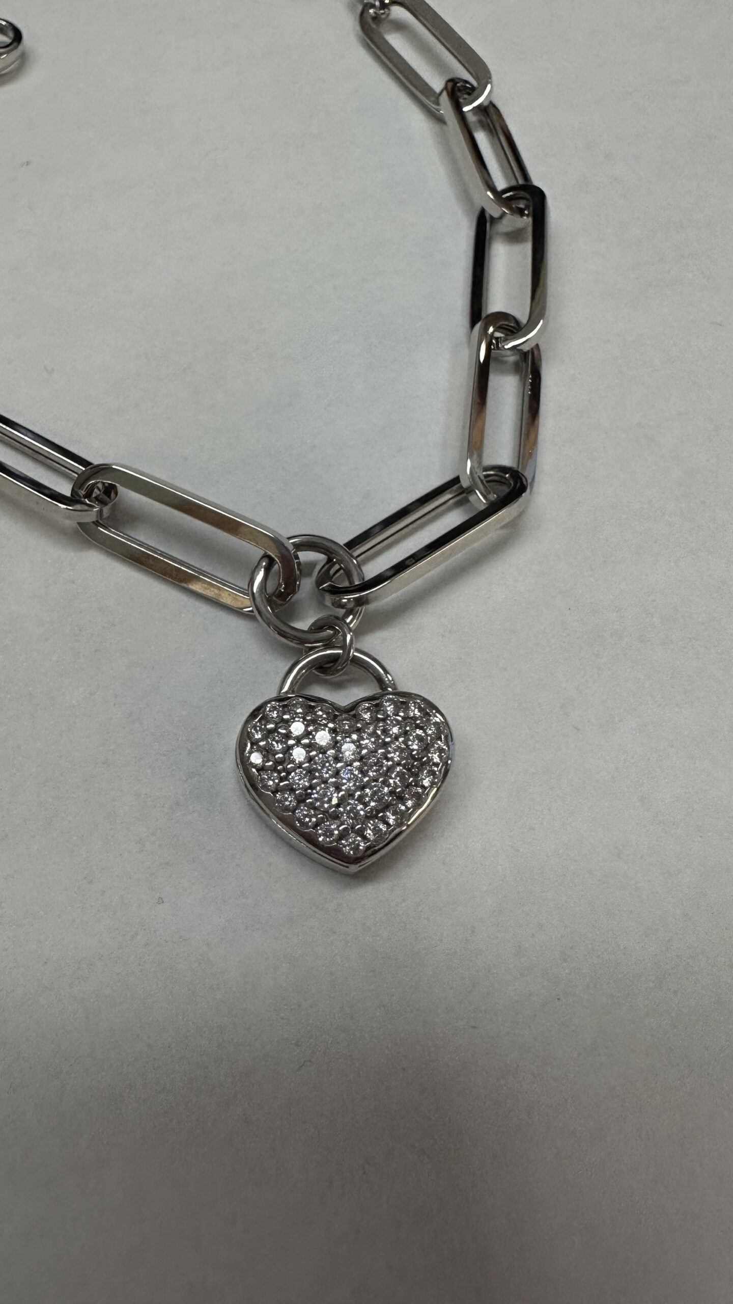 One-of-a-kind 18k white gold open oval link Paperclip style bracelet with CZ encrusted heart dangle, directly imported from Italy, 7 3/4”, 10.65 grams.