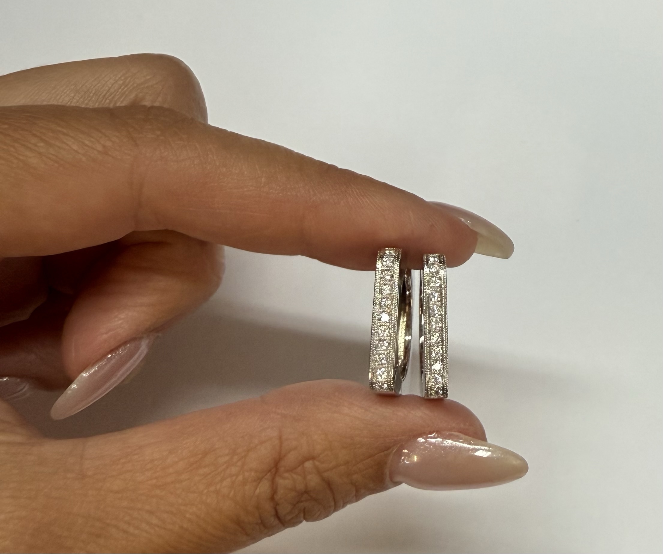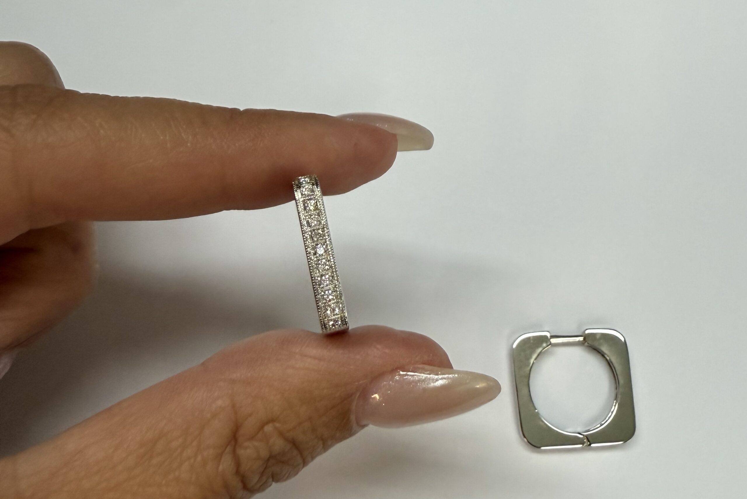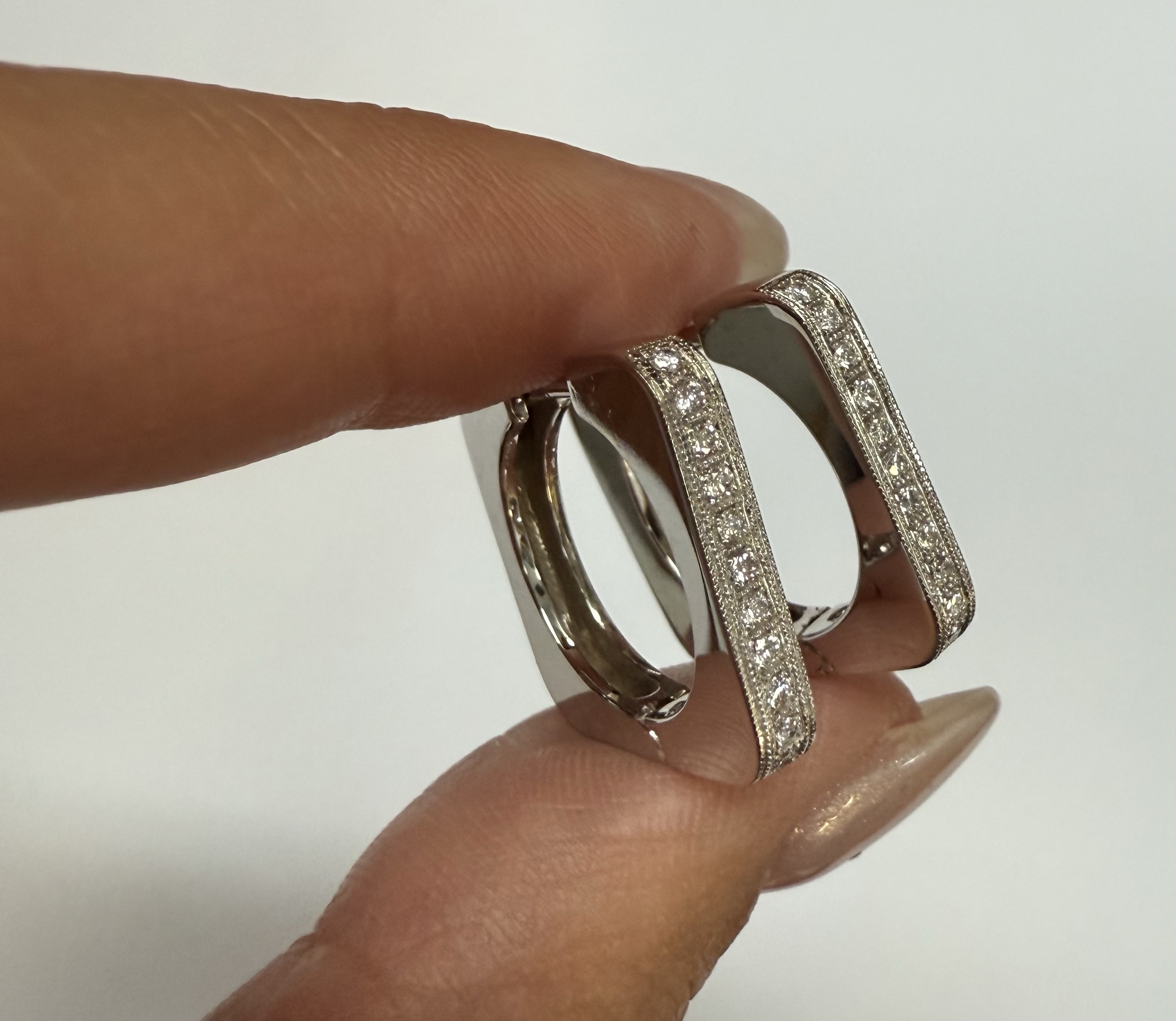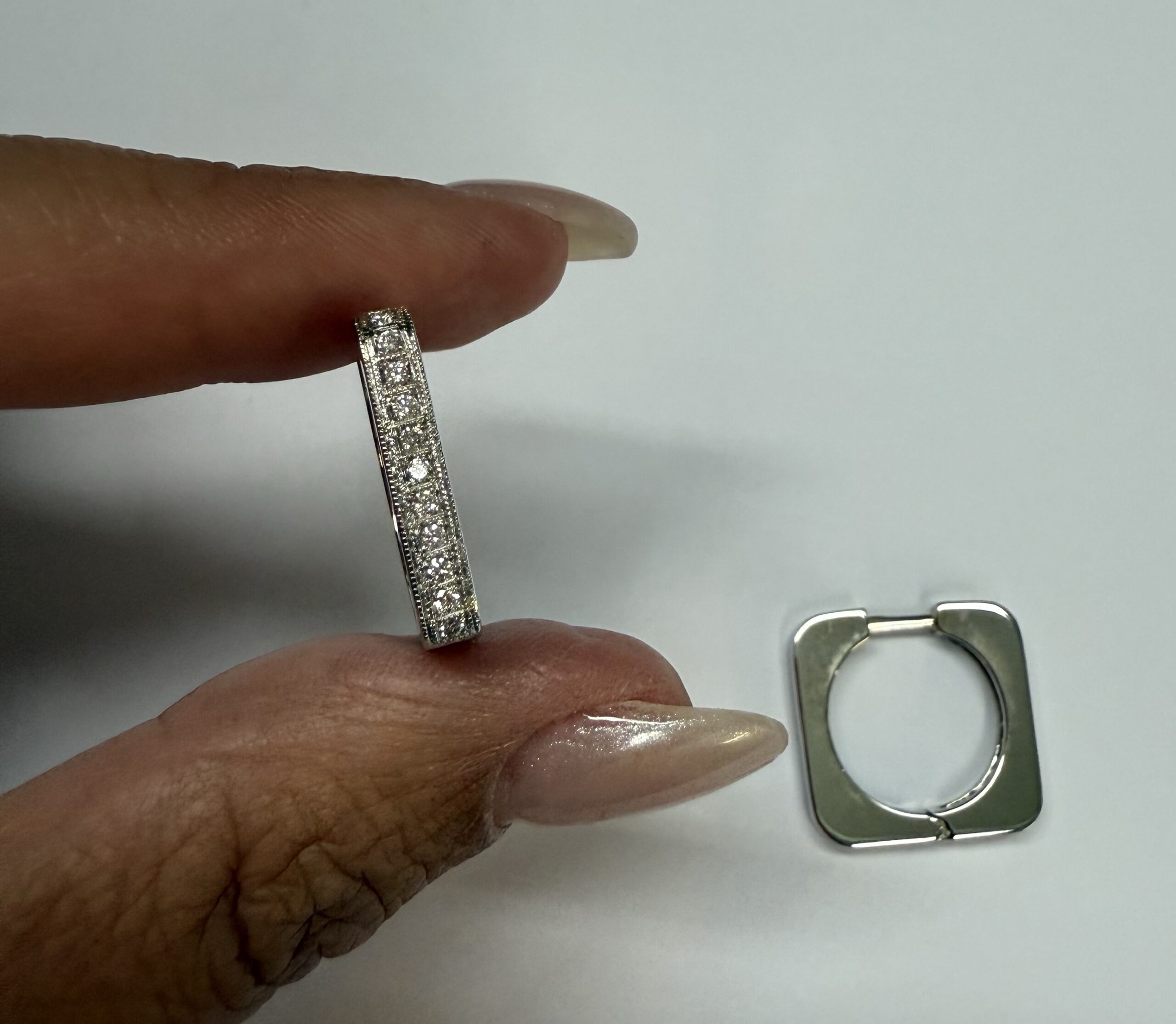 18k white gold square shaped genuine 22 stone (11 each earring) .45 cttw Round Brilliant Cut diamond pave’ hoop earrings. These diamonds average G-H in color, and VS2 in clarity. These earrings have an entire weight of 7.05 grams.