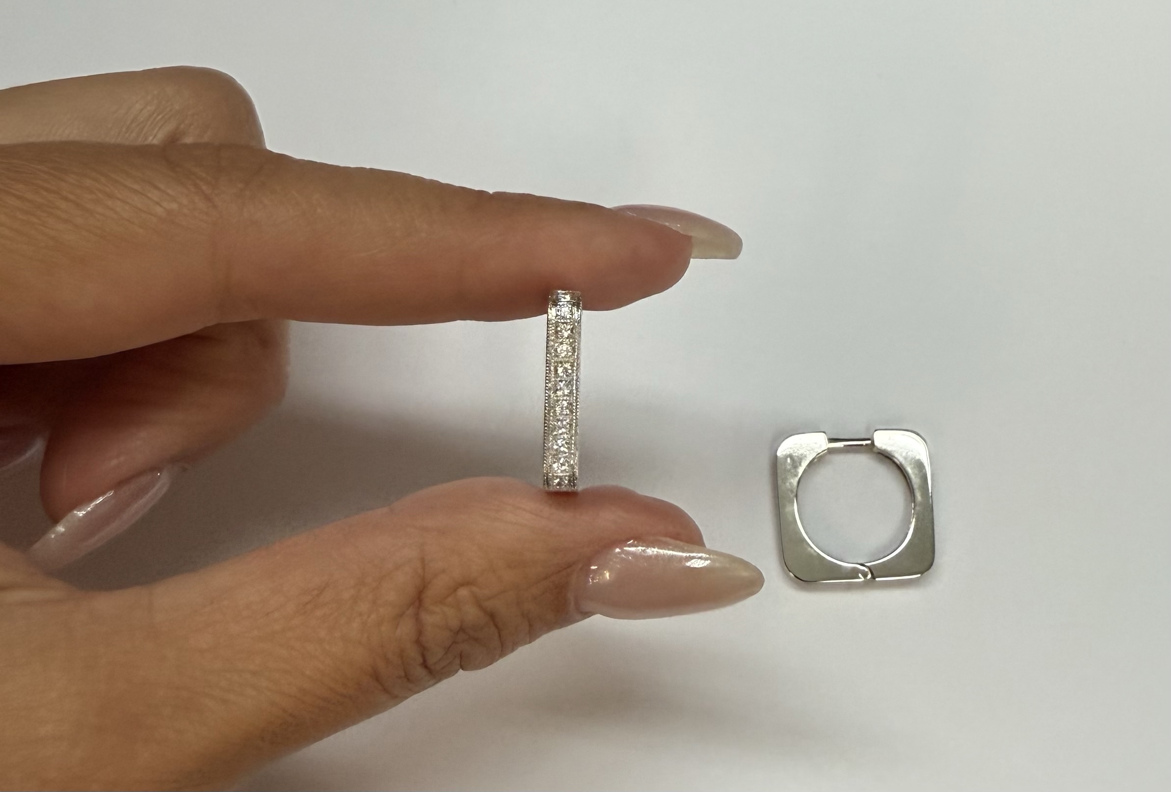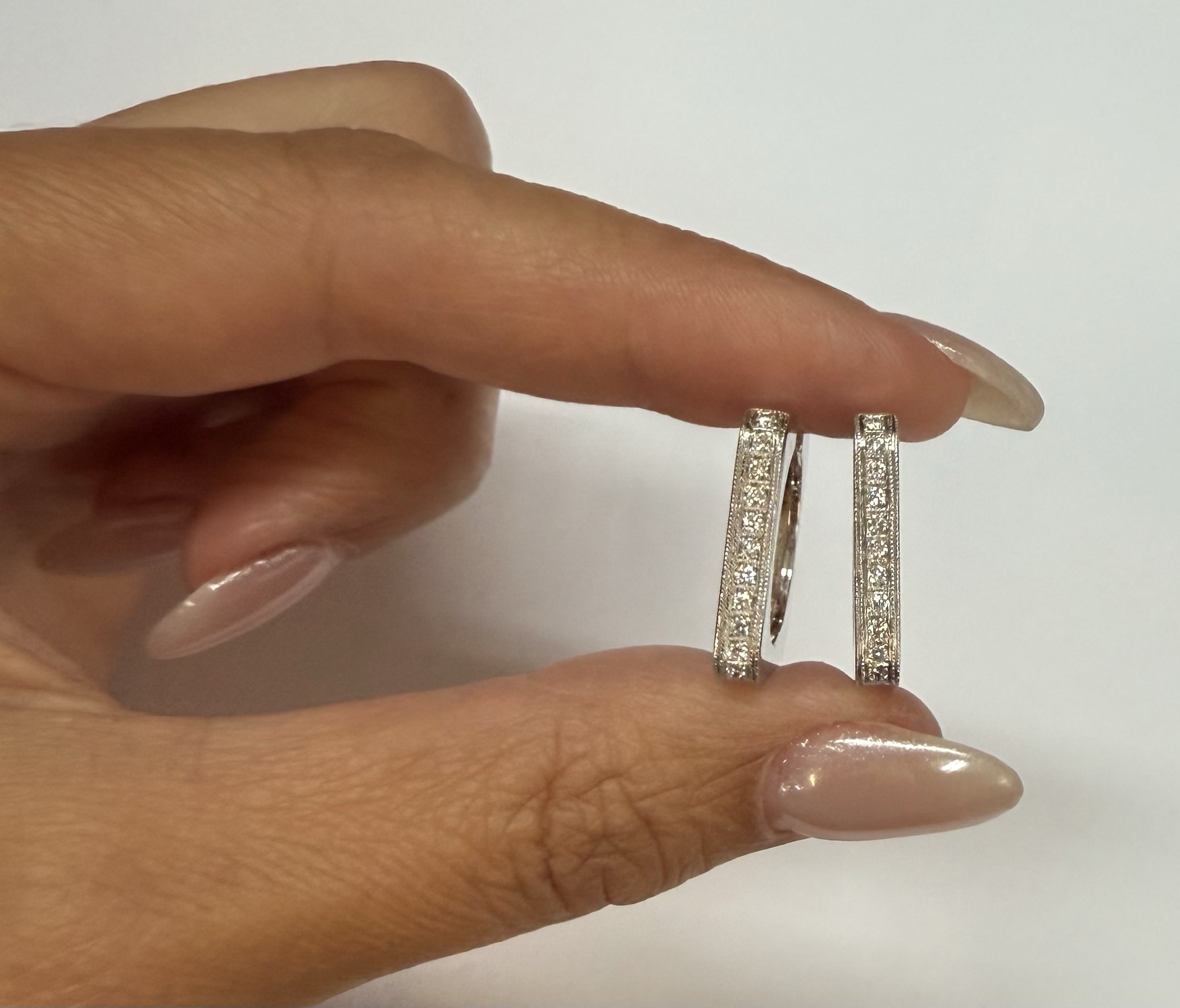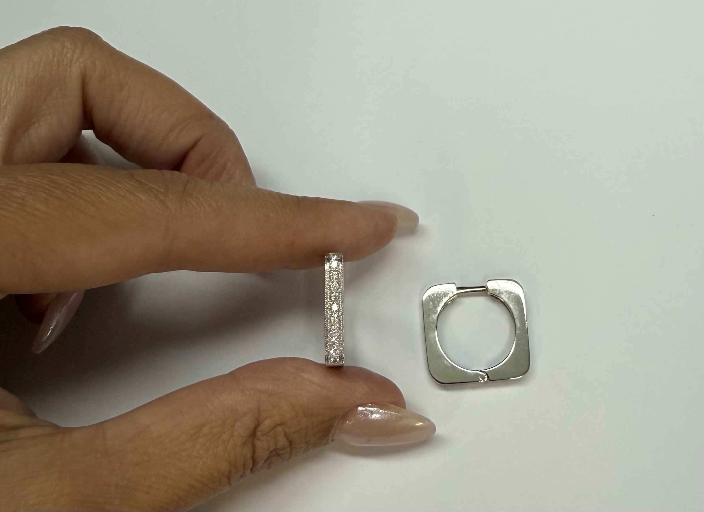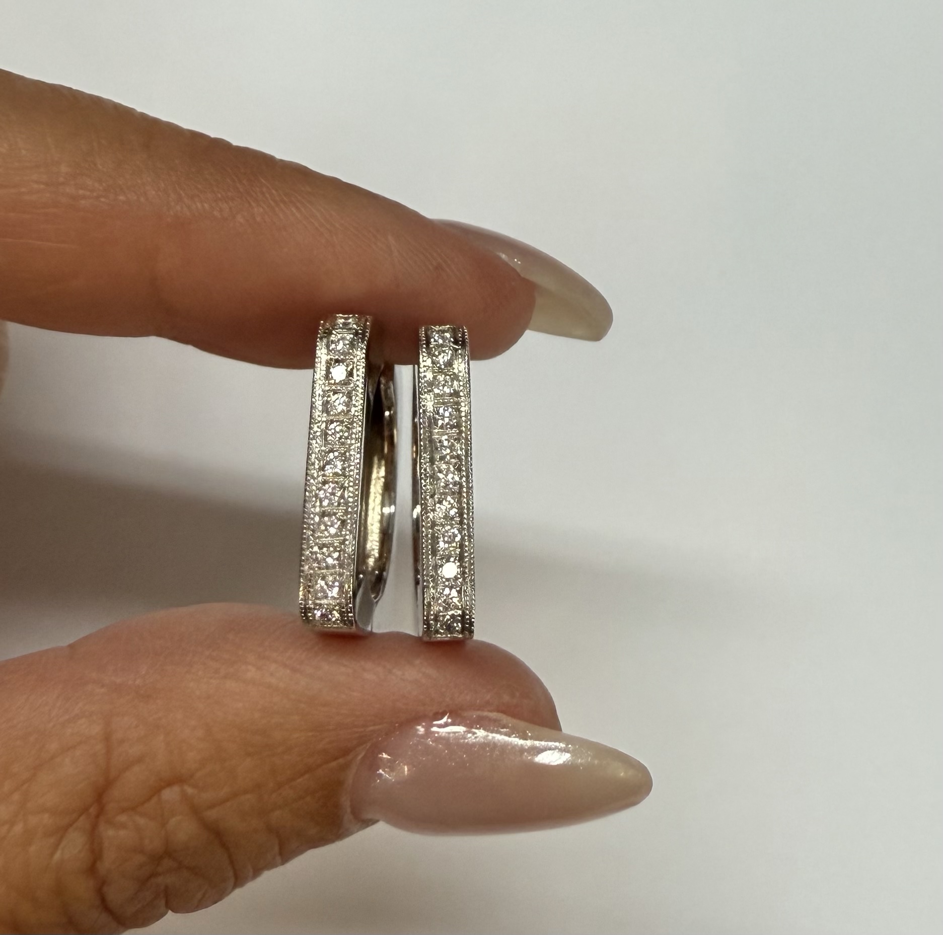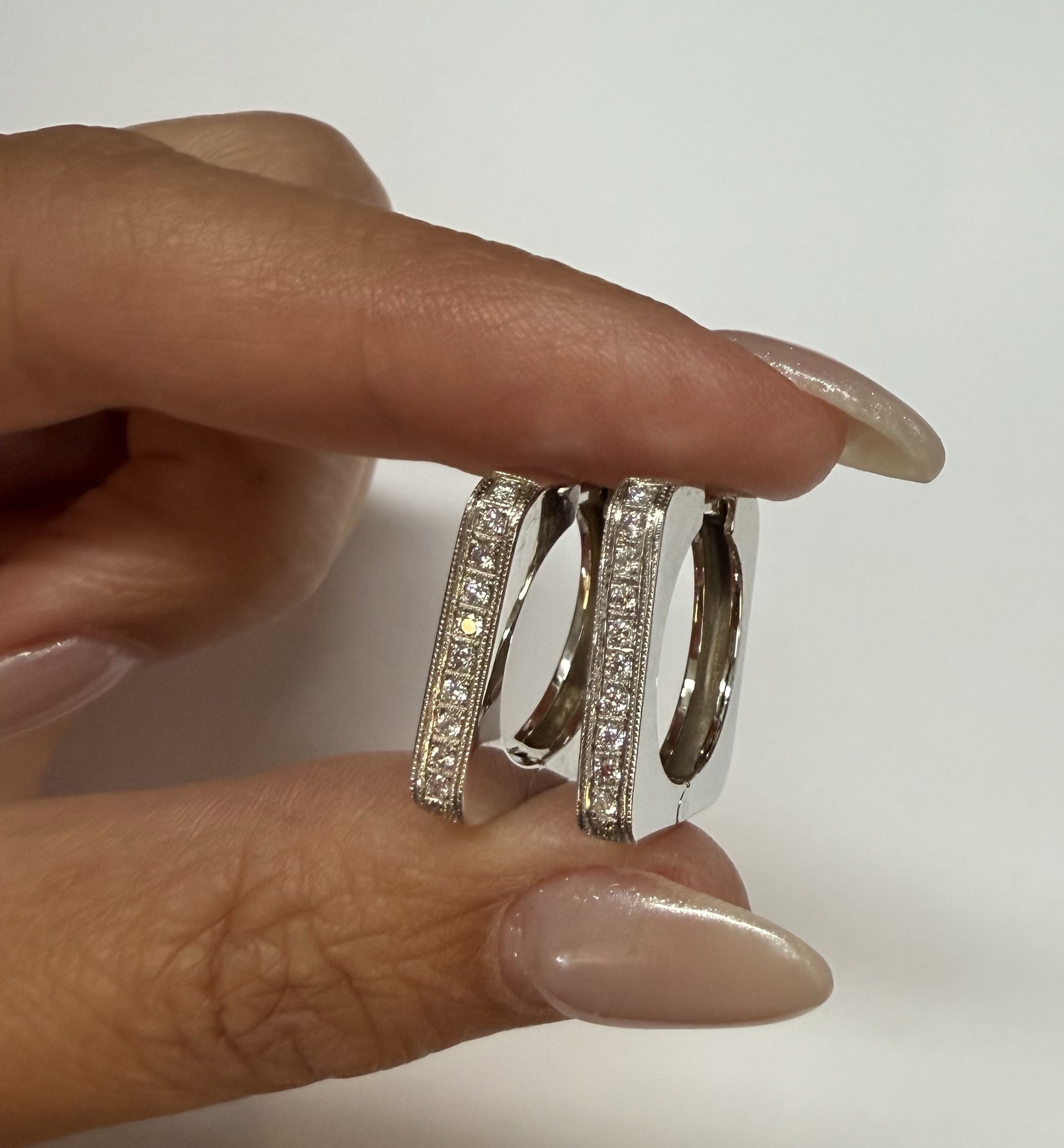 18k white gold square shaped genuine 22 stone (11 each earring) .45 cttw Round Brilliant Cut diamond pave’ hoop earrings. These diamonds average G-H in color, and VS2 in clarity. These earrings have an entire weight of 7.05 grams.