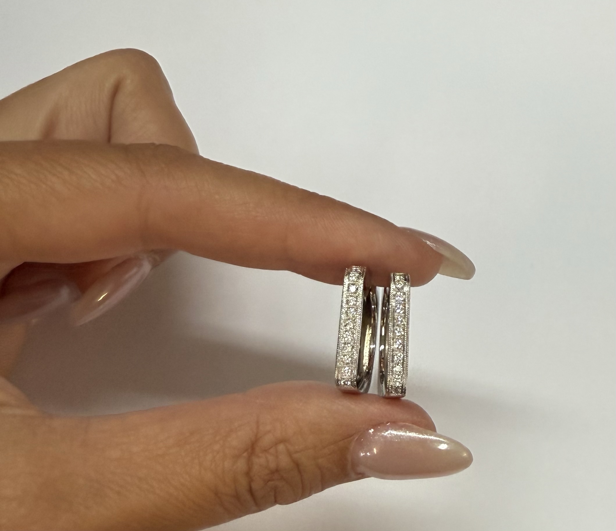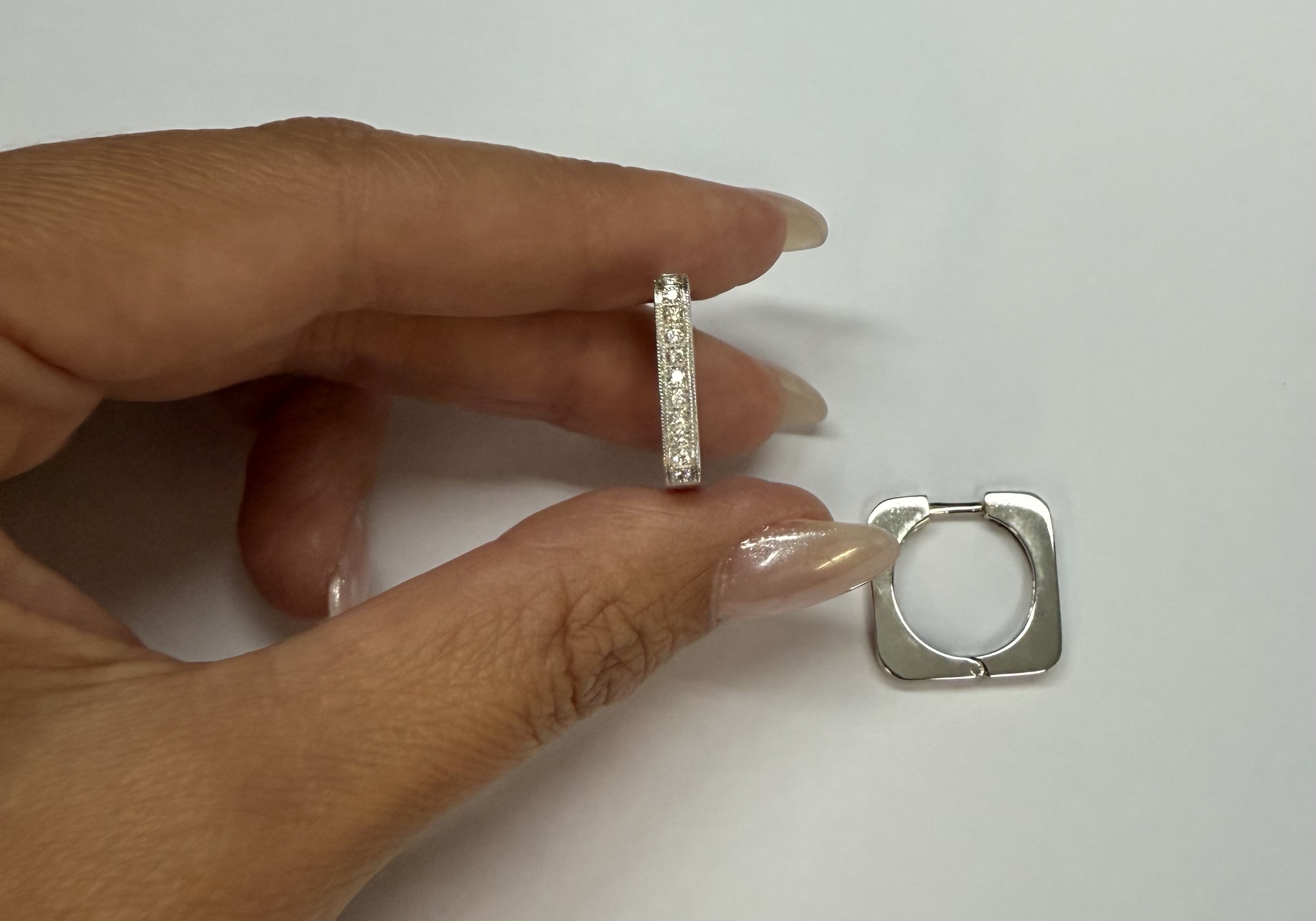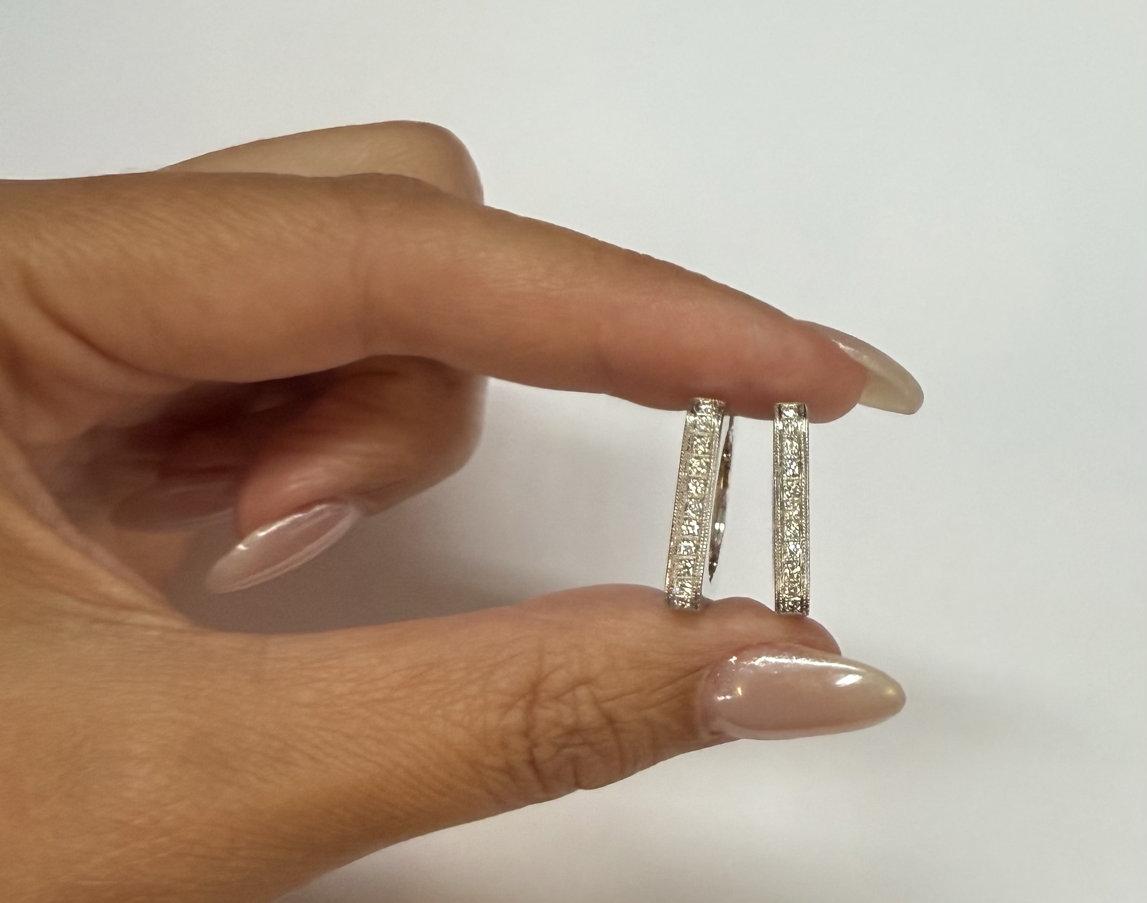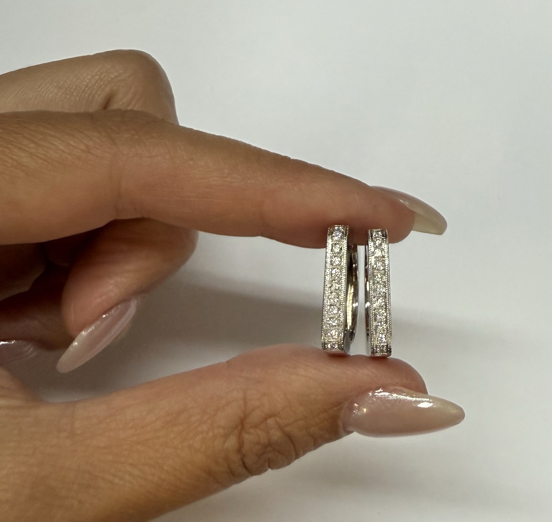 18k white gold square shaped genuine 22 stone (11 each earring) .45 cttw Round Brilliant Cut diamond pave’ hoop earrings. These diamonds average G-H in color, and VS2 in clarity. These earrings have an entire weight of 7.05 grams.