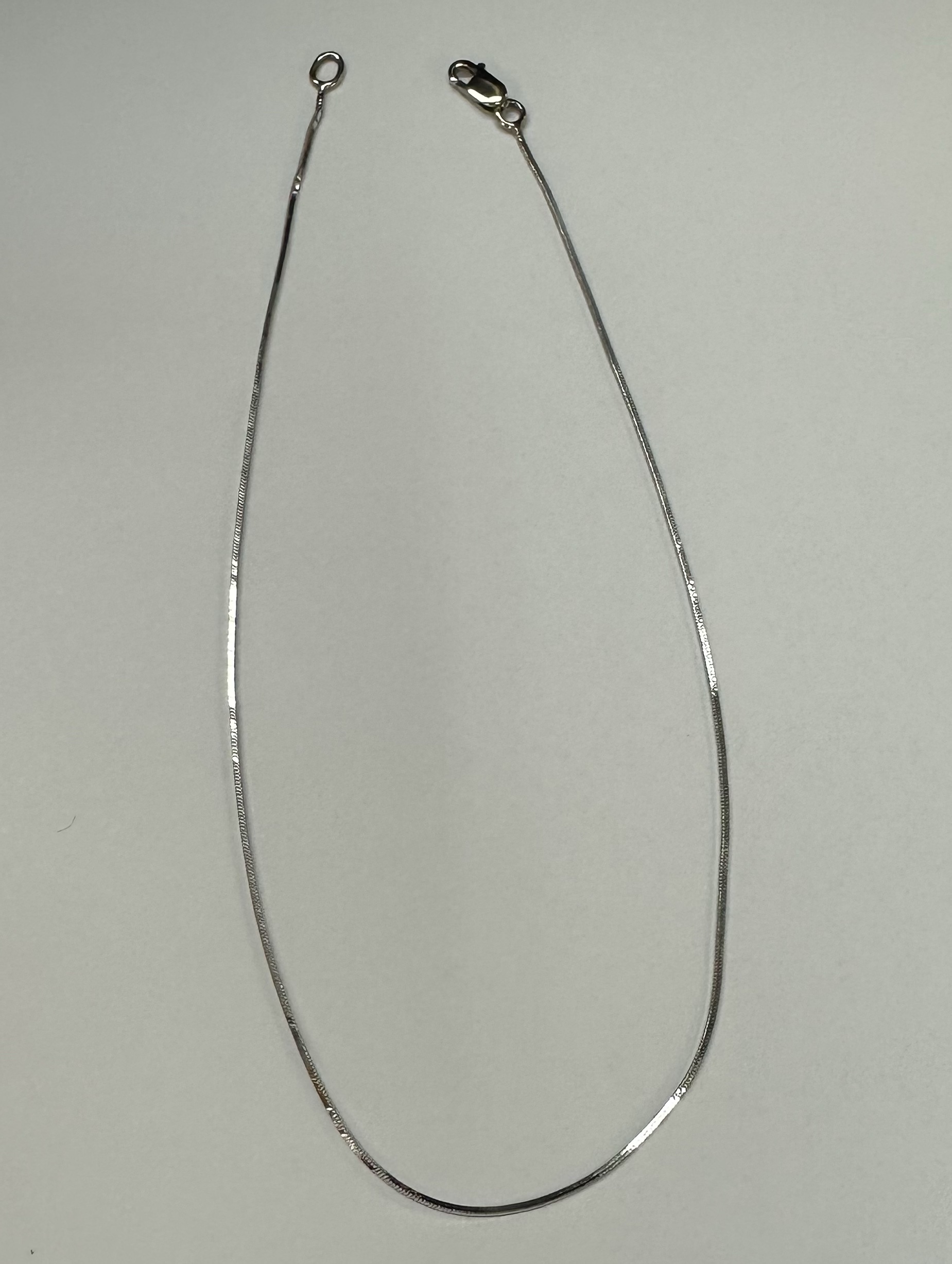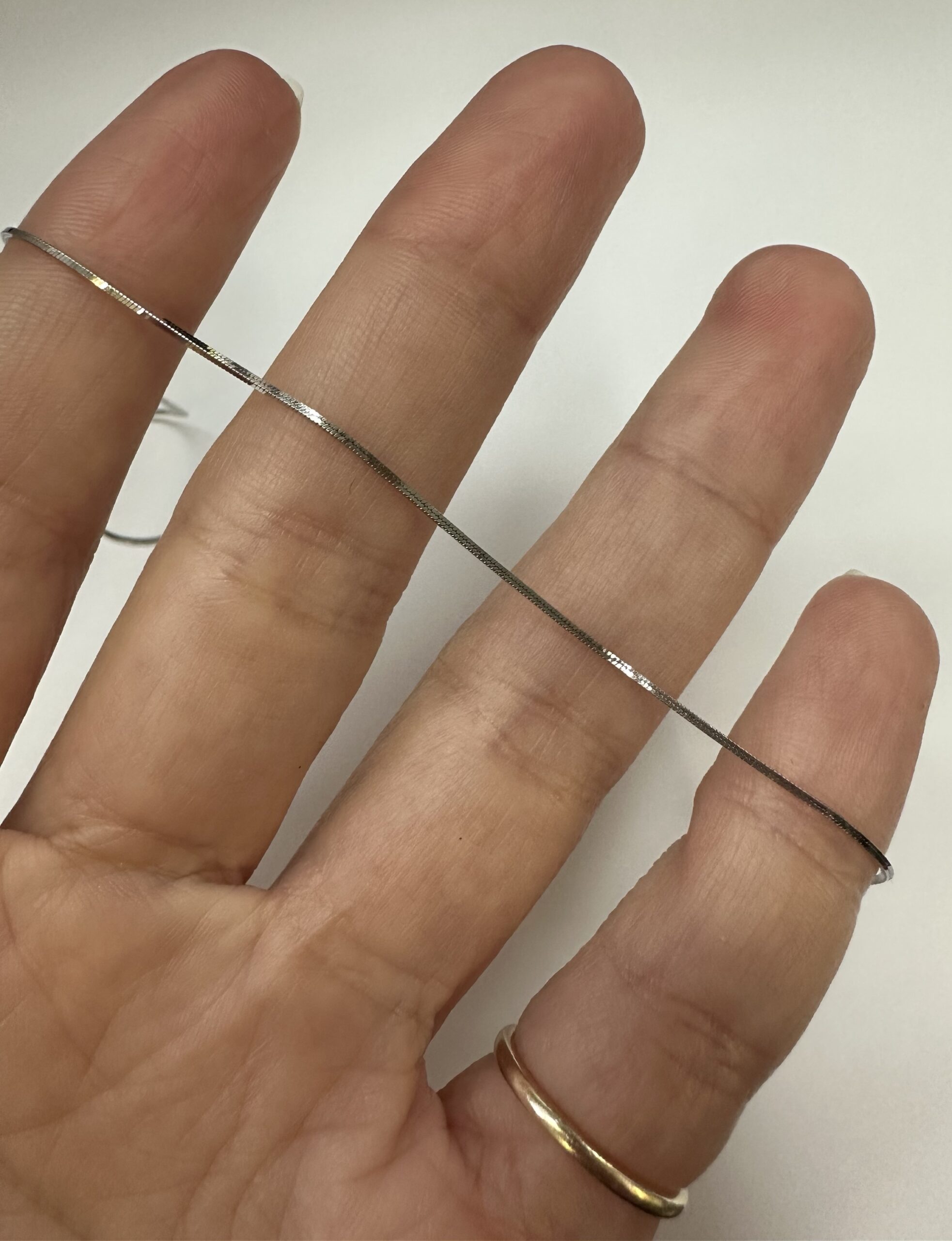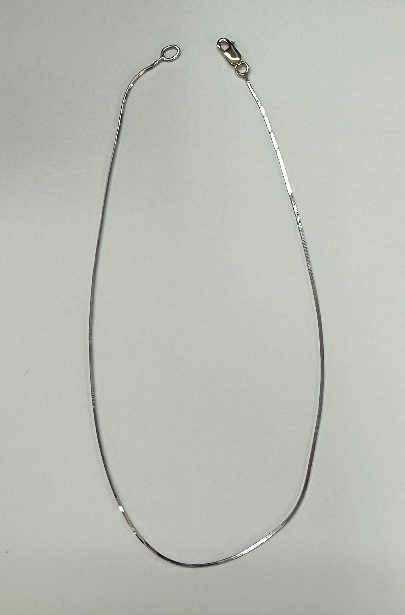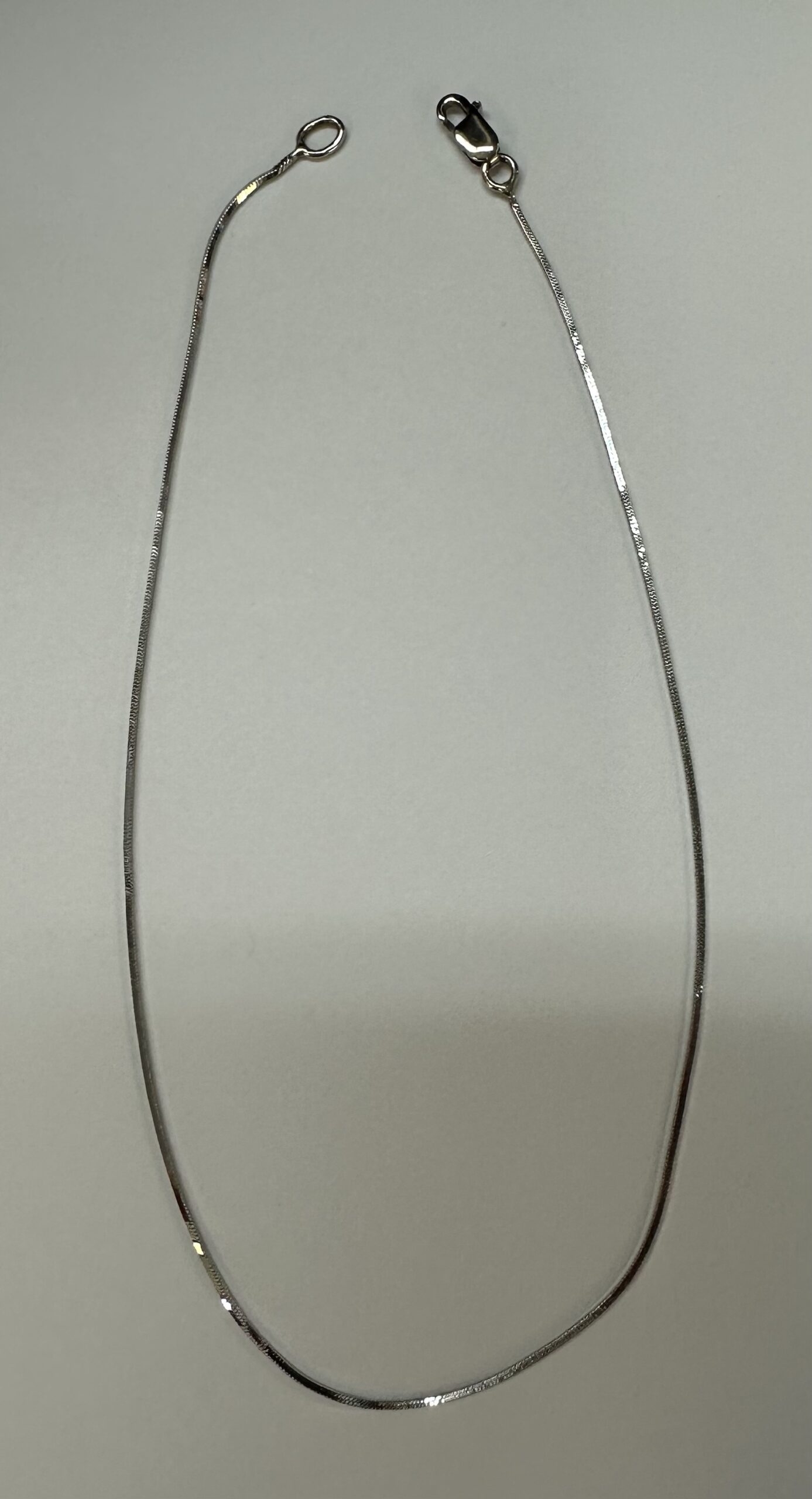 One-of-a-kind 18k white gold 10 1/4” square snake chain anklet with lobster claw clasp, directly imported from Italy. This anklet measures .5 mm in width, and it has an entire weight of 1.9 grams.