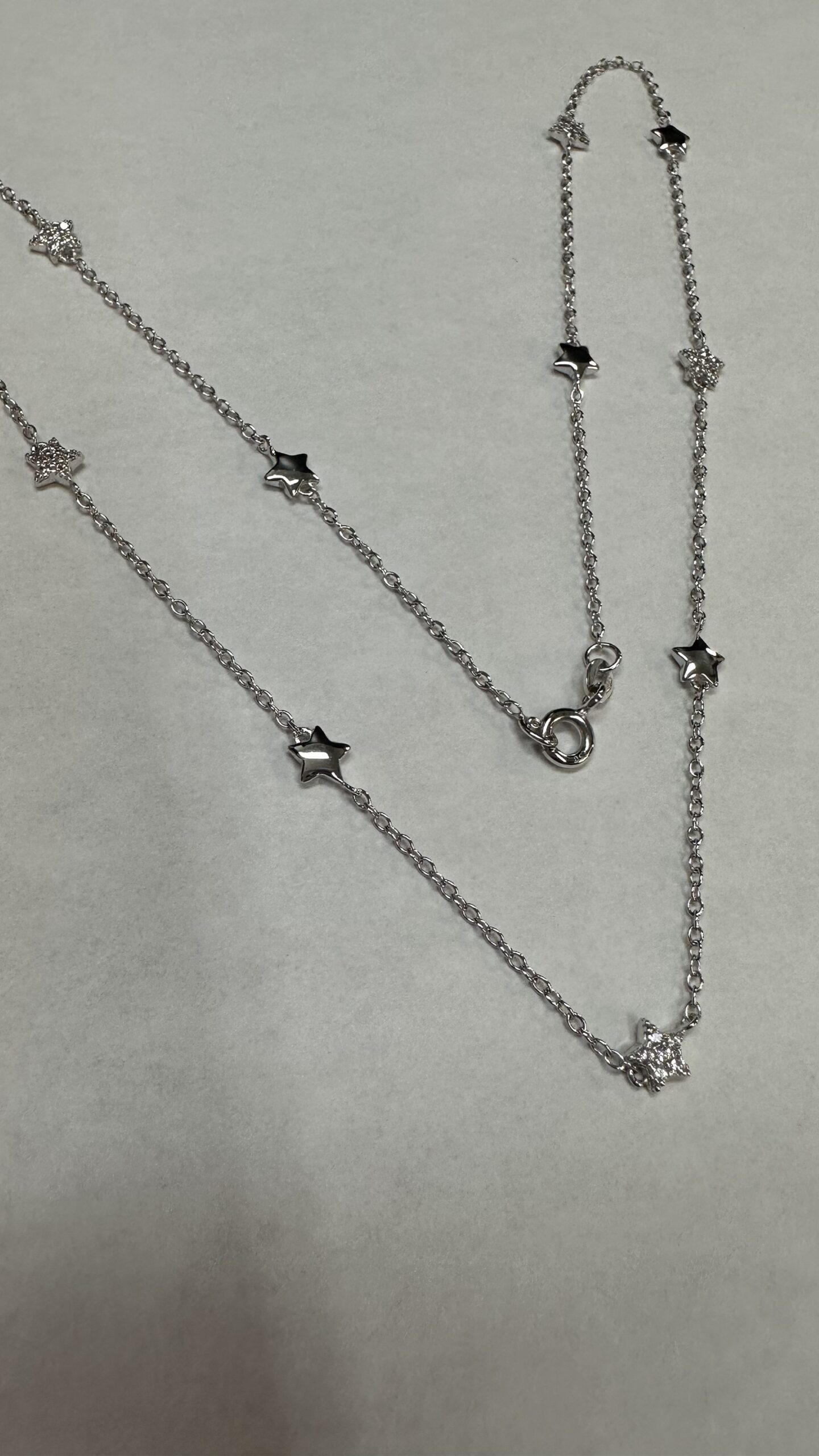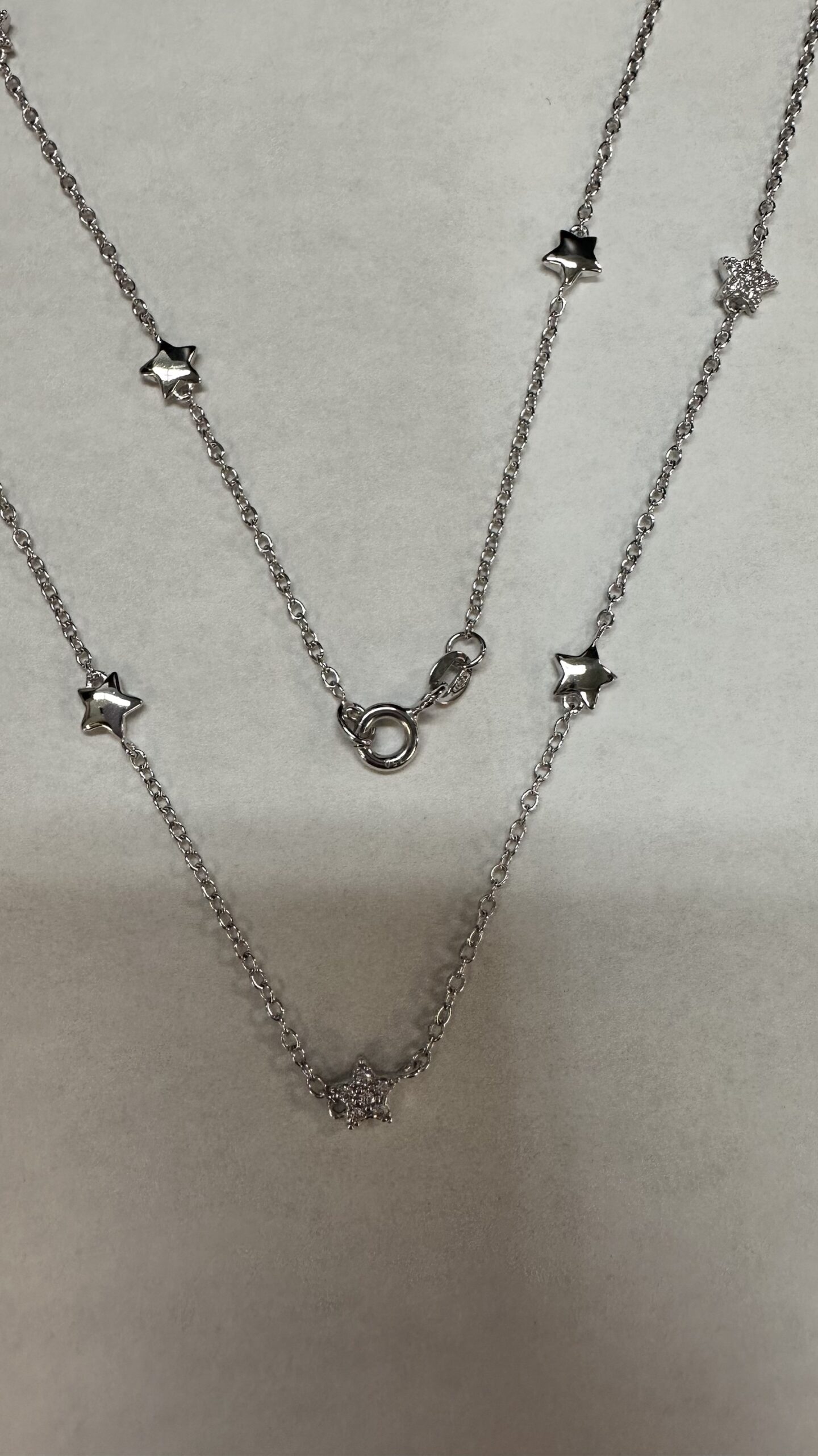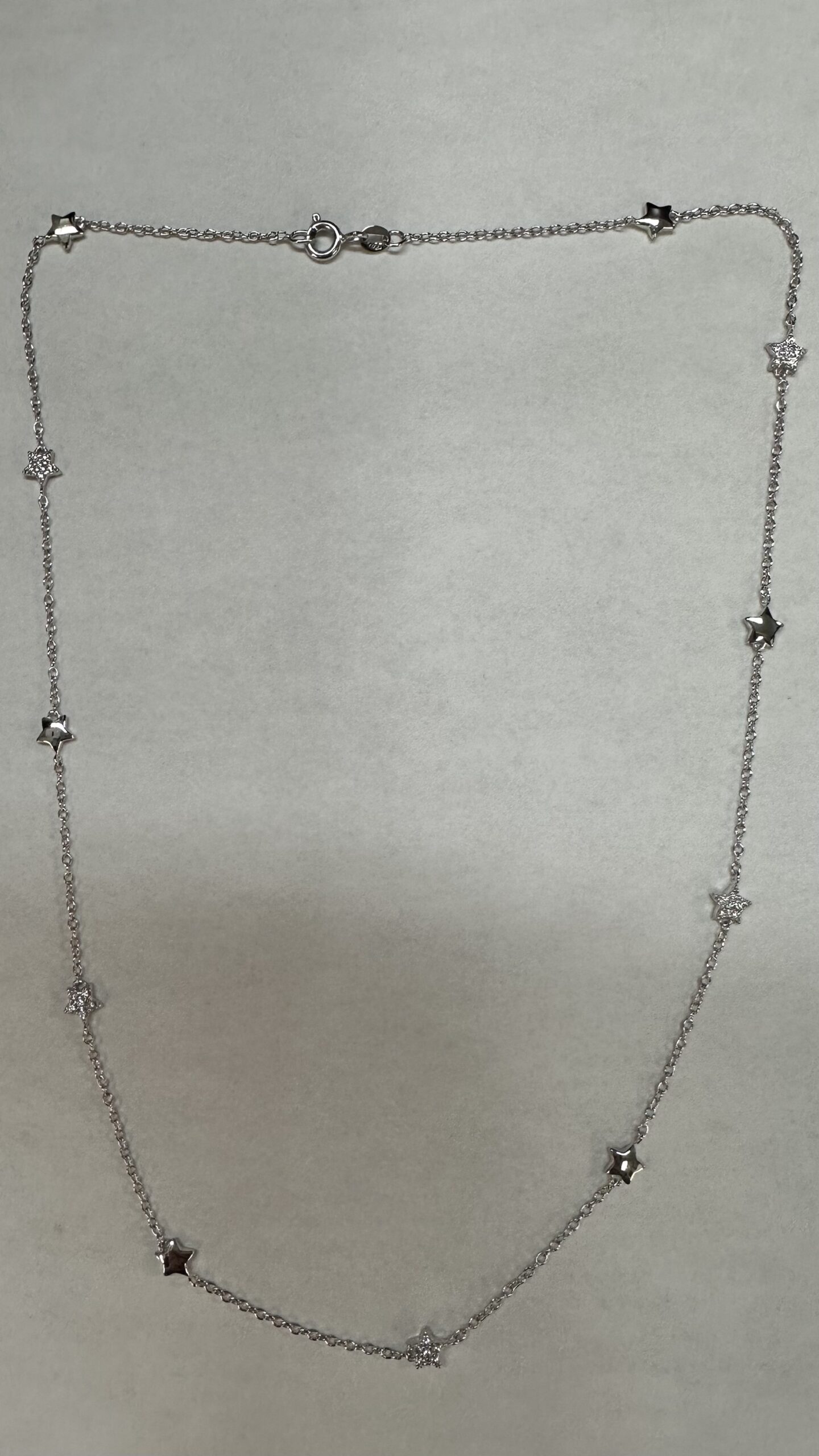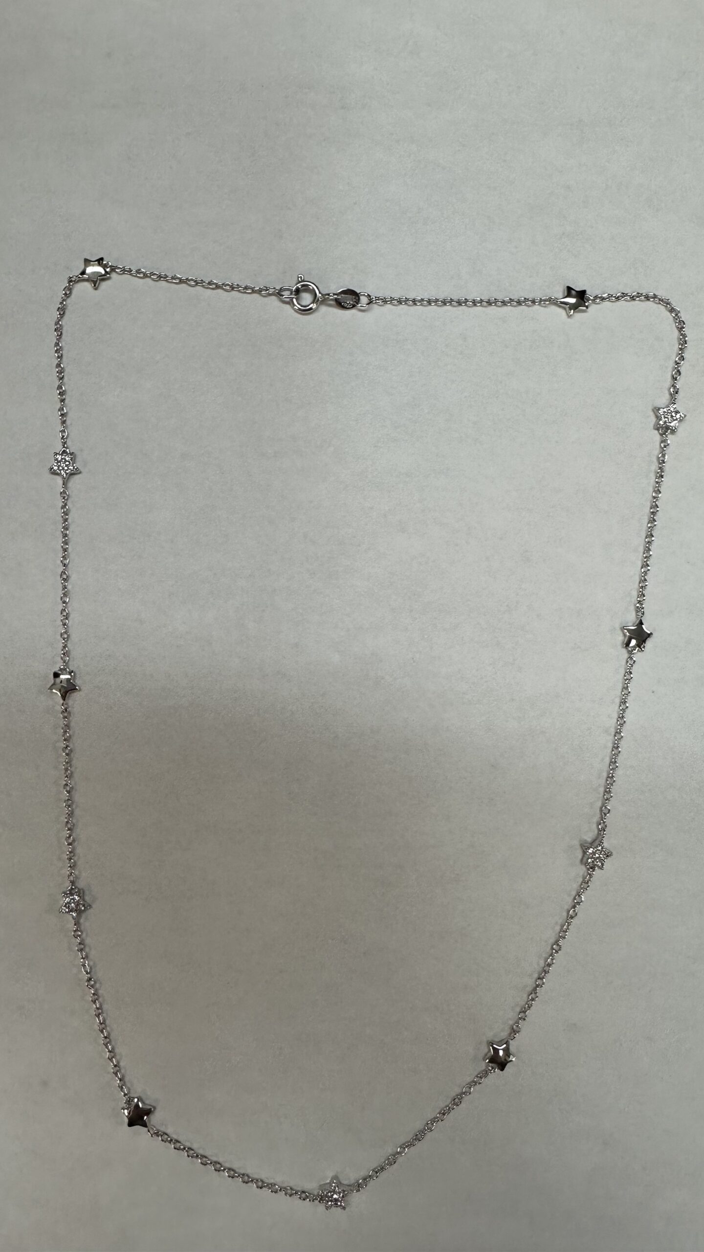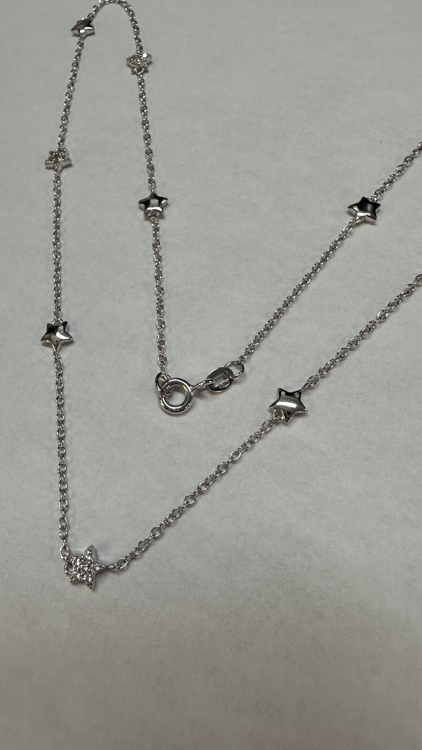 The cutest one-of-a-kind 18k white gold 17” star necklace with CZ accents, directly imported from Italy, 4.01 grams.
