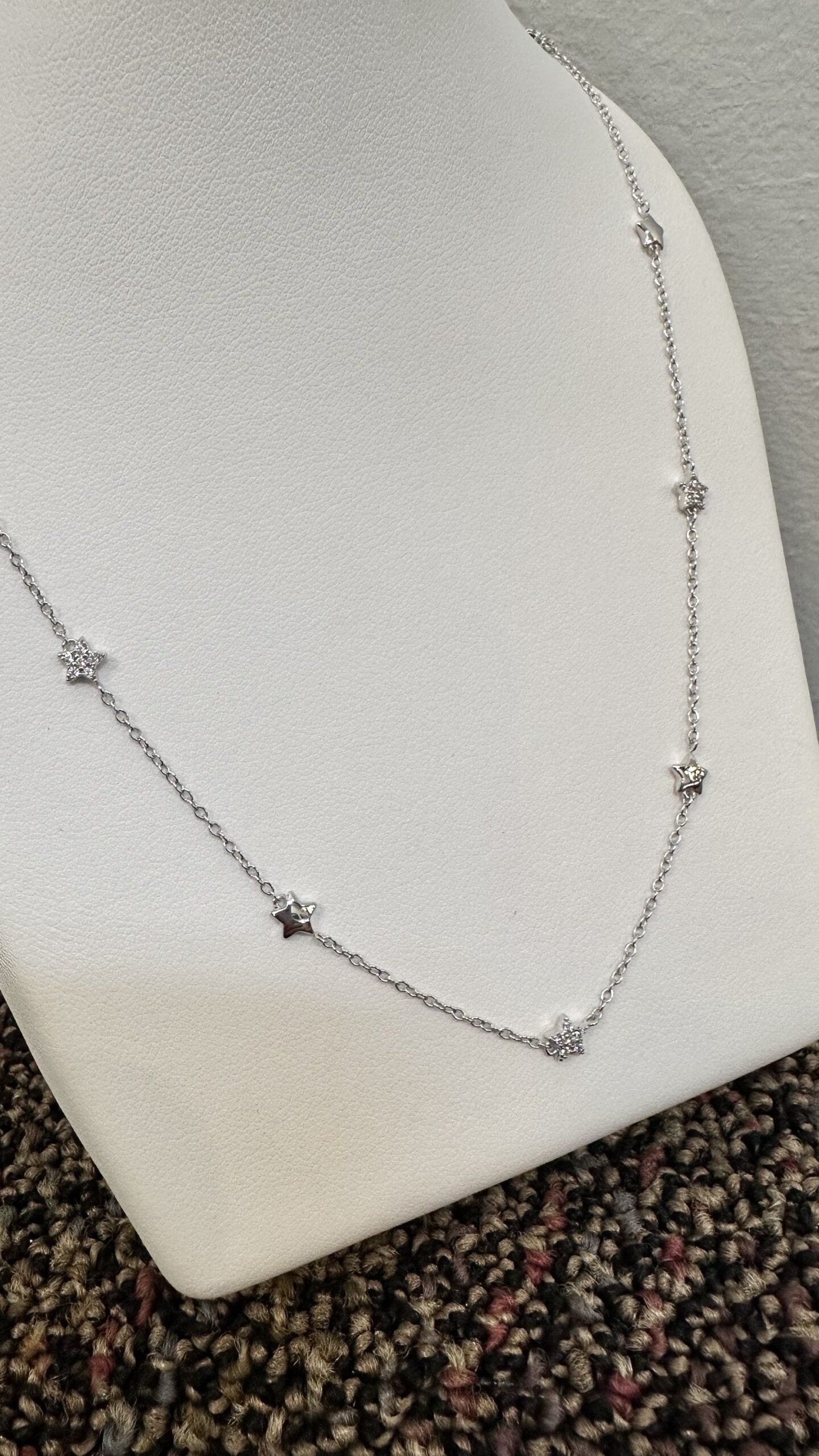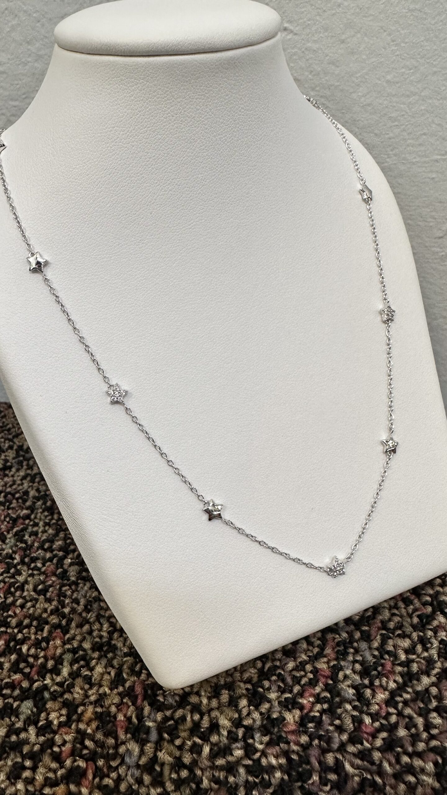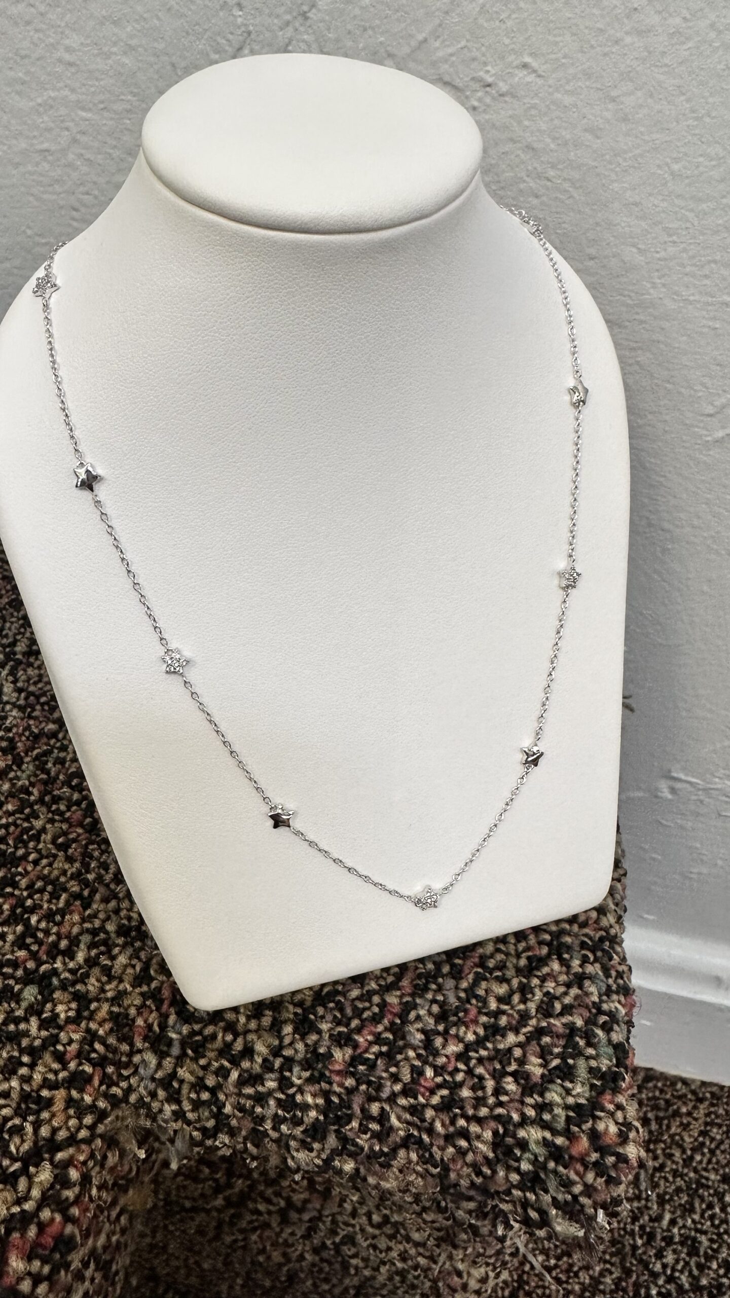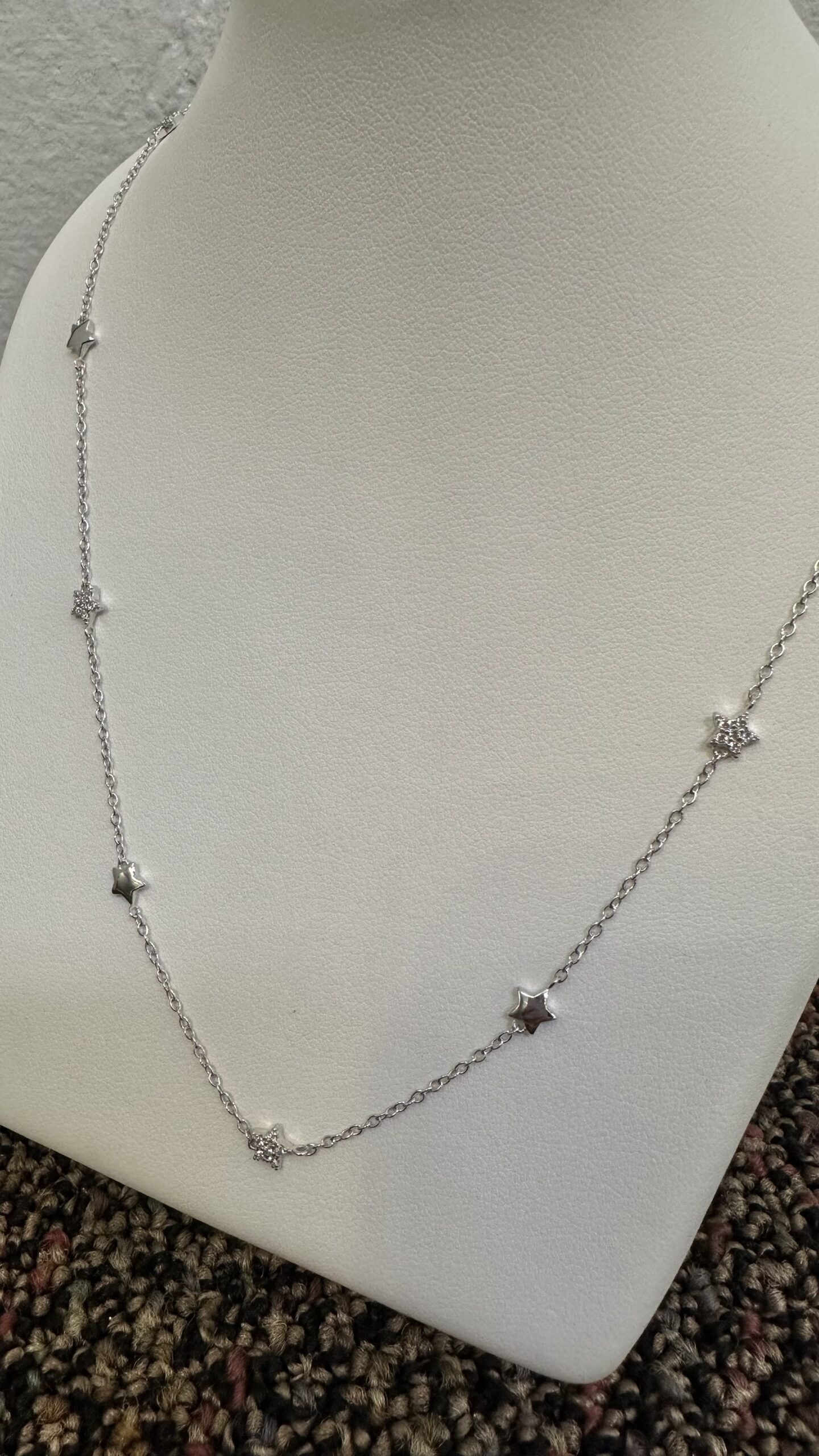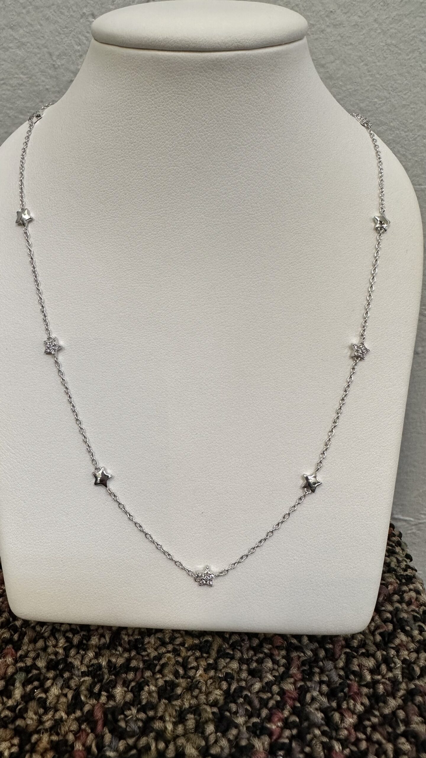 The cutest one-of-a-kind 18k white gold 17” star necklace with CZ accents, directly imported from Italy, 4.01 grams.