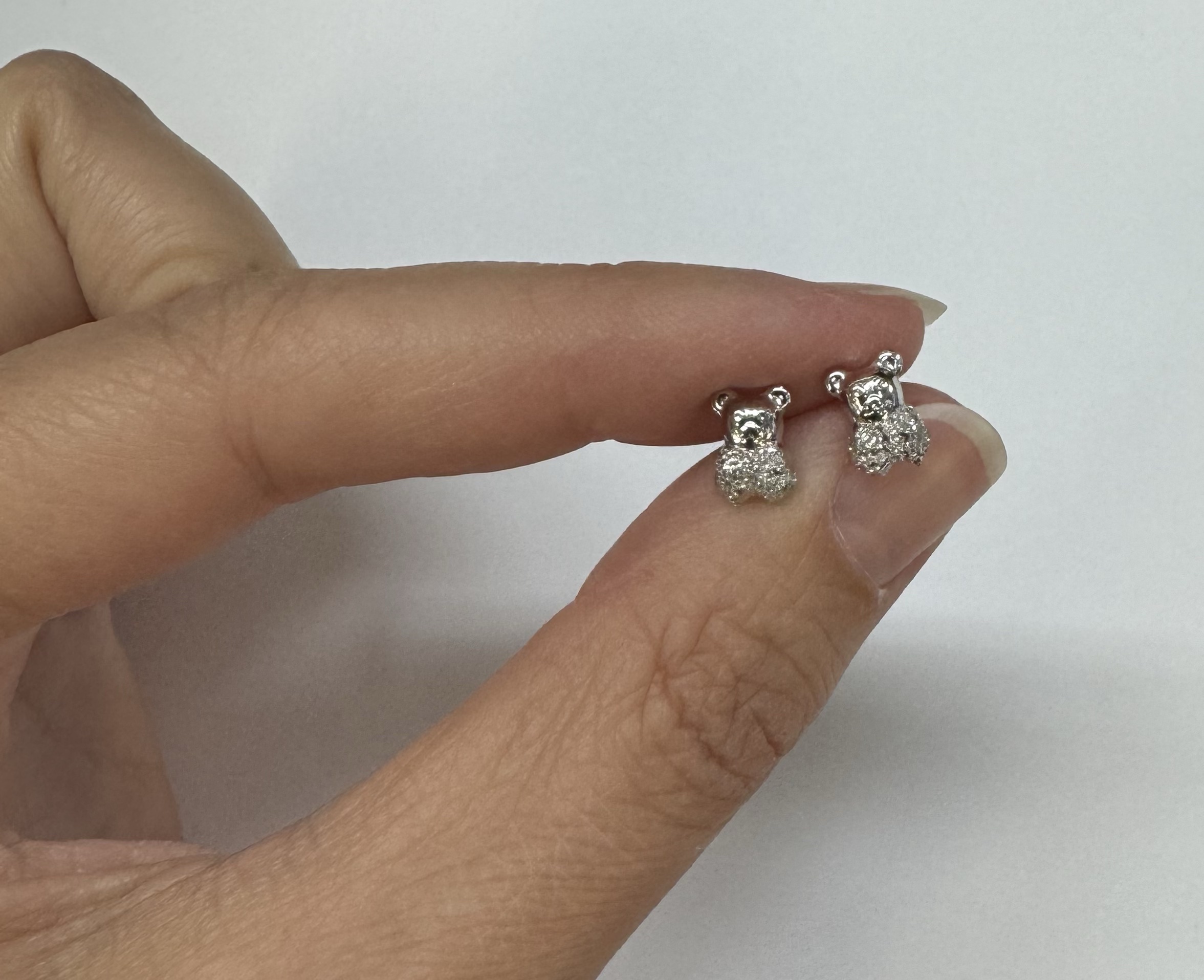 One-of-a-kind 18k white gold Teddy bear stud earrings with diamanté finish, directly imported from Italy. These earrings have an entire weight of 1.6 grams.