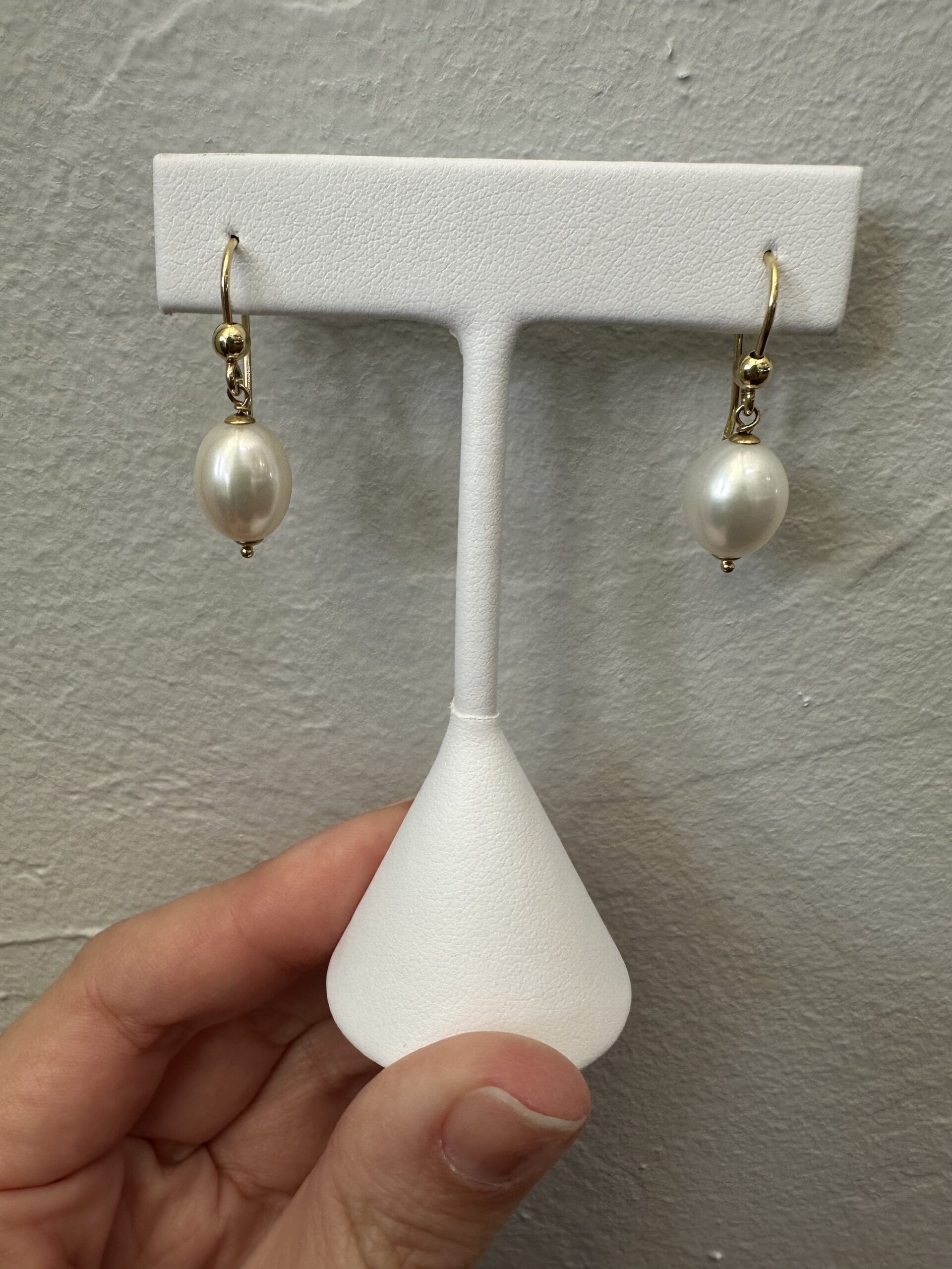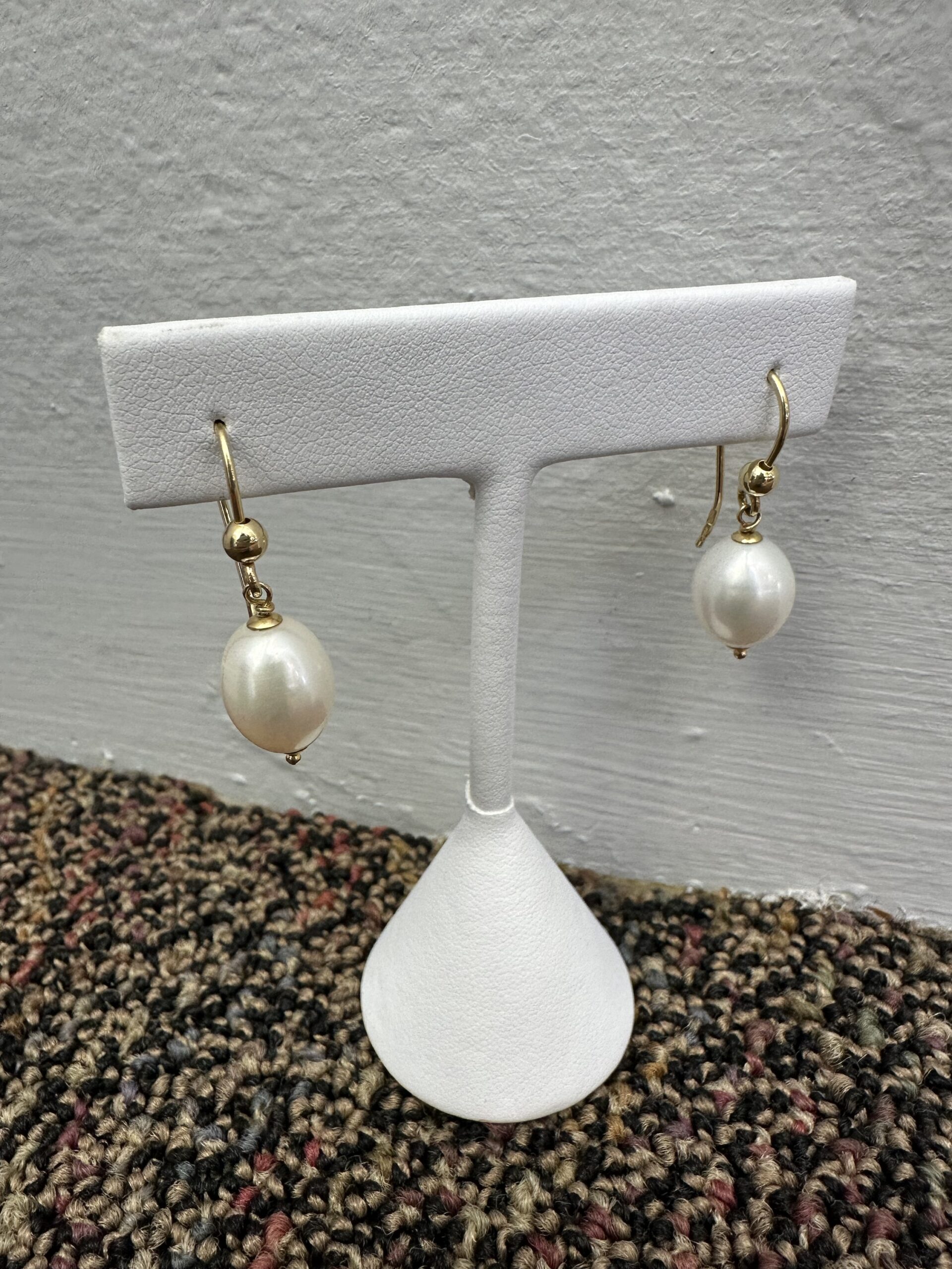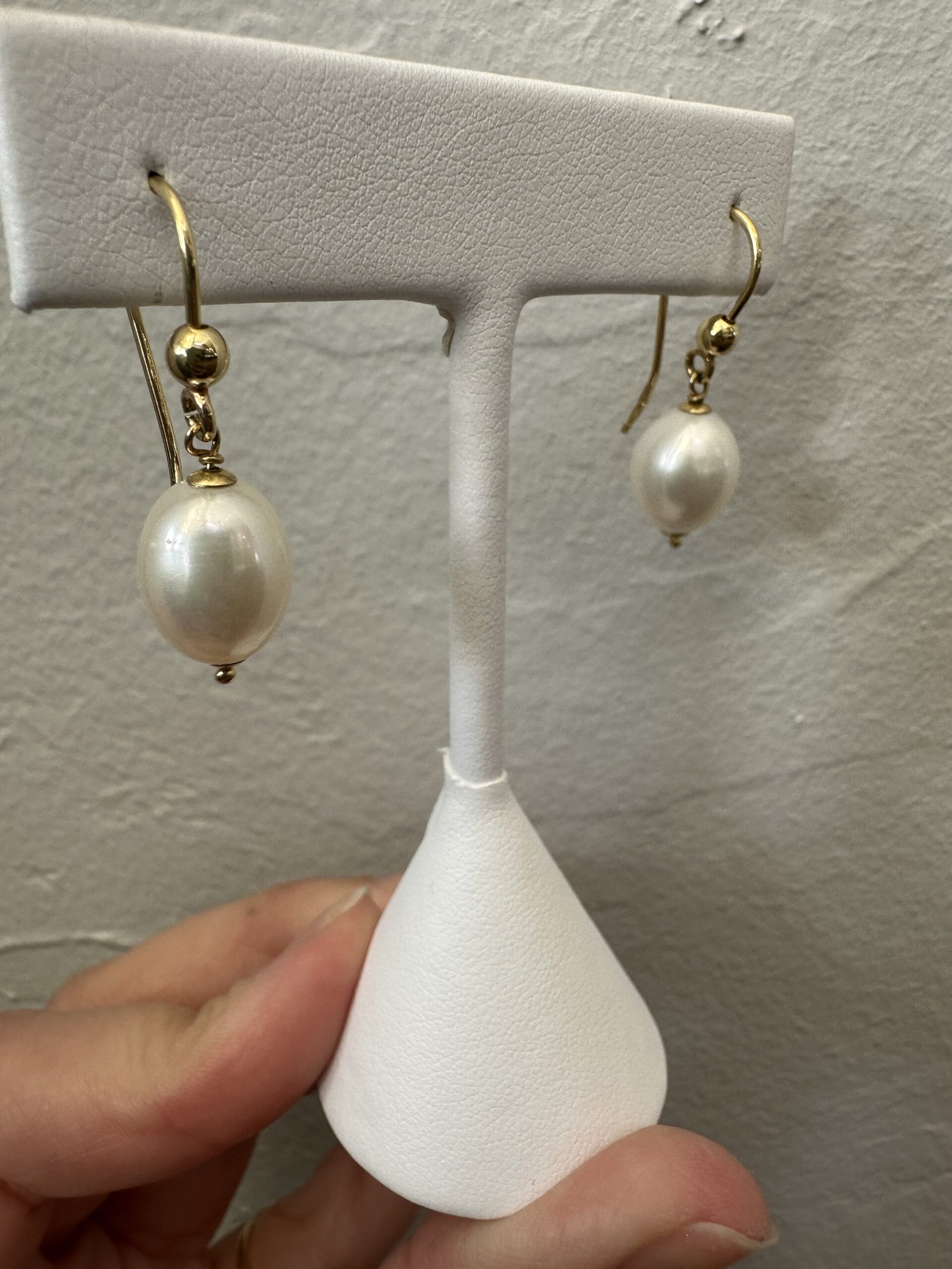 One-of-a-kind 18k yellow gold 9.5 mm freshwater Pearl fish hook style dangle earrings directly imported from Italy. These earrings dangle 1 1/4″ in length and they have an entire weight of 4.7 grams.