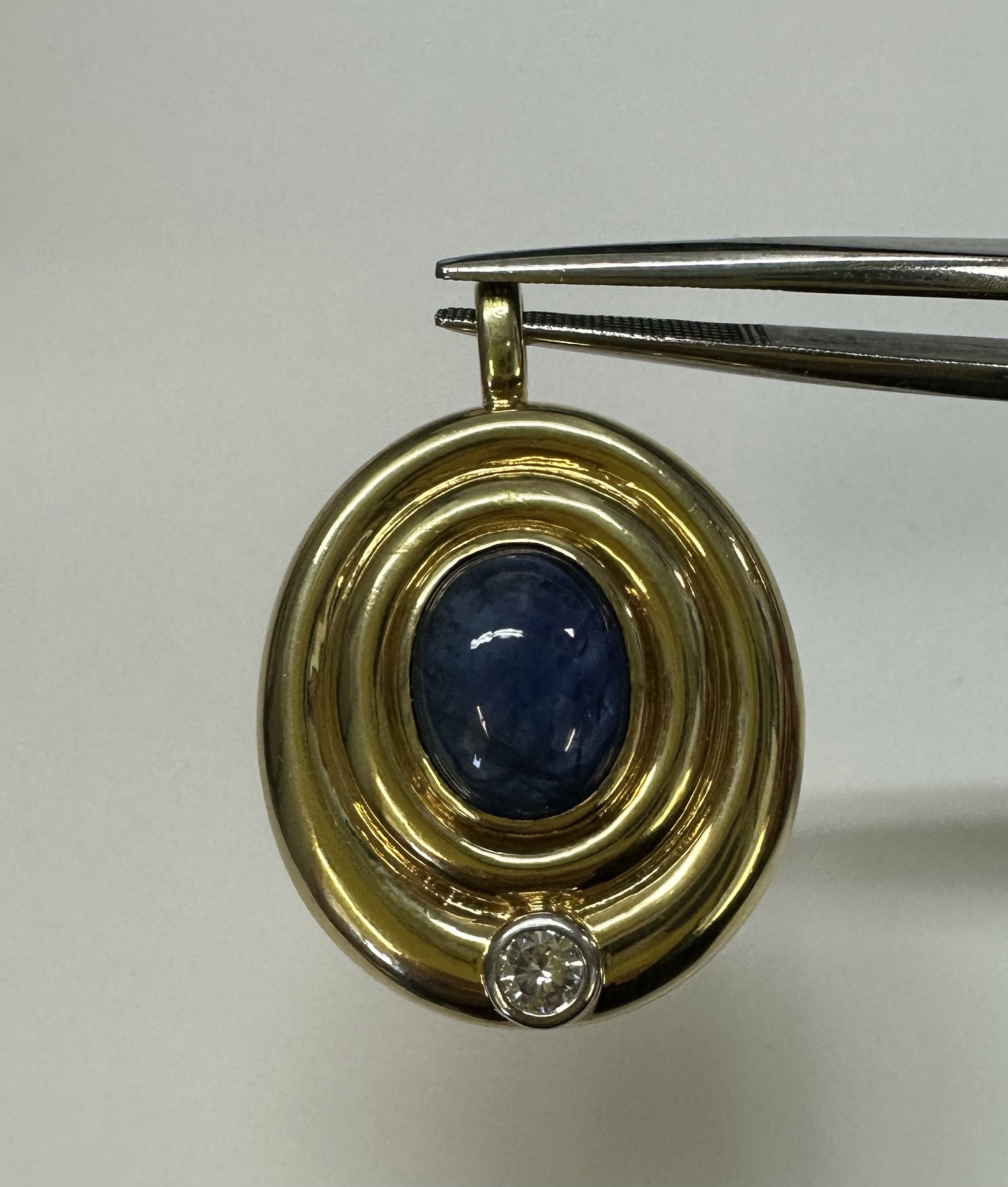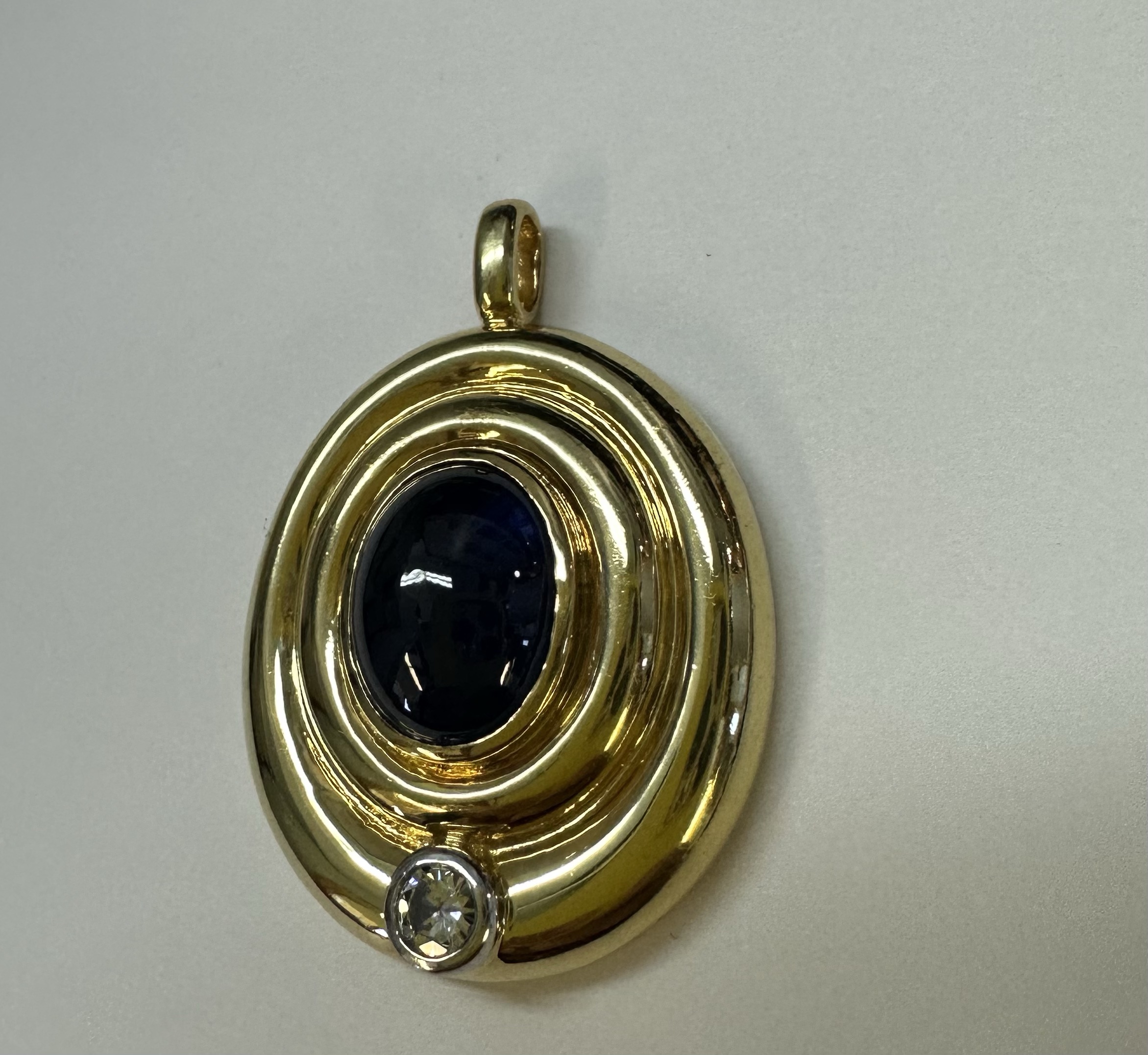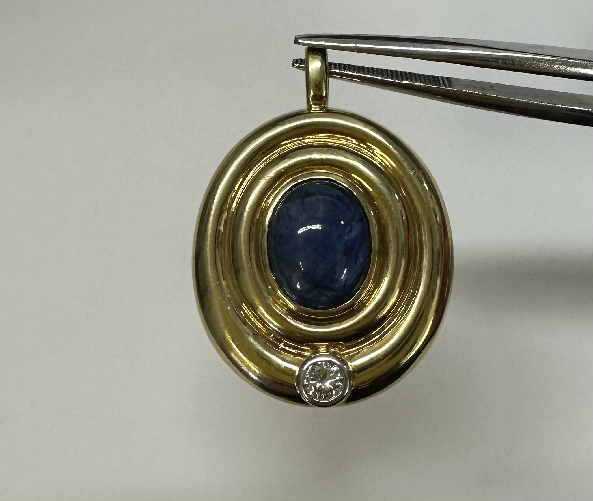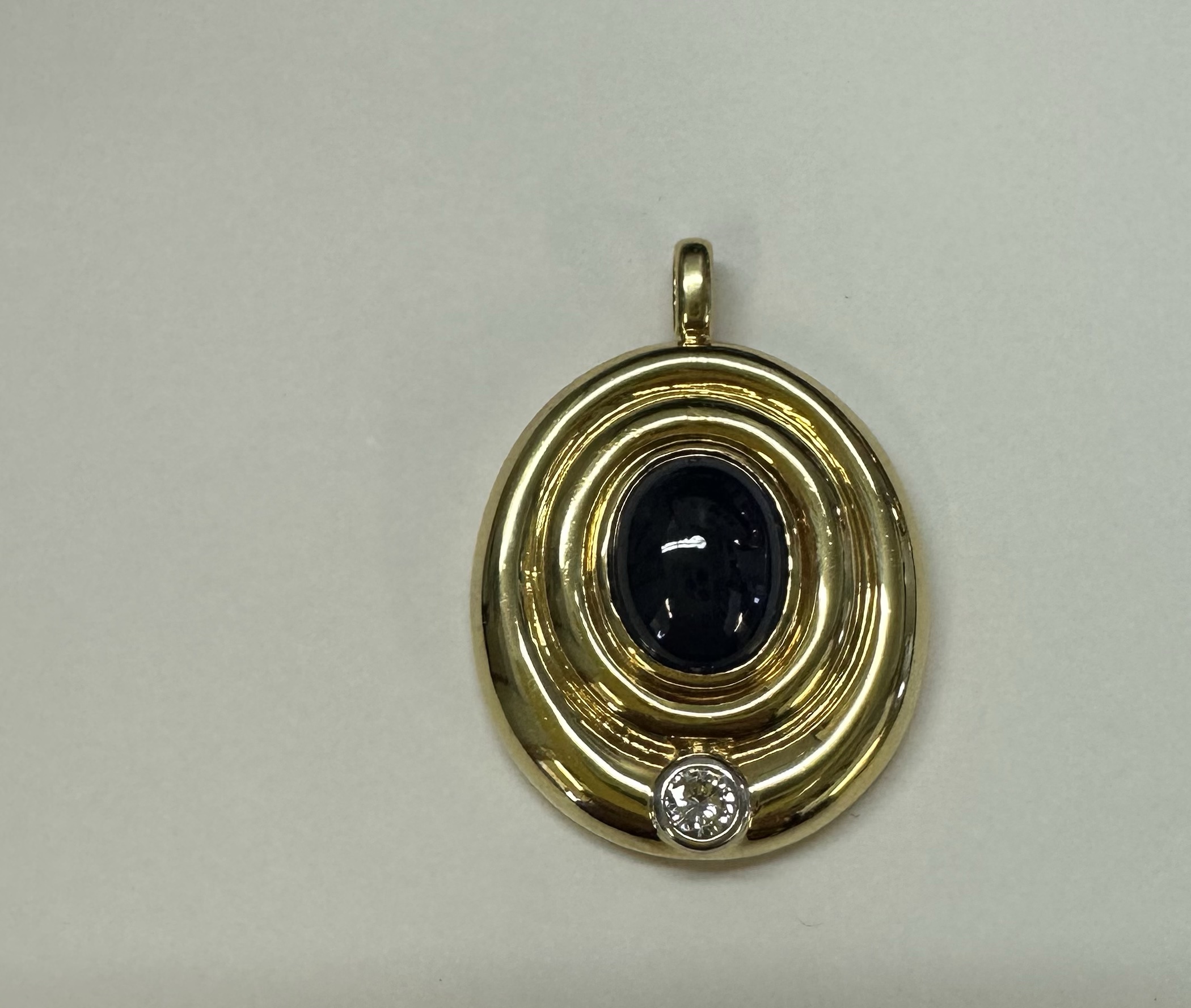Vintage 18k yellow gold bezel set genuine 3 carat oval-shaped, cabochon cut Sapphire and .15 cttw bezel set genuine Round Brilliant Cut diamond pendant. This diamond has a color grade of H, and a clarity grade of SI1. This piece has an entire weight of 14.0 grams. This pendant measures 33.5 x 24 mm in size.