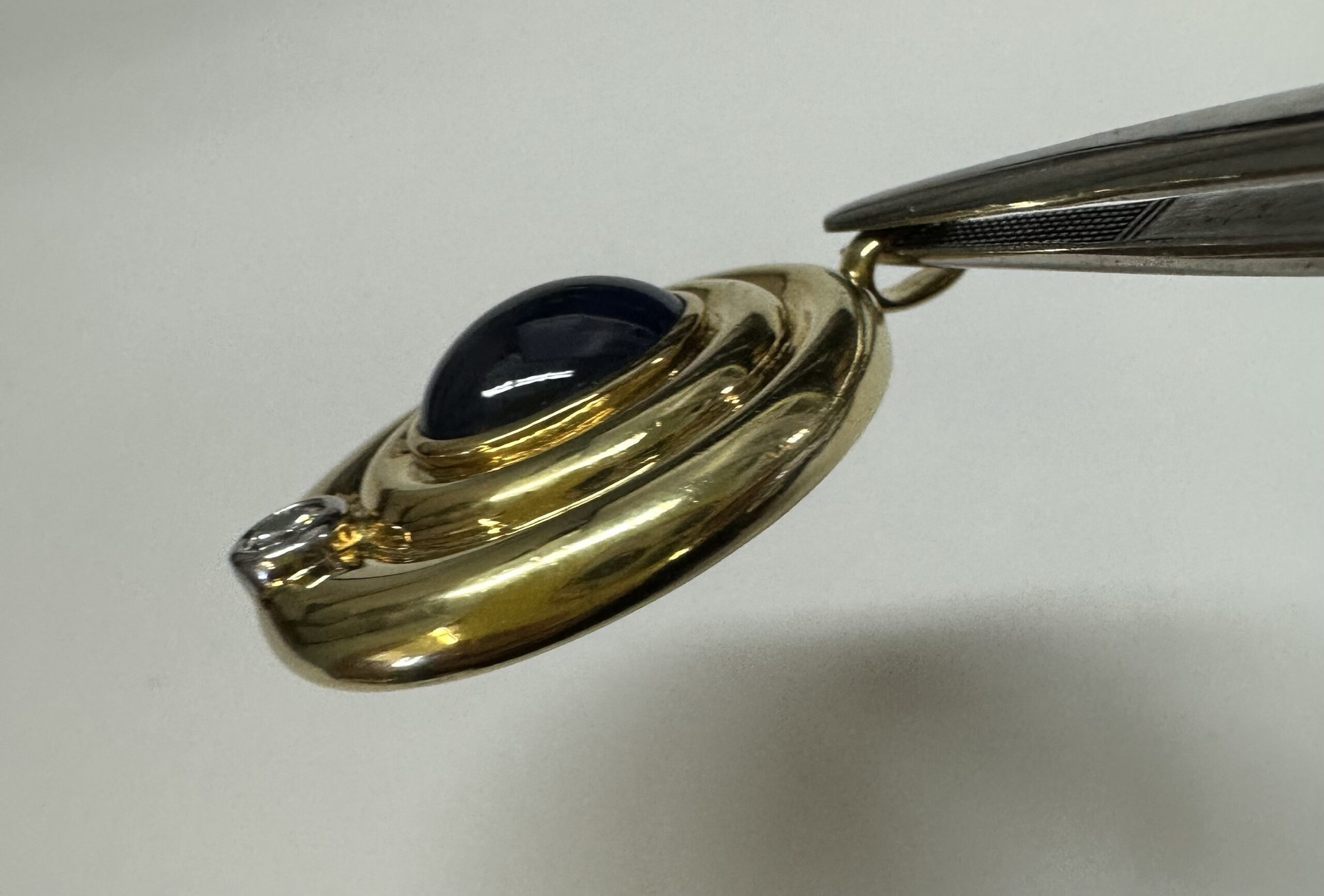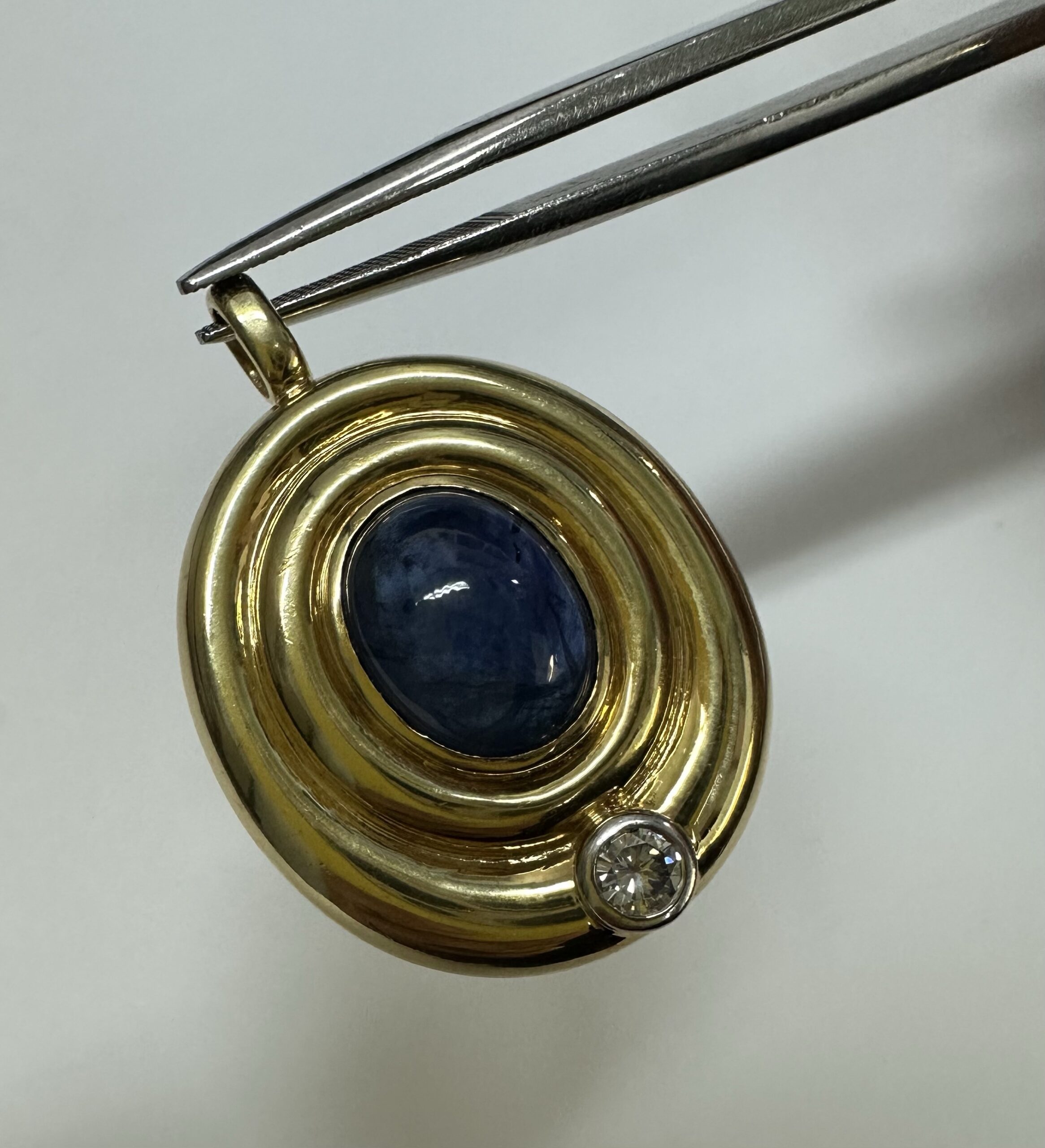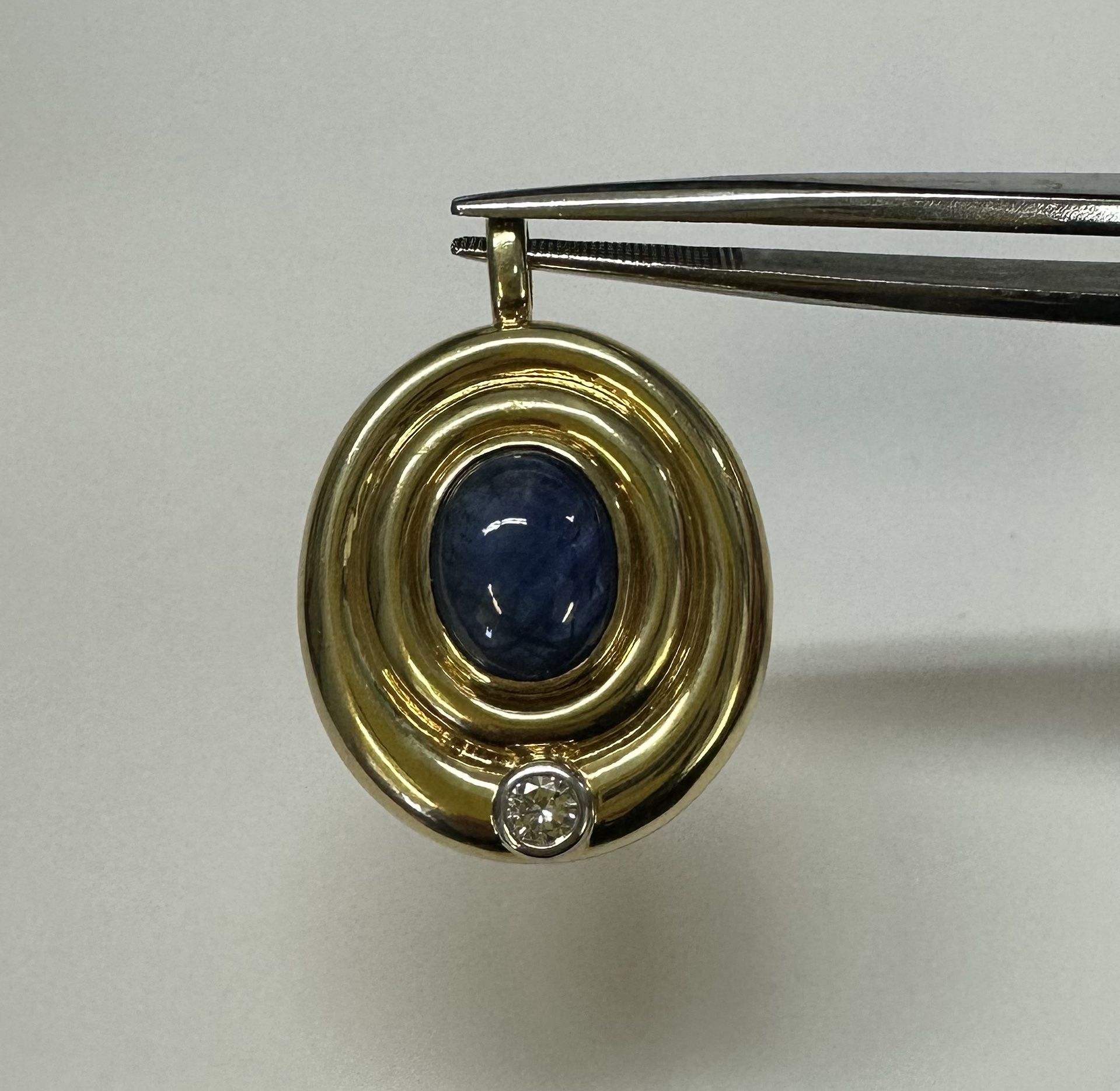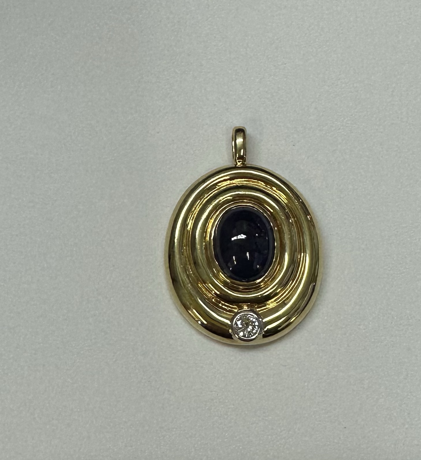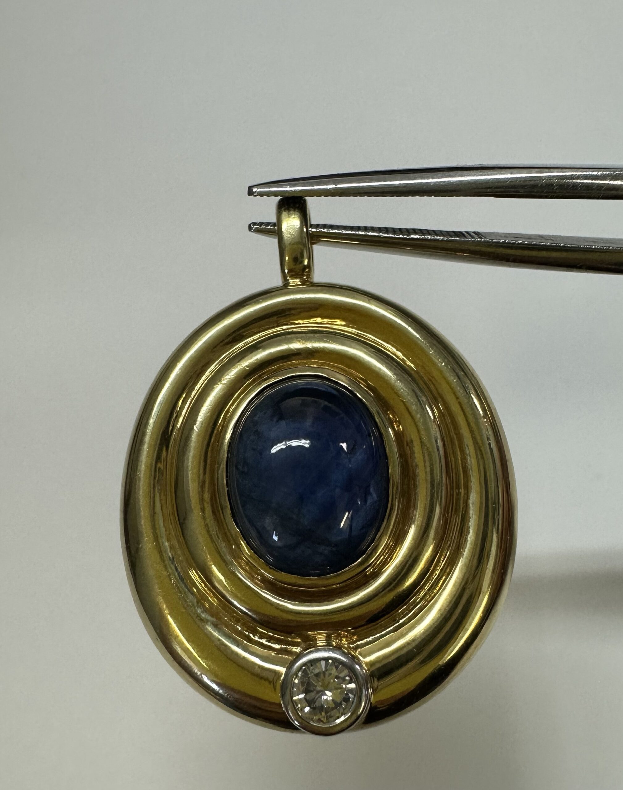 Vintage 18k yellow gold bezel set genuine 3 carat oval-shaped, cabochon cut Sapphire and .15 cttw bezel set genuine Round Brilliant Cut diamond pendant. This diamond has a color grade of H, and a clarity grade of SI1. This piece has an entire weight of 14.0 grams. This pendant measures 33.5 x 24 mm in size.