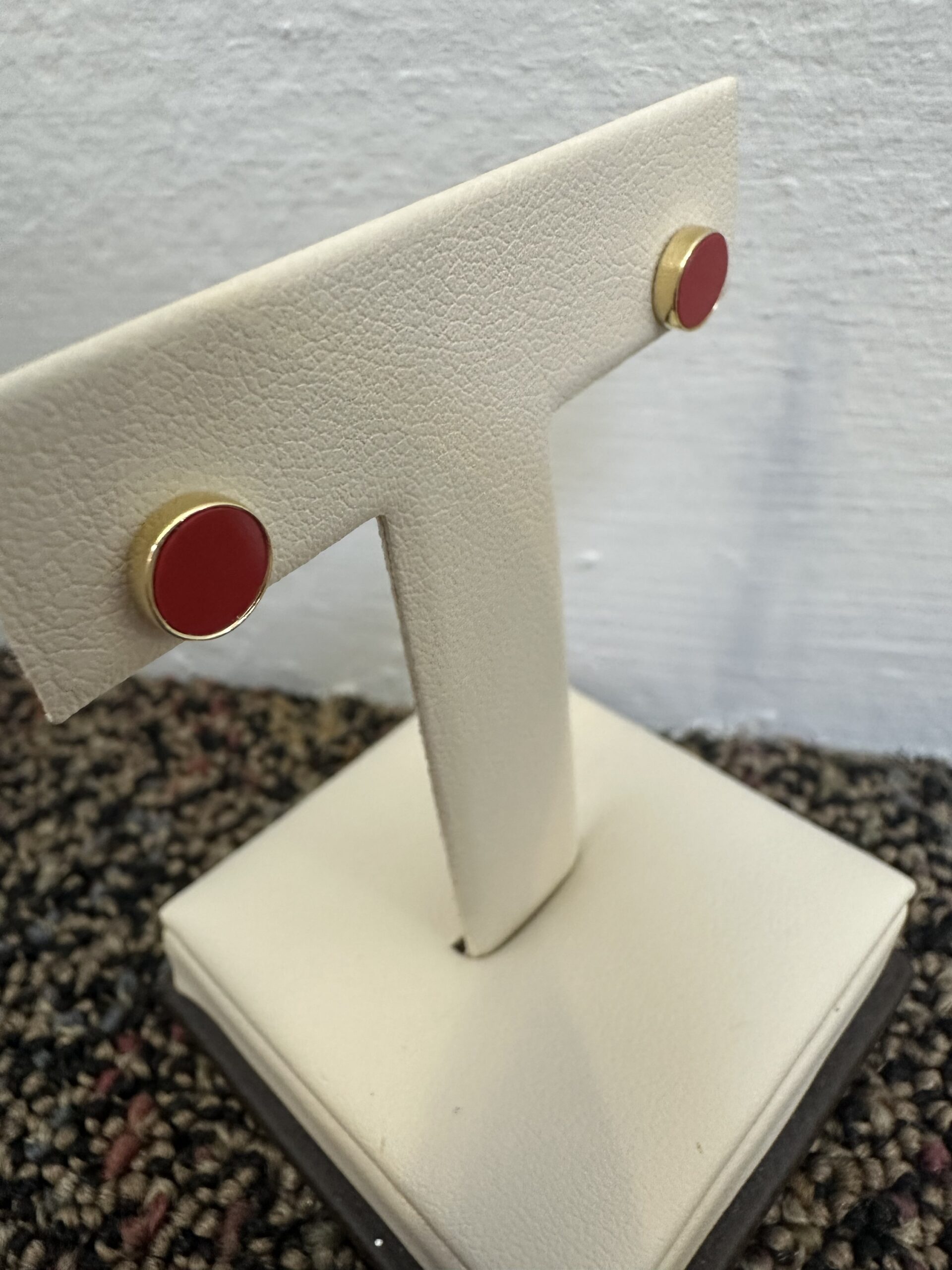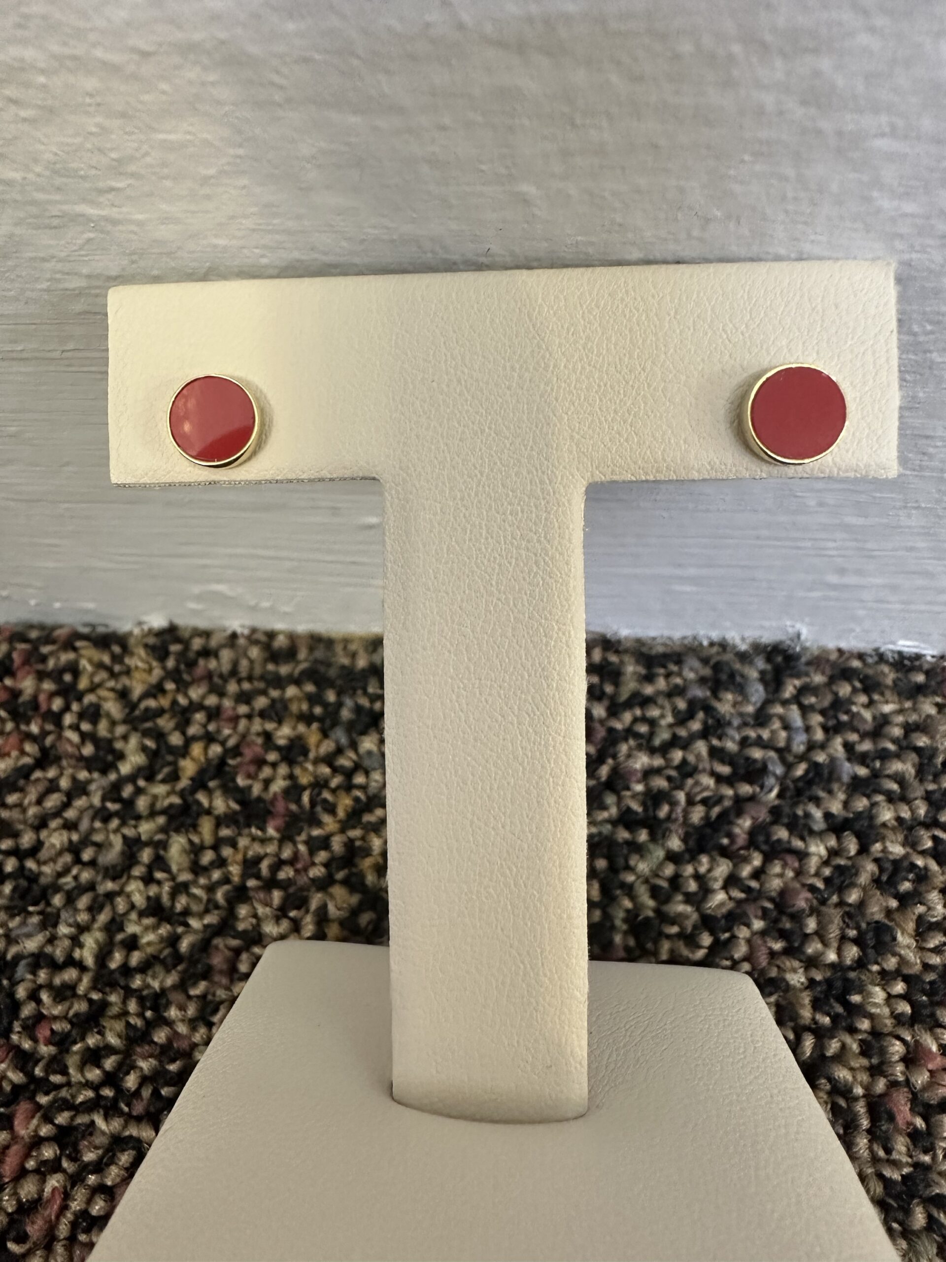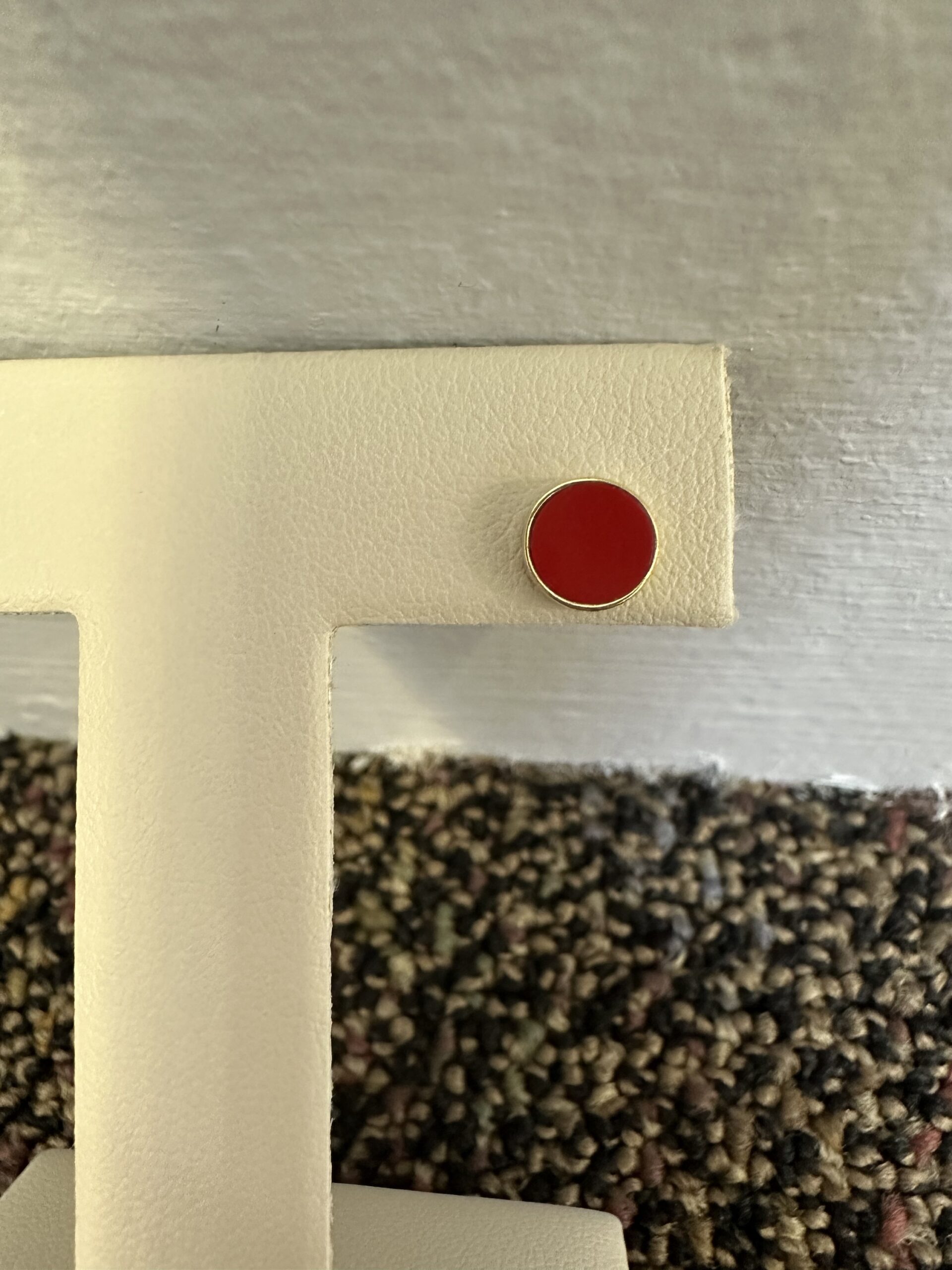 One-of-a-kind 18k yellow gold genuine red Coral inlay flat round 7 mm stud earrings directly imported from Italy. These earrings have an entire weight of 1.19 grams.