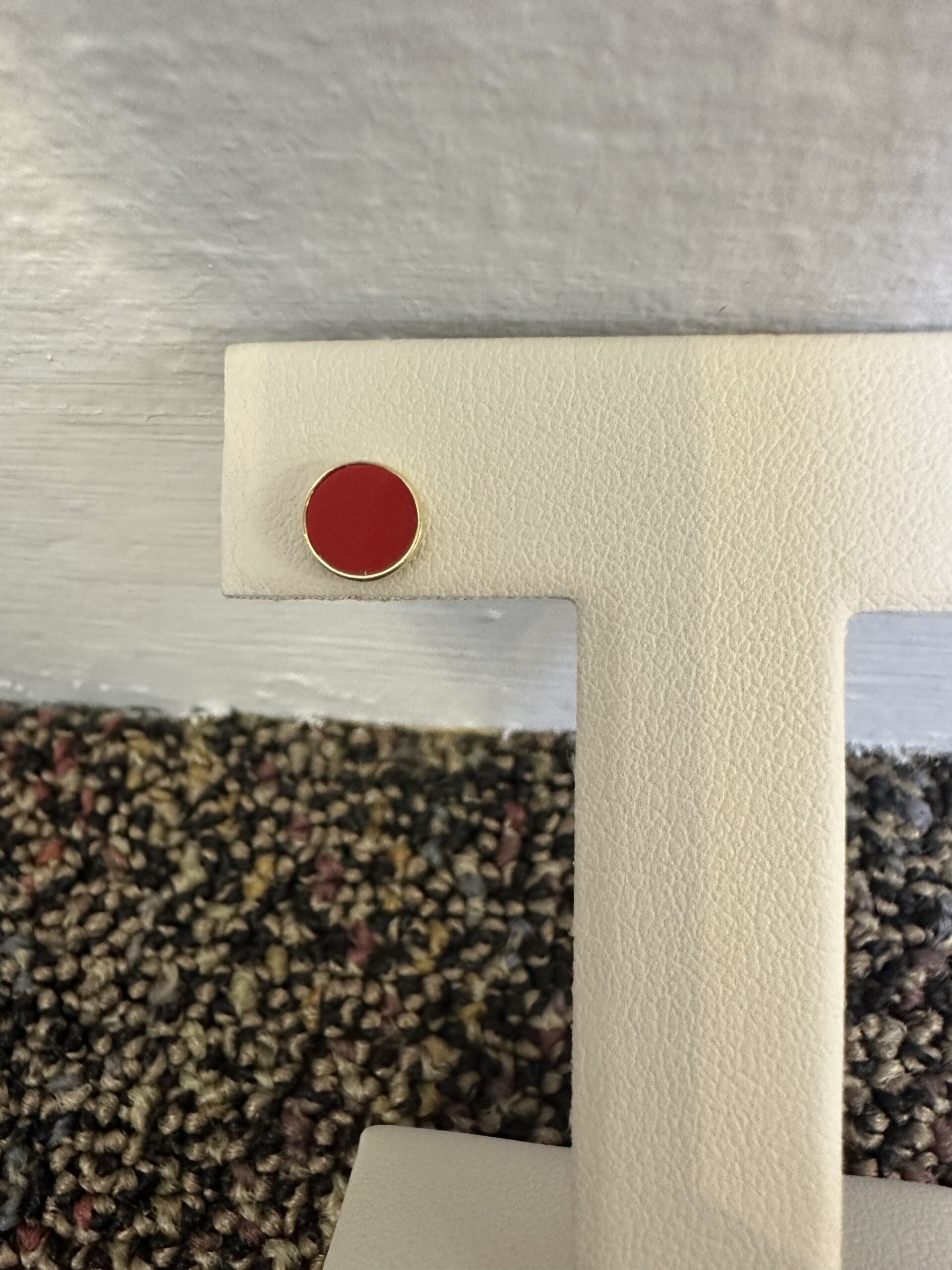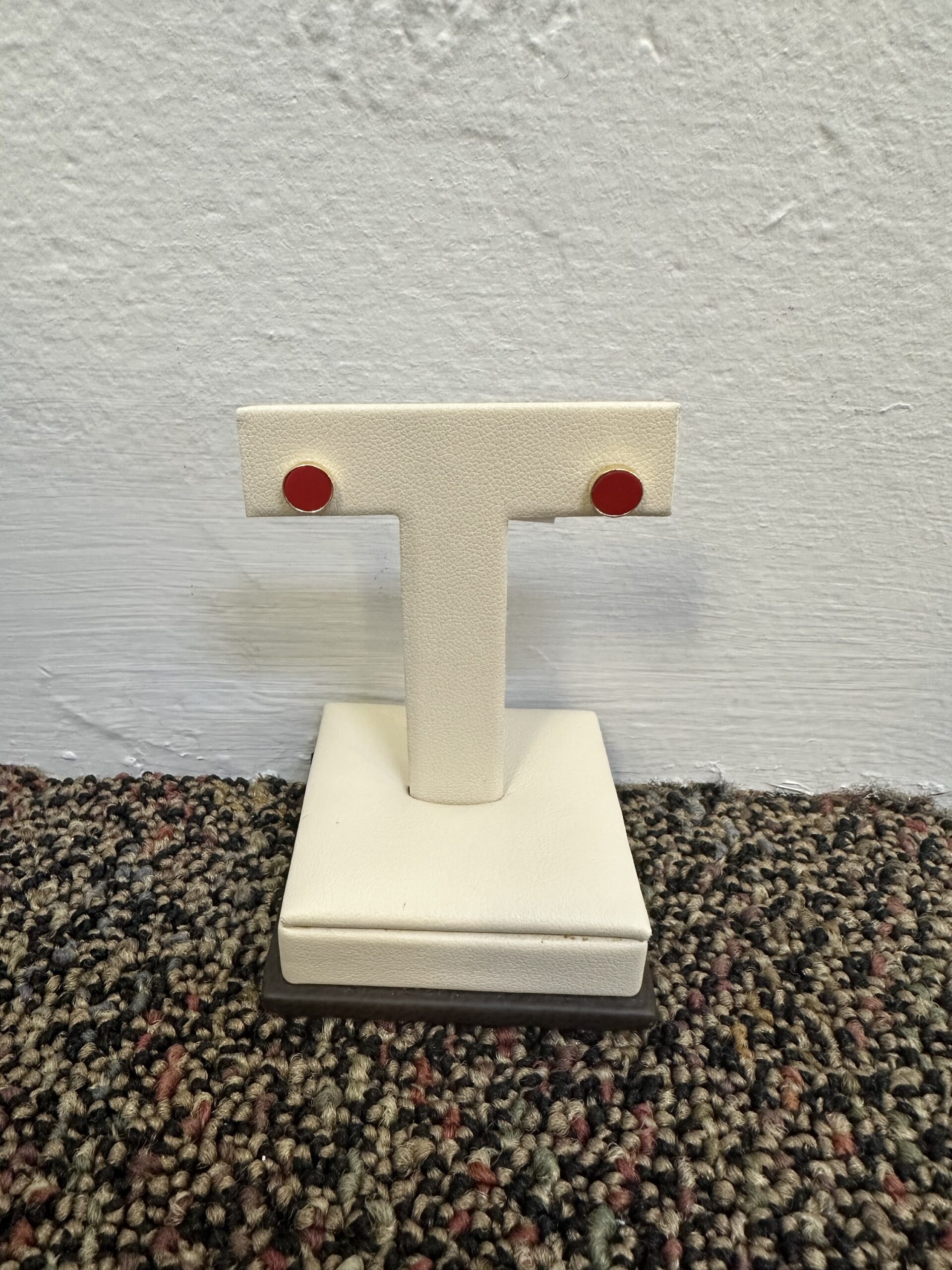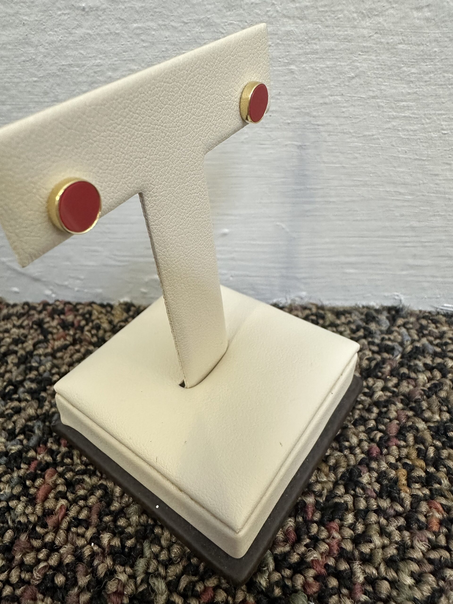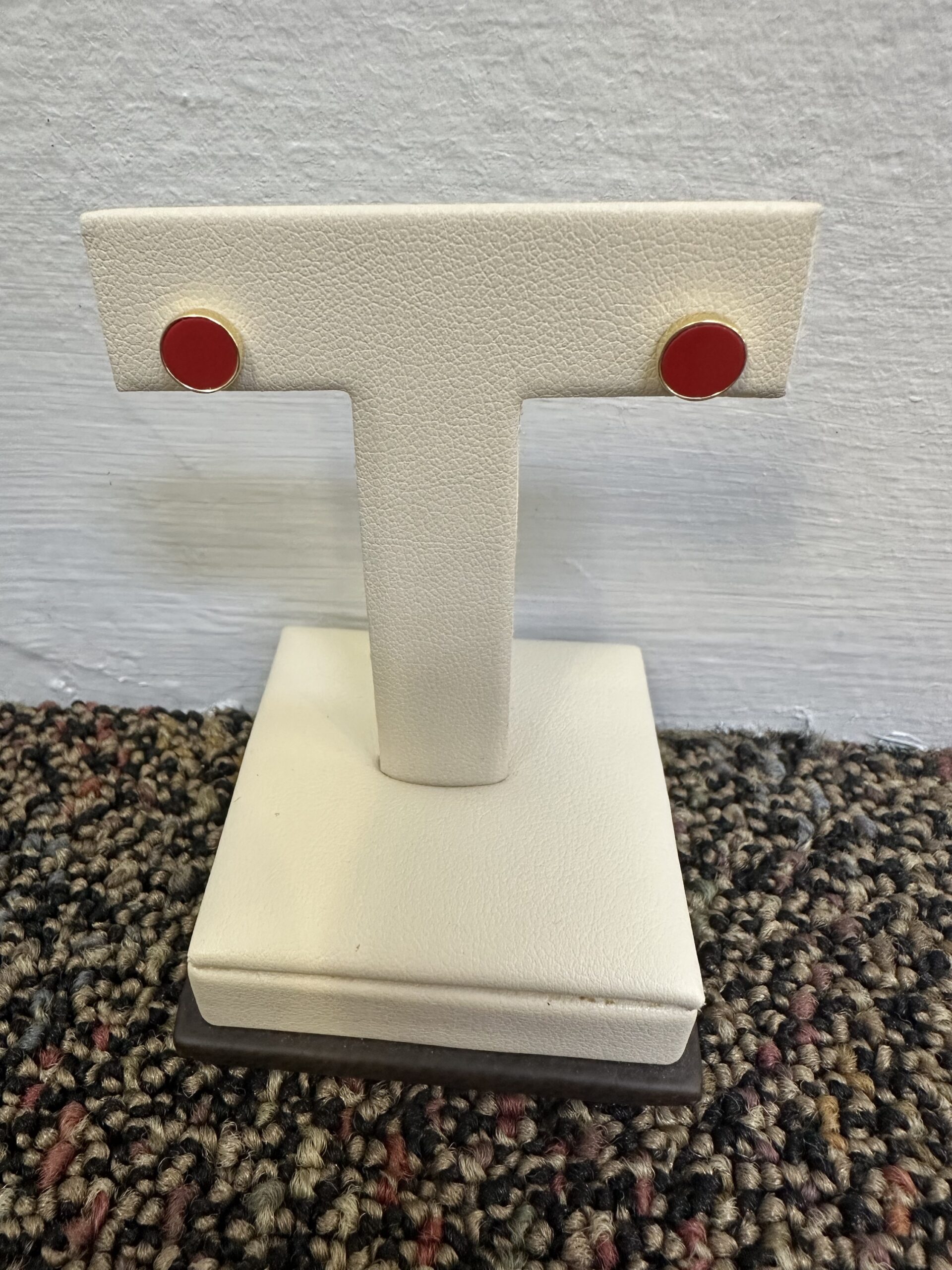 One-of-a-kind 18k yellow gold genuine red Coral inlay flat round 7 mm stud earrings directly imported from Italy. These earrings have an entire weight of 1.19 grams.