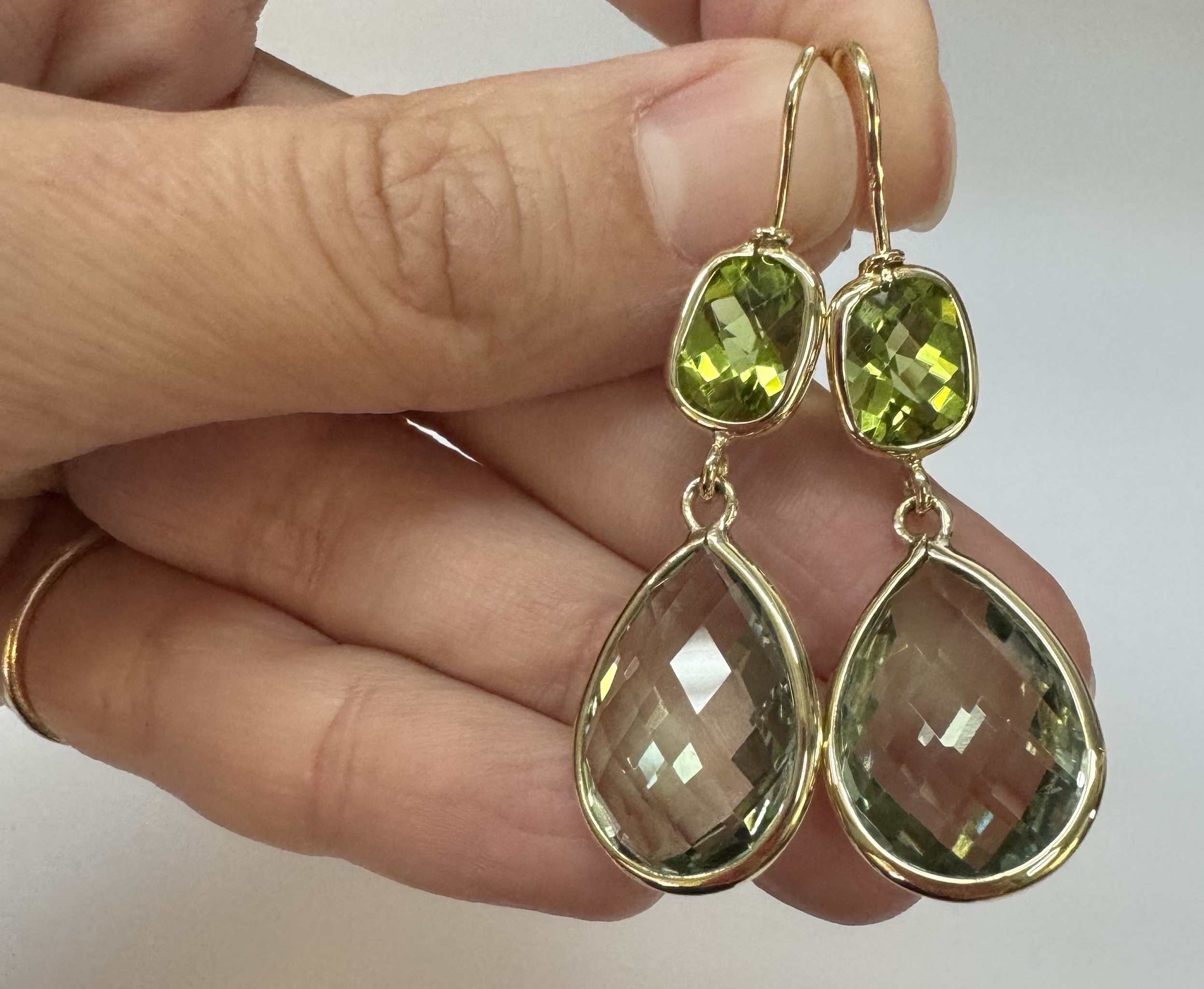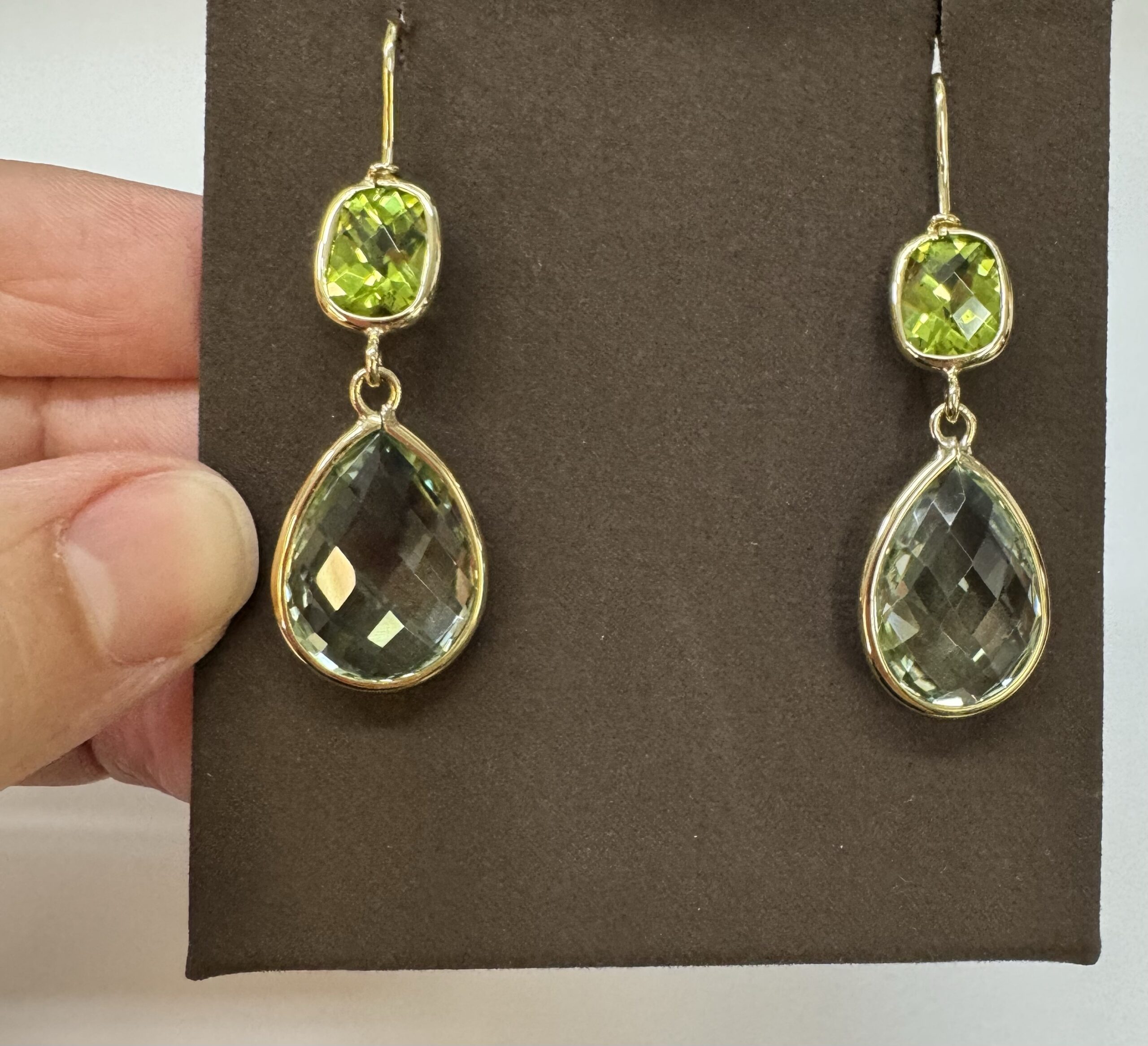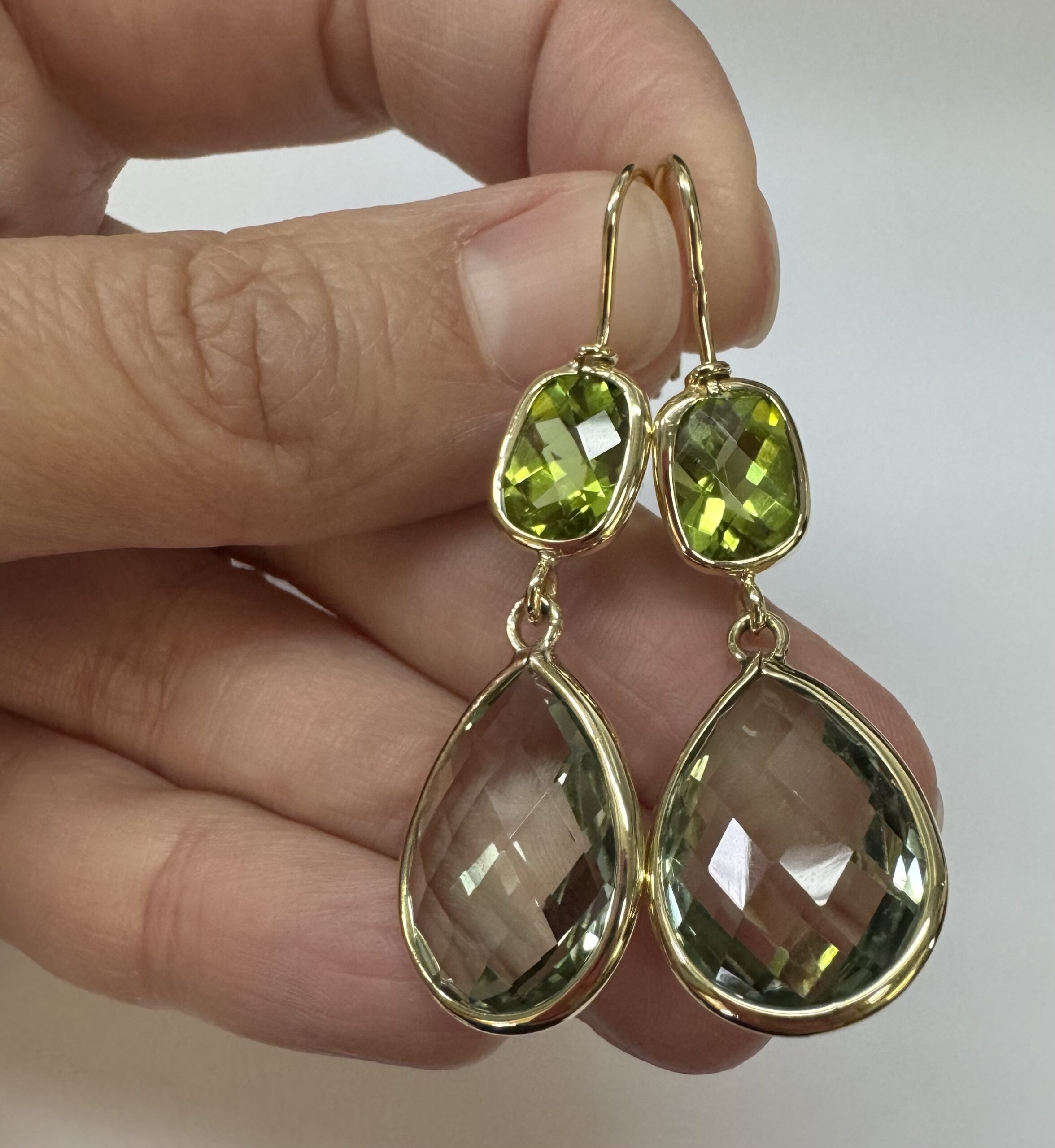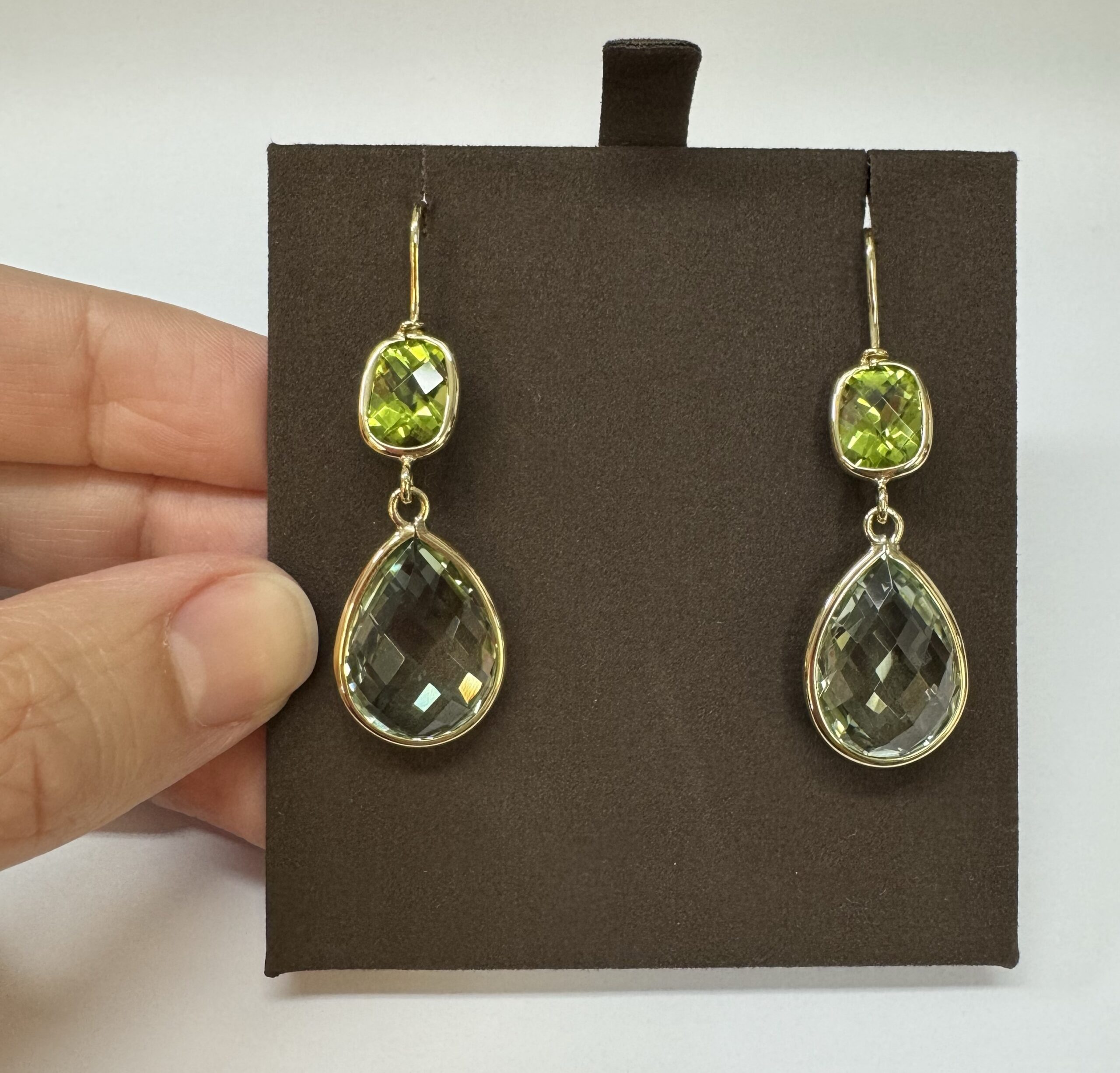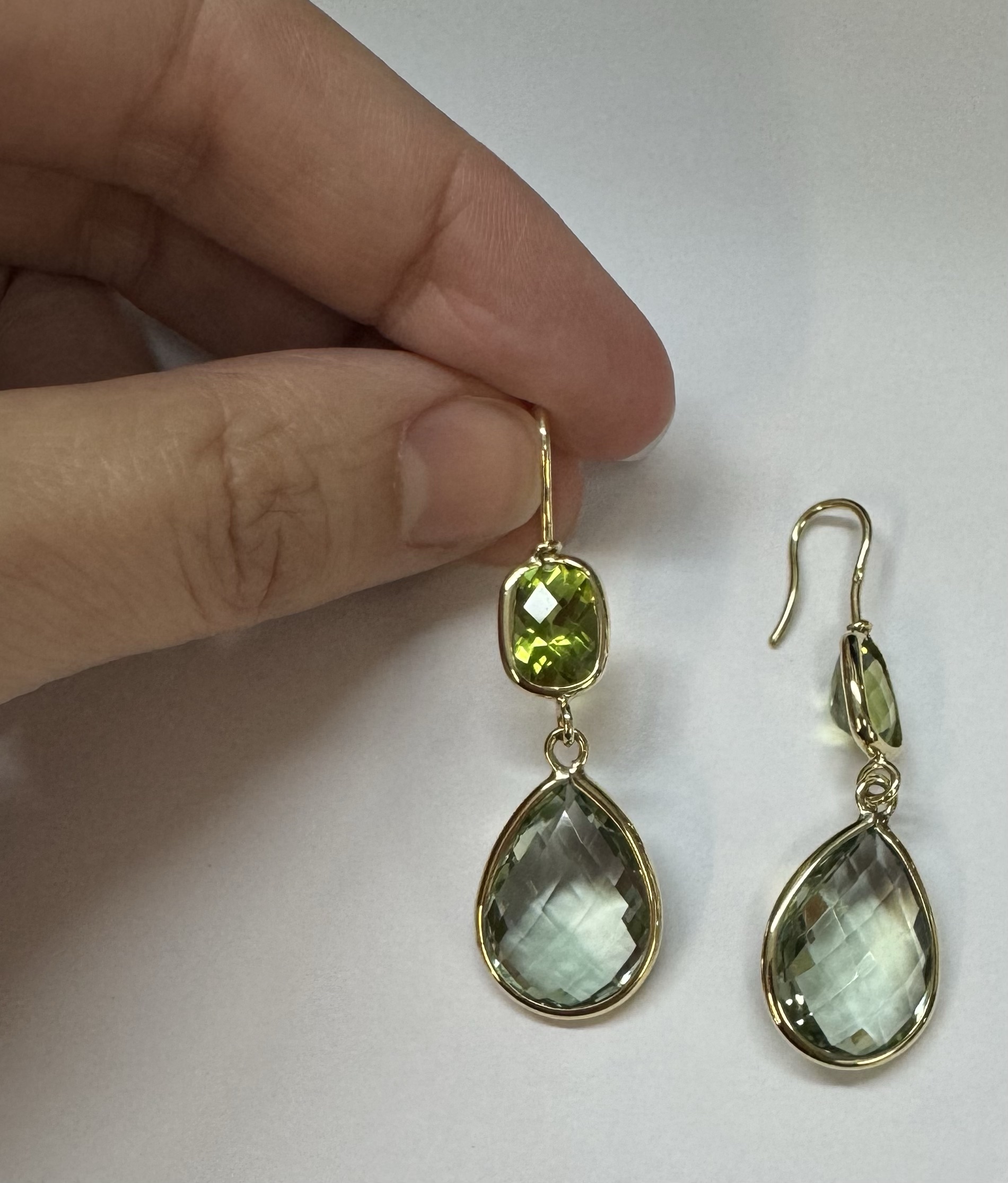 One-of-a-kind 18k yellow gold 24.95 cttw bezel set pear shaped, faceted Green Amethyst & cushion shaped, faceted Peridot lever back fish hook style dangle earrings. These earrings have an entire weight of 7.8 grams.