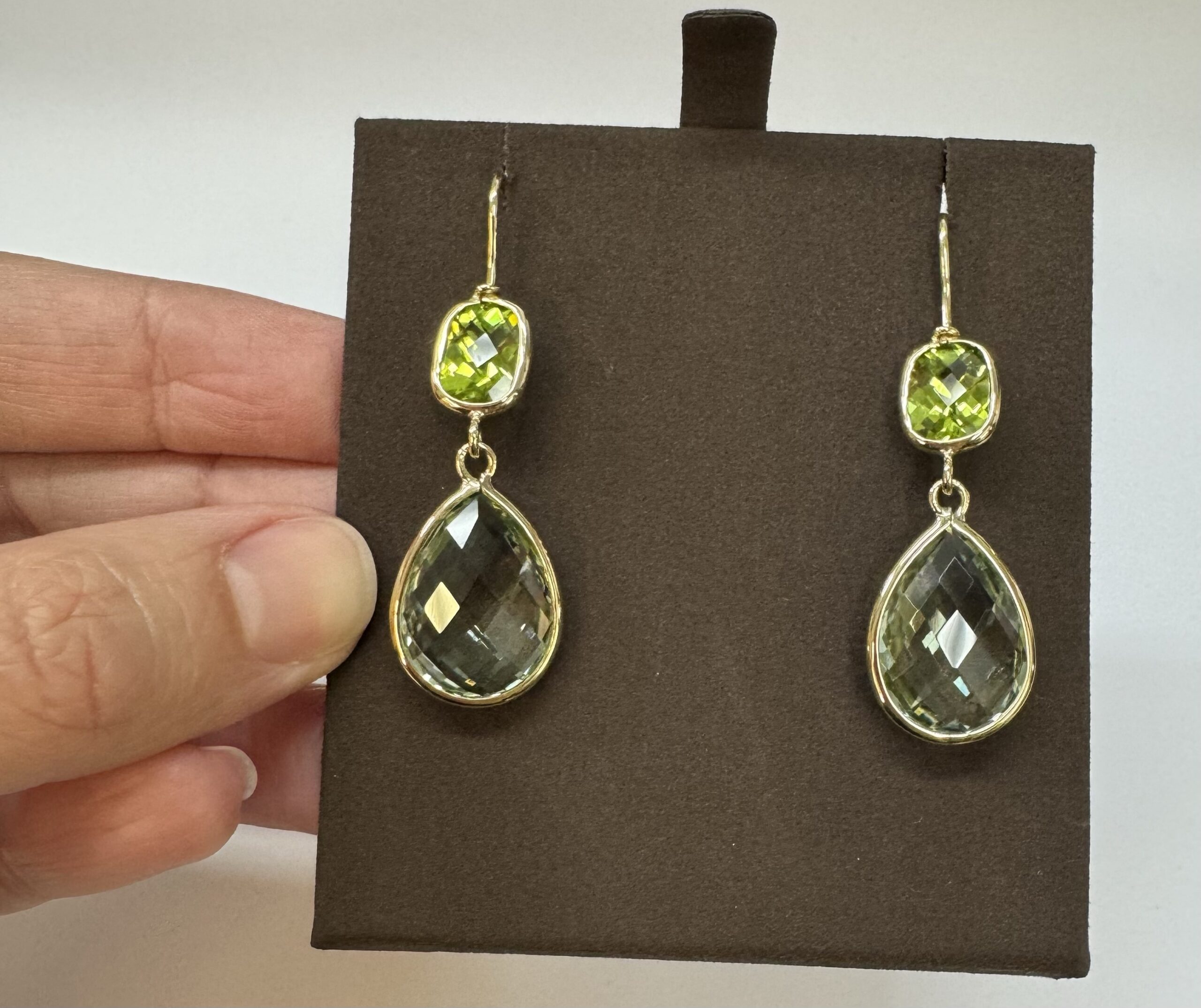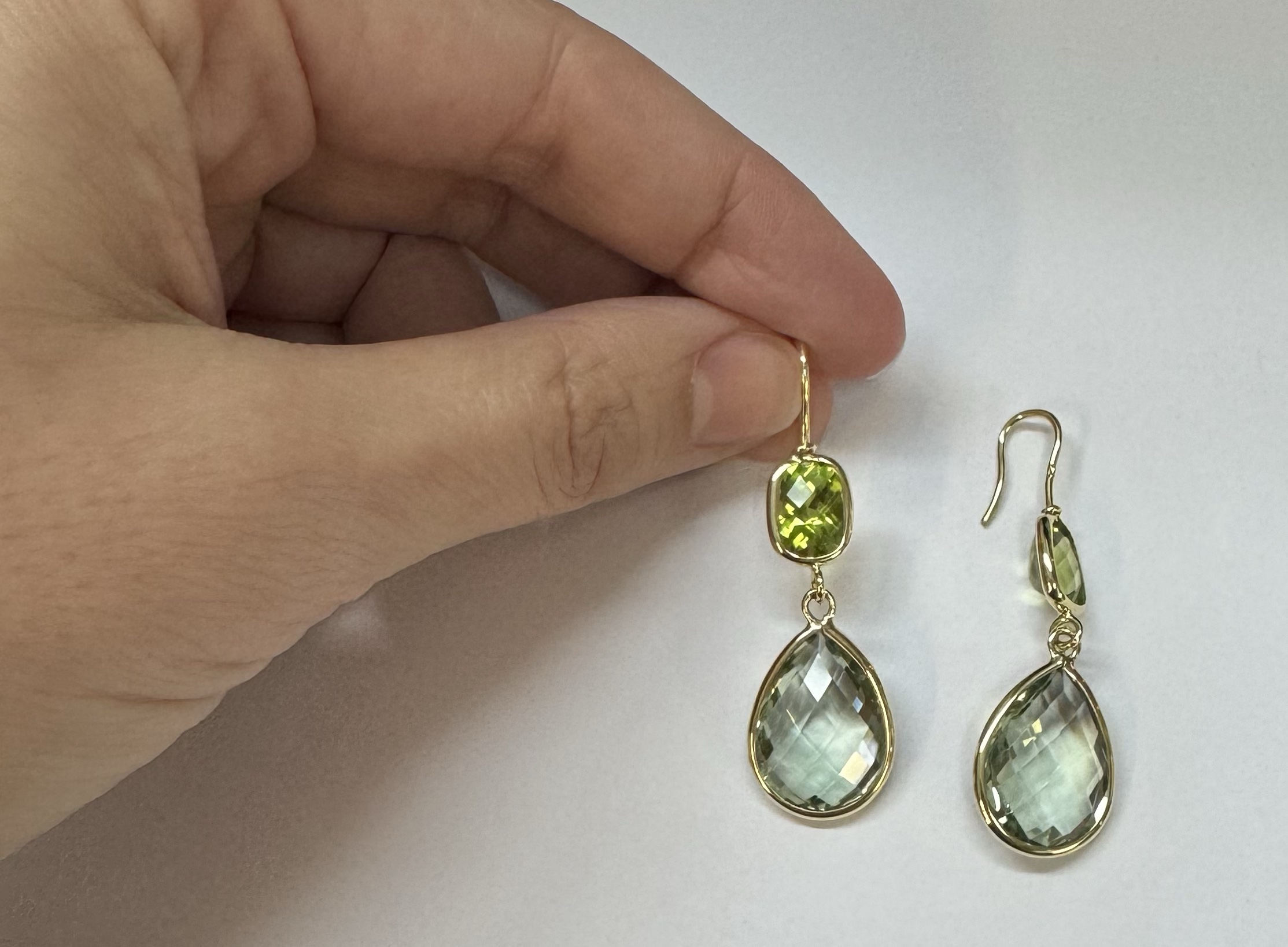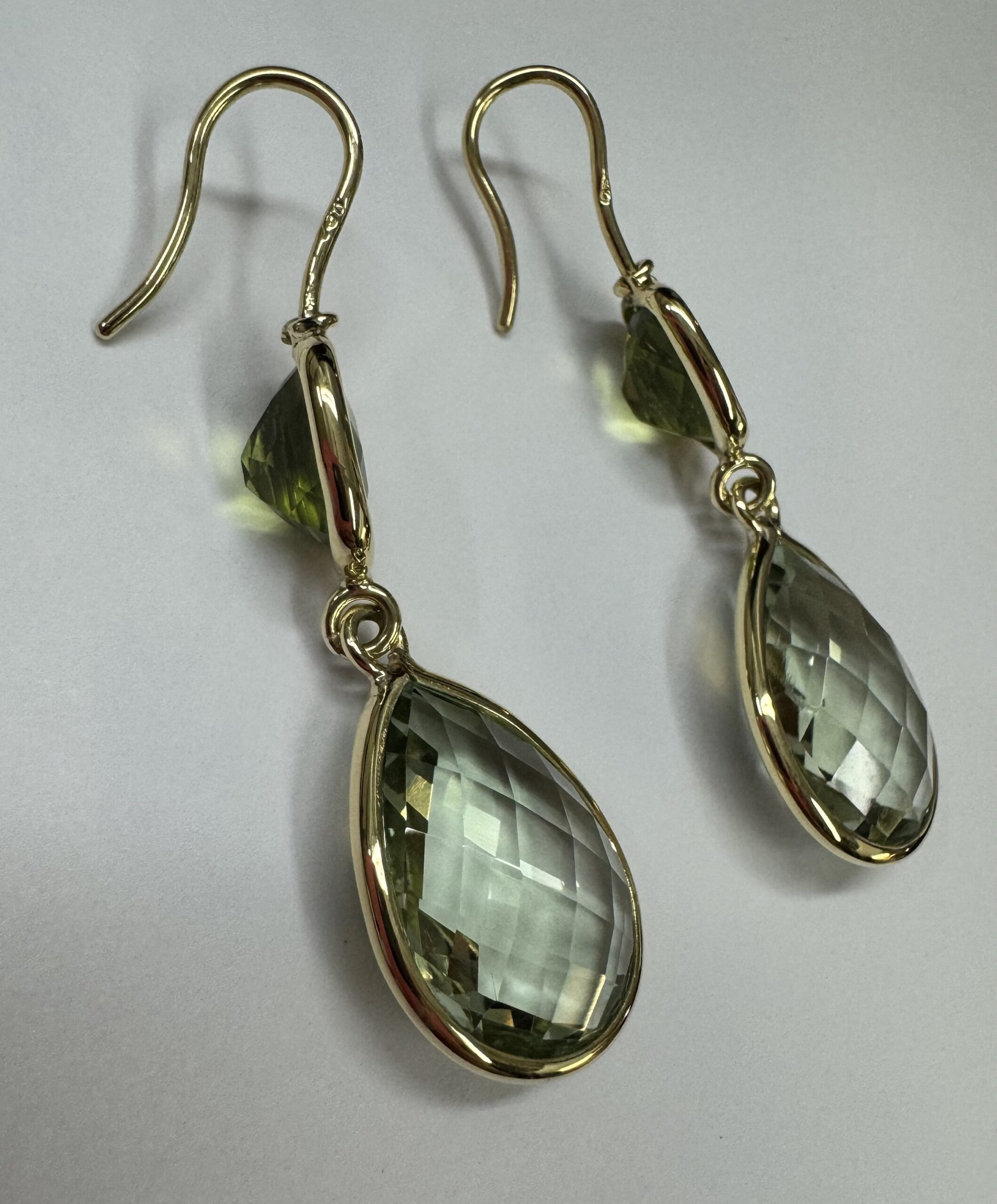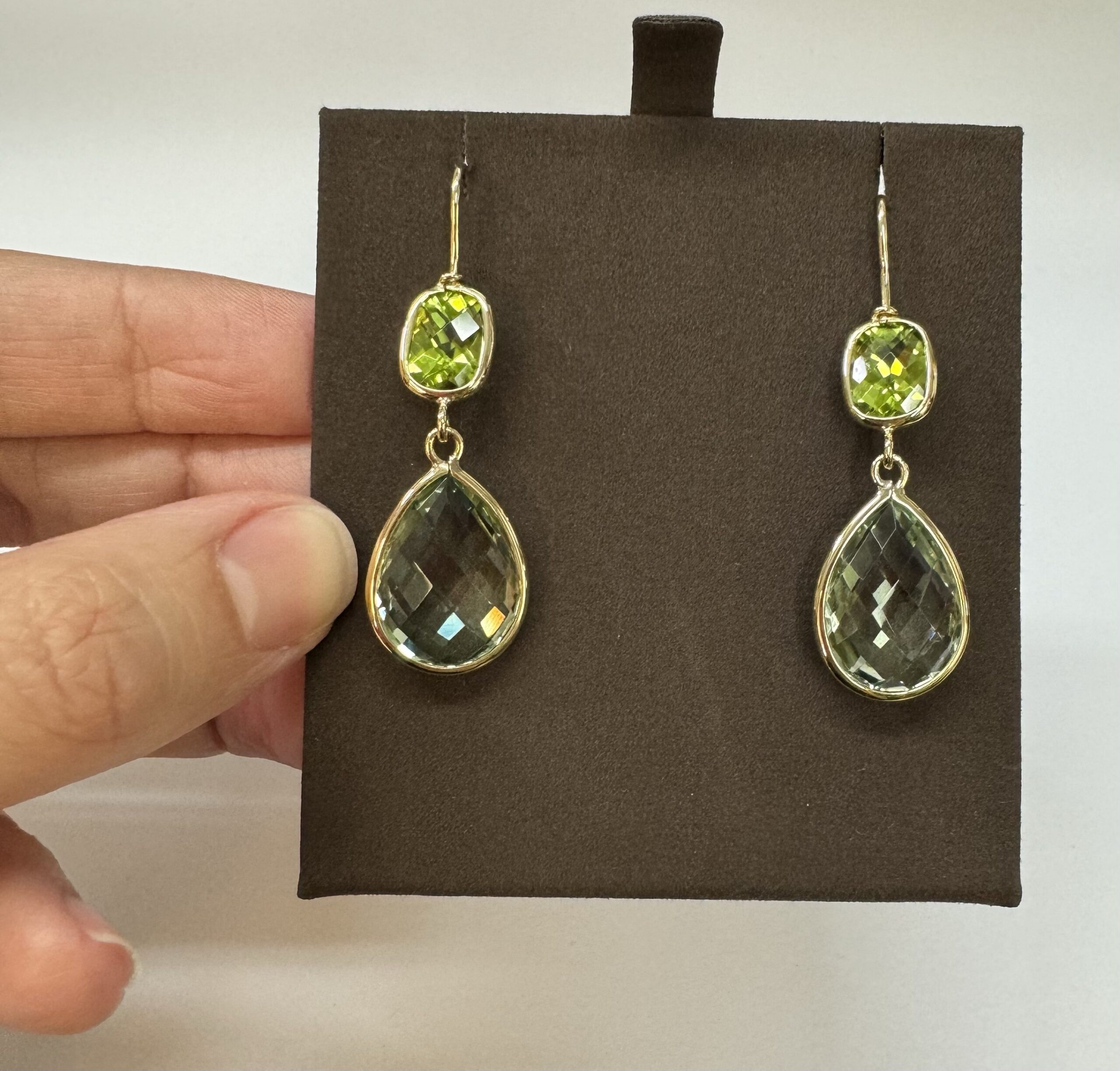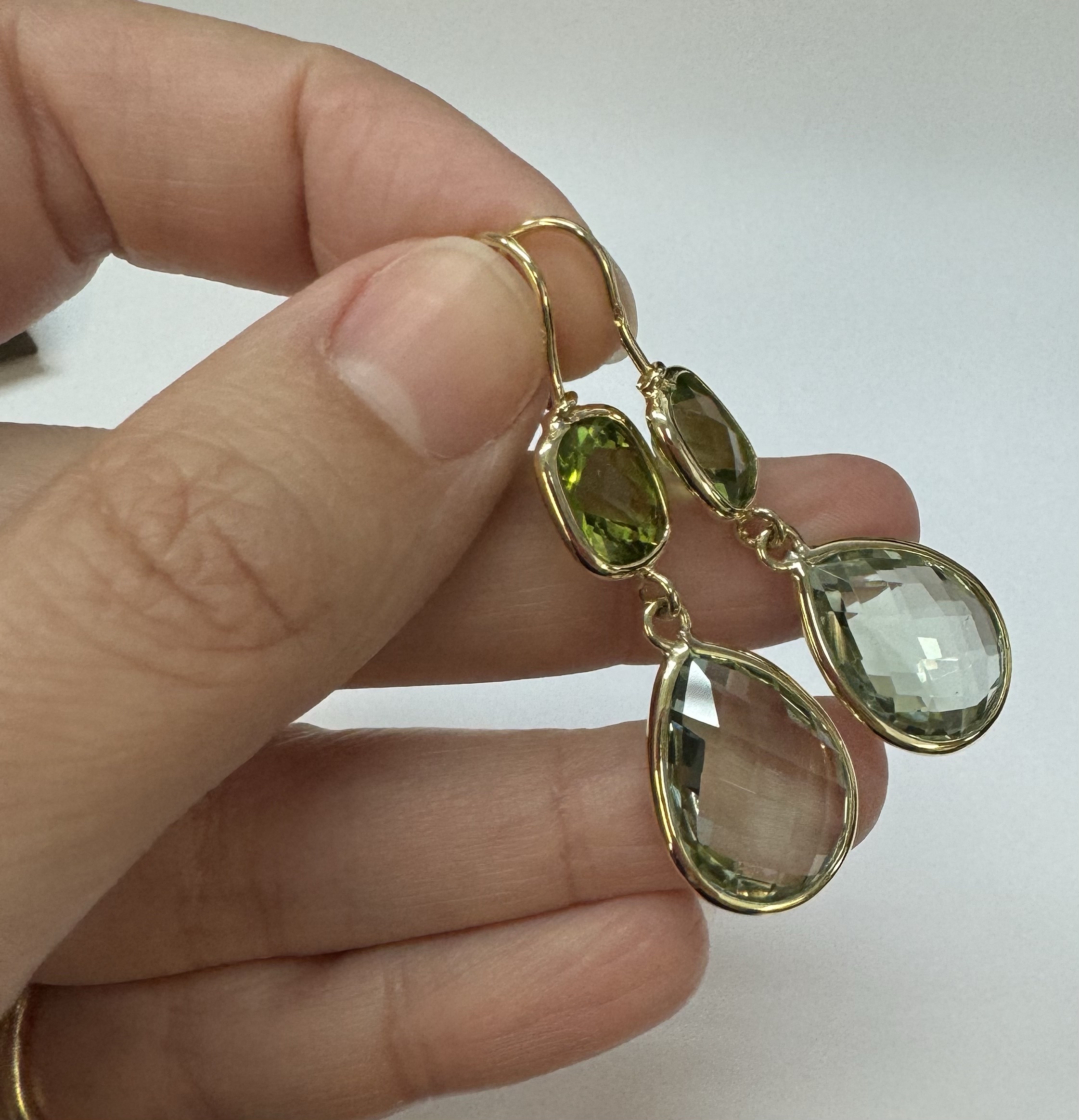 One-of-a-kind 18k yellow gold 24.95 cttw bezel set pear shaped, faceted Green Amethyst & cushion shaped, faceted Peridot lever back fish hook style dangle earrings. These earrings have an entire weight of 7.8 grams.