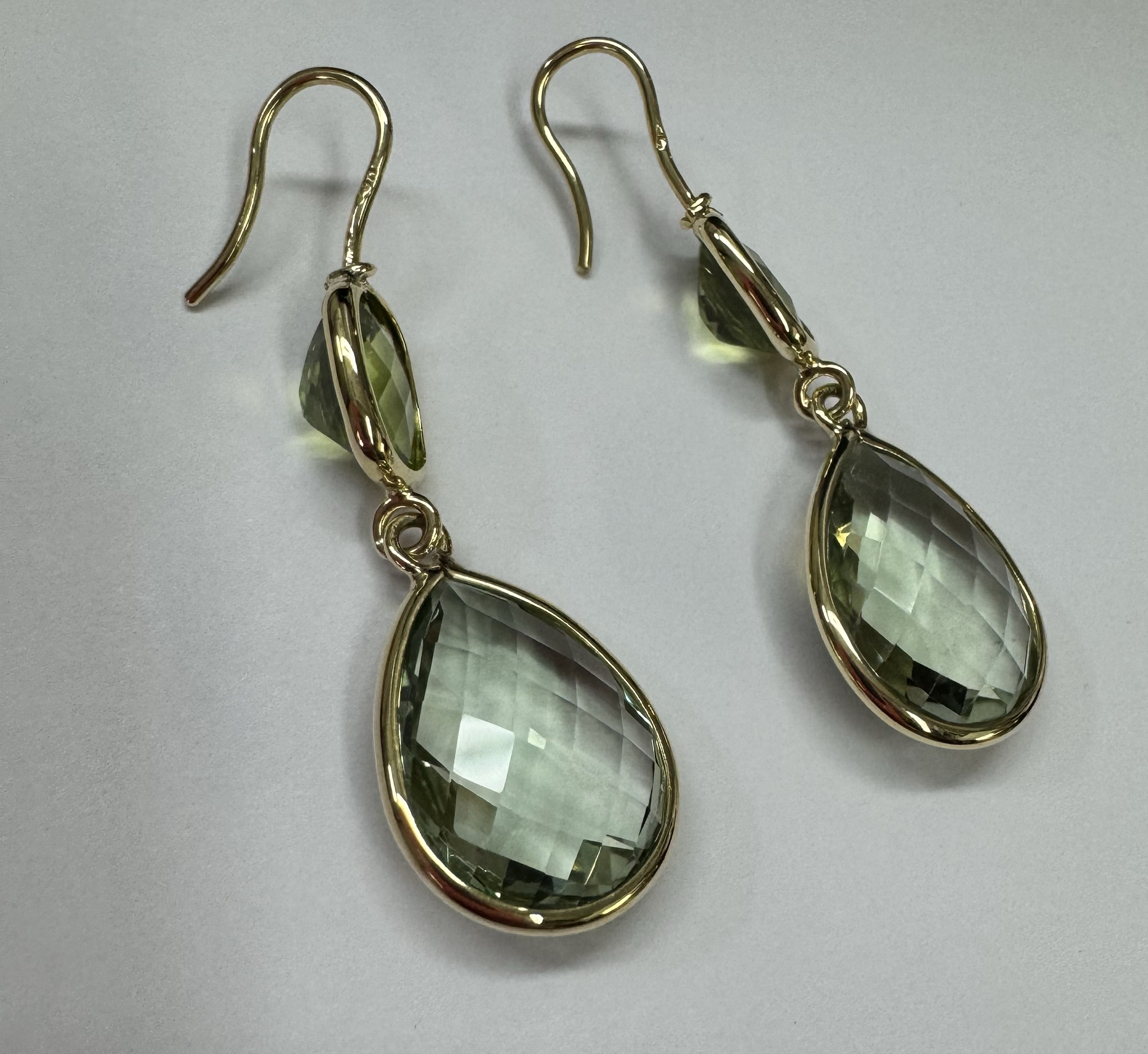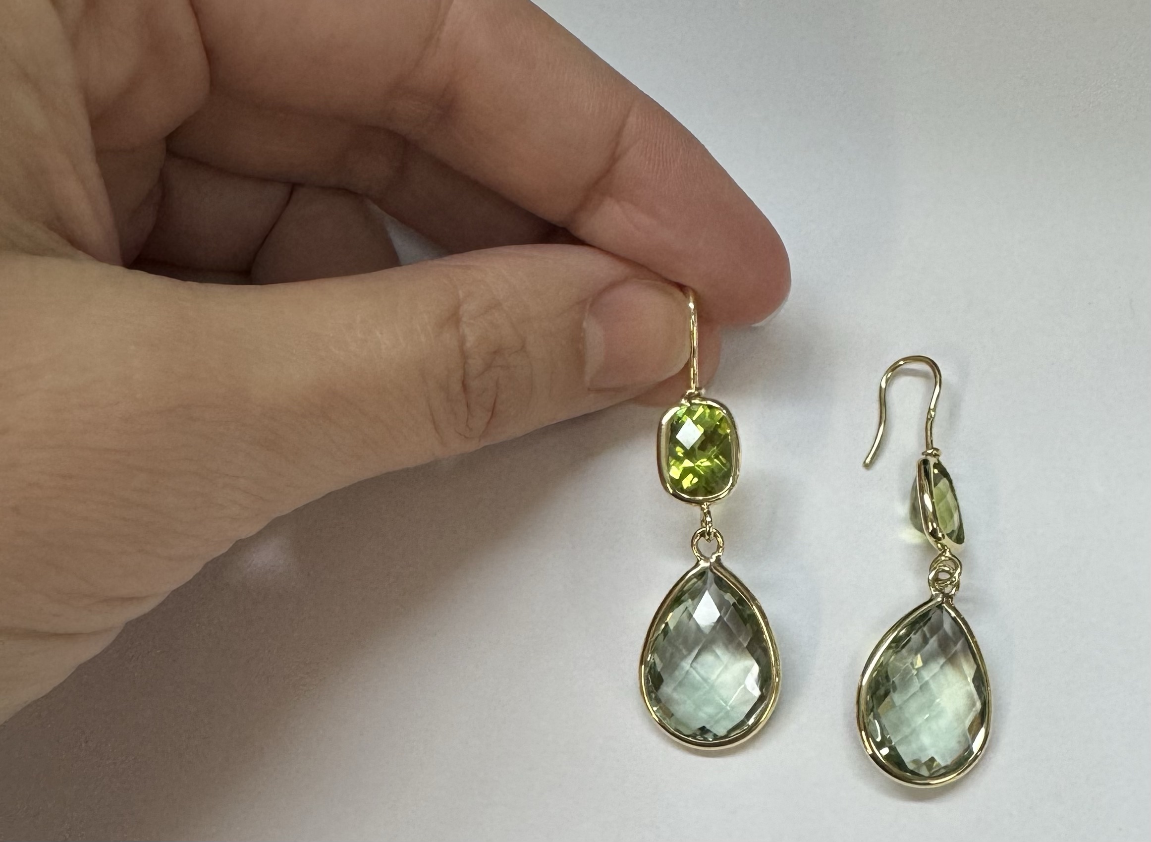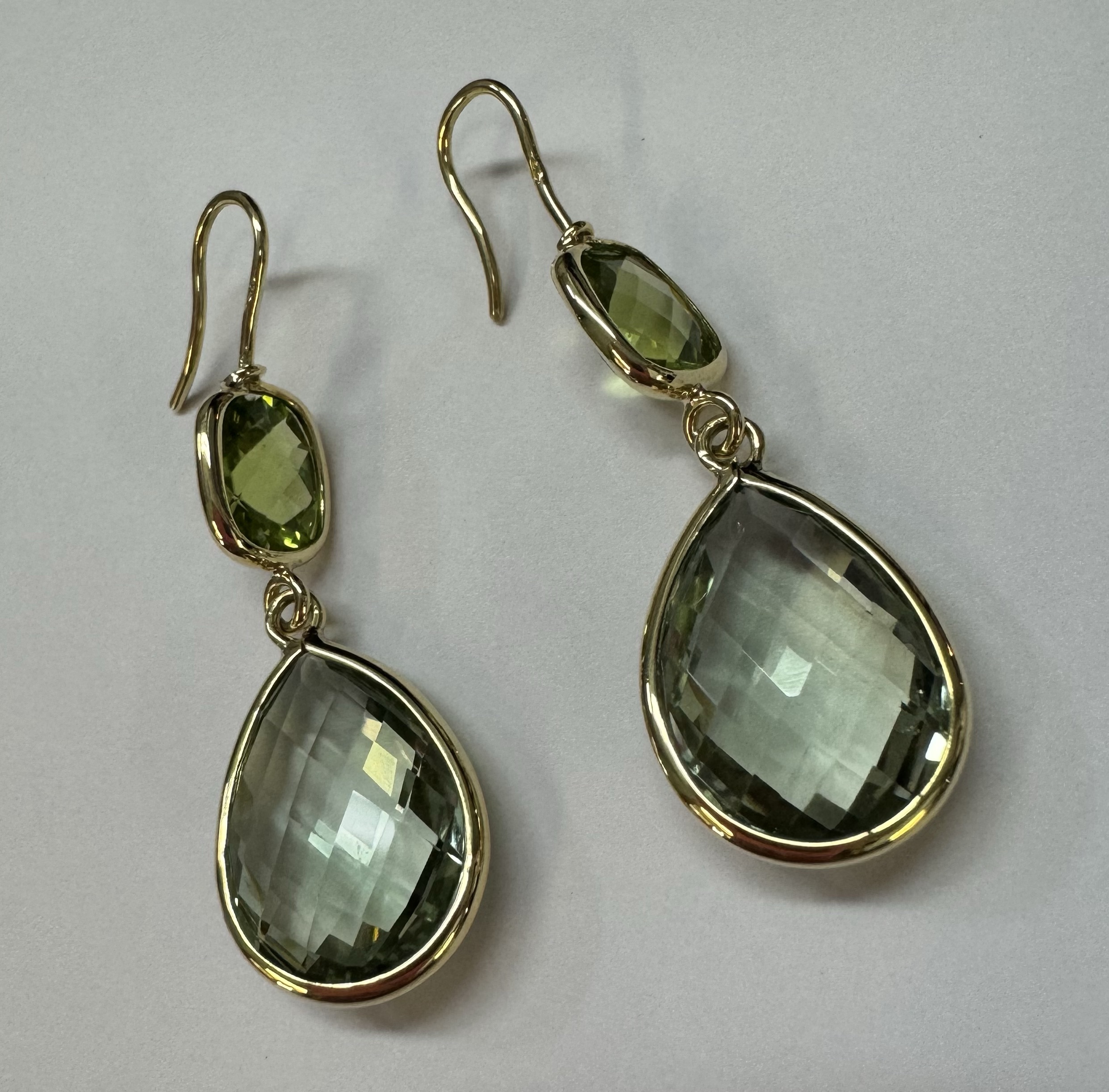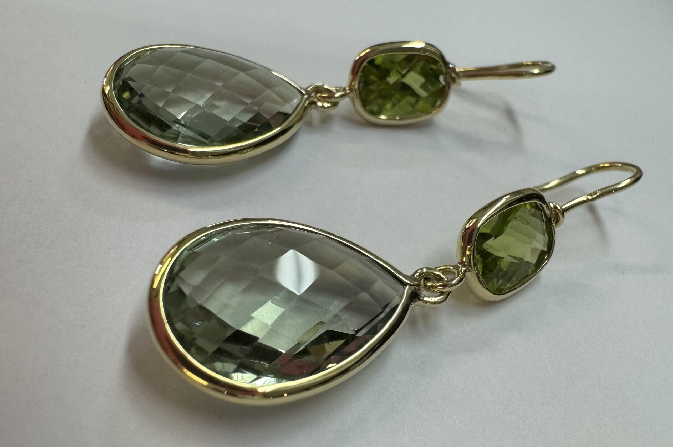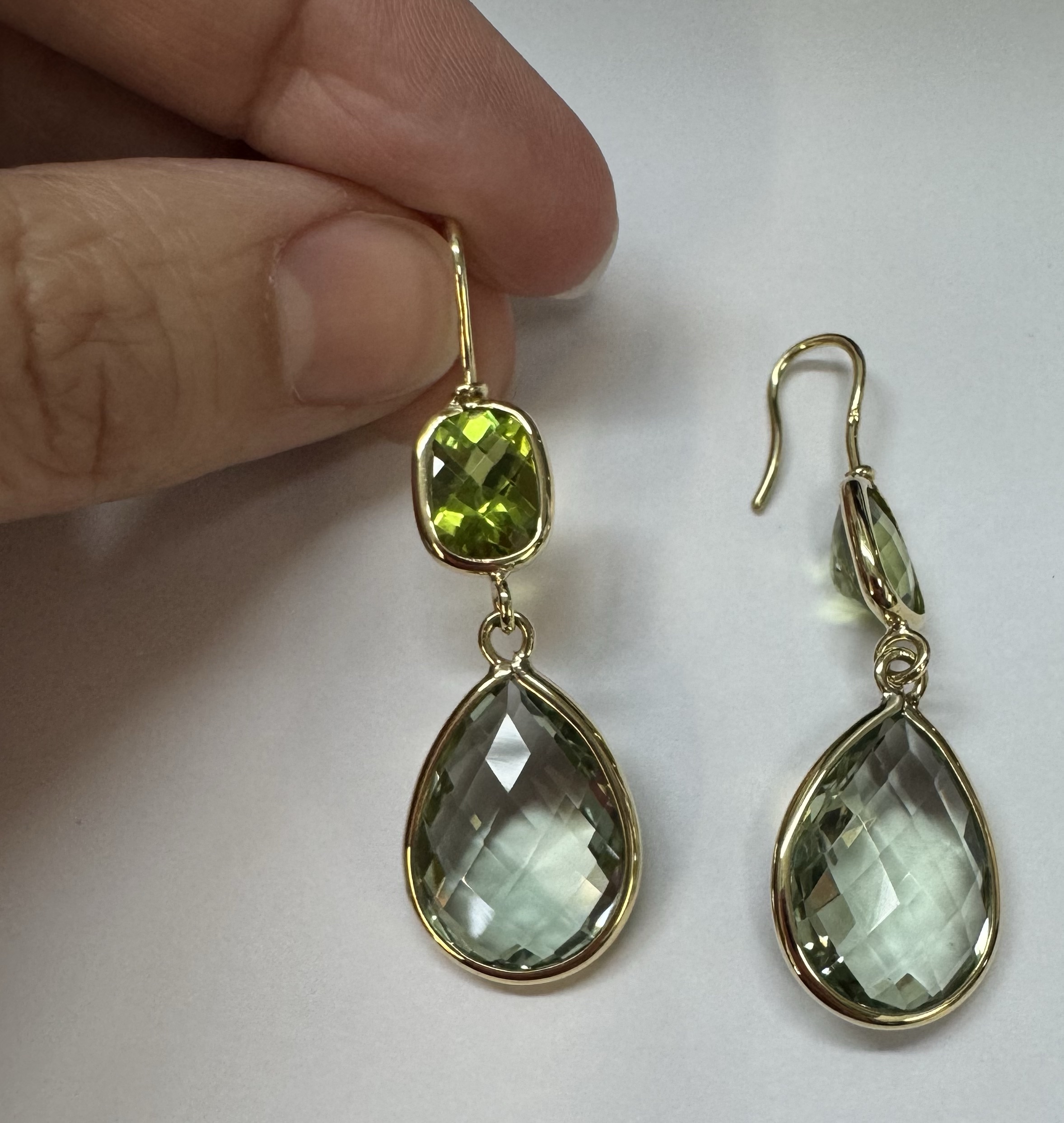 One-of-a-kind 18k yellow gold 24.95 cttw bezel set pear shaped, faceted Green Amethyst & cushion shaped, faceted Peridot lever back fish hook style dangle earrings. These earrings have an entire weight of 7.8 grams.