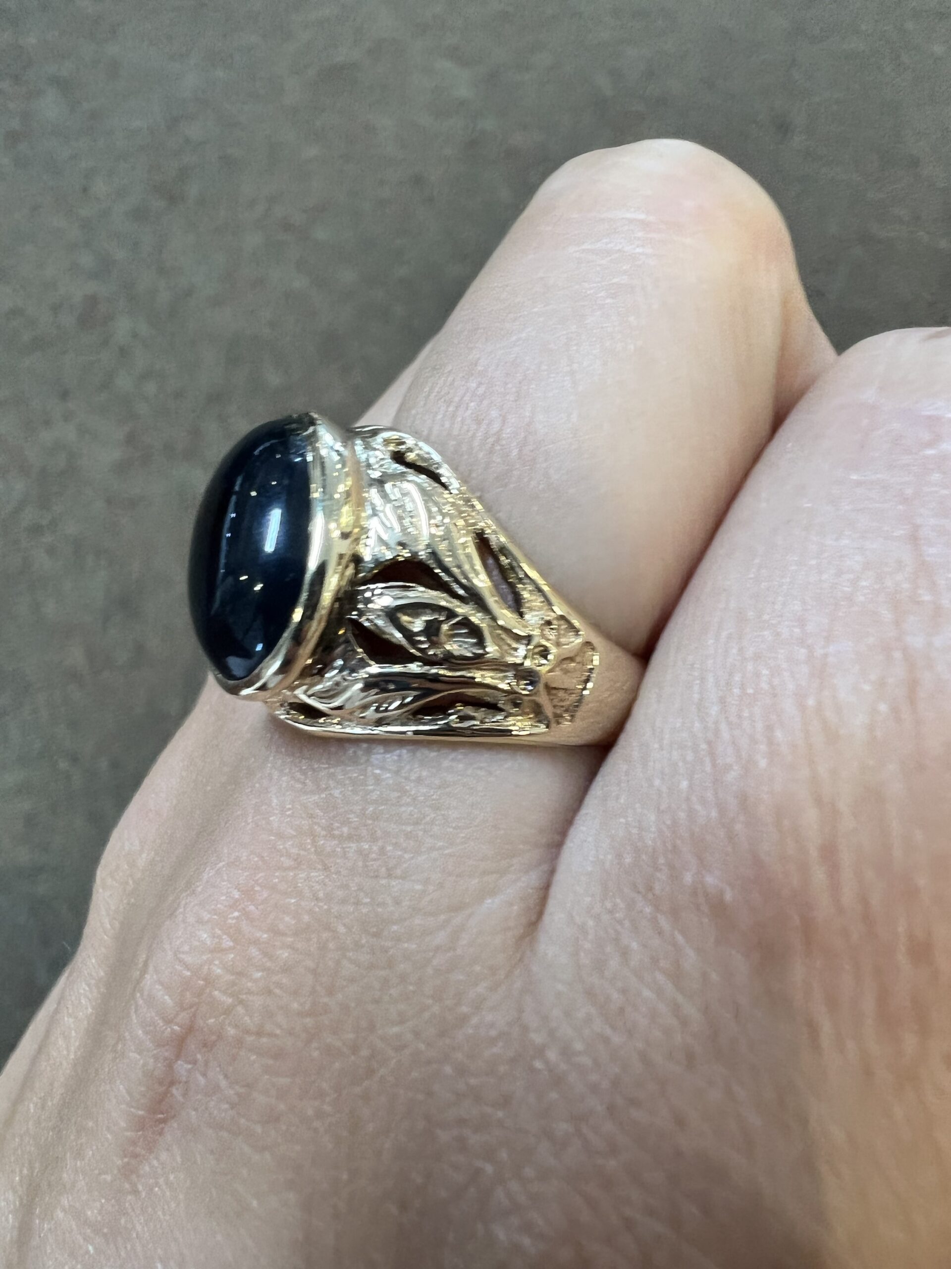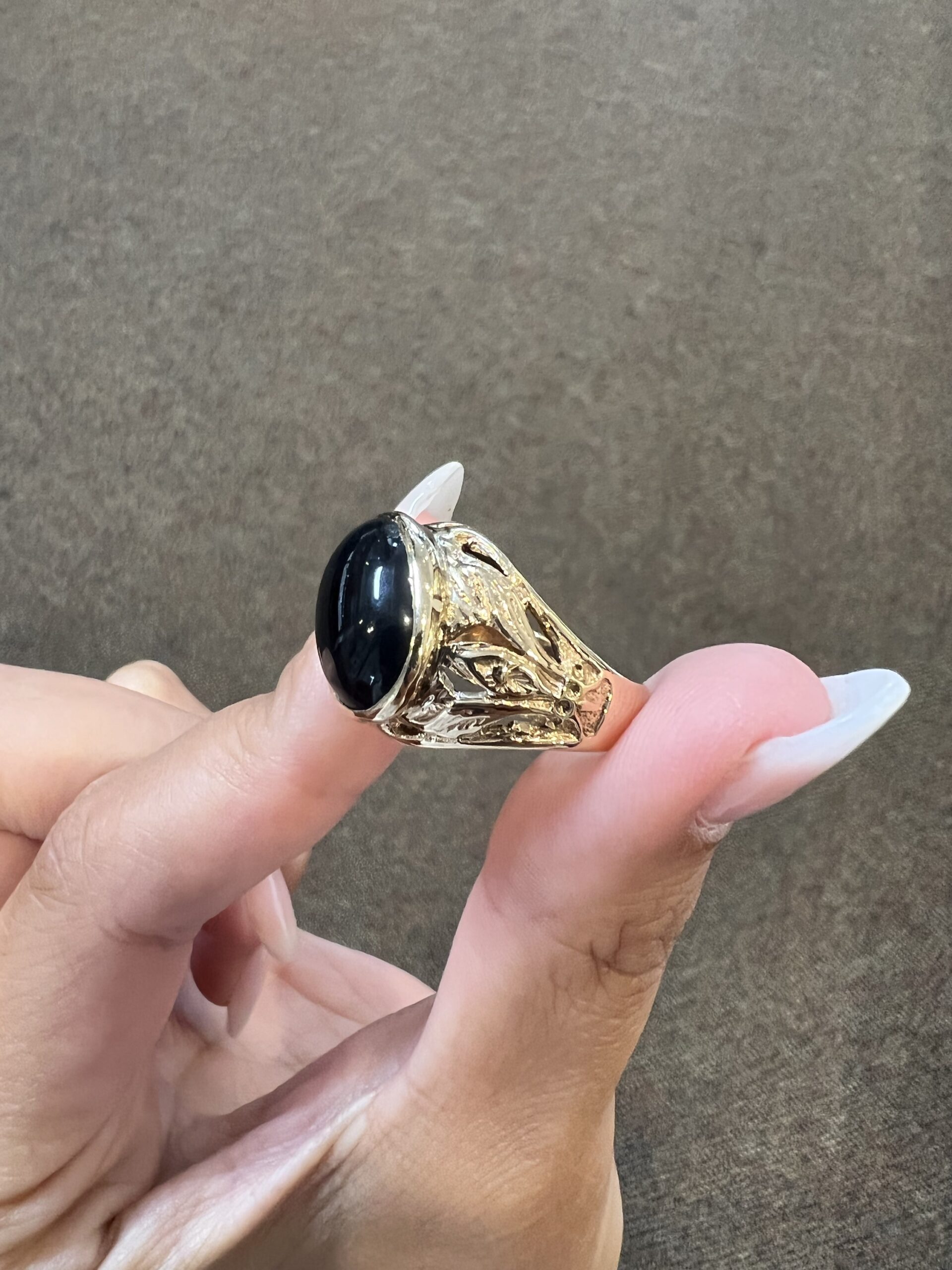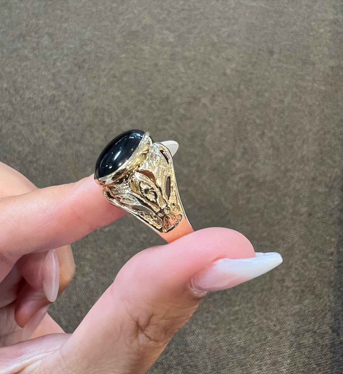 Vintage one-of-a-kind 18k genuine Black Jade 15 x 11 MM bezel set, oval shaped engraved signet style ring, size 8 (this ring can be reasonably sized at no extra charge). This ring has an entire weight of 8.98 grams.