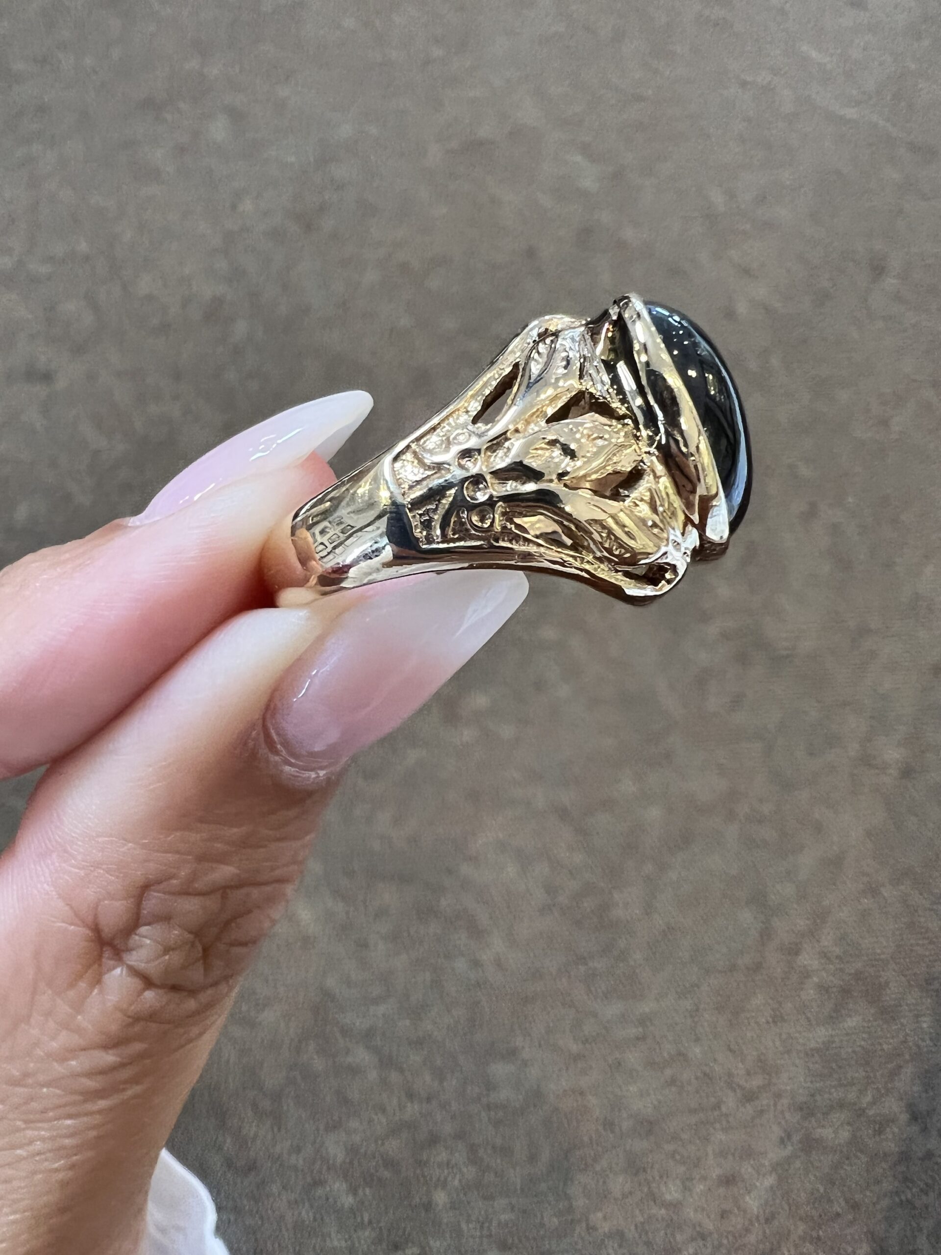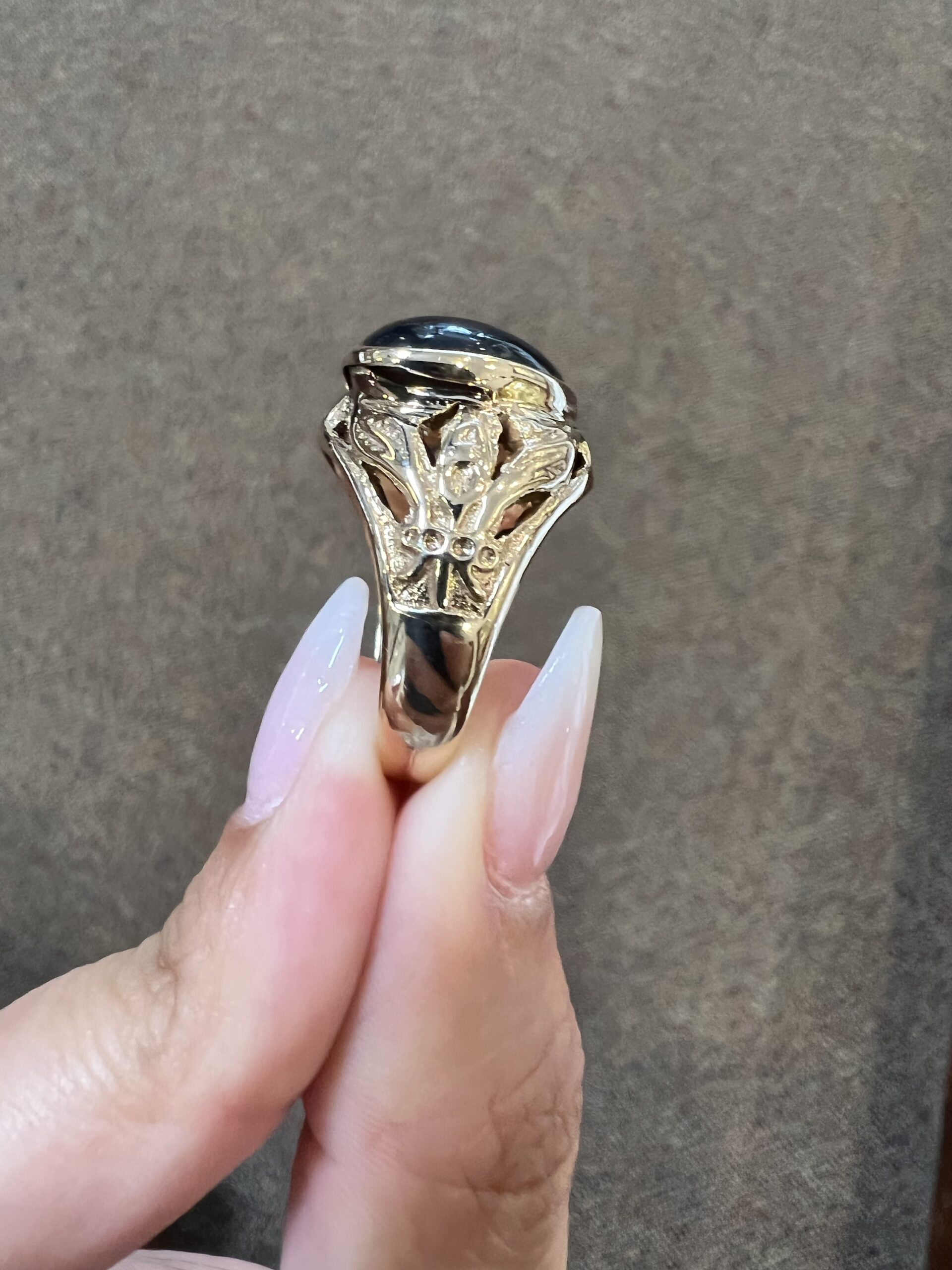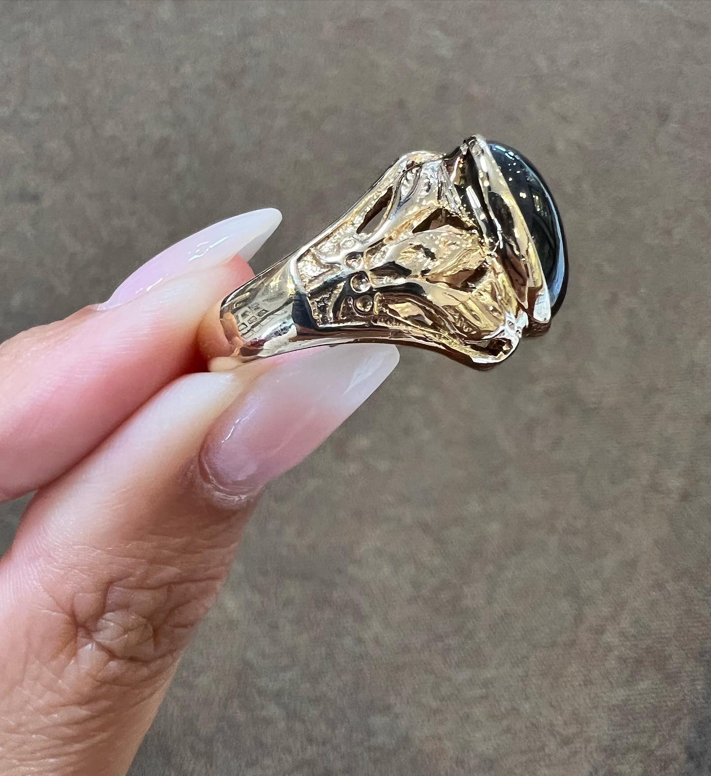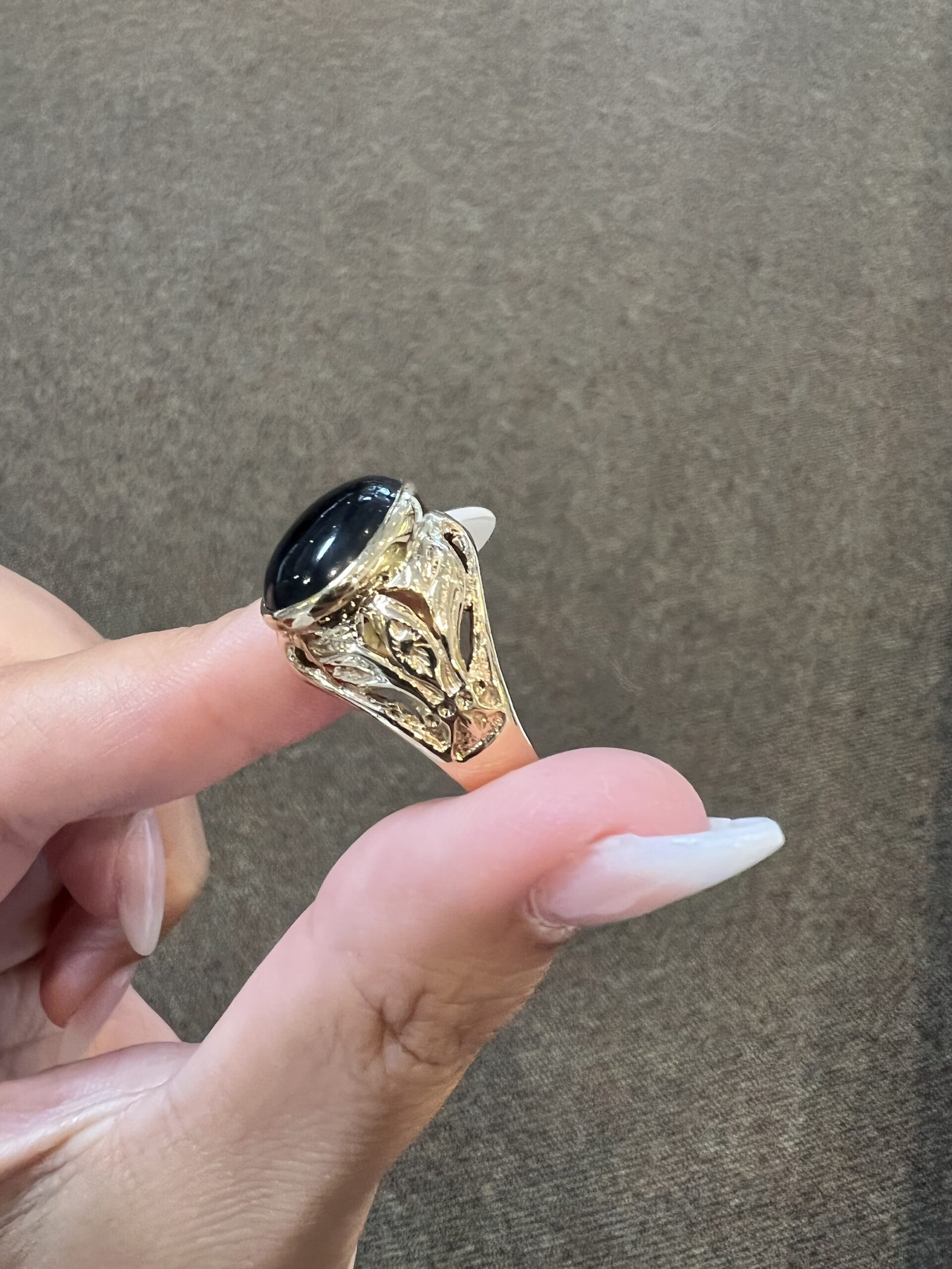 Vintage one-of-a-kind 18k genuine Black Jade 15 x 11 MM bezel set, oval shaped engraved signet style ring, size 8 (this ring can be reasonably sized at no extra charge). This ring has an entire weight of 8.98 grams.